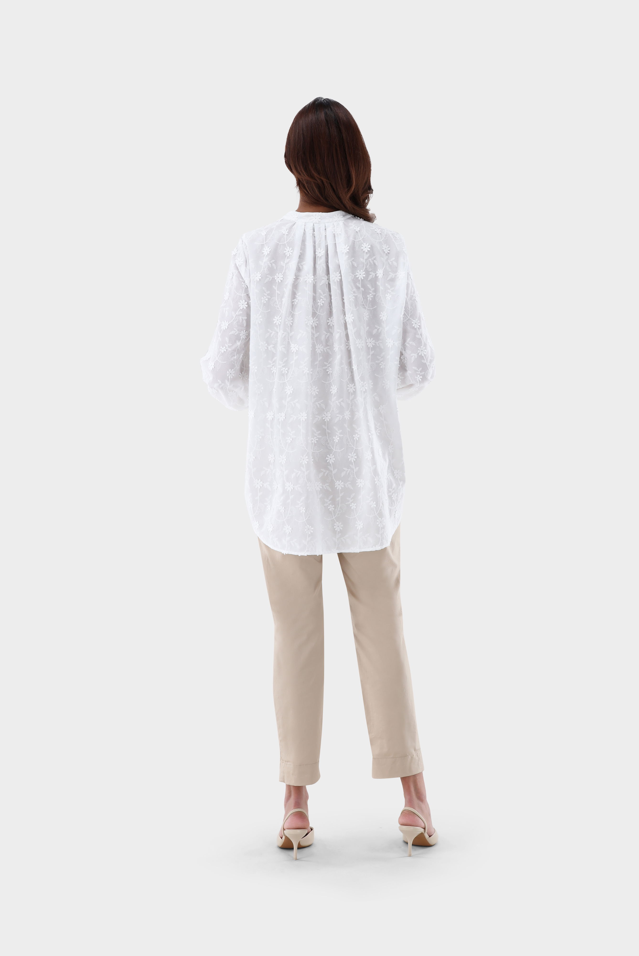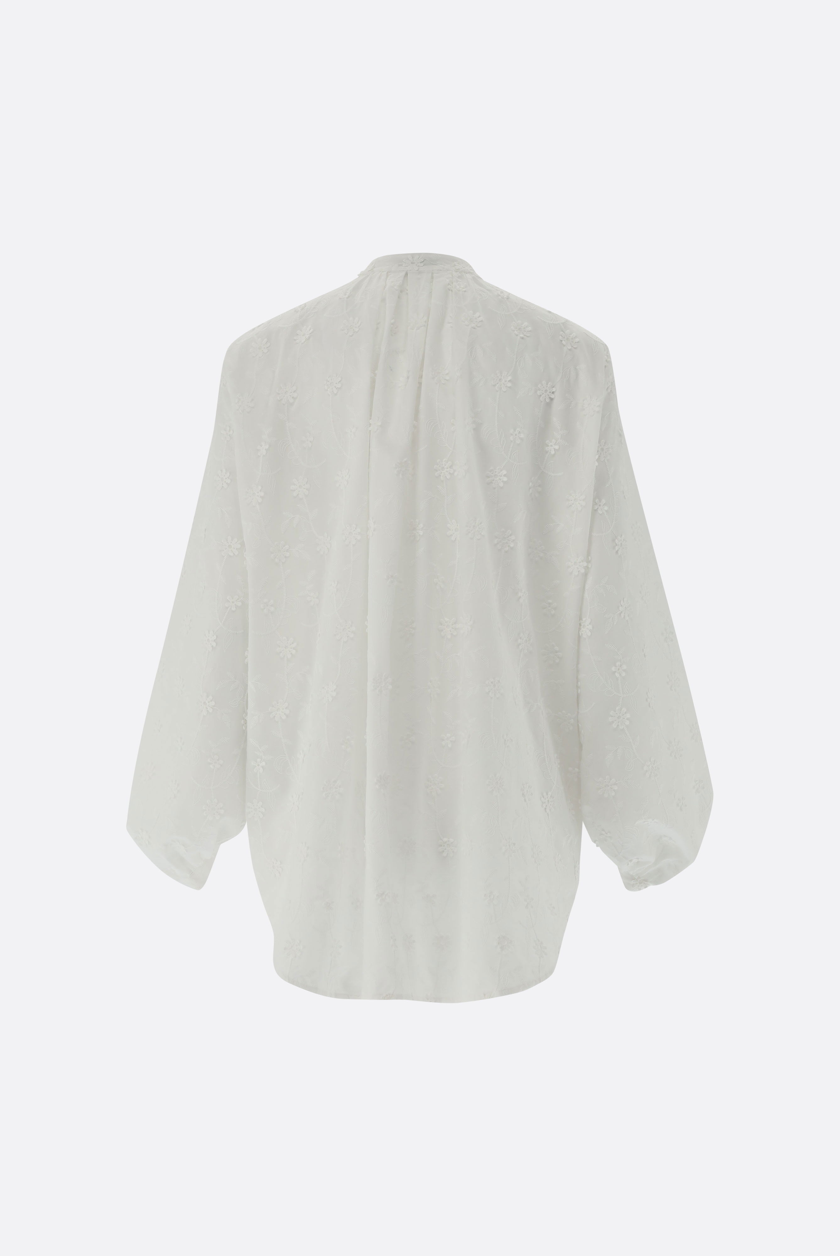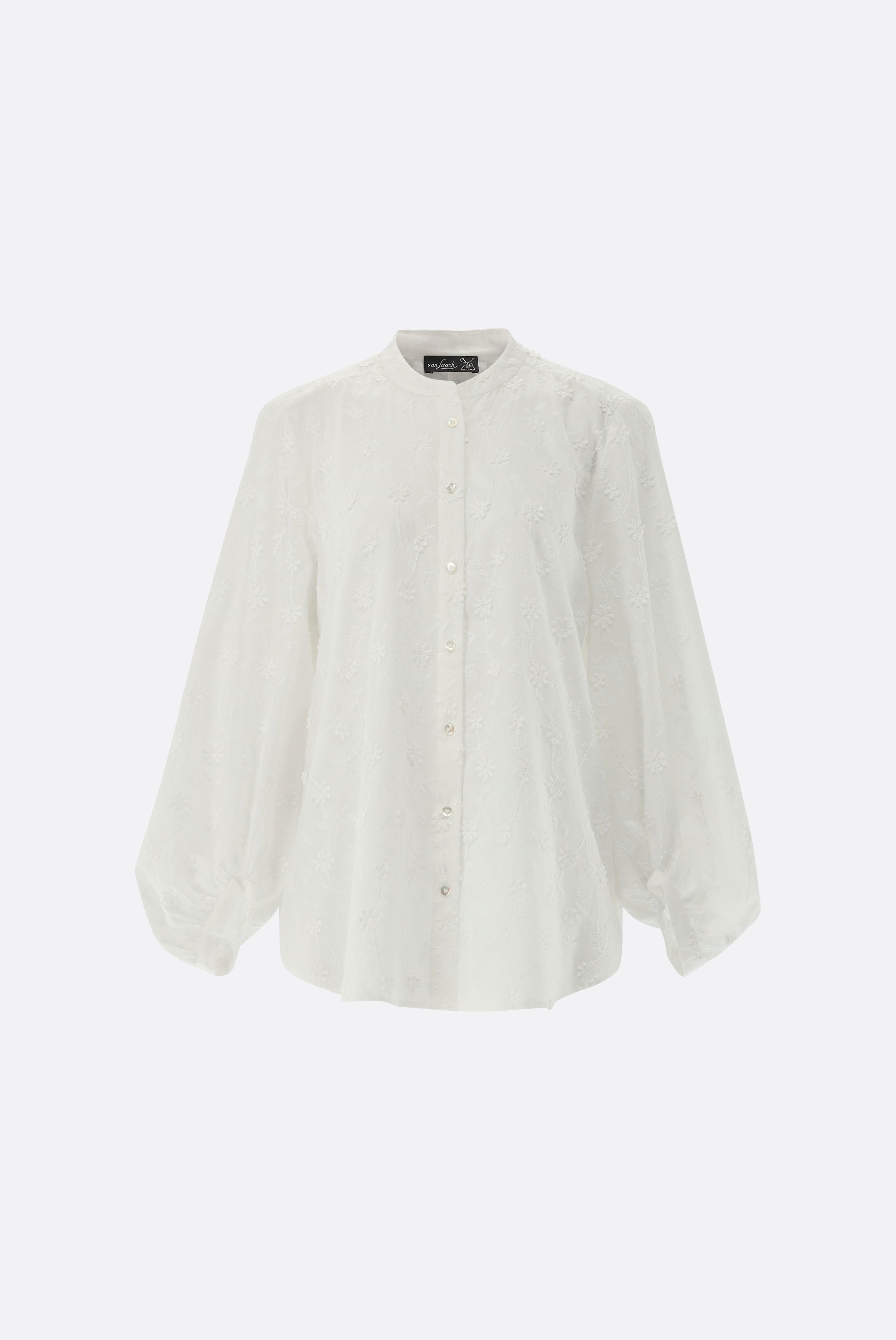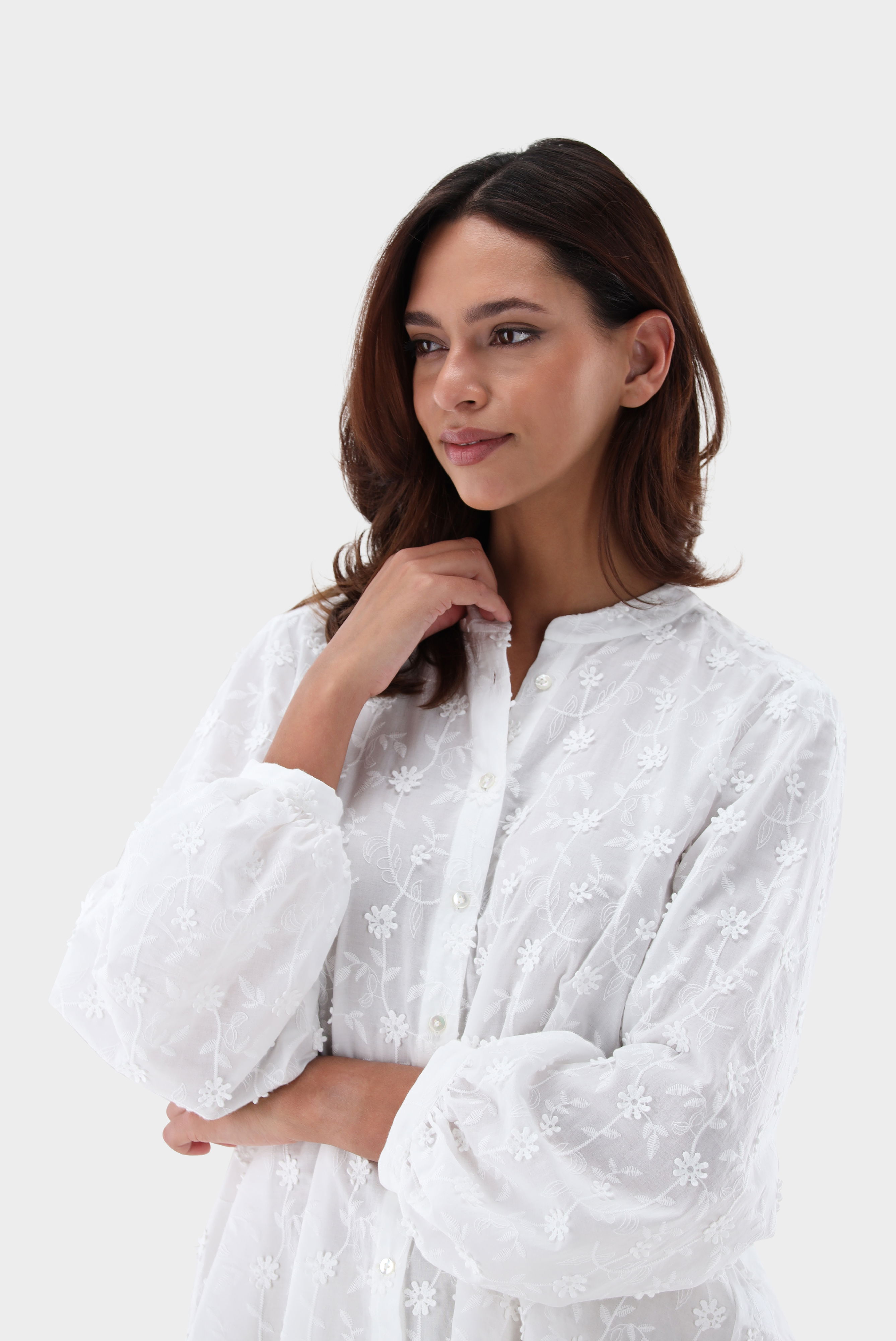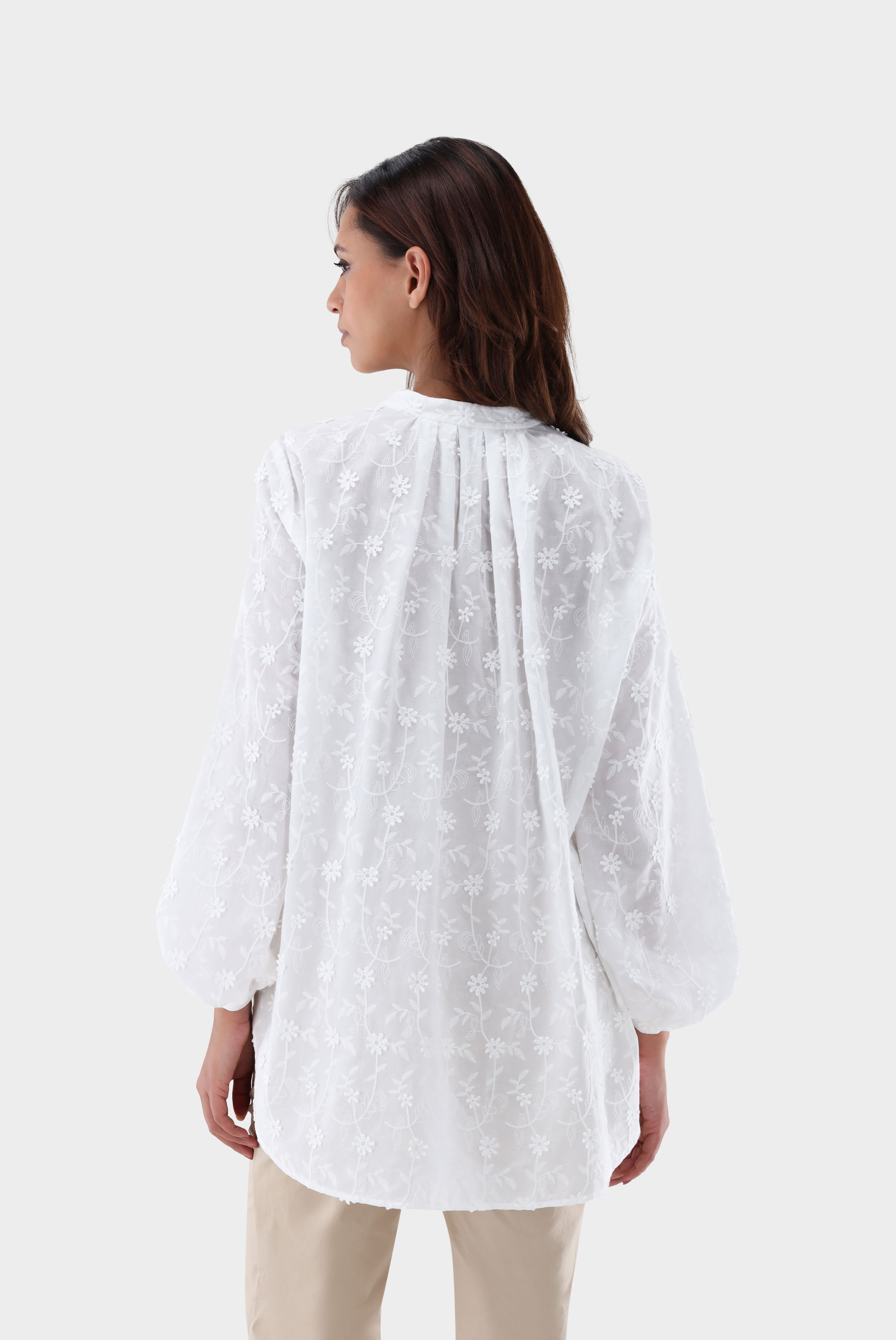 Diese lockere Hemdbluse mit langen, ballonförmigen Ärmeln und einem modernen Stehkragen ist ein wahres Highlight. Das feine Baumwoll-Batist-Gewebe wird durch eine exquisite Blumenstickerei mit 3D-Blüten verziert und sorgt so für einen eleganten, aber dennoch entspannten Look. Die Ärmel sind besonders voluminös und verleihen der Bluse einen femininen Charme. Die Rückseite der Bluse ist mit feinen Falten versehen, die für eine angenehme Passform sorgen. Der Schlaufenverschluss mit Perlmuttknöpfen rundet das Design ab und macht die Bluse sowohl für den Business-Alltag als auch für entspannte Freizeitlooks geeignet.