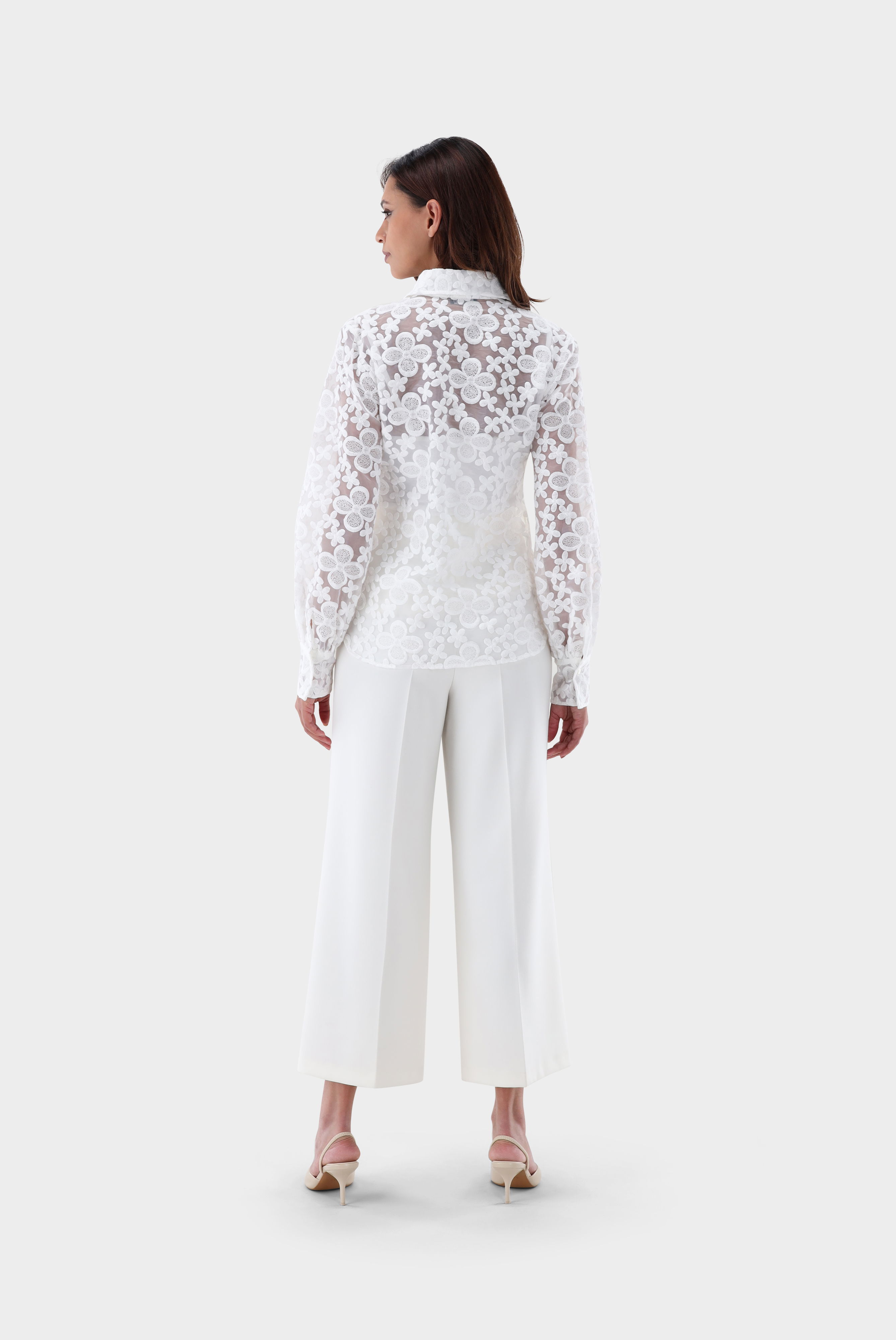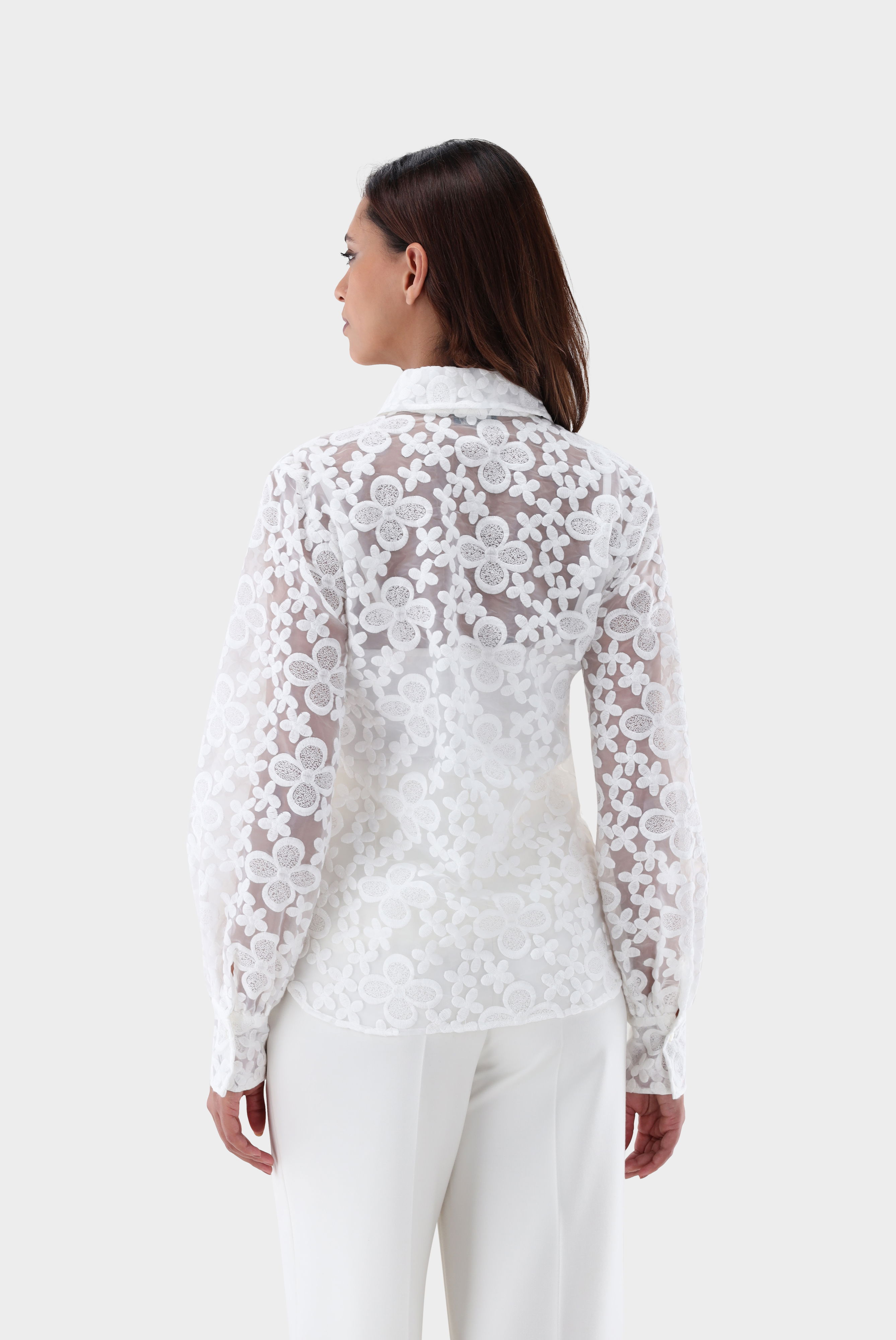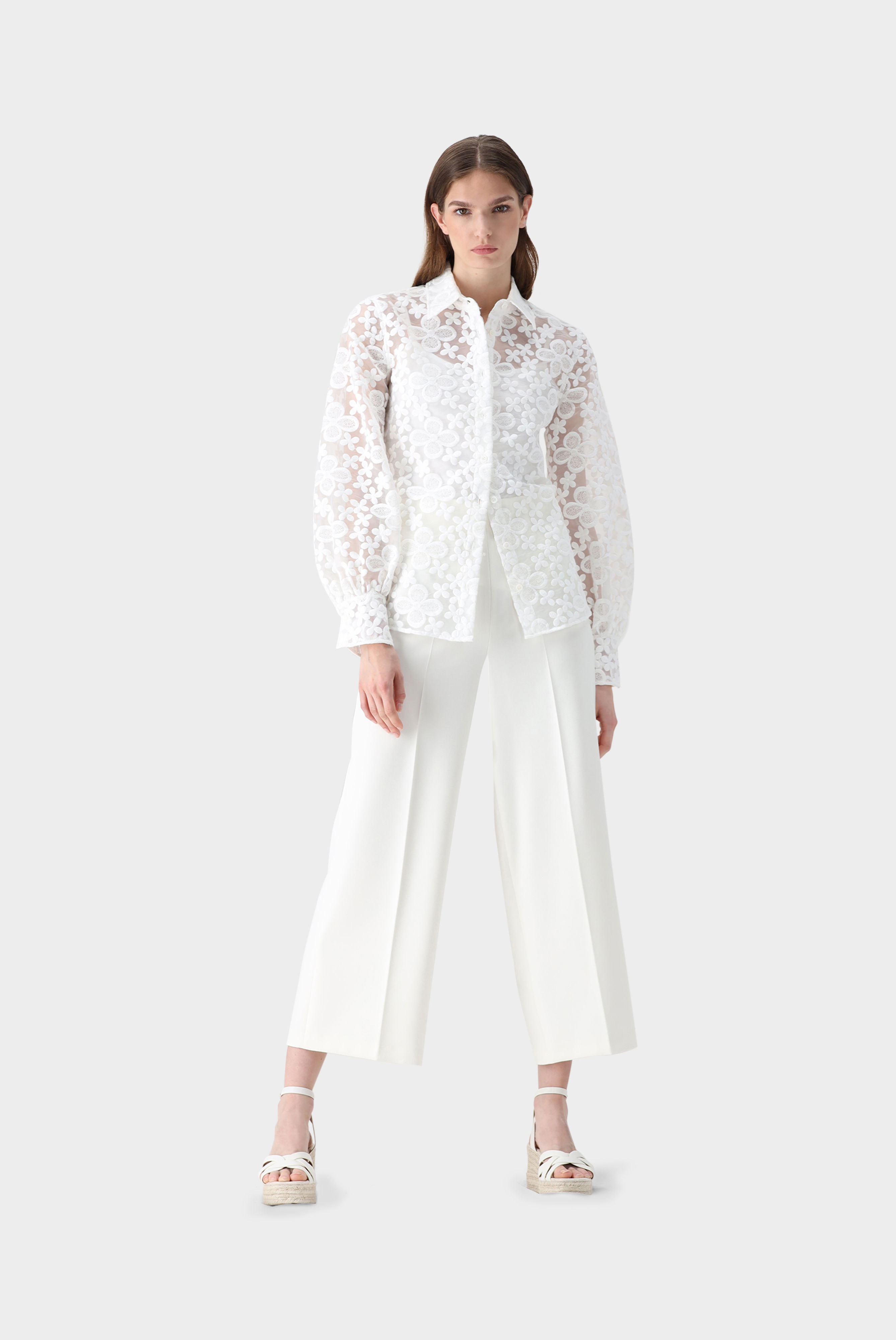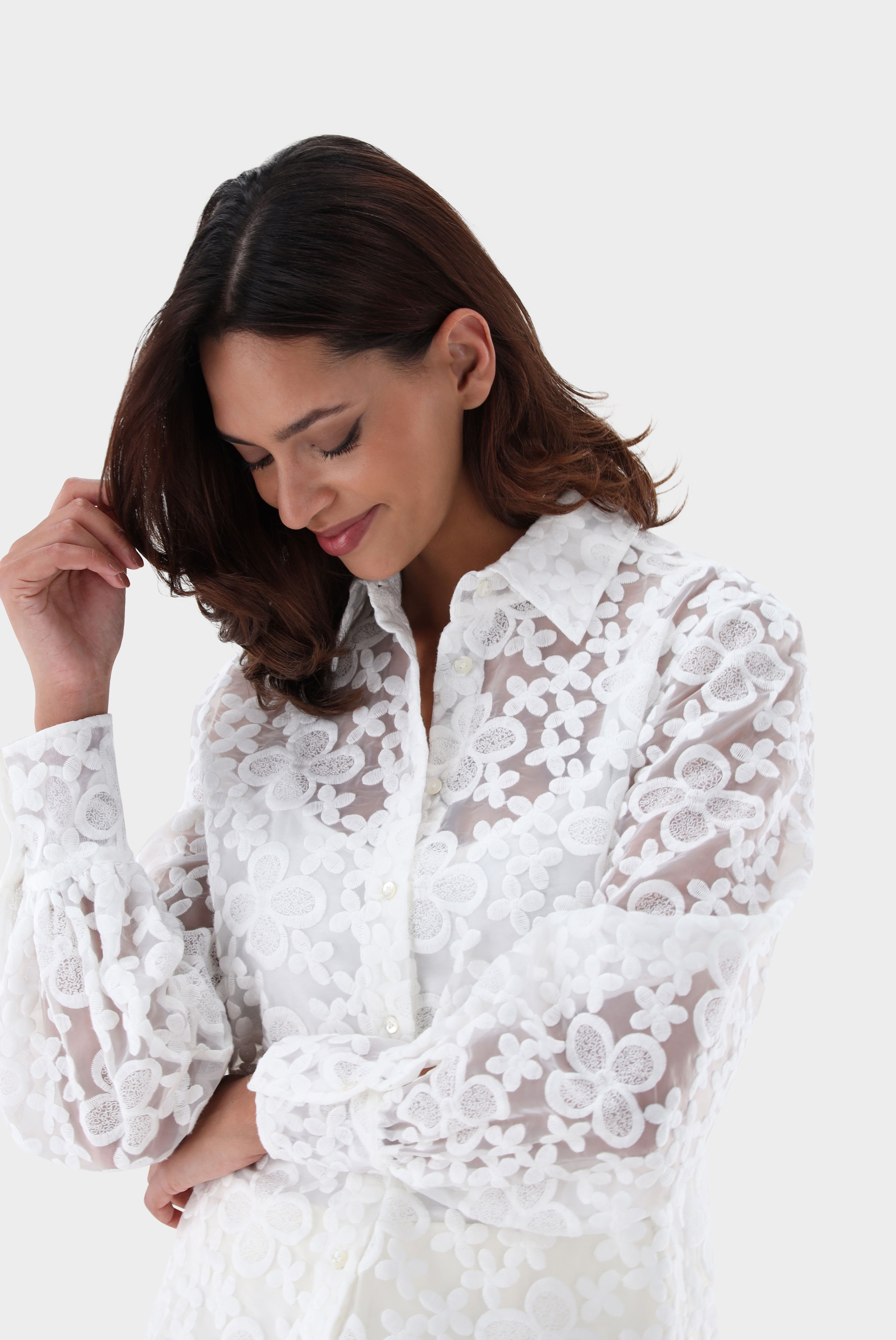 Look aus Hemdbluse mit Blousonärmeln und besticktem Organza