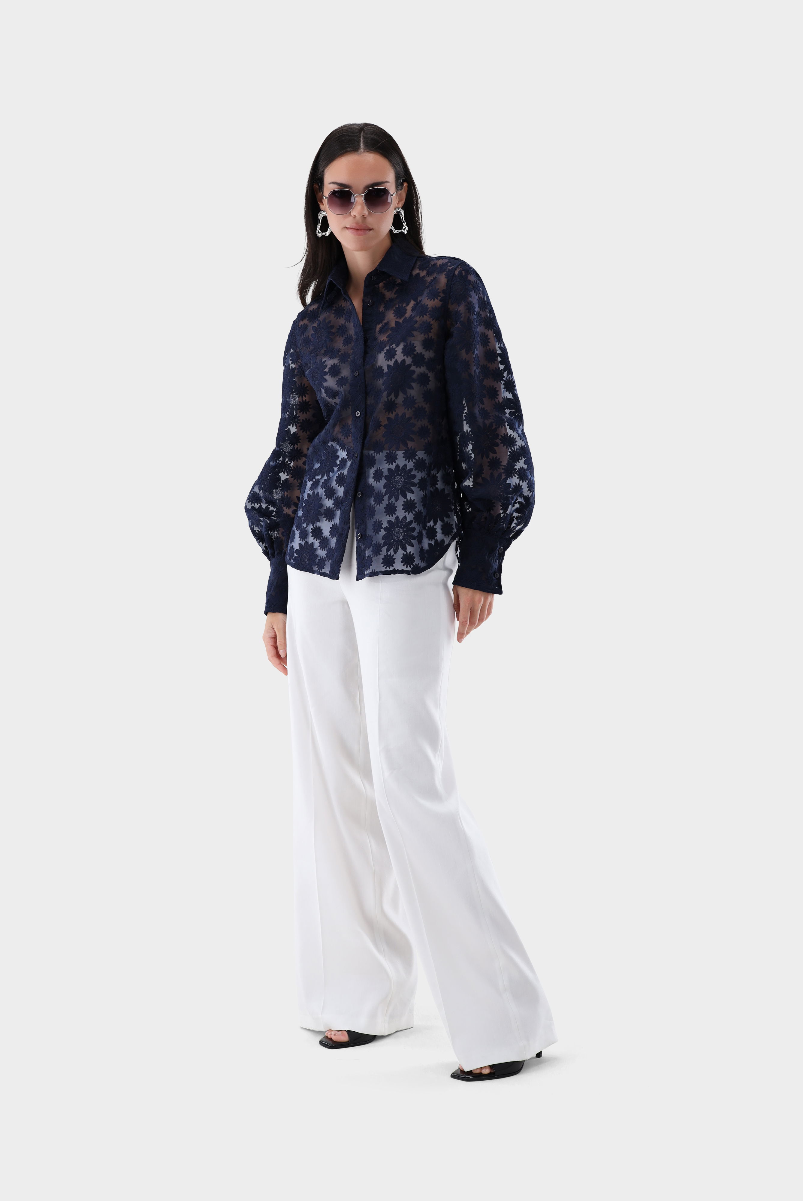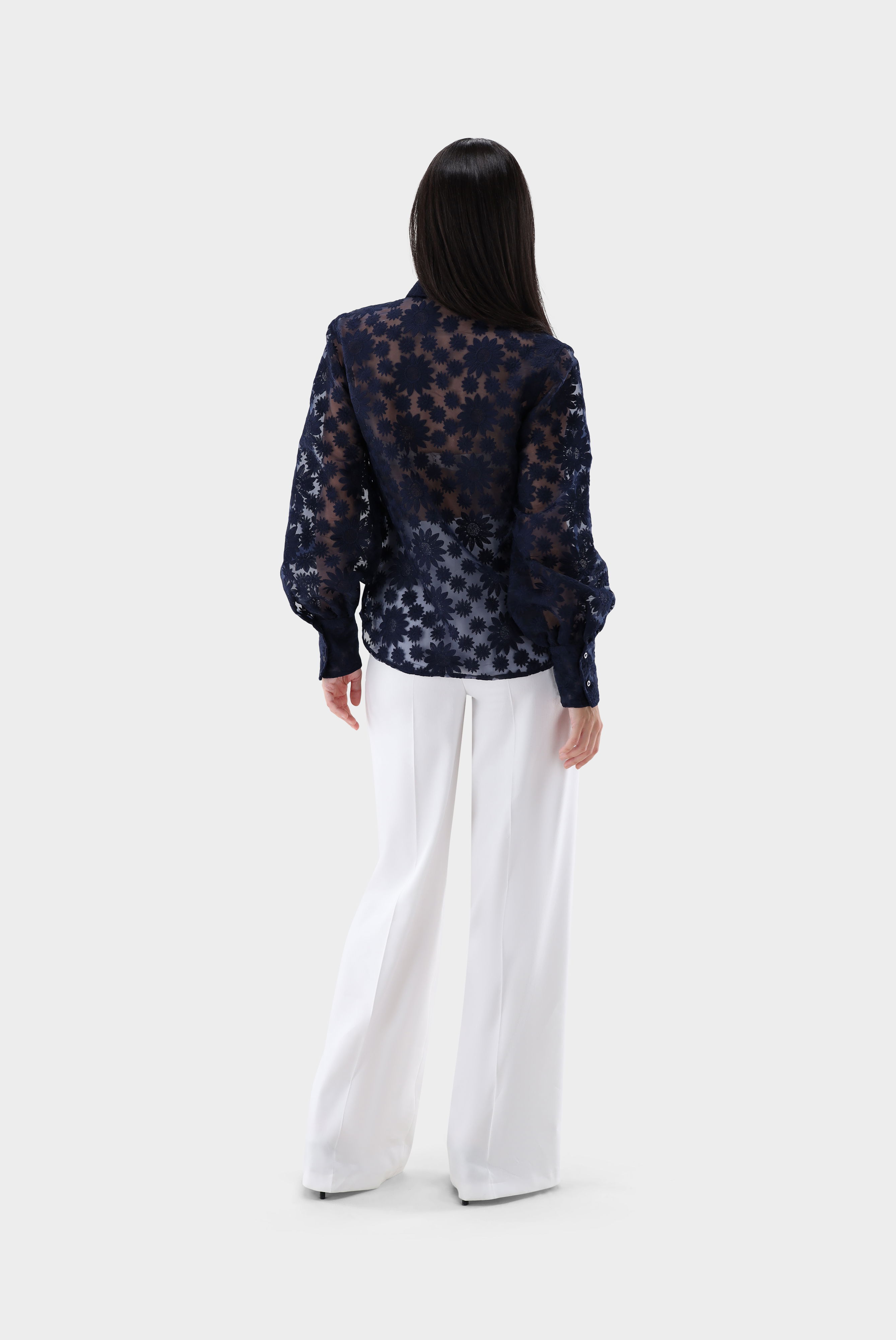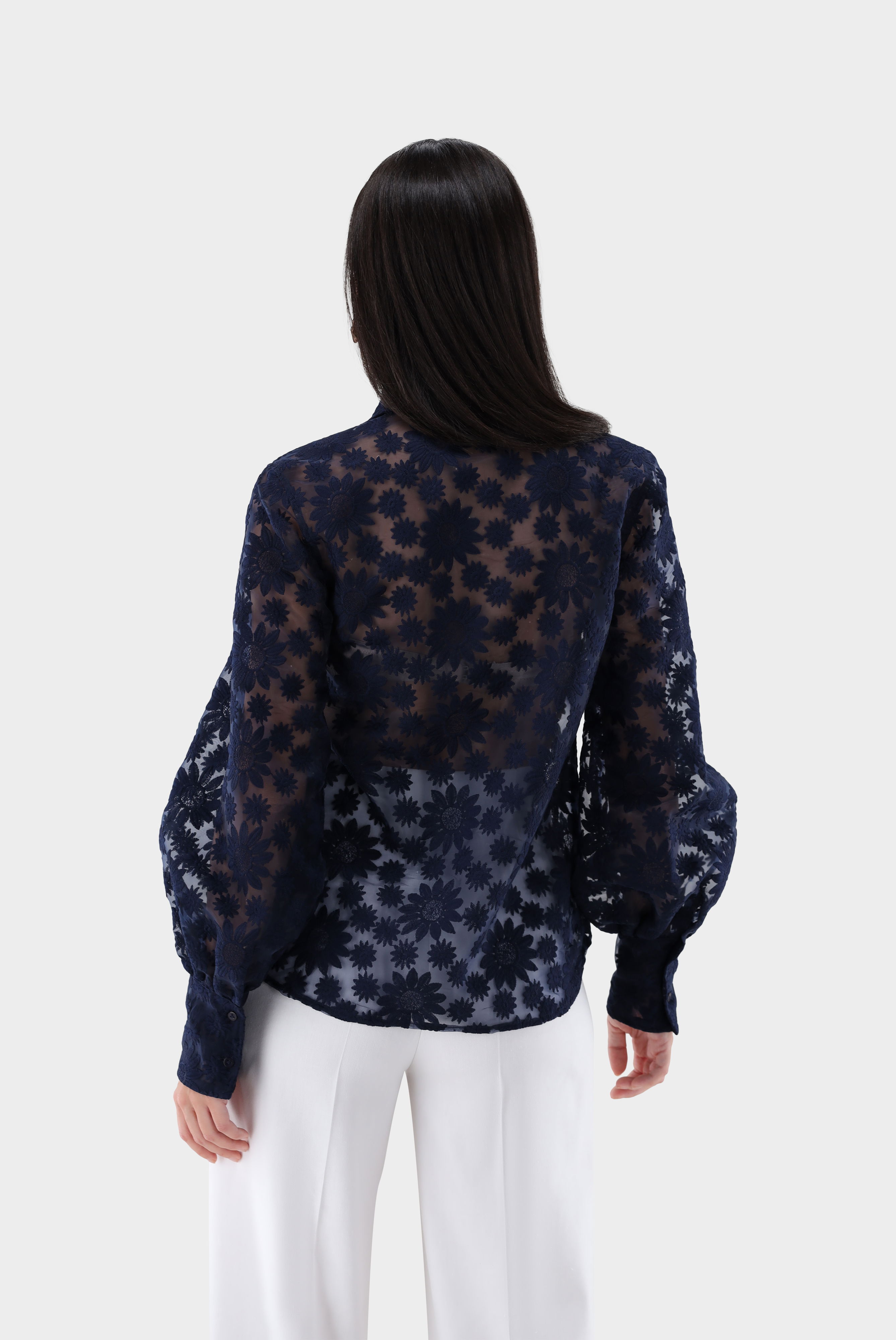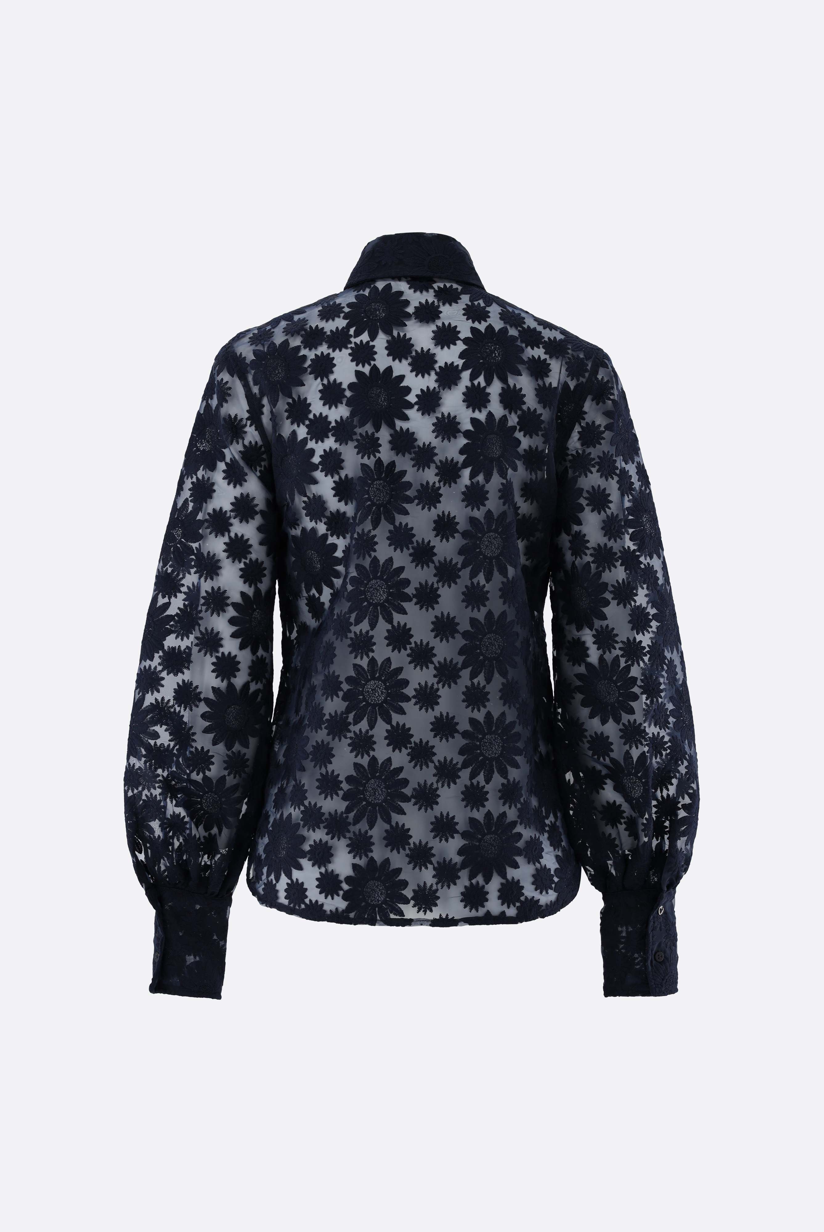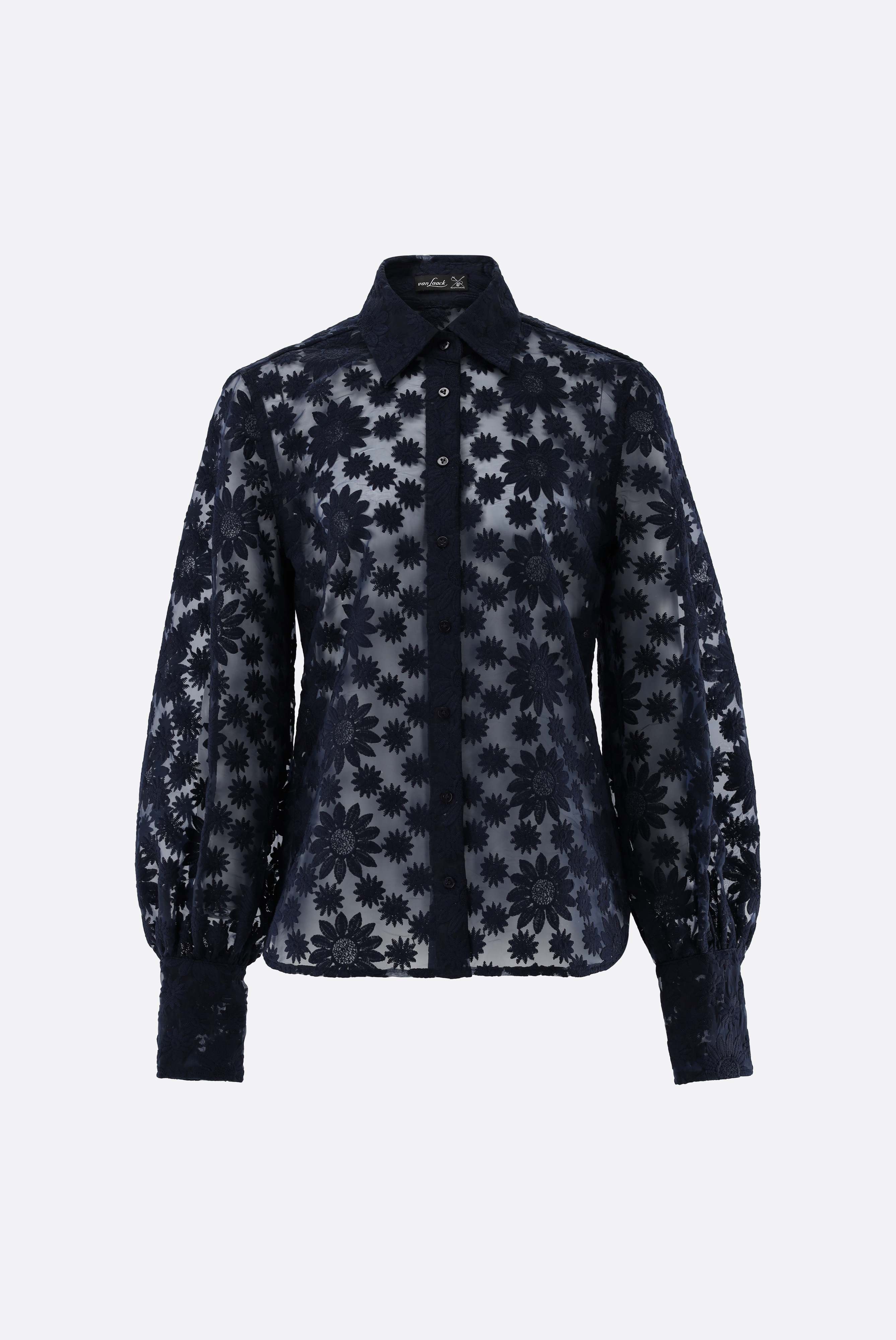 Diese elegante Hemdbluse im taillierten Schnitt aus einem hochwertigen Mischgewebe mit Baumwolle besticht durch ihre langen Blousonärmel und die feine Blumenstickerei auf transparentem Organza. Der glänzende Stoff verleiht der Bluse eine festliche Ausstrahlung, während die Perlmuttknöpfe und das farblich passende Unterziehtop (Modell Meni - separat erhältlich) für einen stilvollen Look sorgen. Die Bluse eignet sich perfekt für festliche Anlässe oder elegante Business-Looks.
