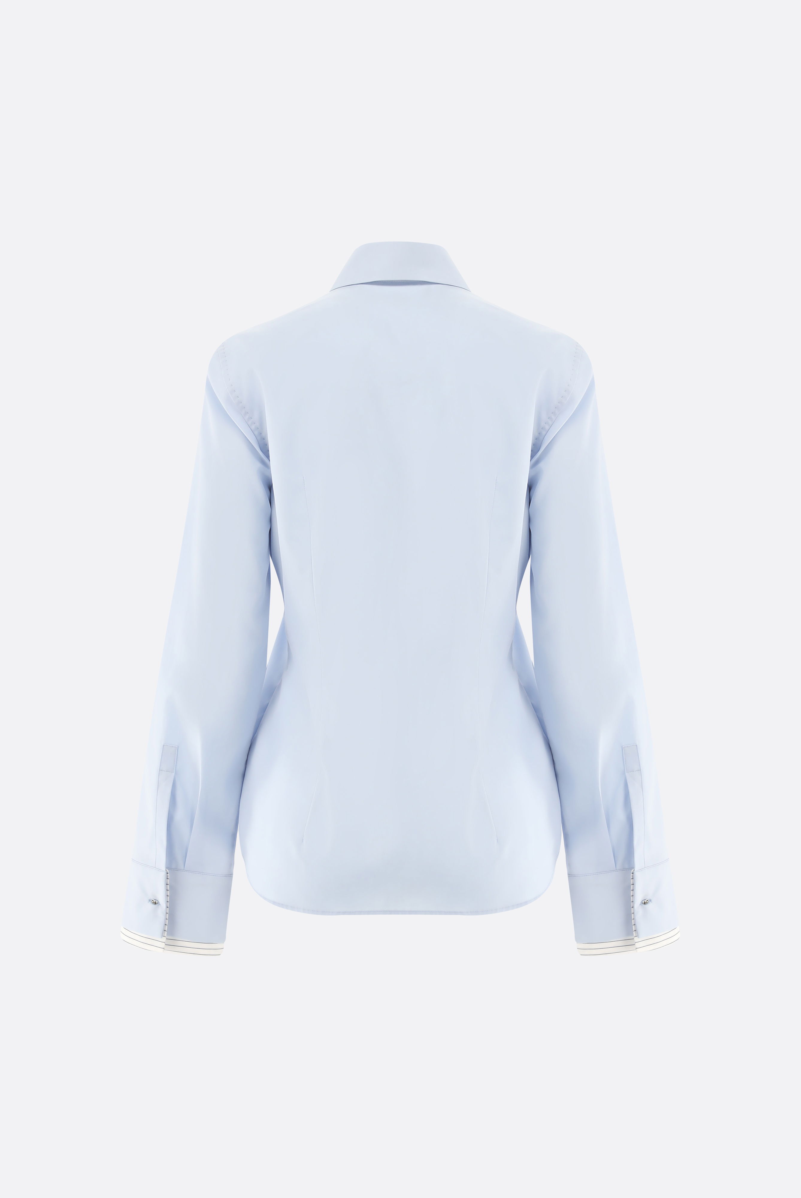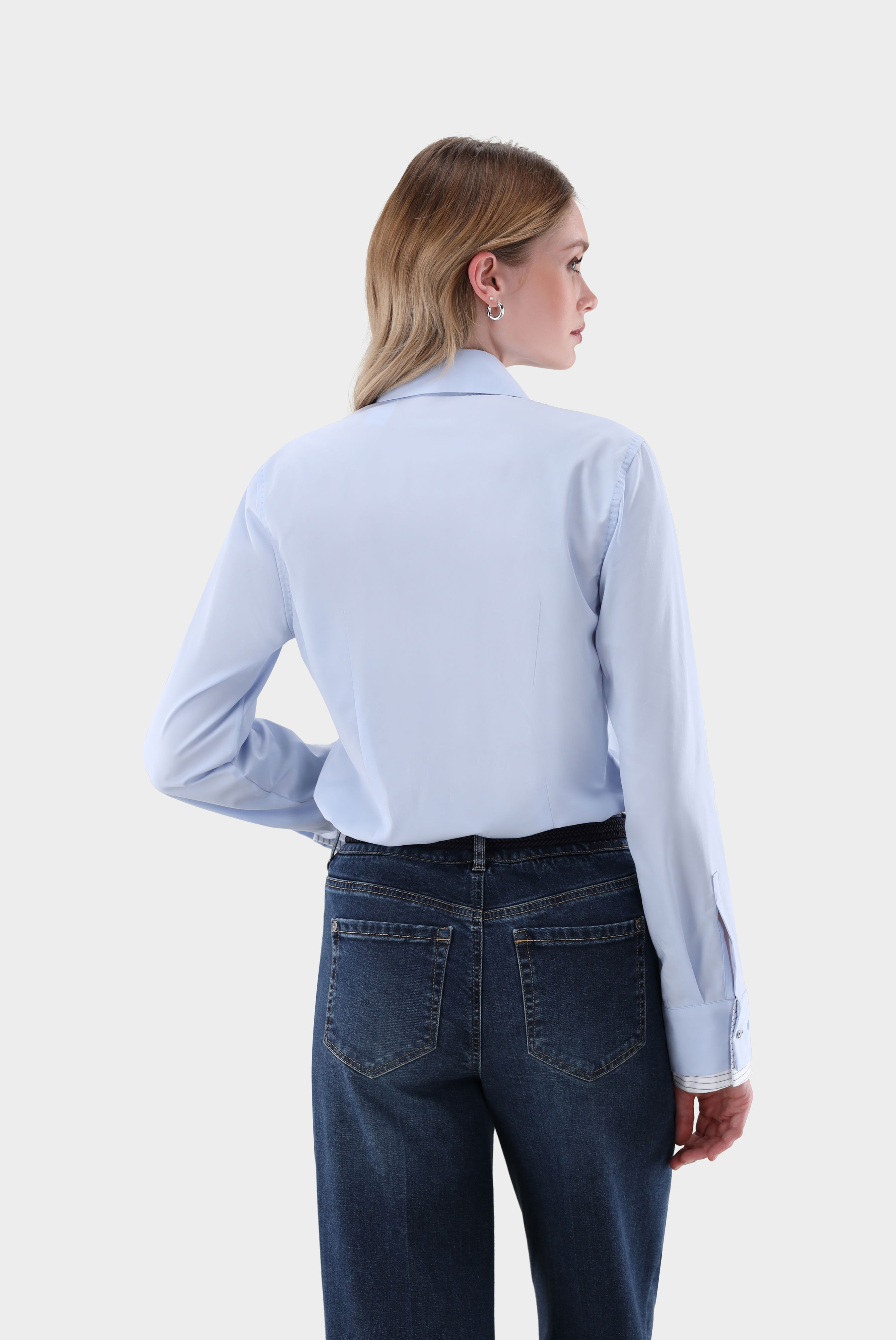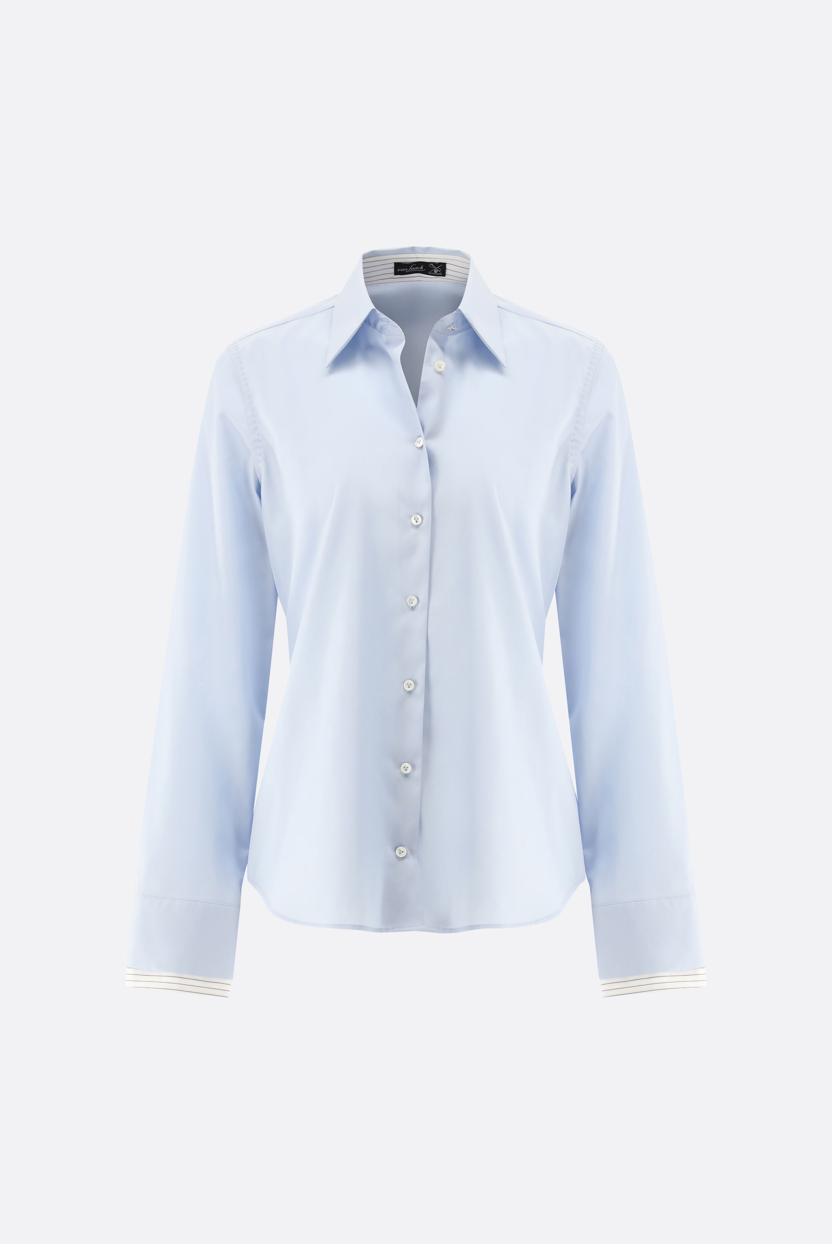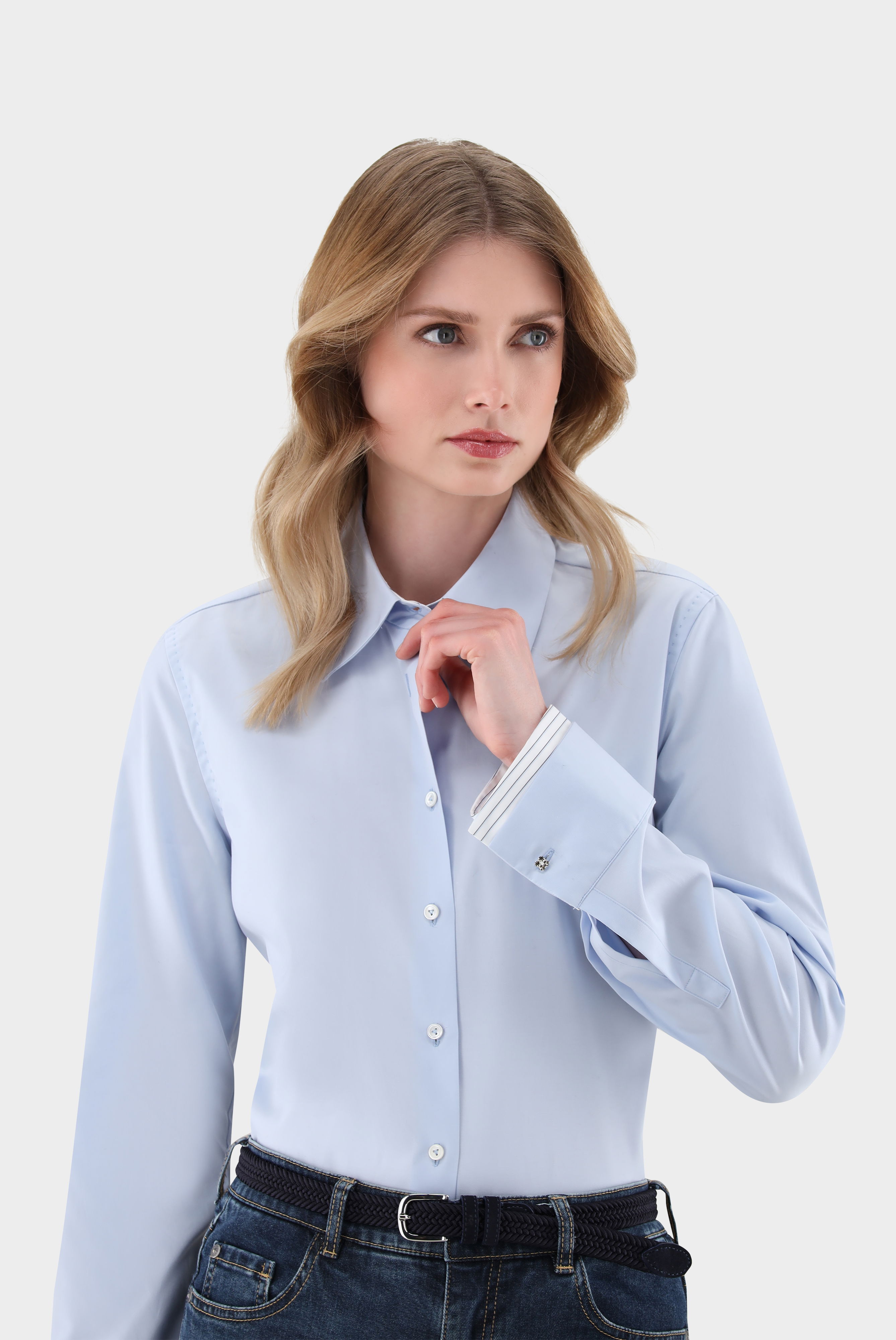 Diese taillierte Bluse aus einfarbigem Baumwollpopeline überzeugt durch ihre elegante Passform und hochwertige Verarbeitung. Lange Ärmel mit markanten Doppelmanschetten samt Kontraststoff setzen stilvolle Akzente. Sichtbare Nähte unterstreichen den modernen Look, während dekorative Knöpfe das Design harmonisch abrunden. Dank des atmungsaktiven Materials bietet die Bluse hohen Tragekomfort und lässt sich vielseitig kombinieren – ideal für Business-Outfits oder elegante Freizeit-Looks.