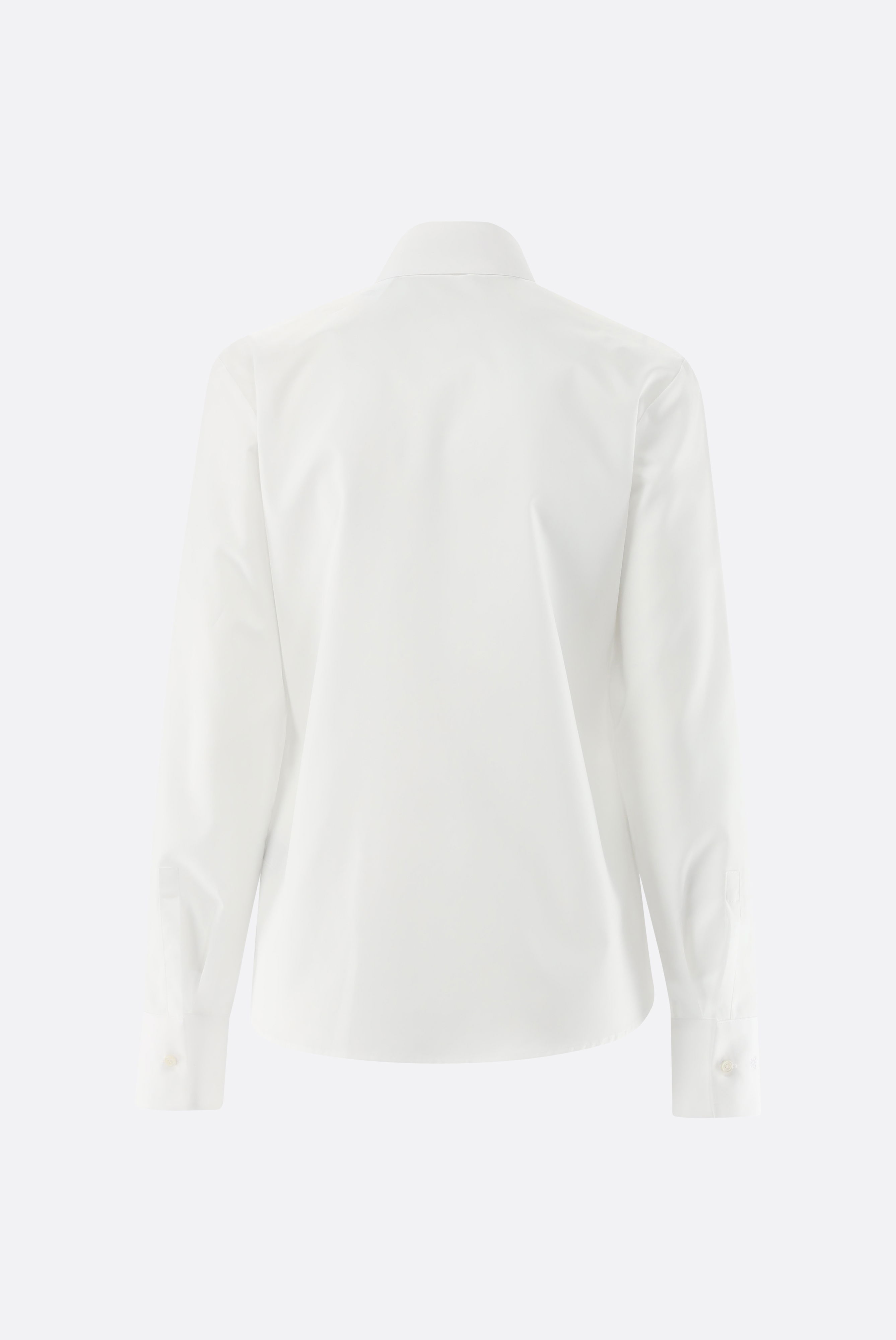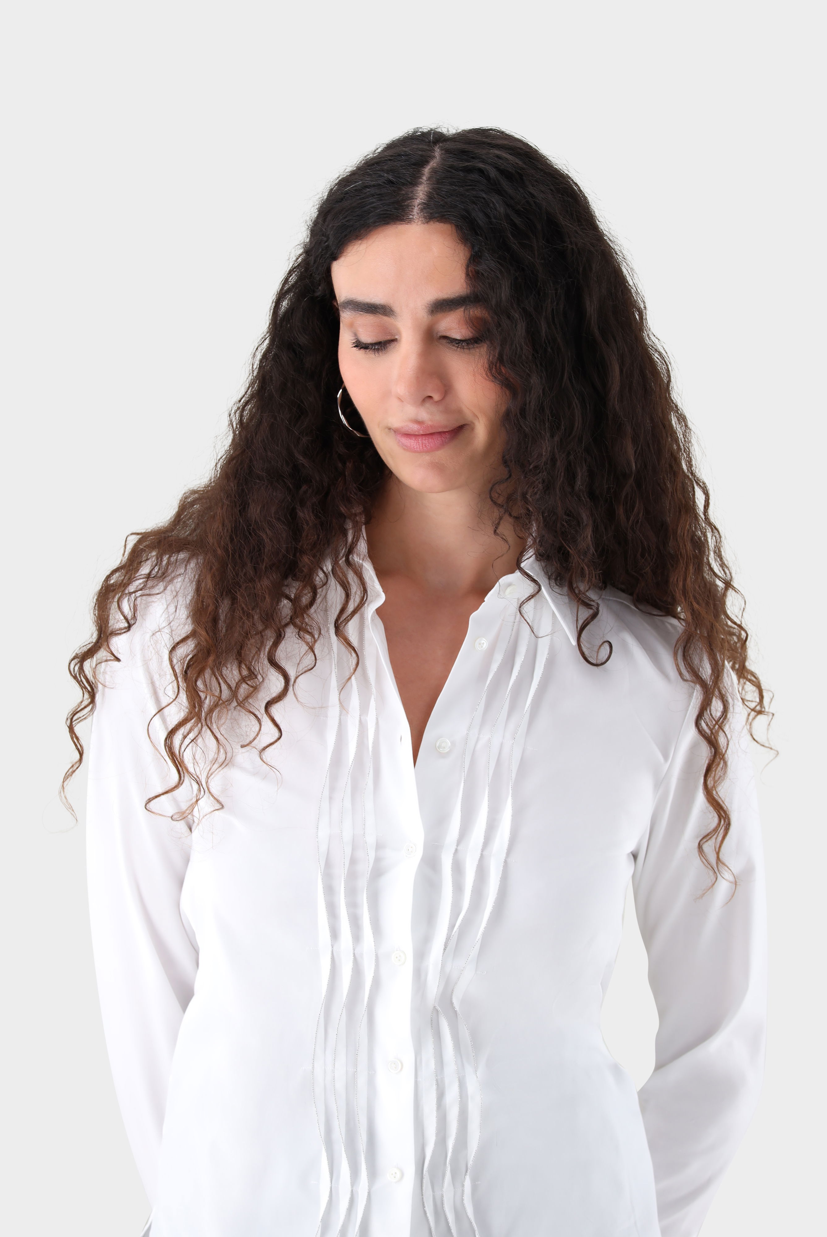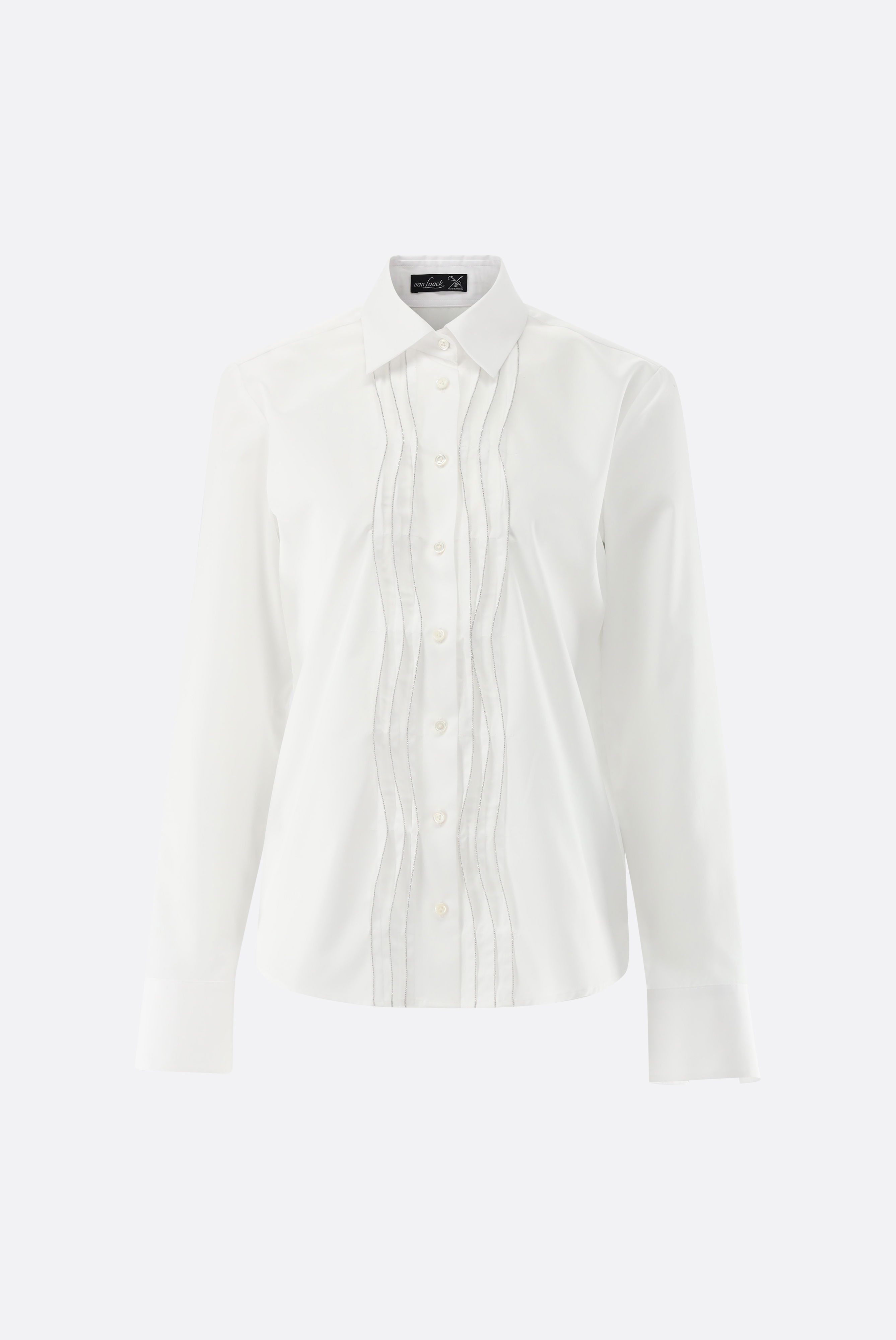 Diese leicht taillierte Hemdbluse aus feiner Baumwollpopeline vereint klassische Eleganz mit modernen Akzenten. Lange Ärmel und eine feminine Passform sorgen für eine gepflegte Silhouette. Vorderseitige Falten mit dezent glänzenden Details setzen stilvolle Highlights, während Seitenschlitze zusätzlichen Tragekomfort und Bewegungsfreiheit bieten. Das glatte, atmungsaktive Material liegt angenehm auf der Haut und macht die Bluse zur vielseitigen Wahl für Business- und stilvolle Alltagslooks.