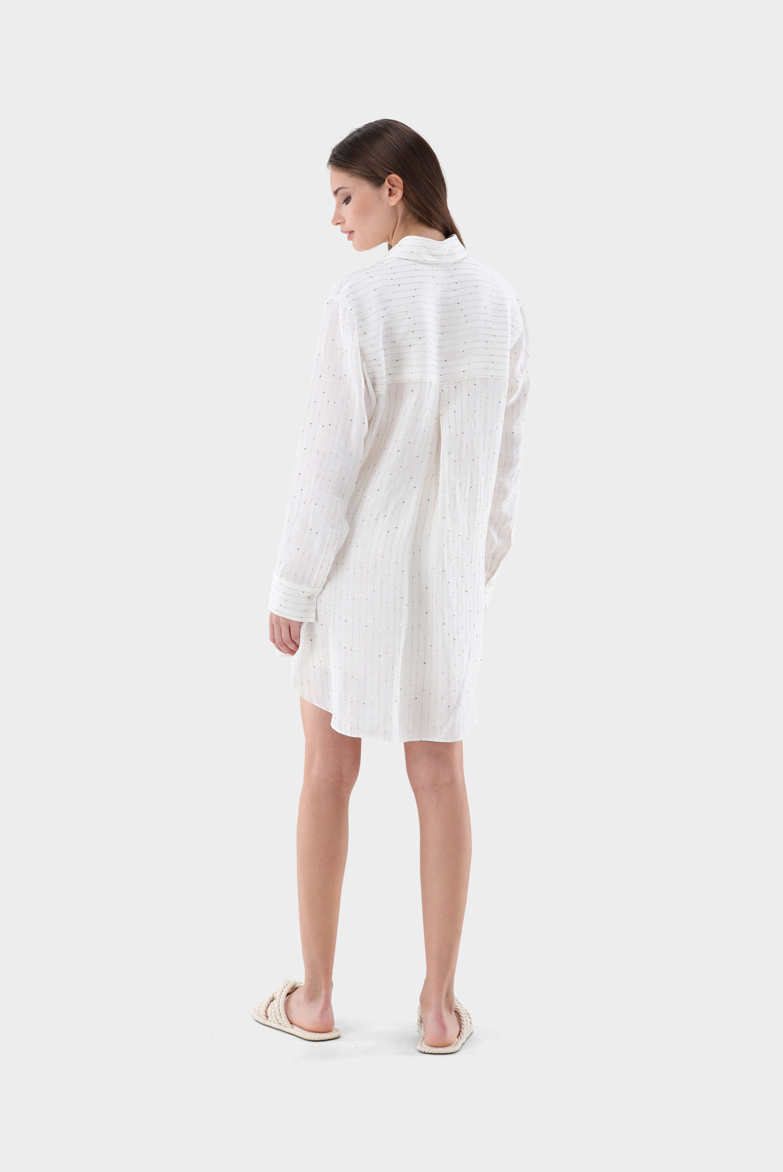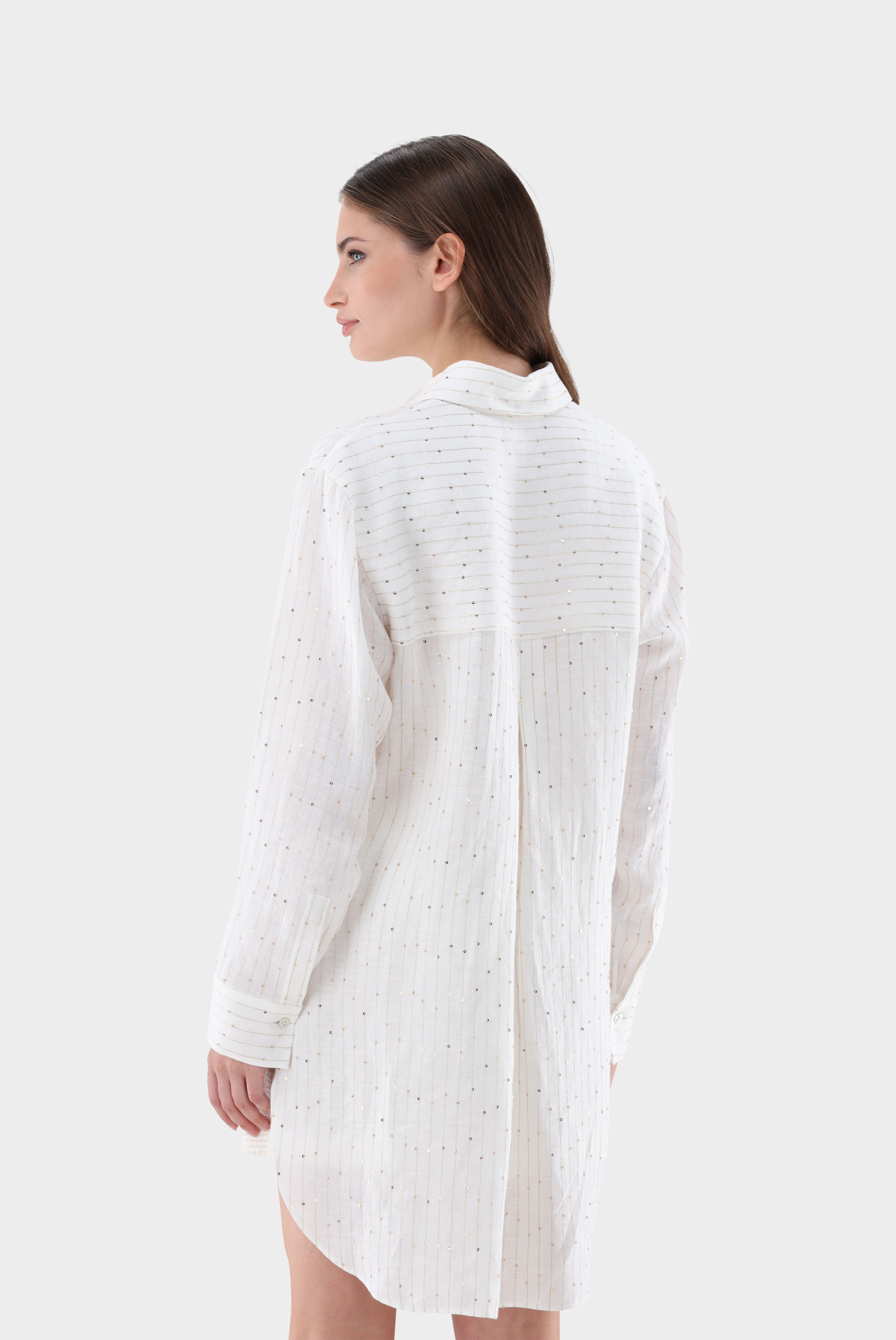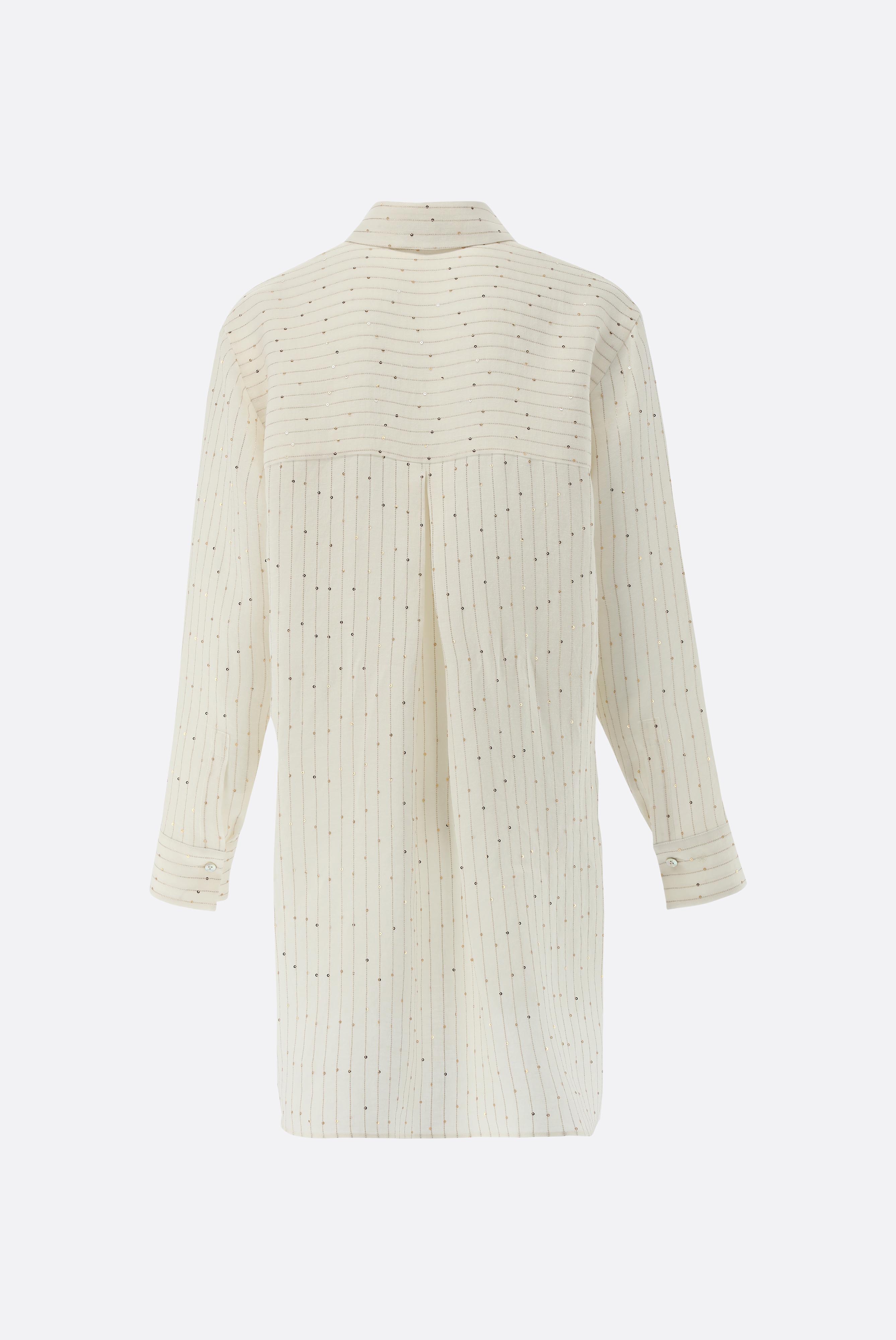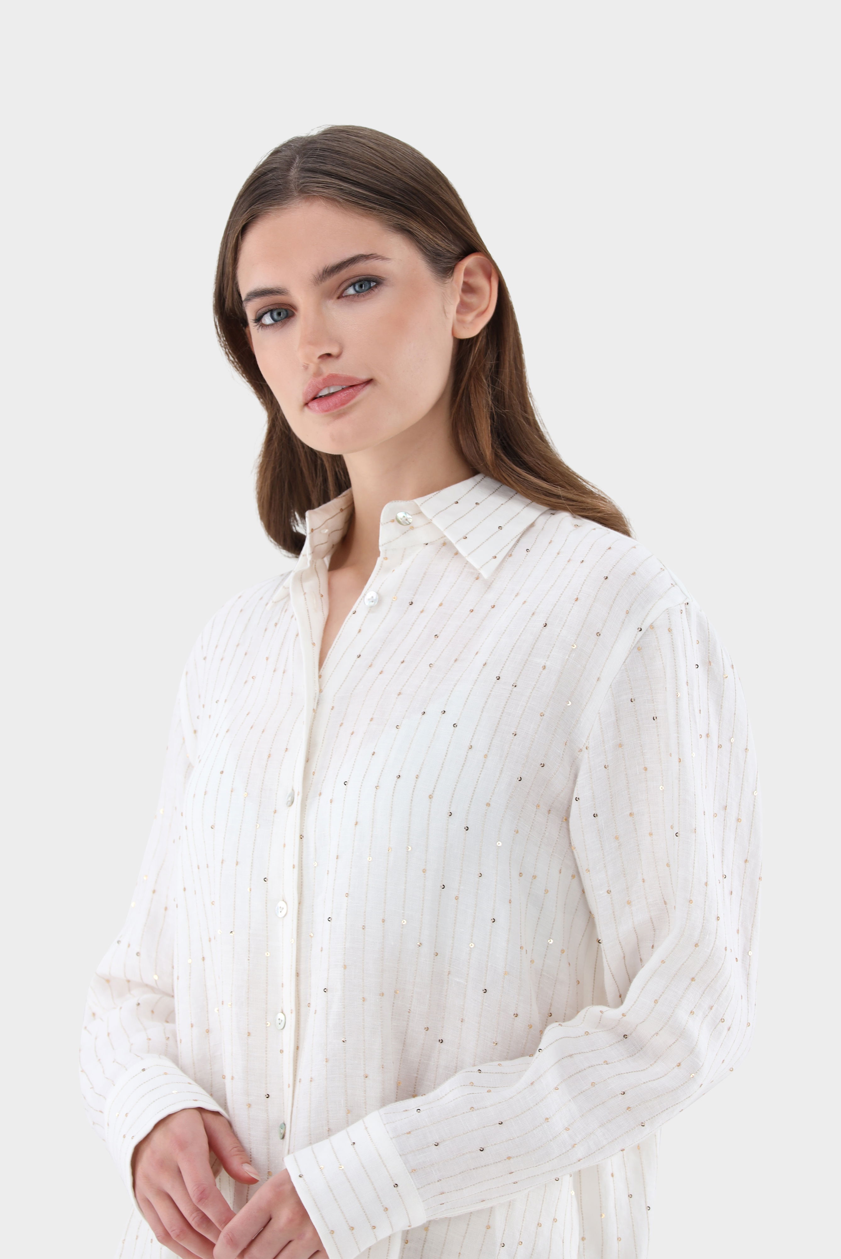Diese Hemdbluse im Loose Fit aus einer hochwertigen Leinen-Polyester-Mischung kombiniert Komfort mit stilvollen Details. Die Rückenpasse mit Falten-Detail und die dekorative Stickerei mit Pailletten verleihen der Bluse eine elegante Note. Die langen Ärmel und der lockere Schnitt sorgen für eine bequeme Passform. Diese Hemdbluse ist die perfekte Wahl für einen lässigen, aber dennoch schicken Look – ideal für den Strand oder den Sommerurlaub.