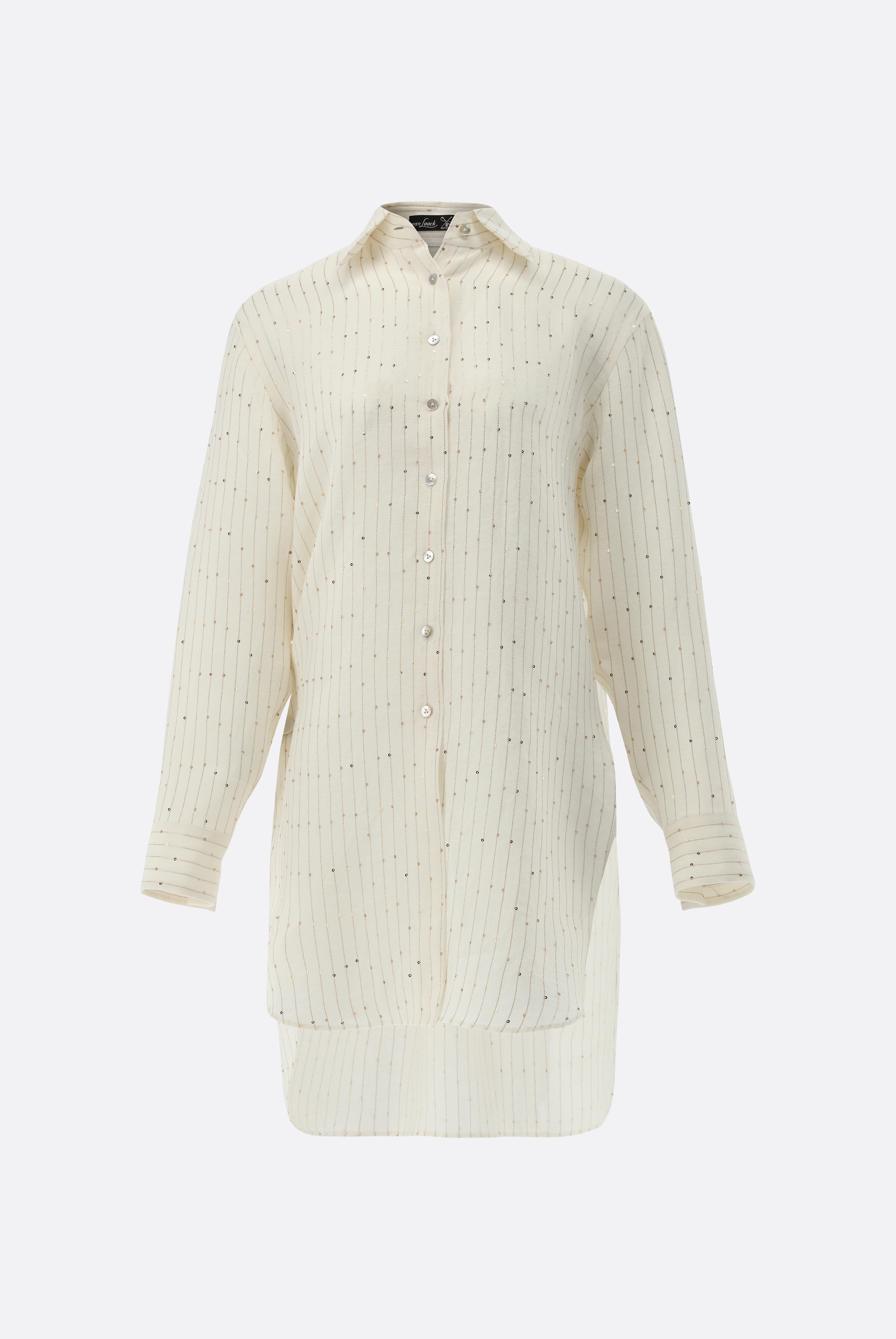Look aus Hemdbluse mit Pailletten und Stickerei