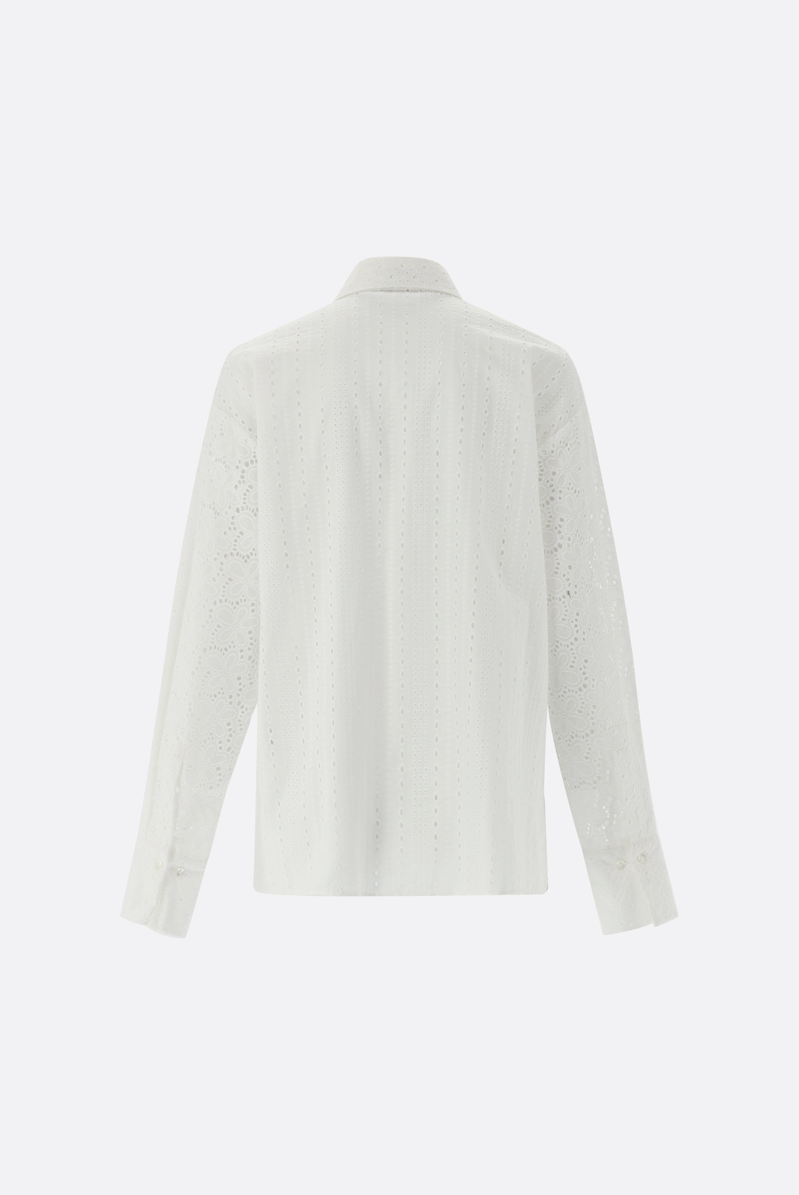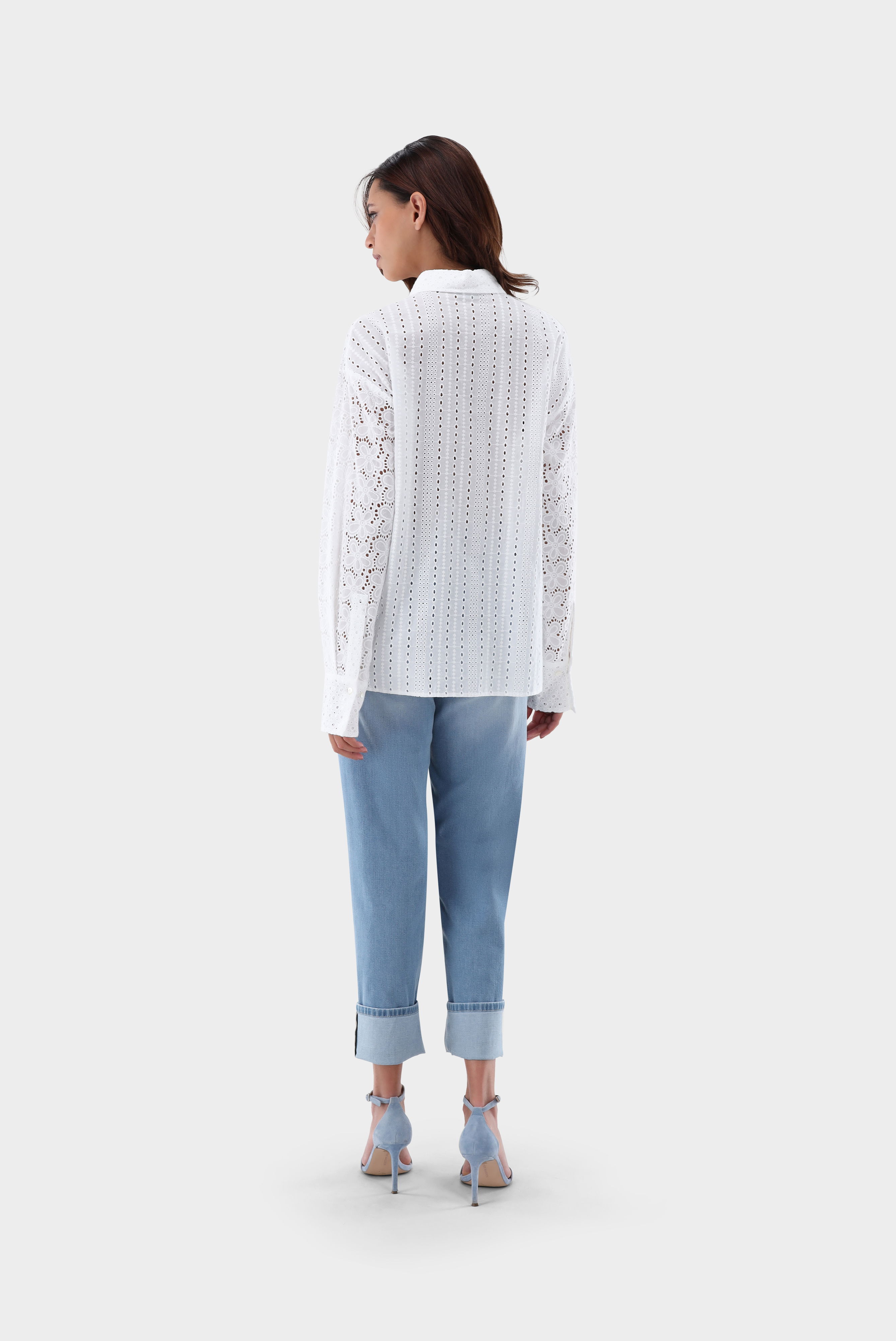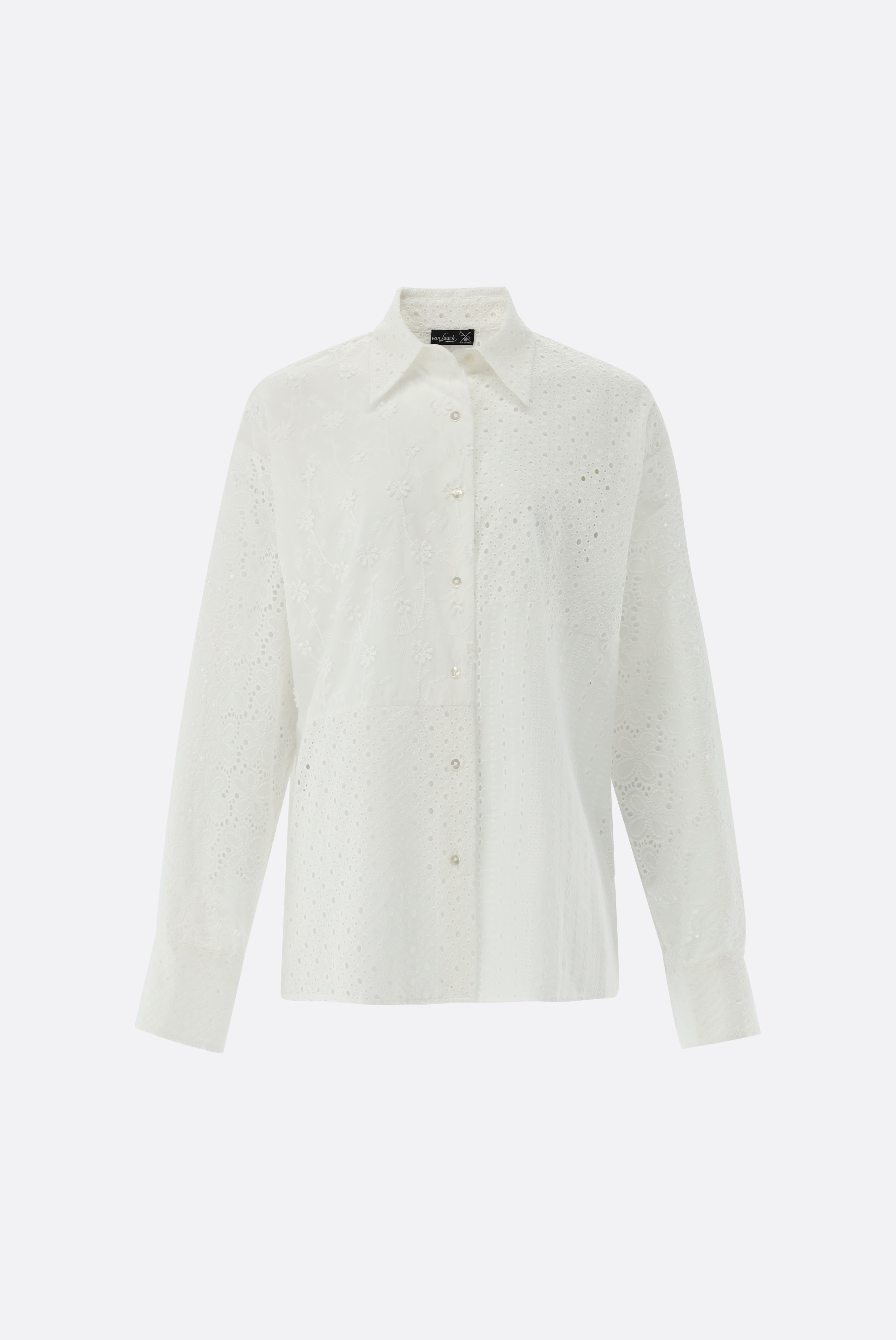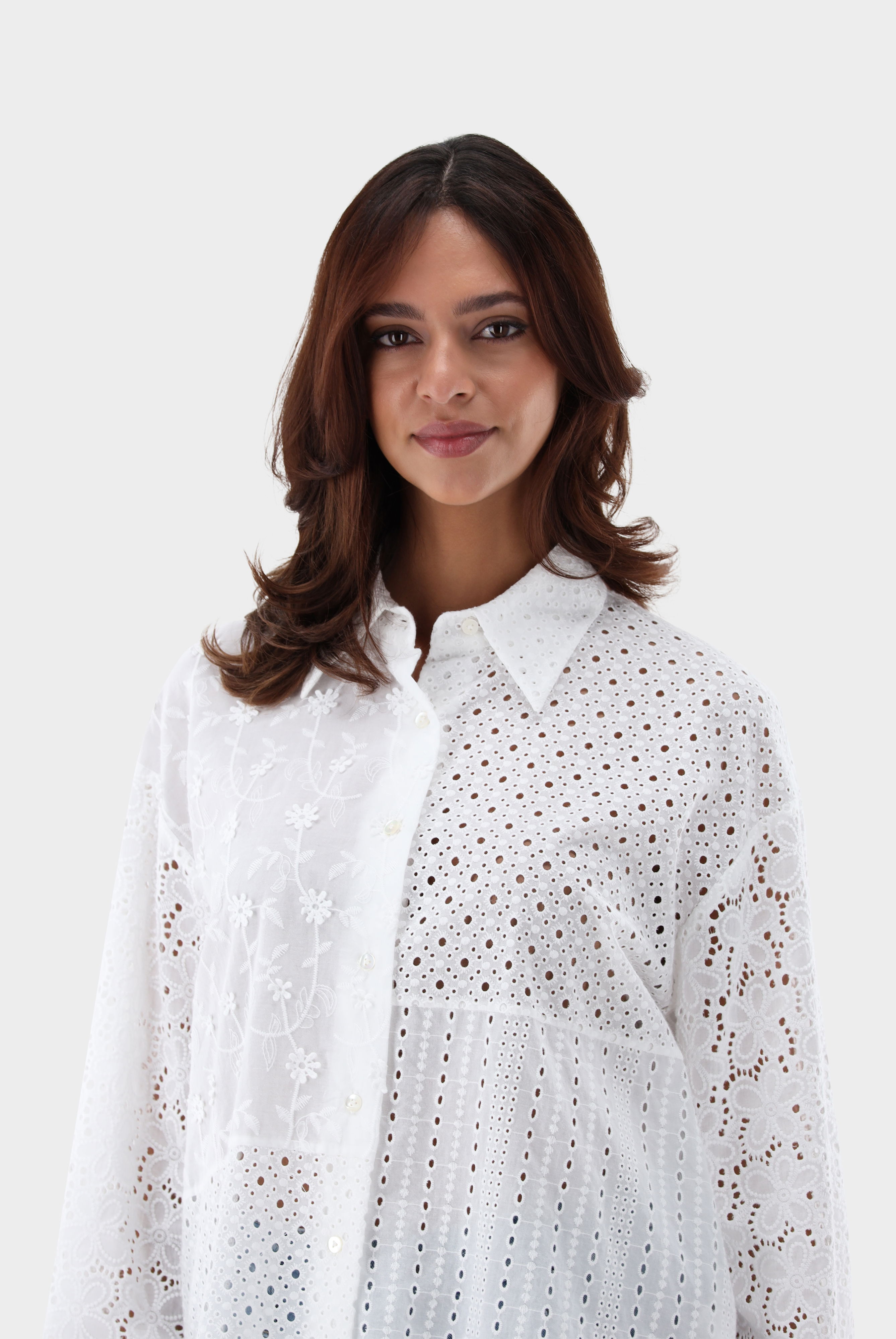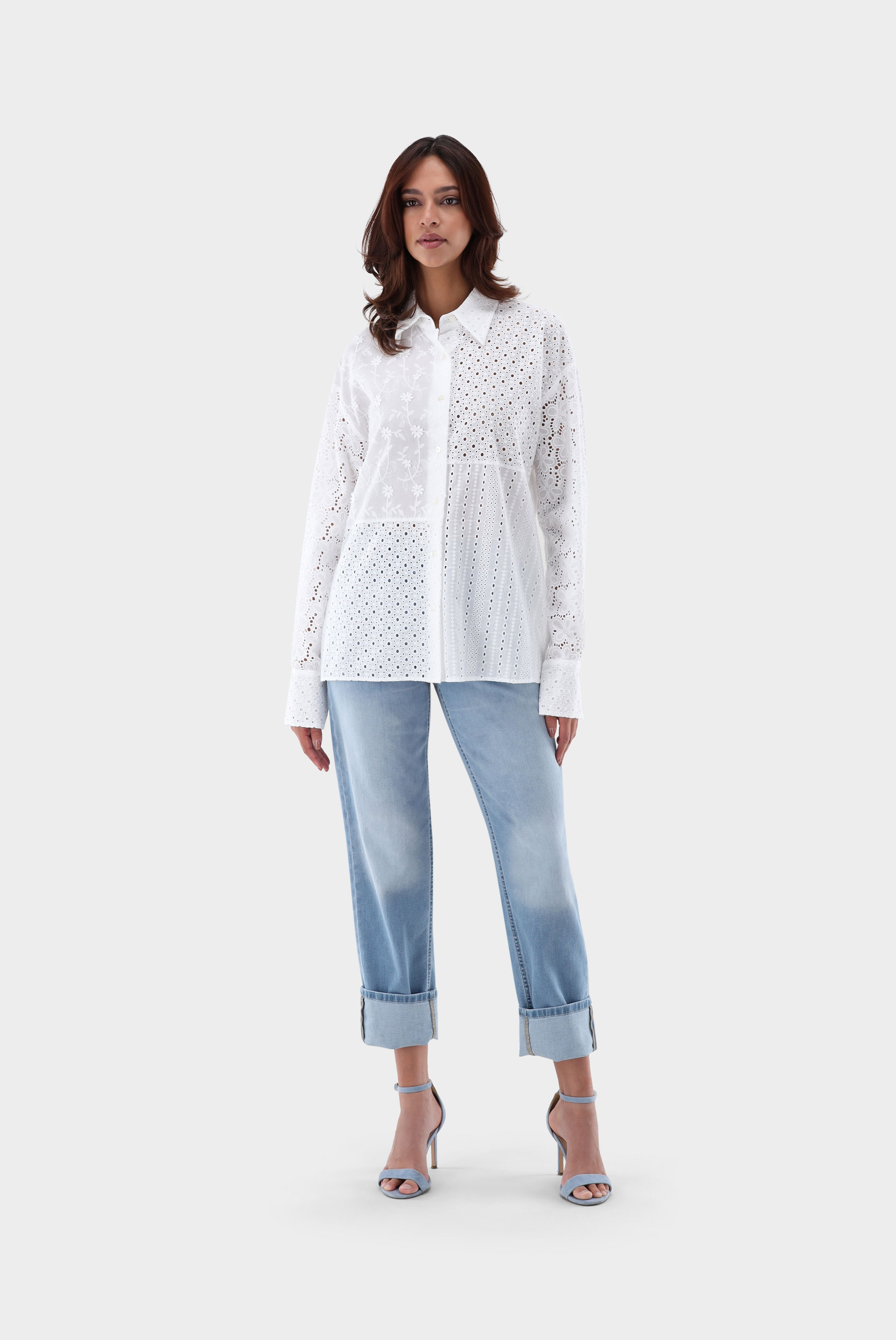 Look aus Hemdbluse mit Patchwork-Lochstickerei