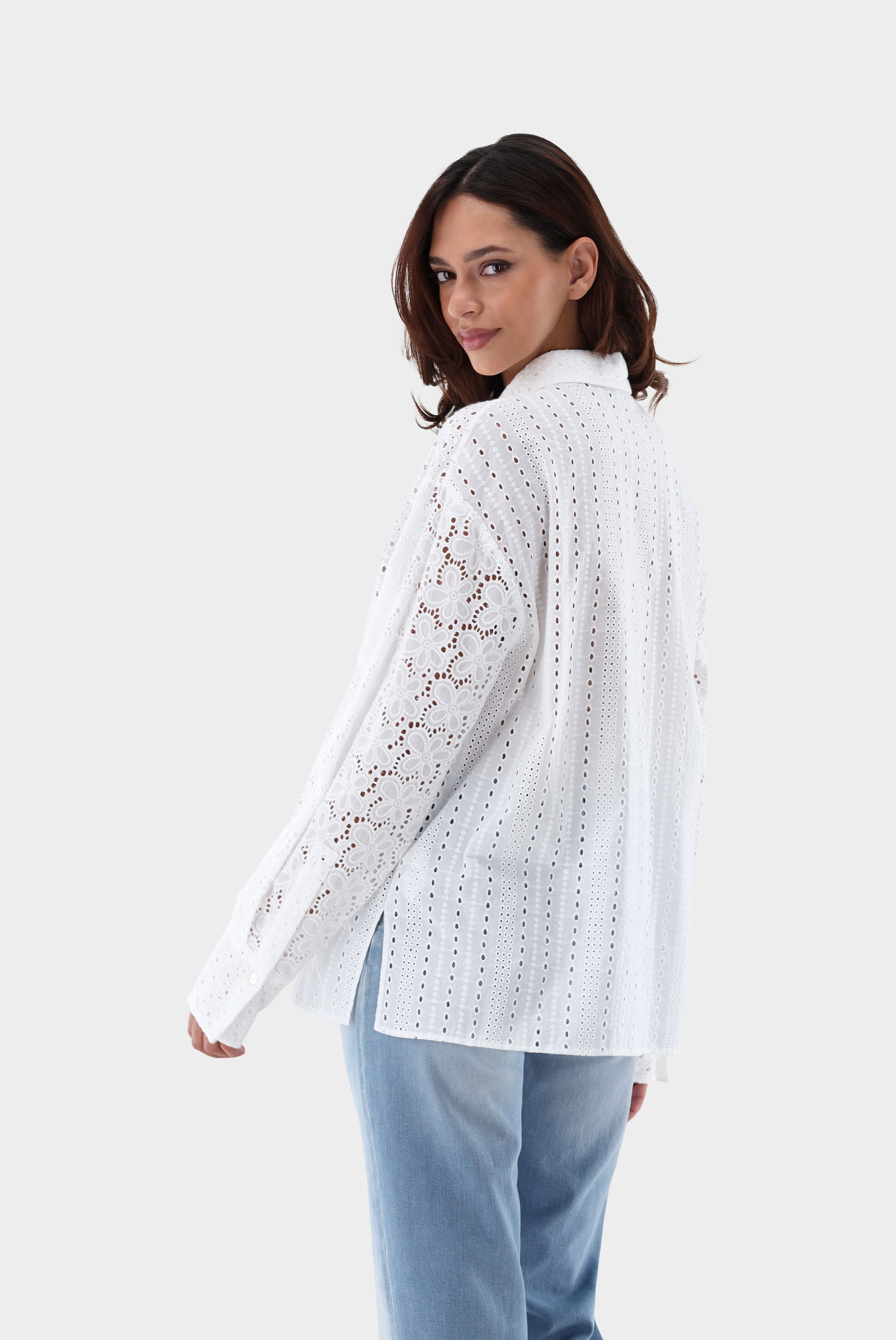 Diese lockere Hemdbluse besticht durch ihre originellen Patchwork-Details aus verschiedenen Lochstickereien. Mit ihrem legeren Schnitt und den überschnittenen Schultern bietet die Bluse hohen Tragekomfort und eine moderne Passform. Hergestellt aus reiner Baumwolle, vereint sie Qualität und Stil. Die langen Ärmel und die edlen Perlmuttknöpfe runden das Design harmonisch ab. Perfekt geeignet für casual Outfits und stilvolle Business-Looks.