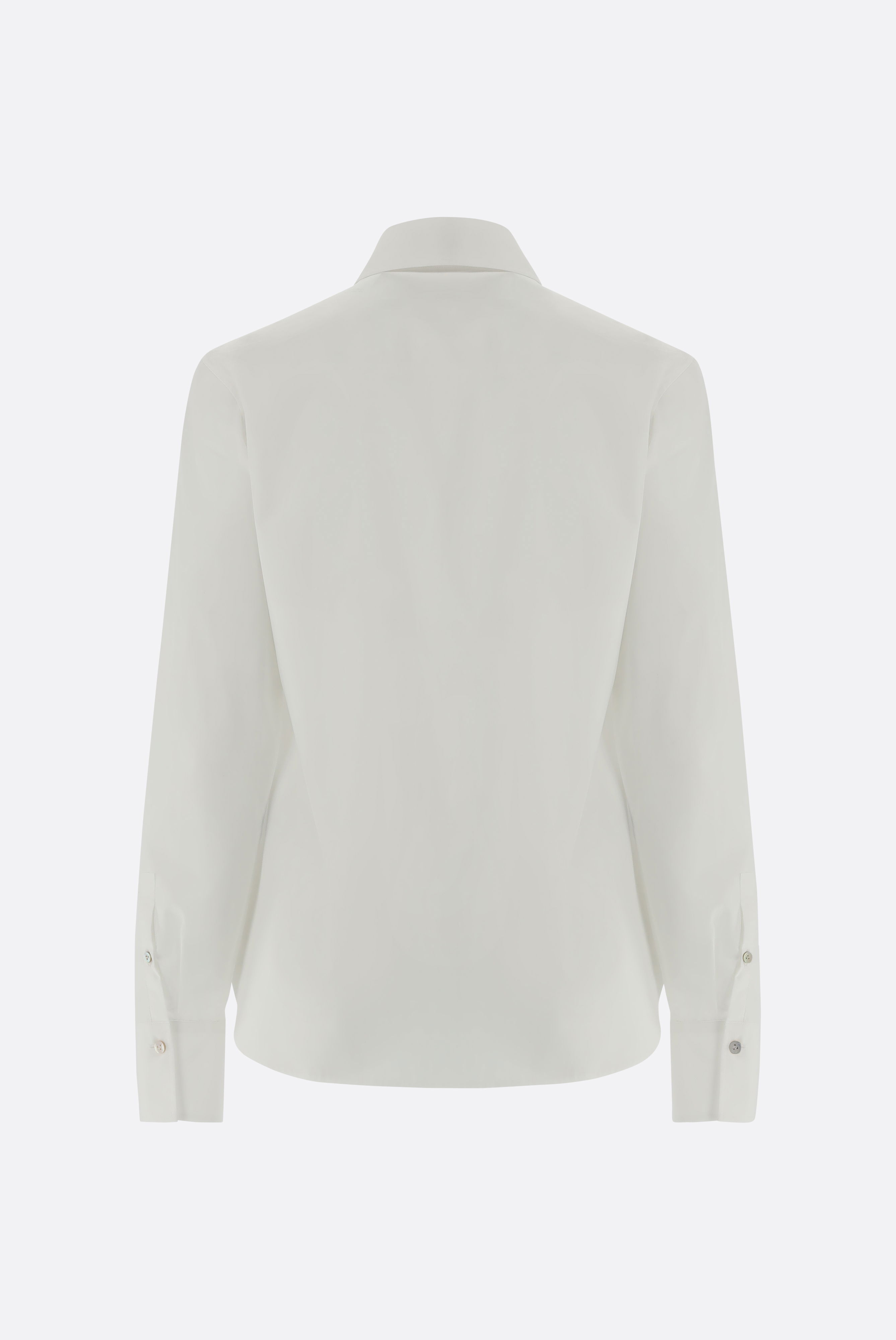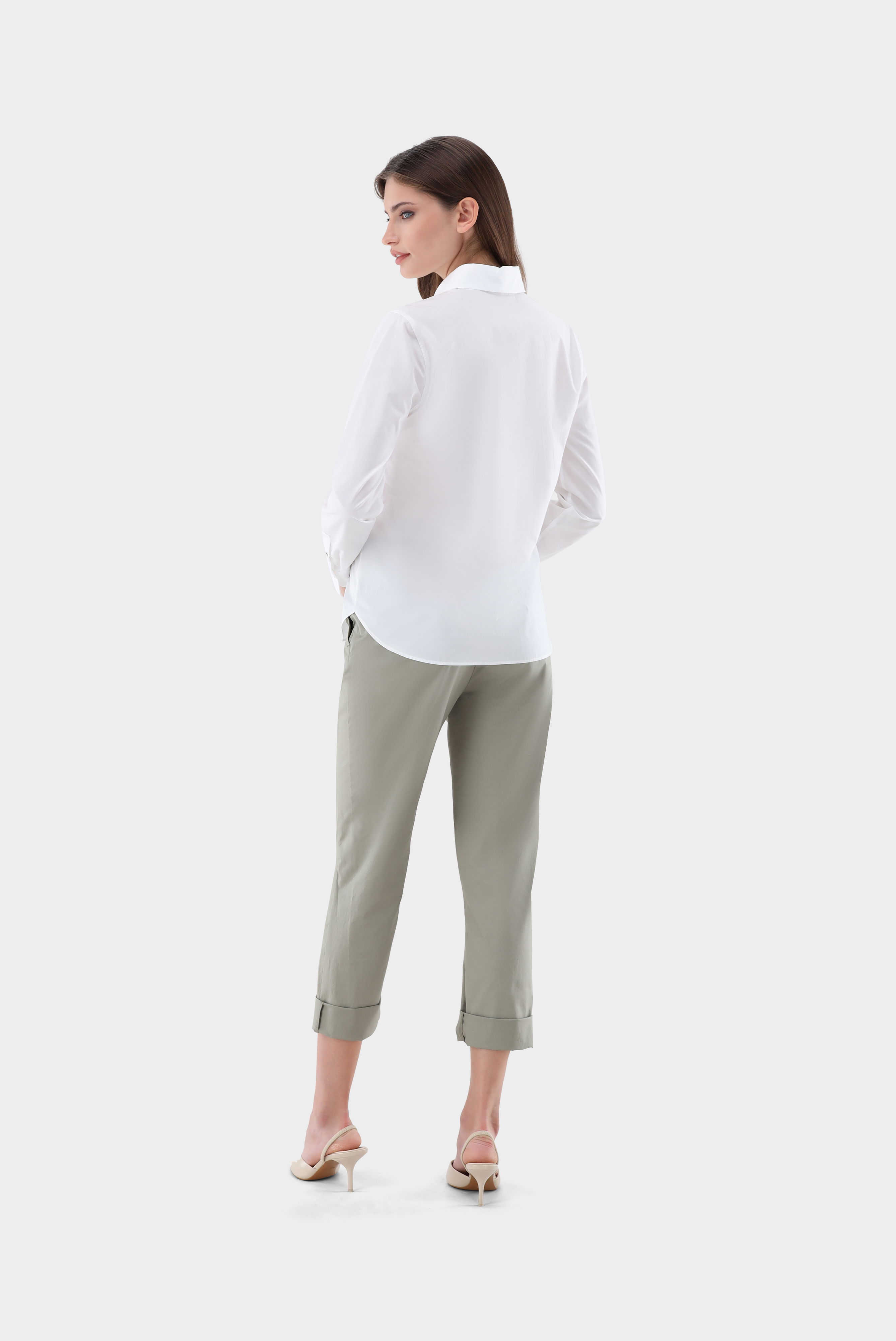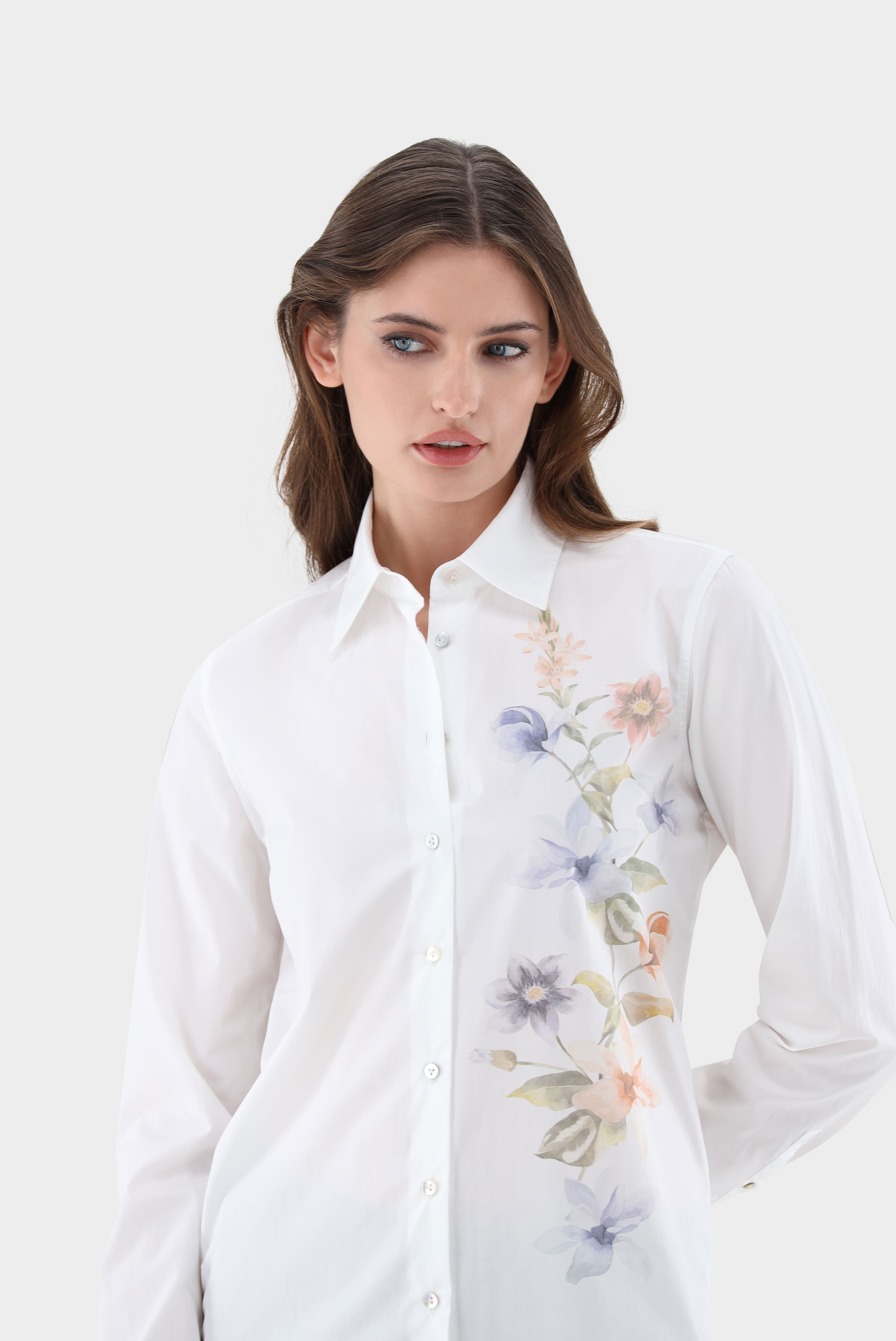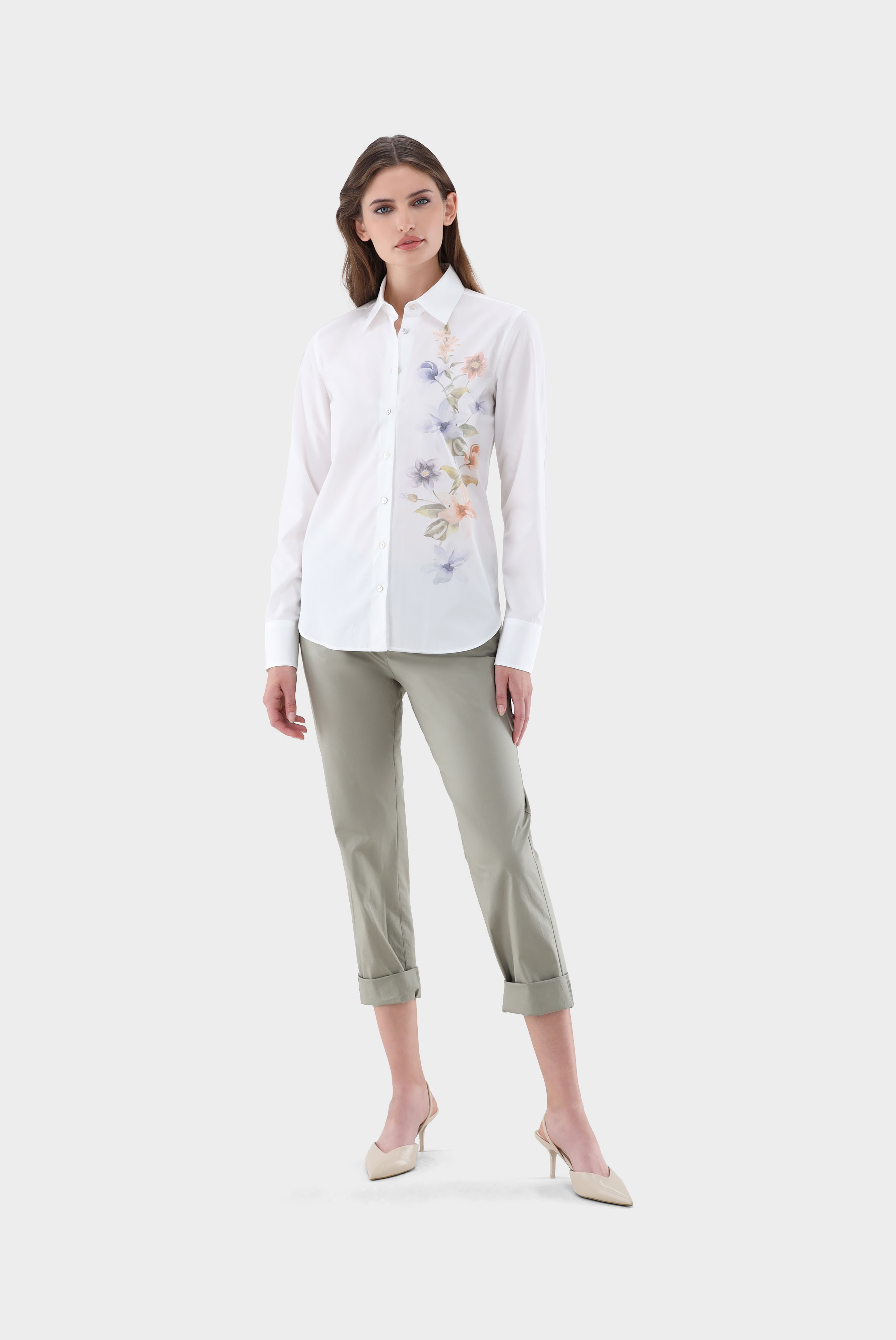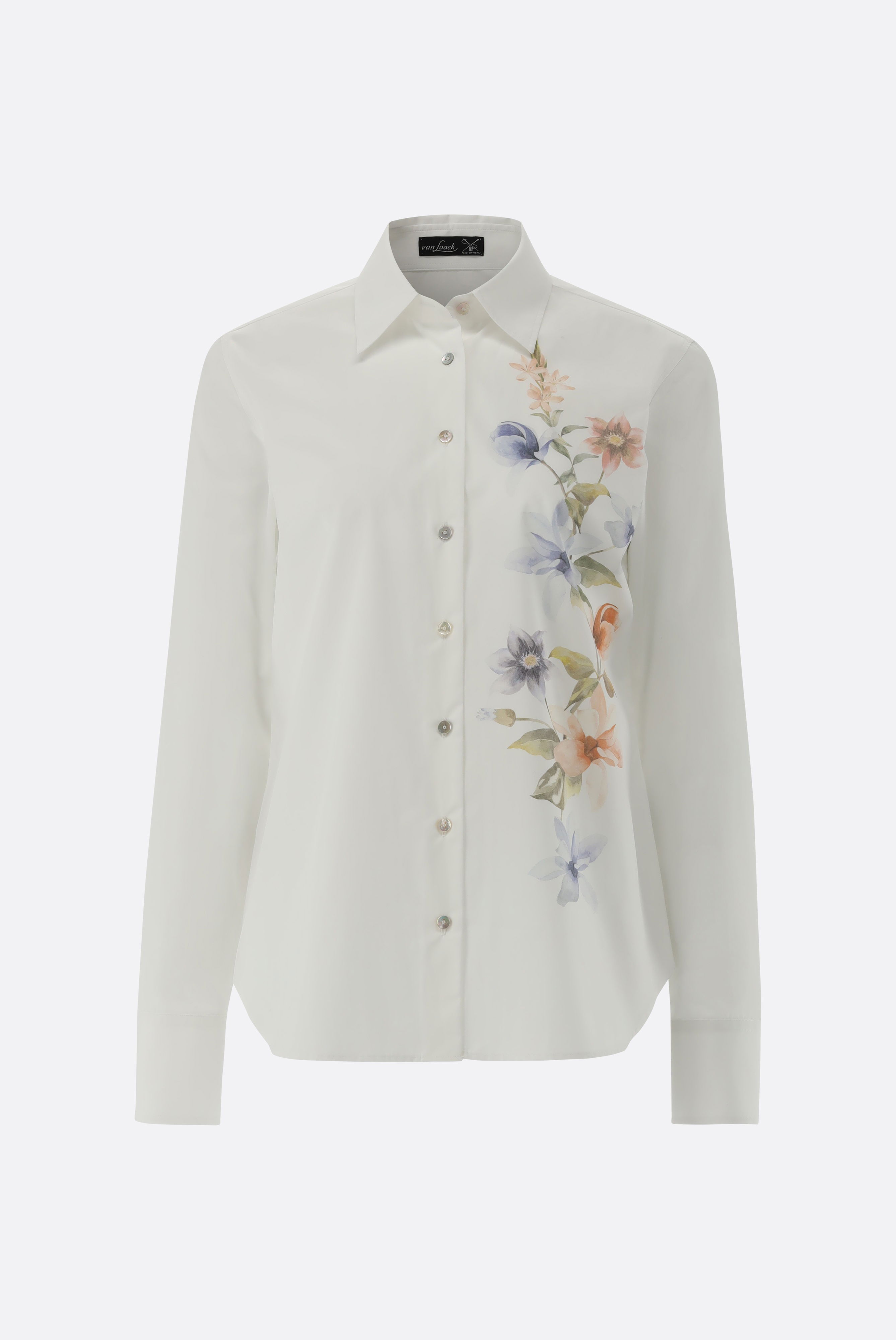 Diese taillierte Hemdbluse aus hochwertiger Baumwolle überzeugt durch ihren dezenten, pastellfarbenen Blumenranken-Print, der kunstvoll auf der linken Vorderseite platziert ist. Ergänzt durch edle Perlmuttknöpfe ist die Bluse ein idealer Begleiter für Casual- und Business-Looks. Ein stilvolles Design, das sowohl Eleganz als auch Leichtigkeit ausstrahlt.