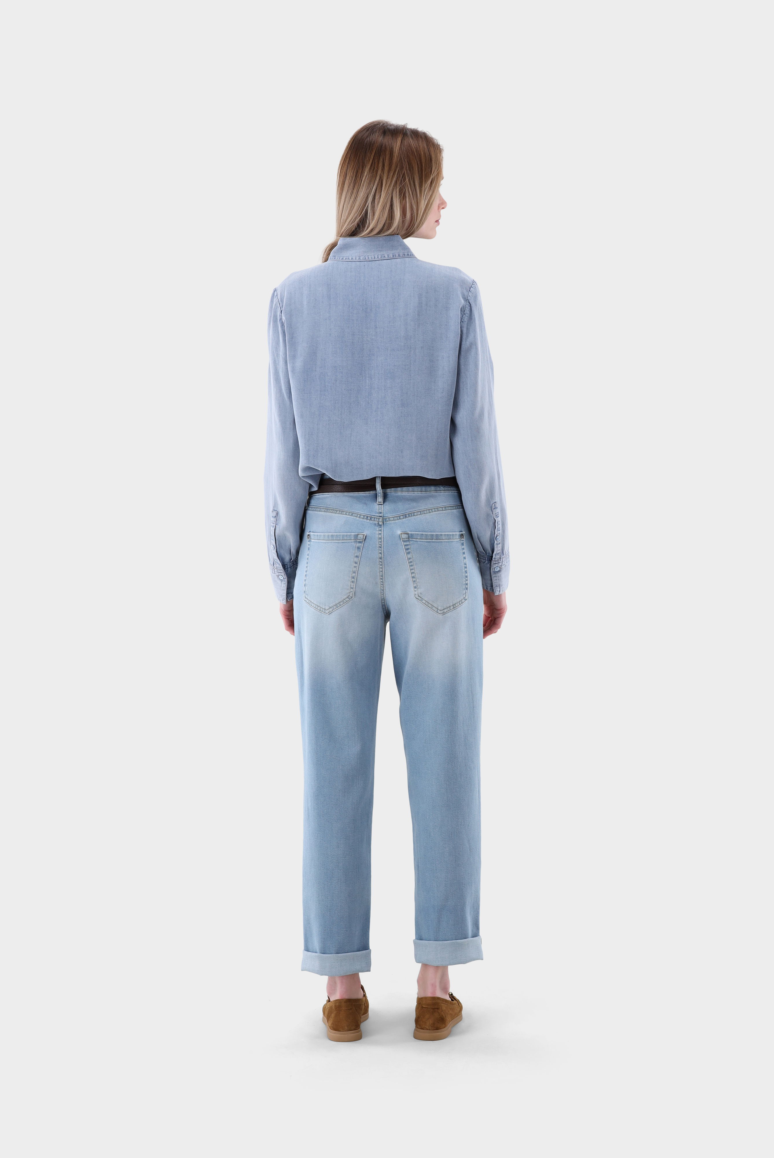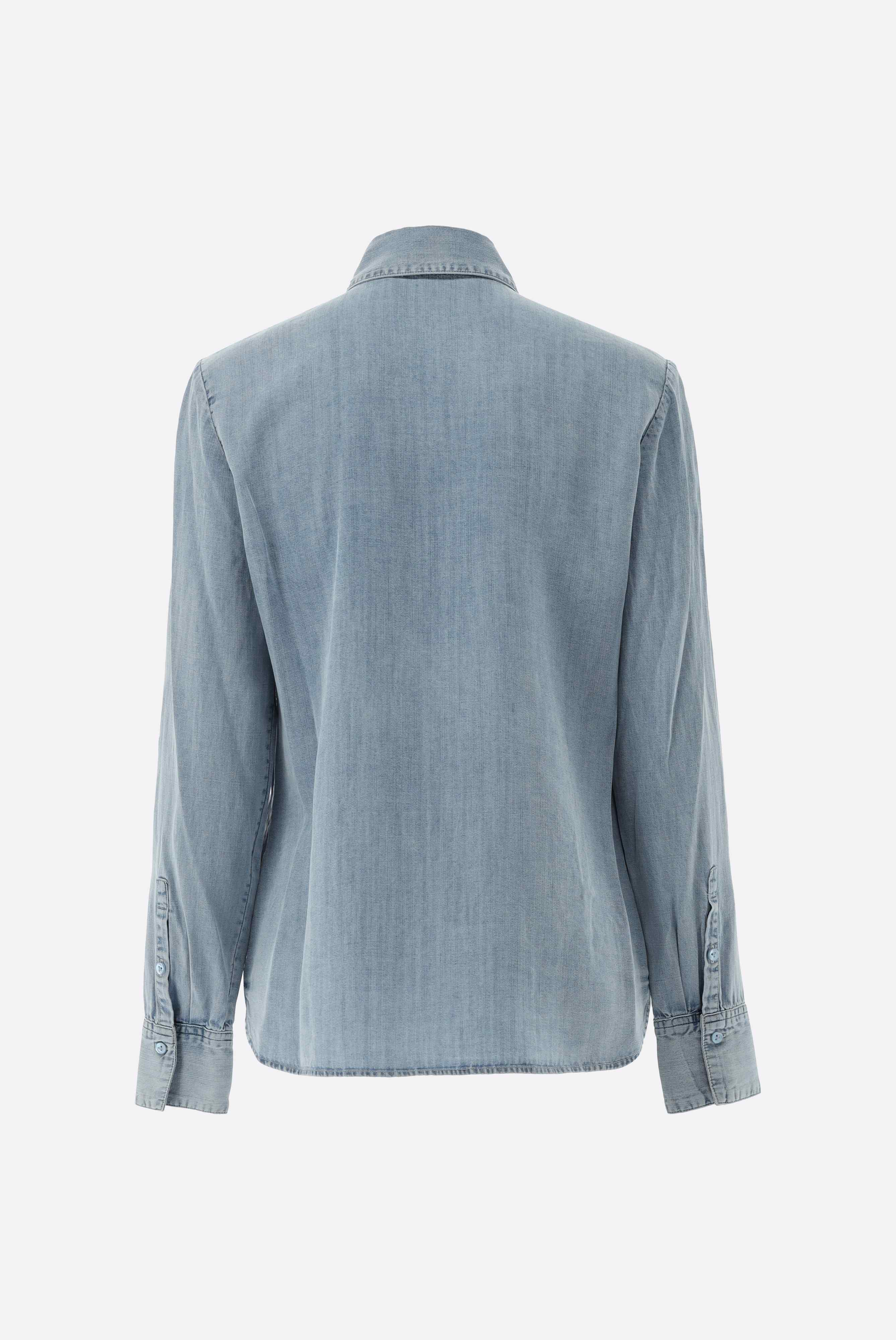 Diese weich fließende Hemdbluse aus gebleichtem Denim-Tencel überzeugt durch ihre lässige Eleganz und besondere Details. Die verdeckte Knopfleiste sorgt für ein schlichtes Erscheinungsbild, während die zarten Spitzen-Ausschnitte an der Vorderseite einen femininen Akzent setzen. Ergänzt wird das Design durch farblich passende Stickereien und edle Perlmuttknöpfe. Eine vielseitige Casual-Hemdbluse für entspannte Looks mit Stil.