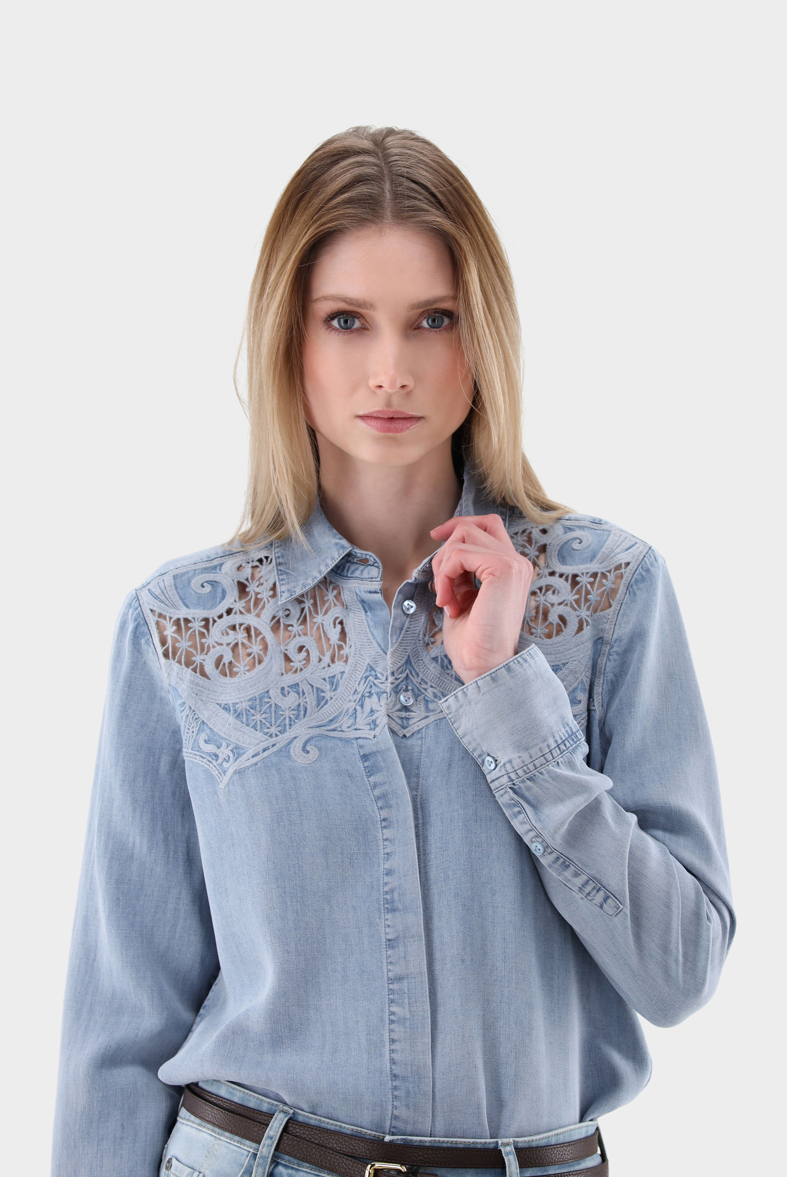 Look aus Hemdbluse mit Spitzenausschnitten in Jeans-Optik