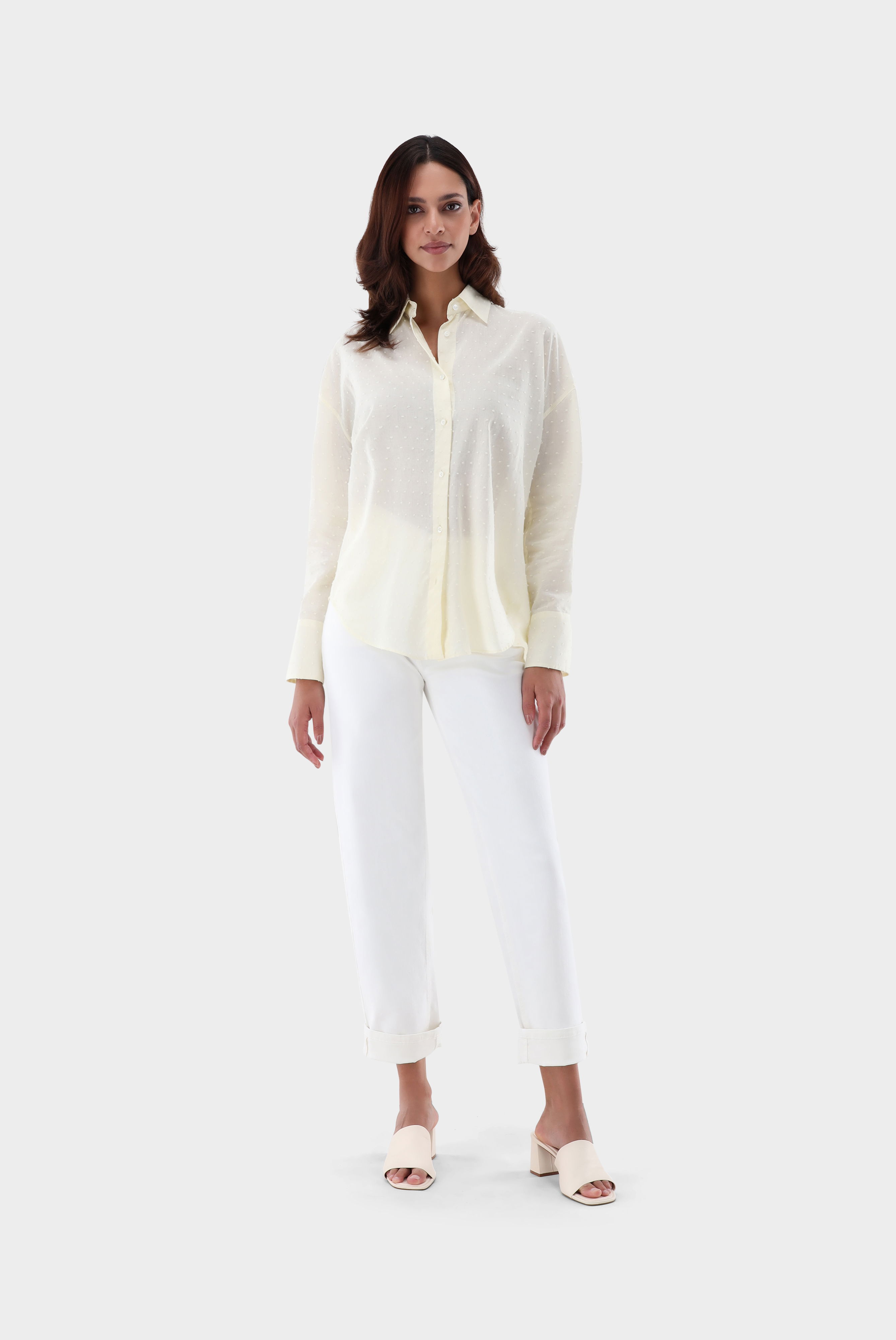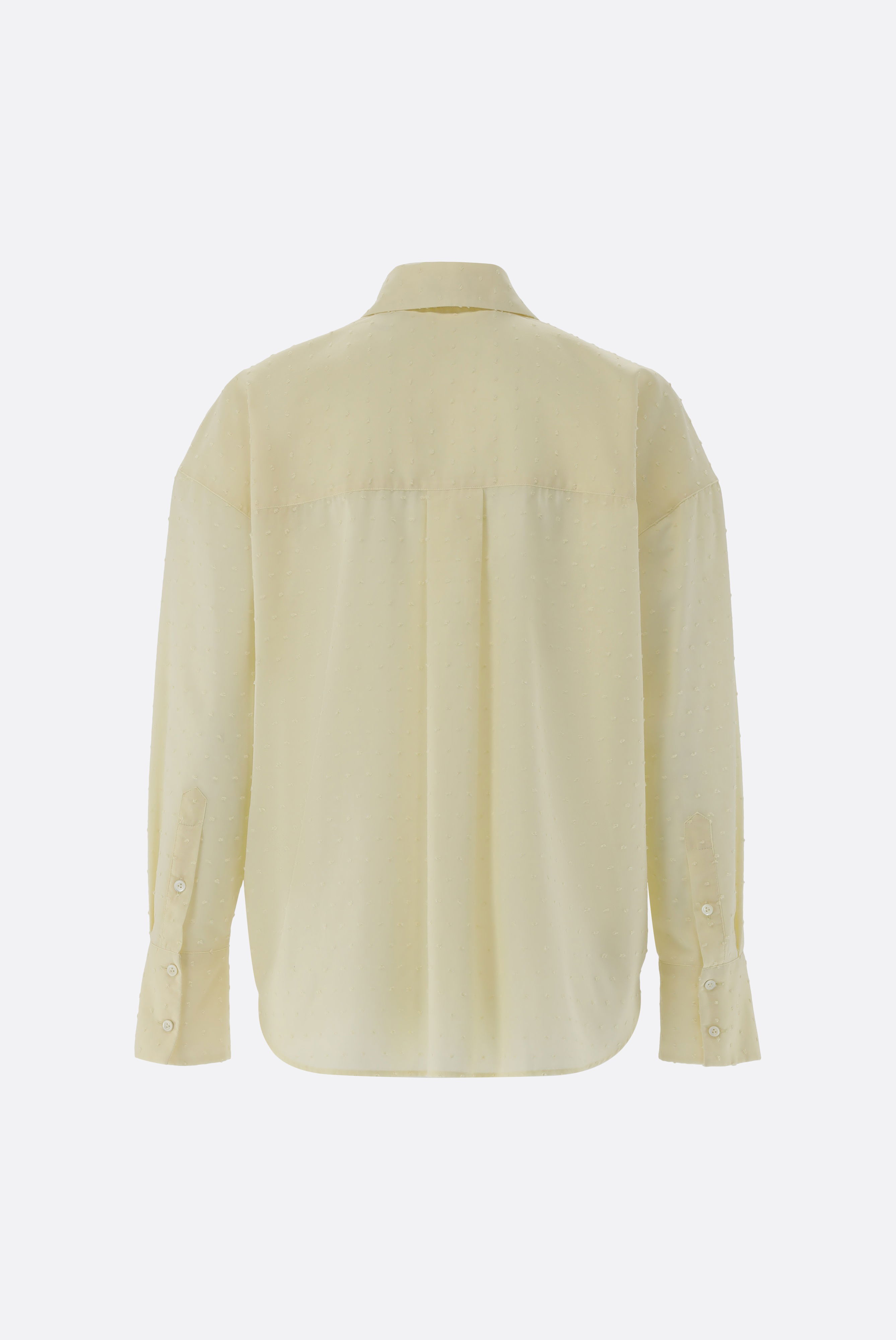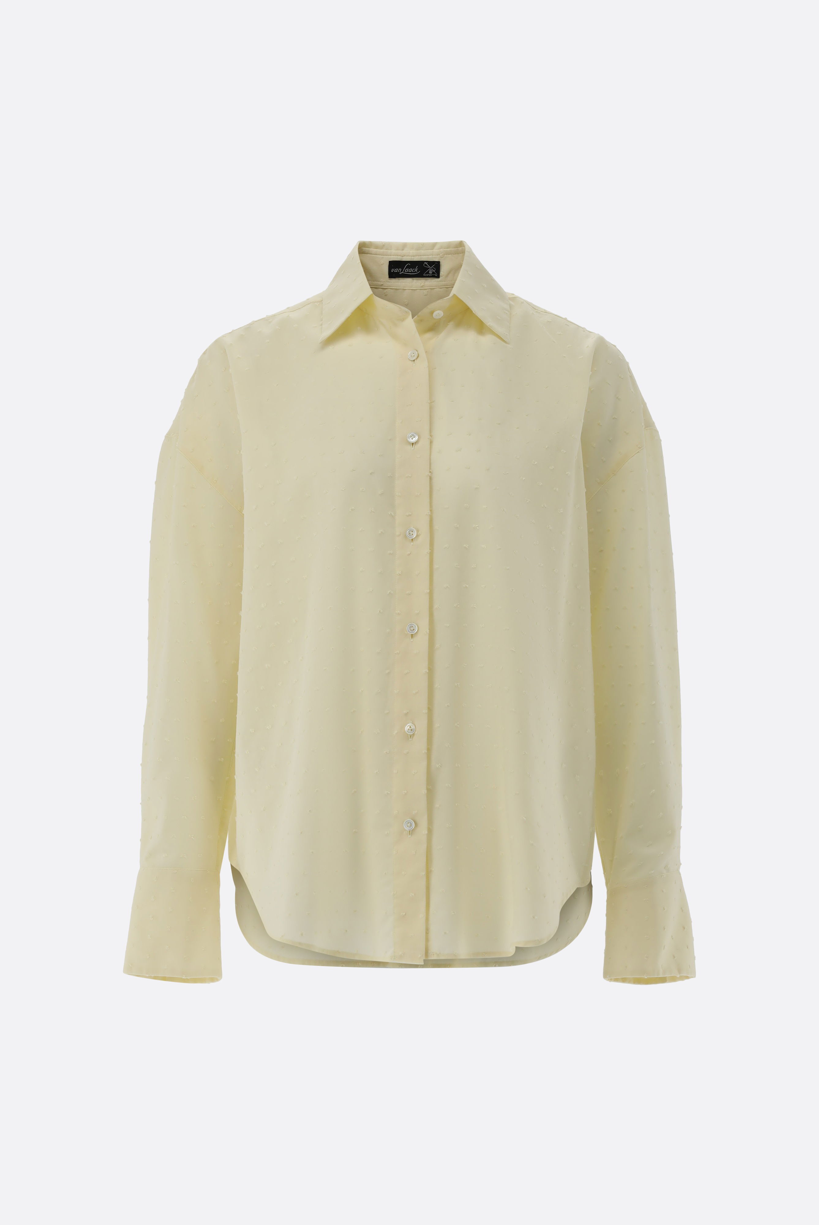 Diese locker geschnittene Hemdbluse aus Baumwoll-Plumetis besticht durch das besonders luftige Material. Plumetis ist ein leichter Baumwoll Batist mit kleinen, erhabenen Punkten die an Federn oder Wolken erinnern. Die überschnittenen Schultern und die Rückenpasse mit Boxfalte sorgen für einen modernen und lässigen Fall der Bluse. Edle Perlmuttknöpfe runden das Design ab und machen die Bluse zu einem vielseitigen Begleiter für Casual- und Sommer-Looks.