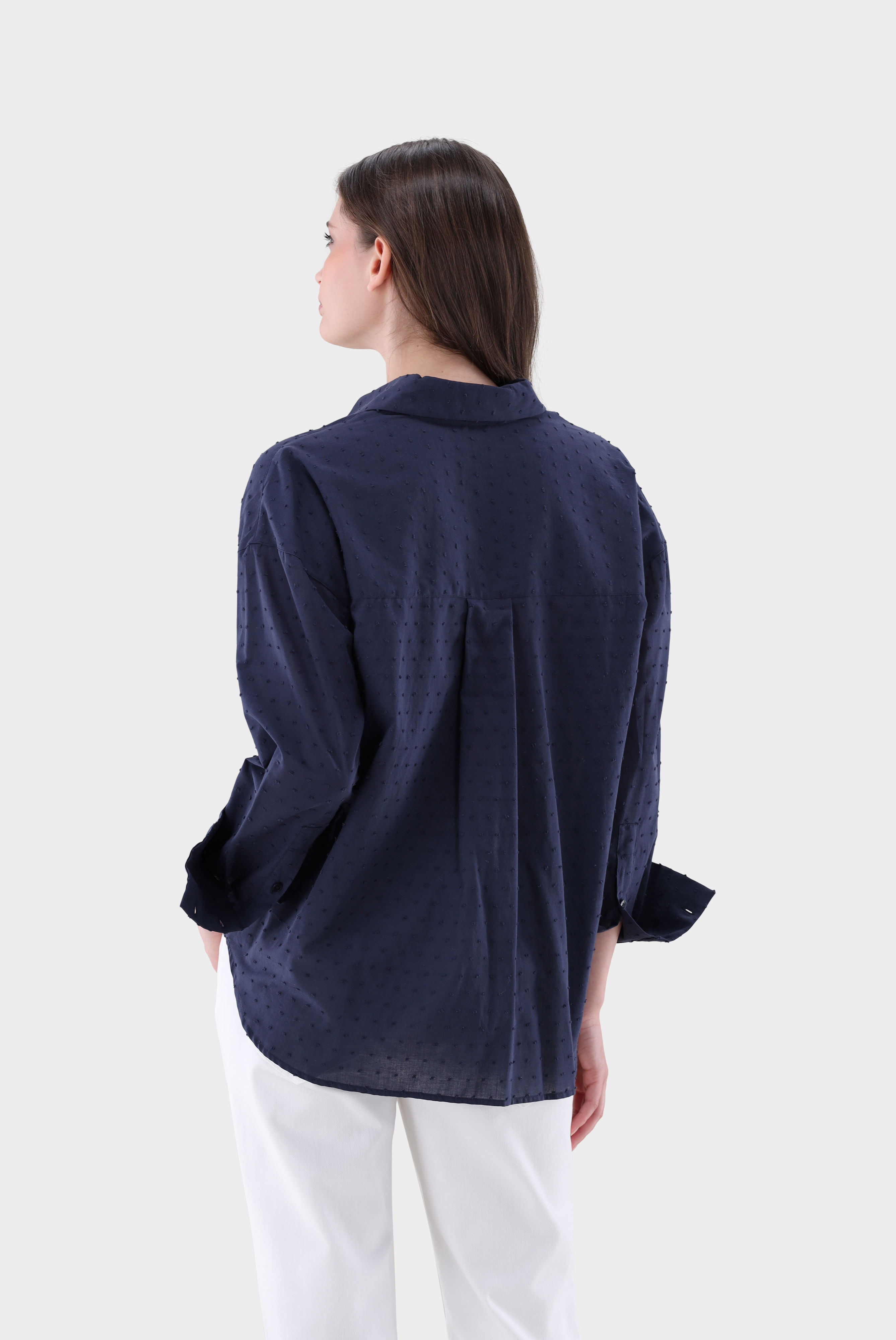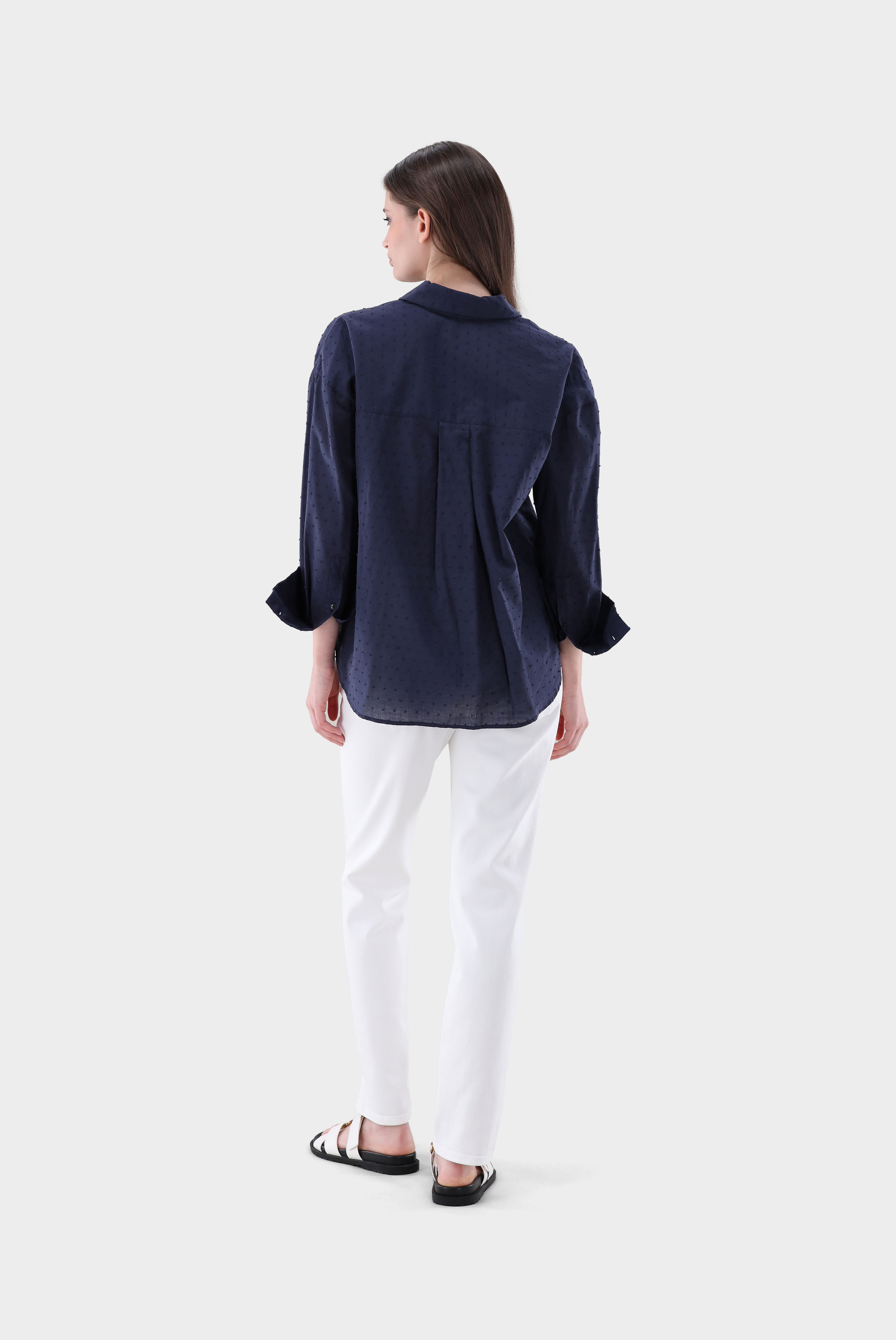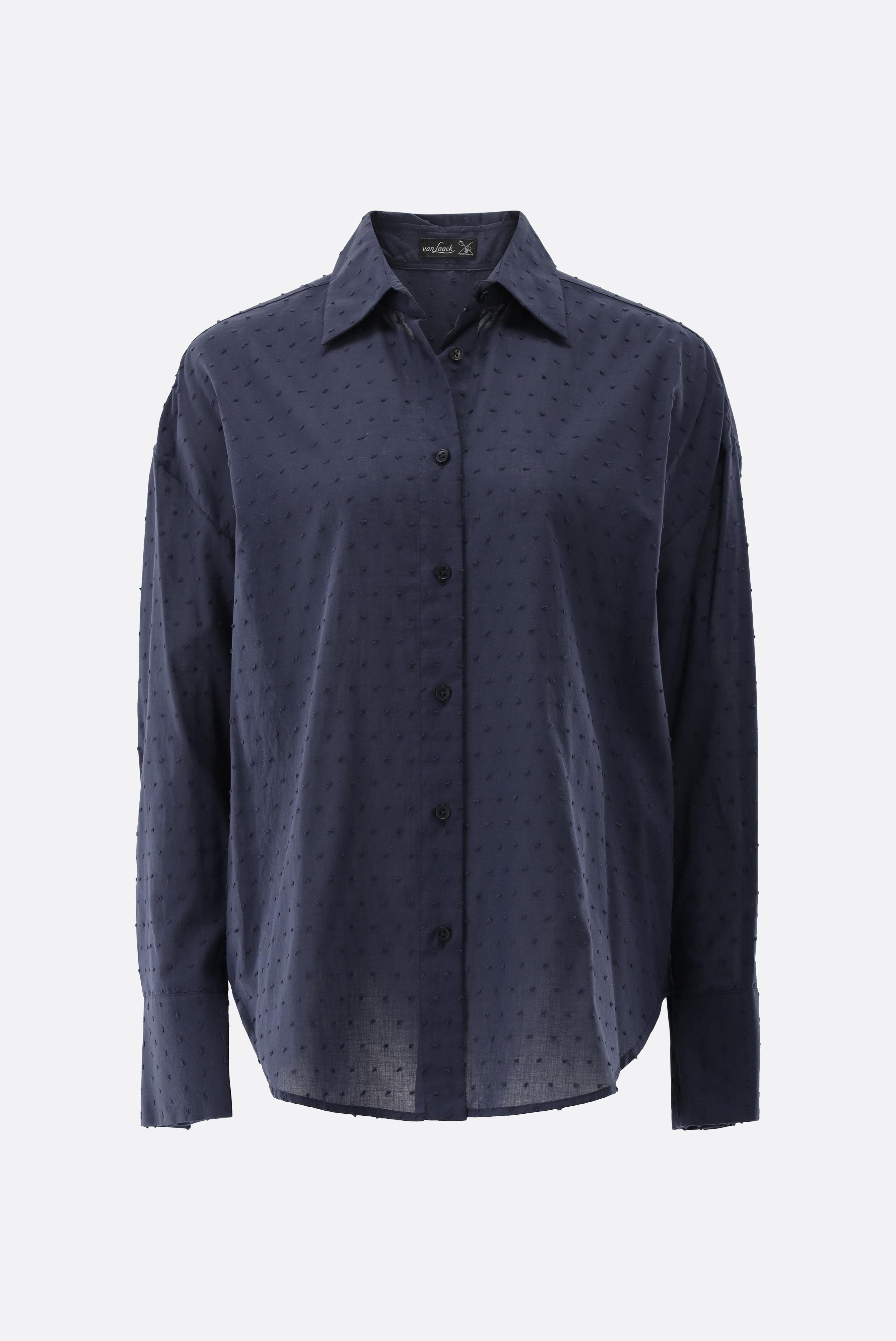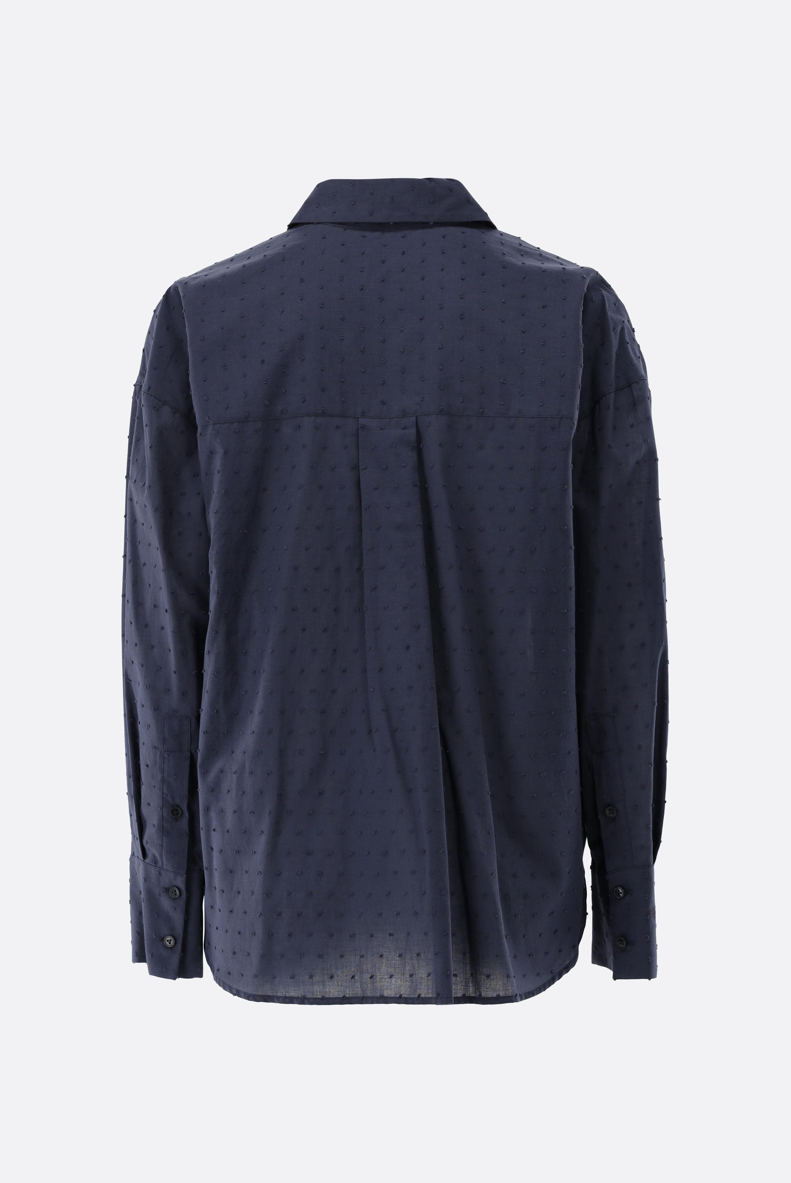 Diese locker geschnittene Hemdbluse aus Baumwoll-Plumetis besticht durch das besonders luftige Material. Plumetis ist ein leichter Baumwoll Batist mit kleinen, erhabenen Punkten die an Federn oder Wolken erinnern. Die überschnittenen Schultern und die Rückenpasse mit Boxfalte sorgen für einen modernen und lässigen Fall der Bluse. Edle Perlmuttknöpfe runden das Design ab und machen die Bluse zu einem vielseitigen Begleiter für Casual- und Sommer-Looks.