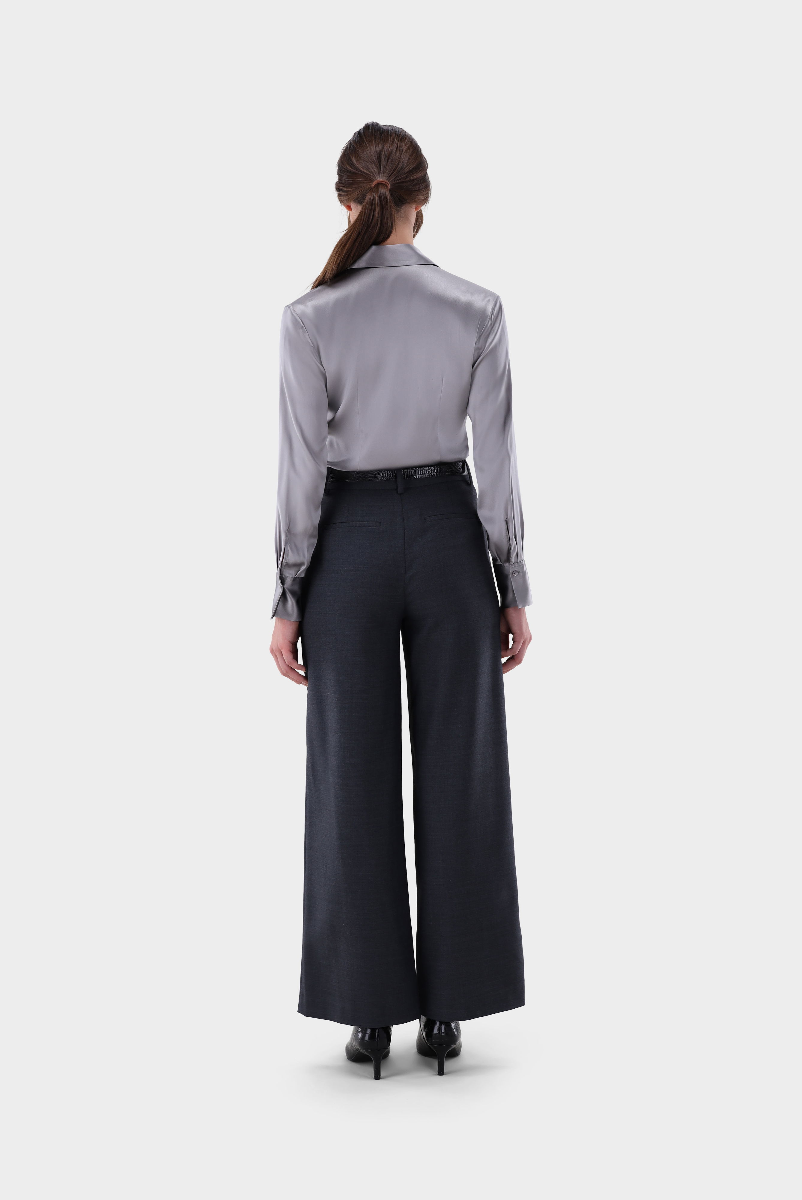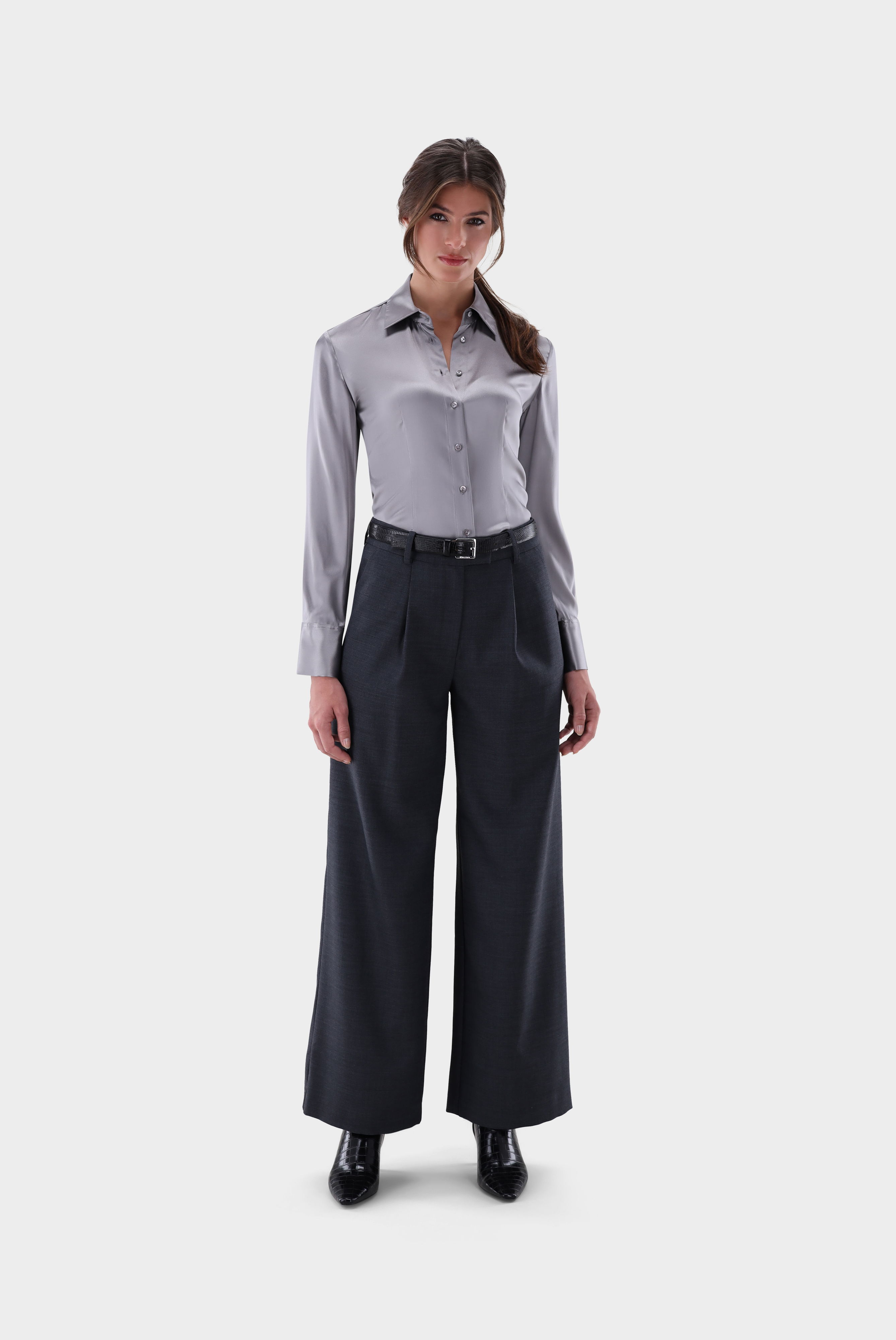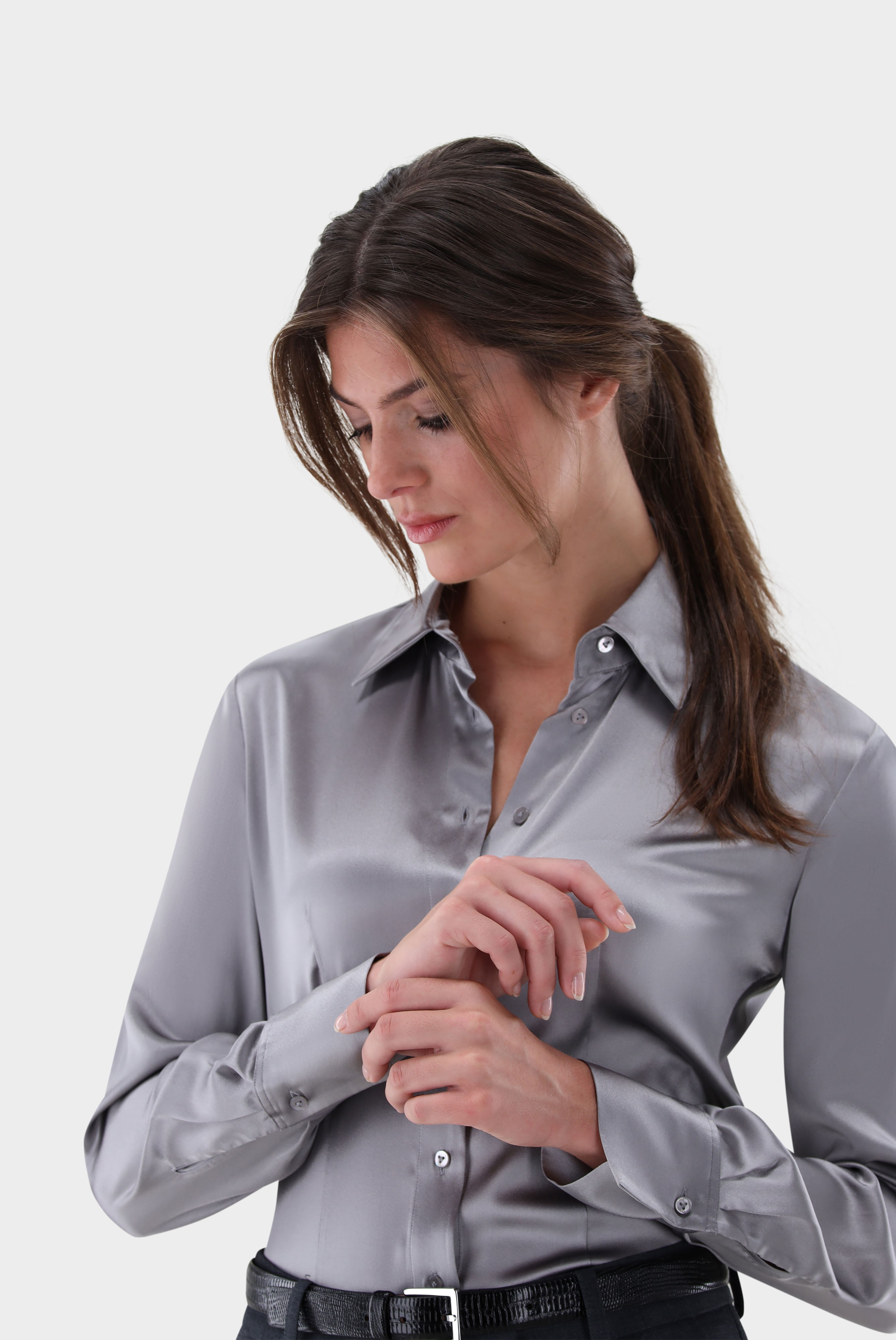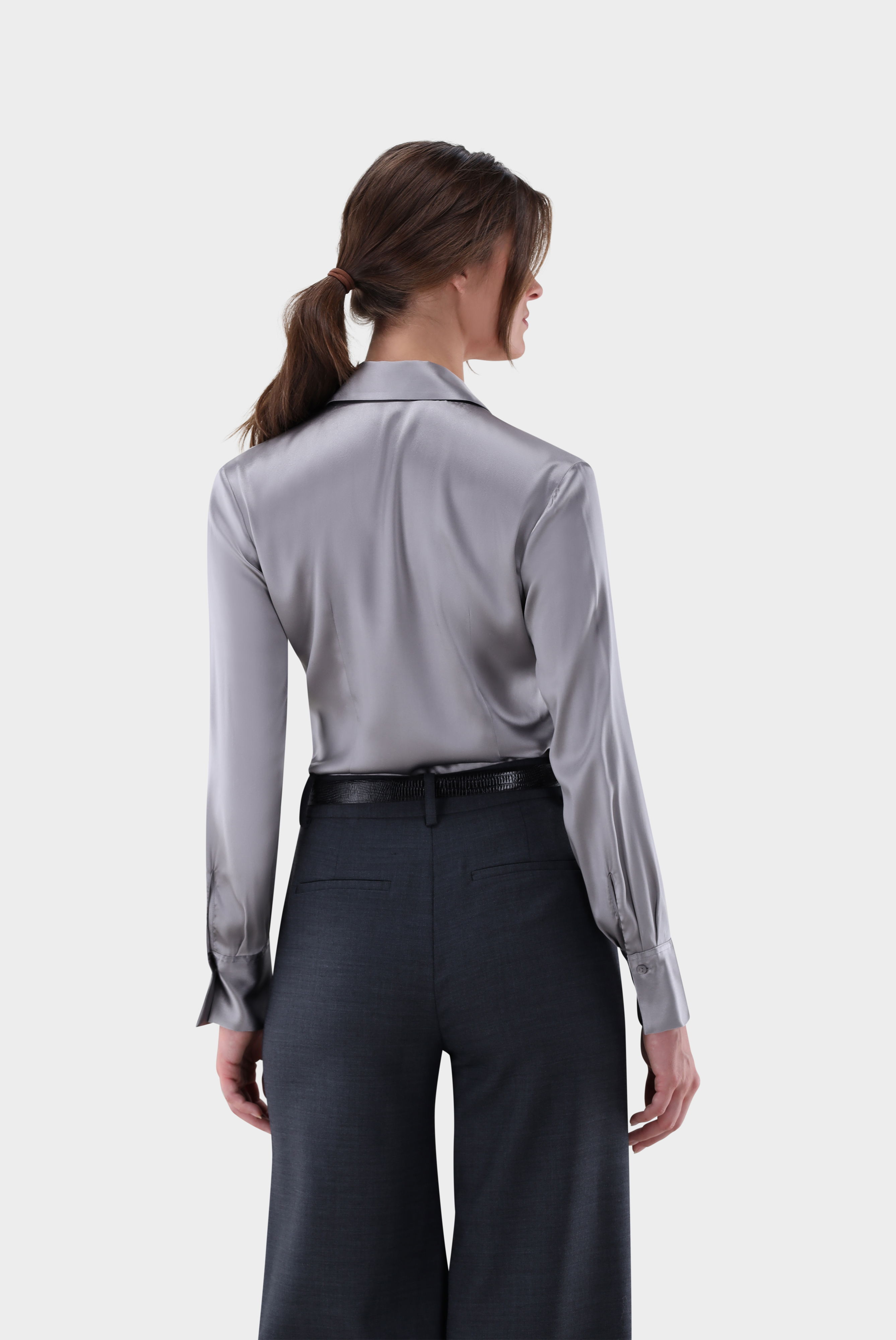 Diese taillierte Hemdbluse in klassischer Passform überzeugt durch ihr elegantes Design und hochwertige Verarbeitung. Gefertigt aus einfarbigem Seidensatin-Stretch bietet sie einen edlen Glanz und eine fließende Optik, die feminine Eleganz unterstreicht. Lange Ärmel runden das stilvolle Erscheinungsbild ab, während das Material angenehmen Tragekomfort und Bewegungsfreiheit garantiert. Eine vielseitige Bluse, die sowohl für Business-Looks als auch für besondere Anlässe perfekt geeignet ist.