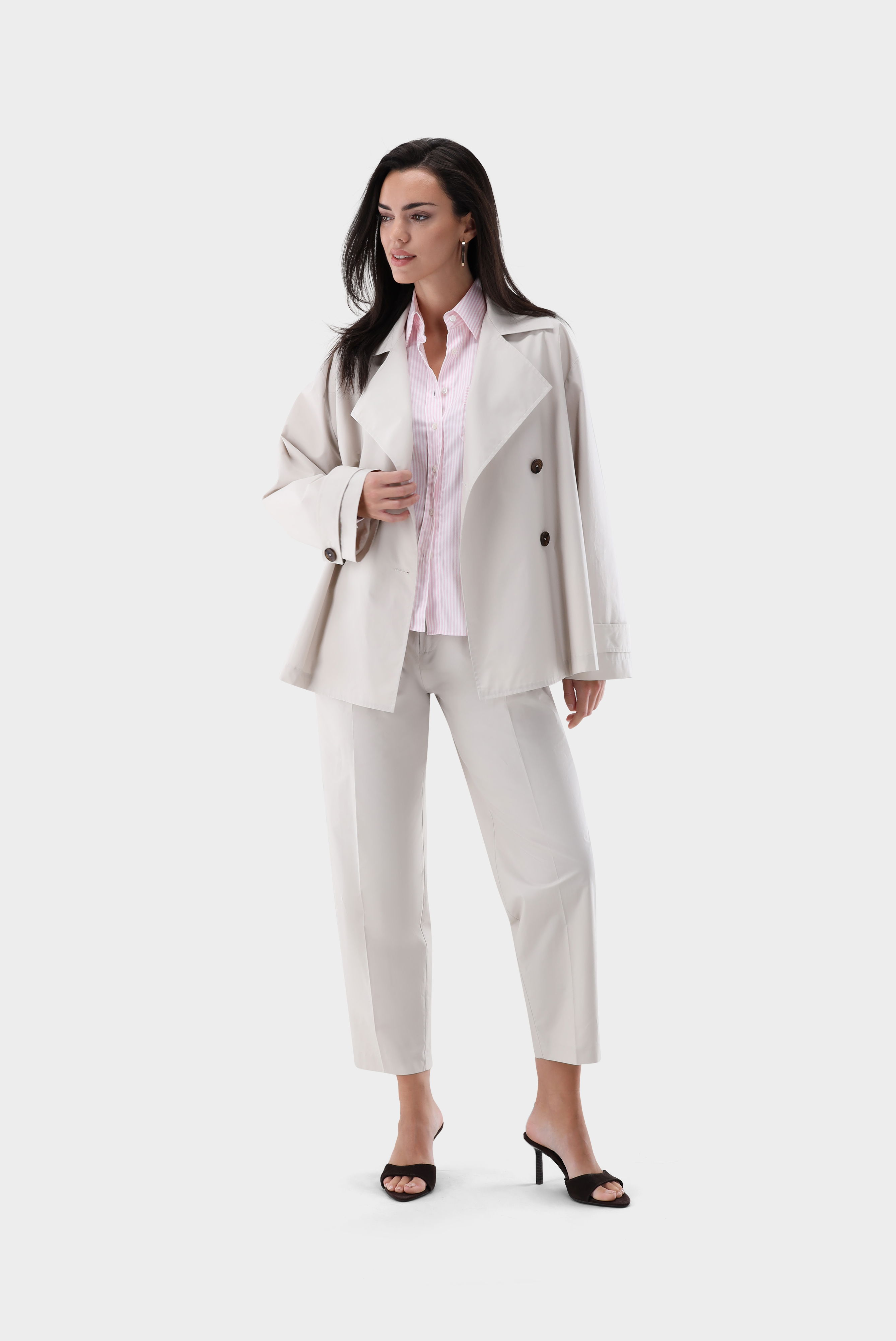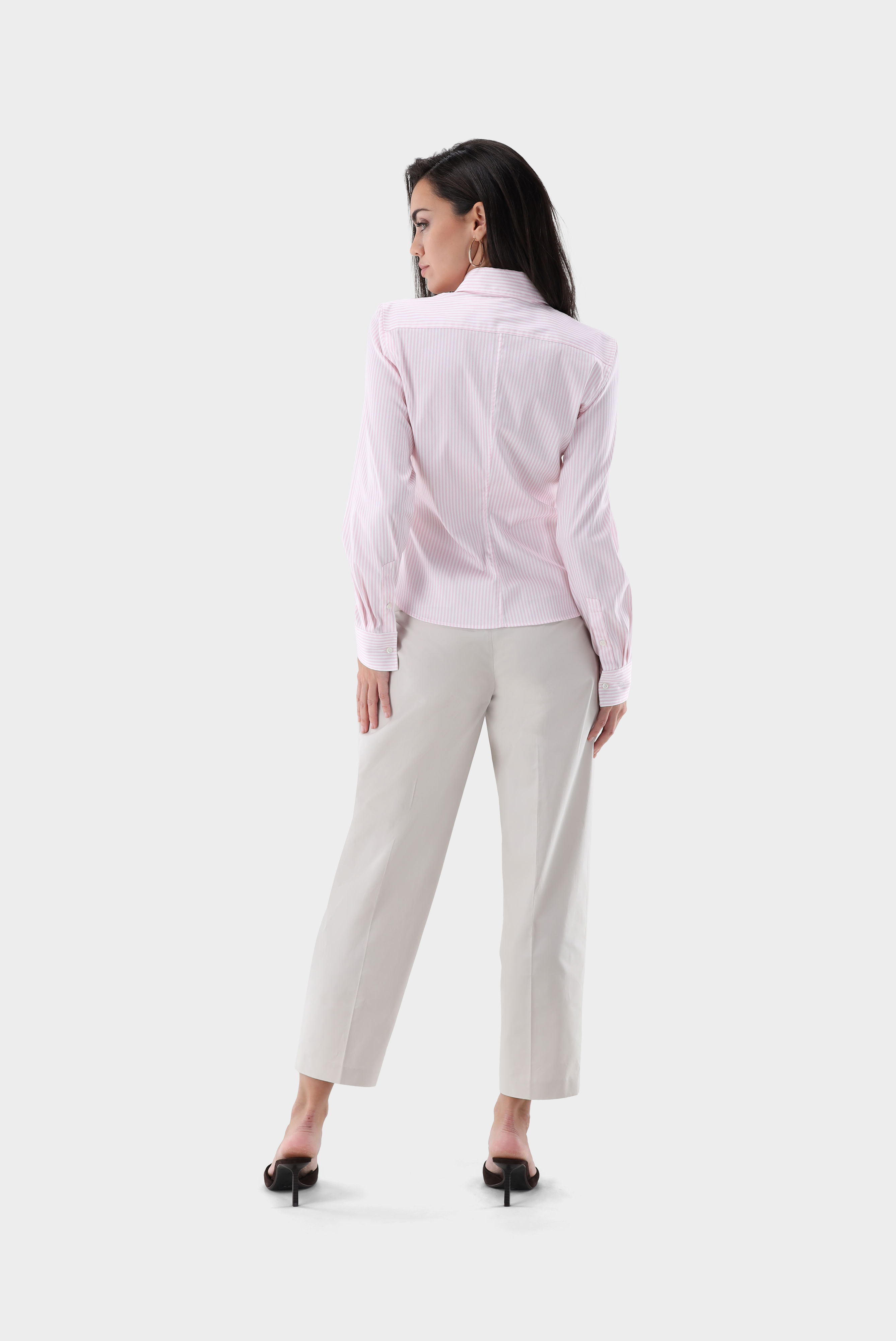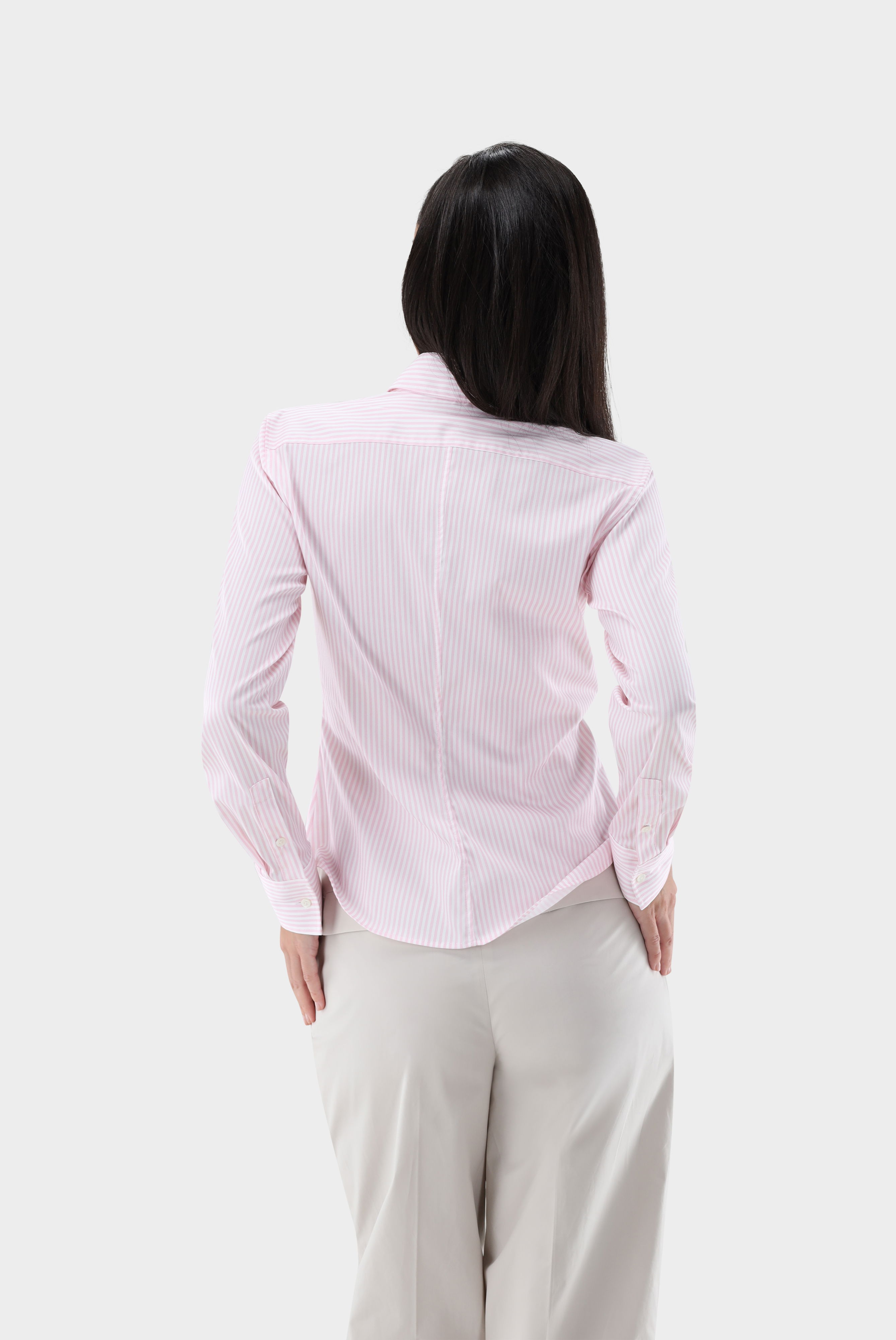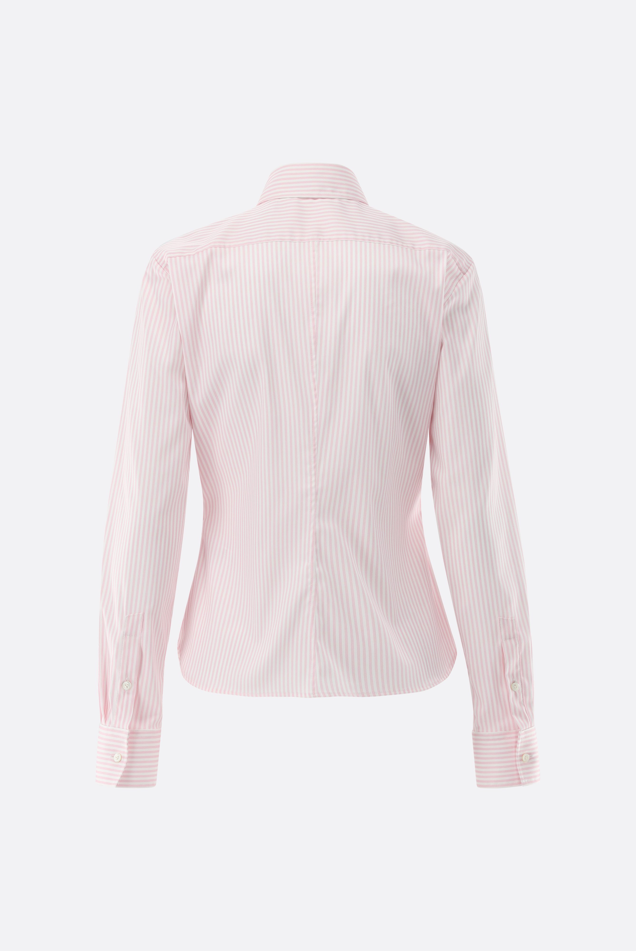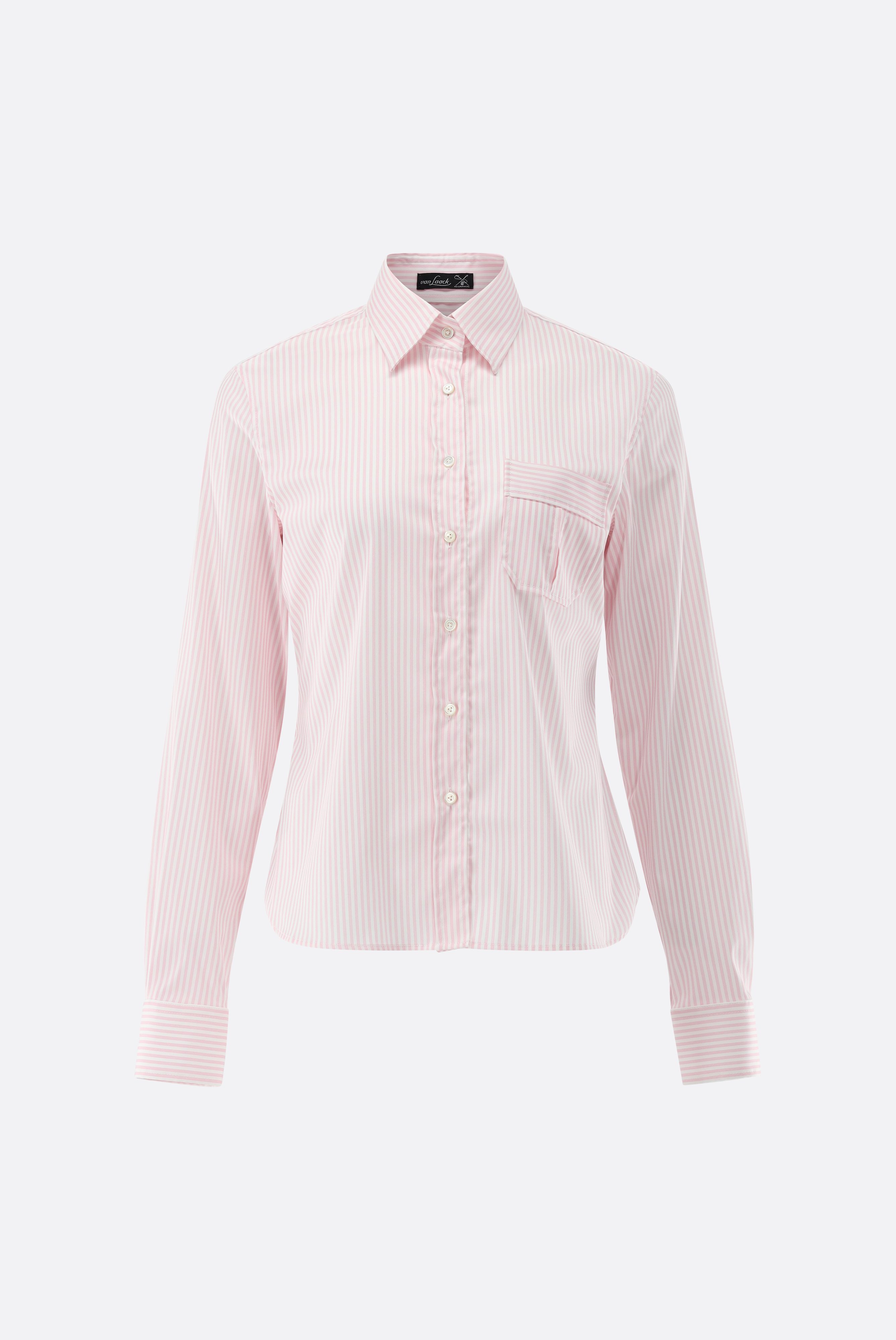 Diese taillierte Bluse aus fein gewebtem, gestreiftem Baumwoll-Stretch-Mix überzeugt durch hochwertige Verarbeitung und präzise Details. Lange Ärmel, eine aufgesetzte Brusttasche und eine Rückenpasse sorgen für eine elegante, feminine Passform. Der innenliegende Kragensteg mit feiner Paspelierung setzt dezente Akzente und unterstreicht die hochwertige Optik. Das elastische Material bietet angenehmen Tragekomfort und Bewegungsfreiheit – ideal für stilvolle Business- und Casual-Looks.
