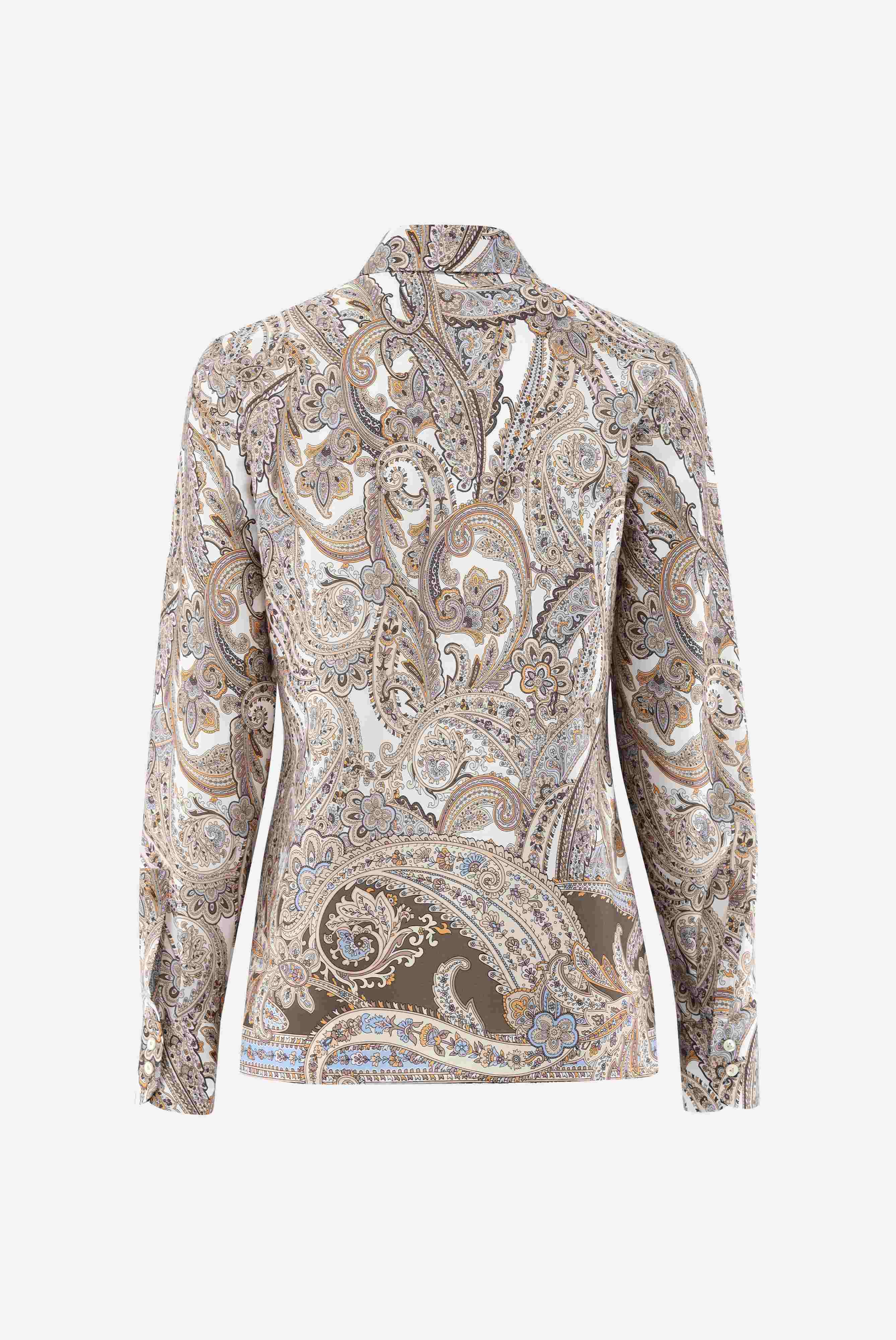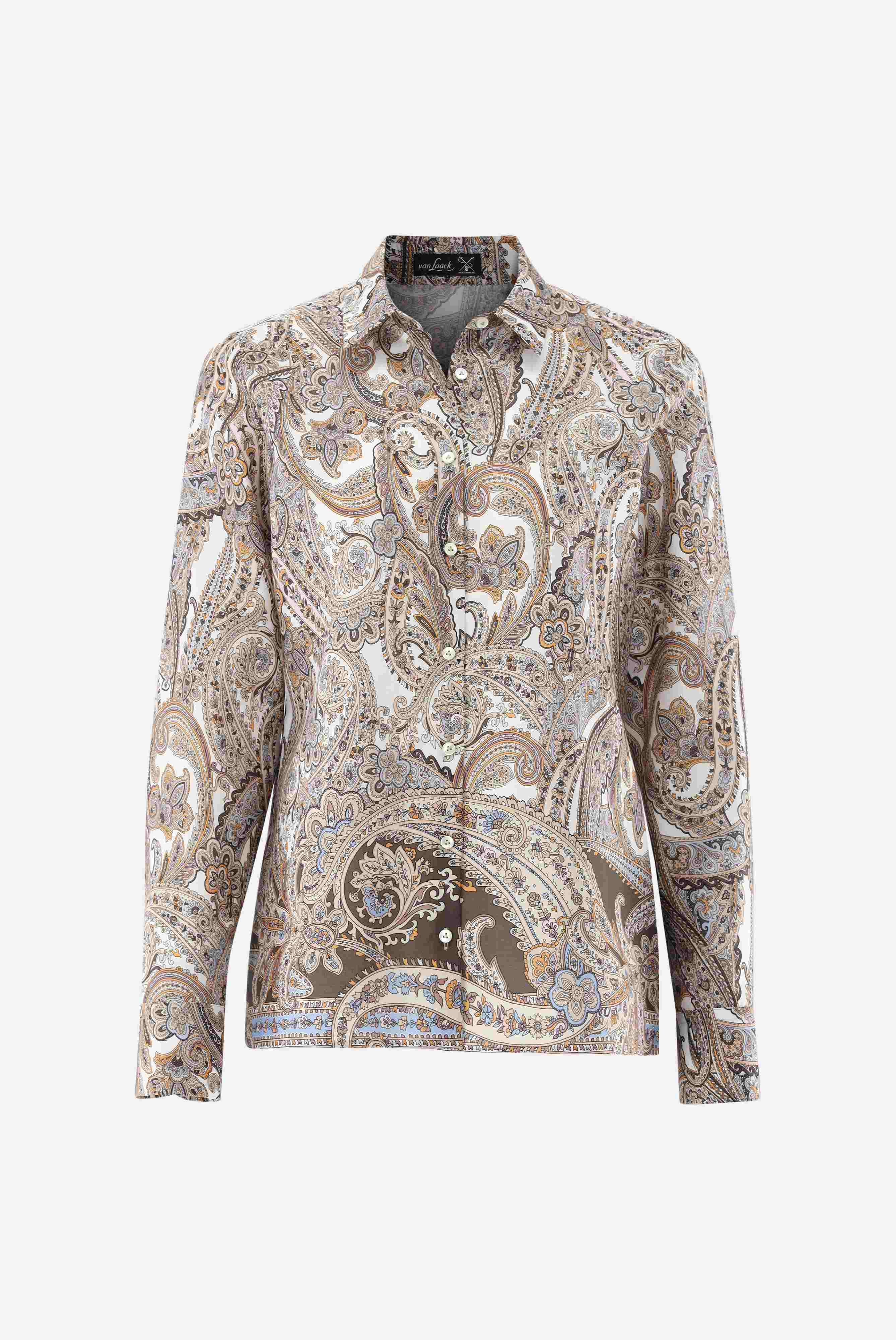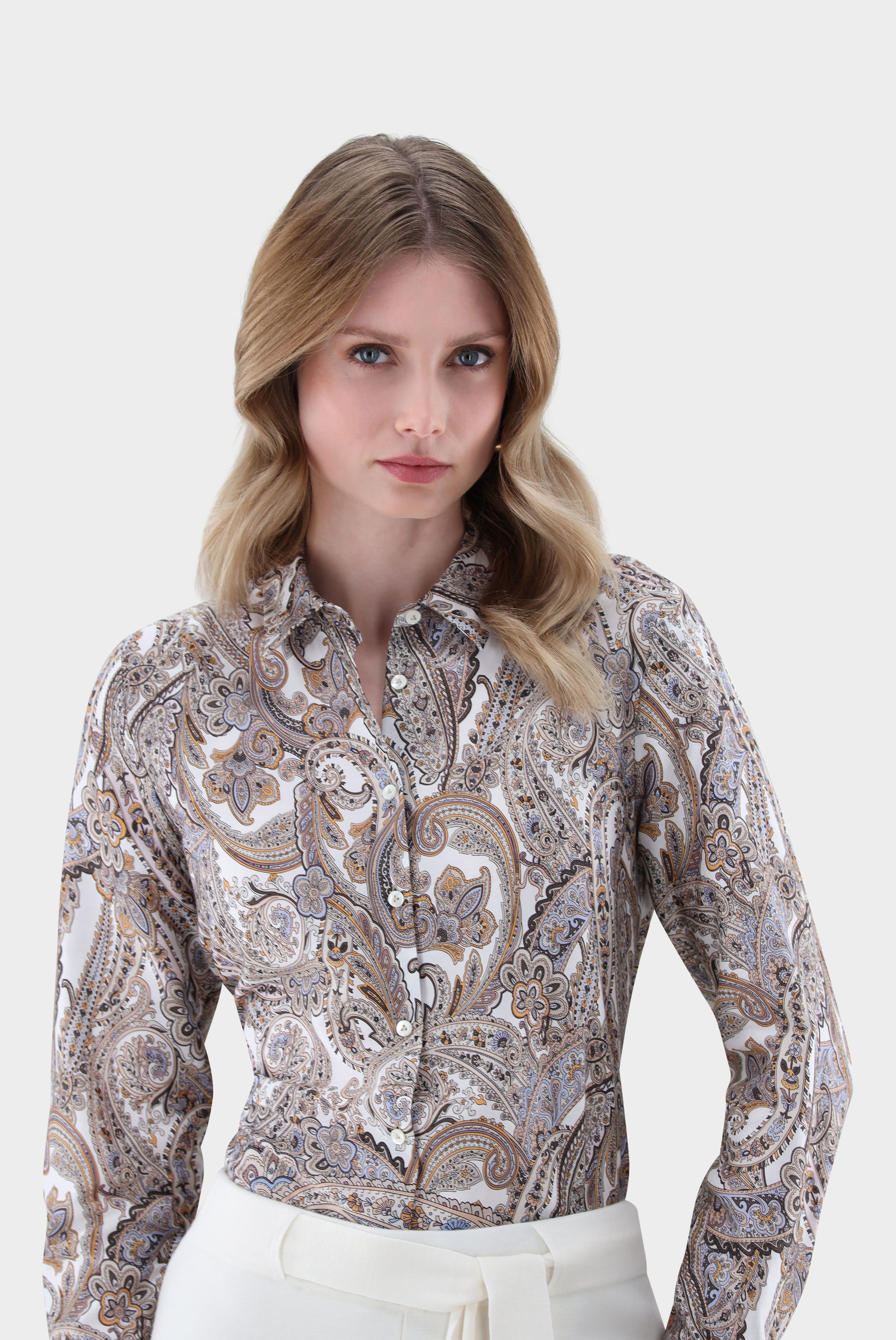 Diese halb taillierte Hemdbluse aus hochwertigem Baumwollsatin kombiniert eleganten Schnitt mit edlem Tragegefühl. Der platzierte Paisley-Print setzt stilvolle Akzente und verleiht dem Look eine besondere Note. Lange Ärmel sorgen für eine klassische Silhouette. Perfekt für elegante Alltags-Outfits oder besondere Anlässe. Ein feminines Must-have mit exklusivem Print.