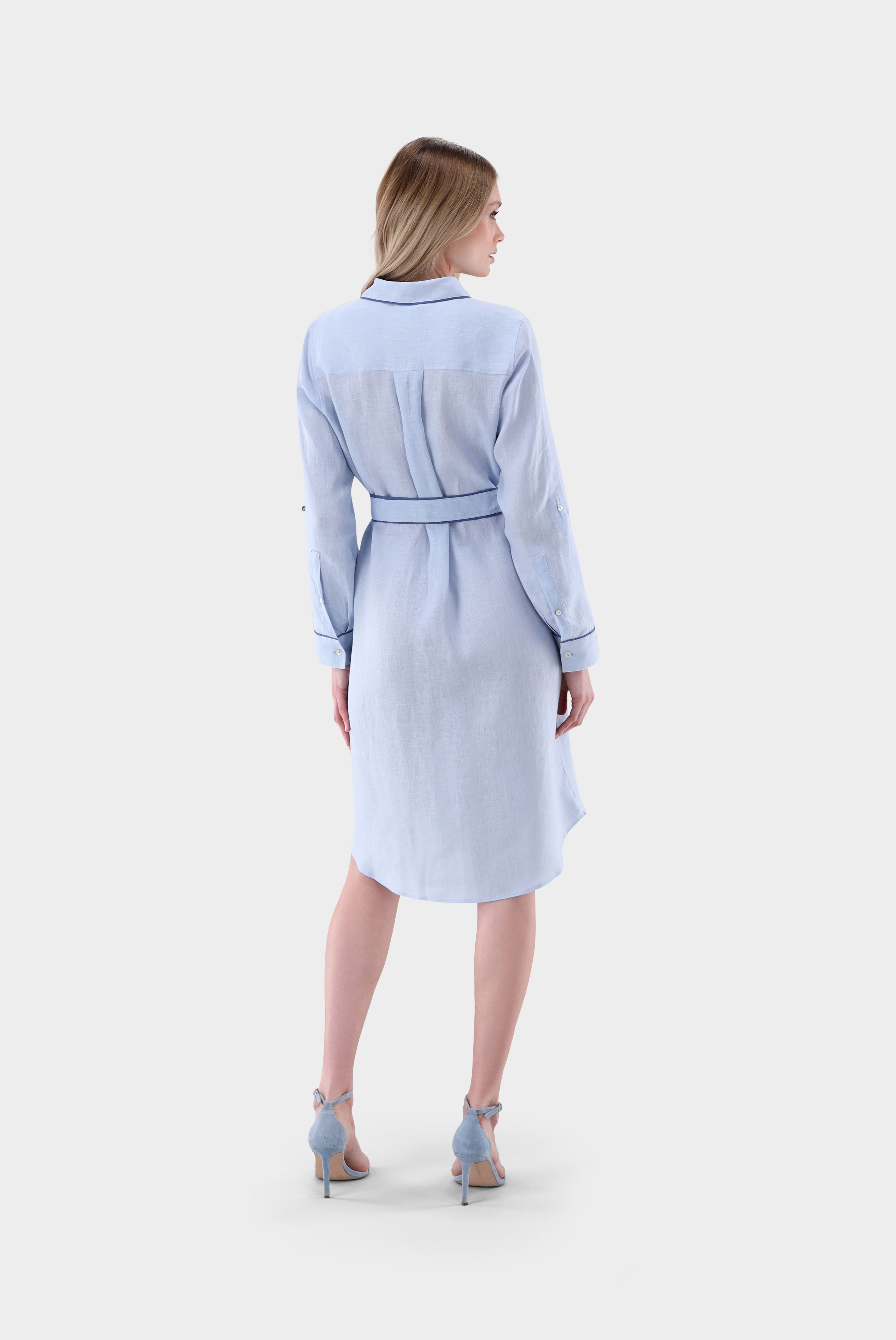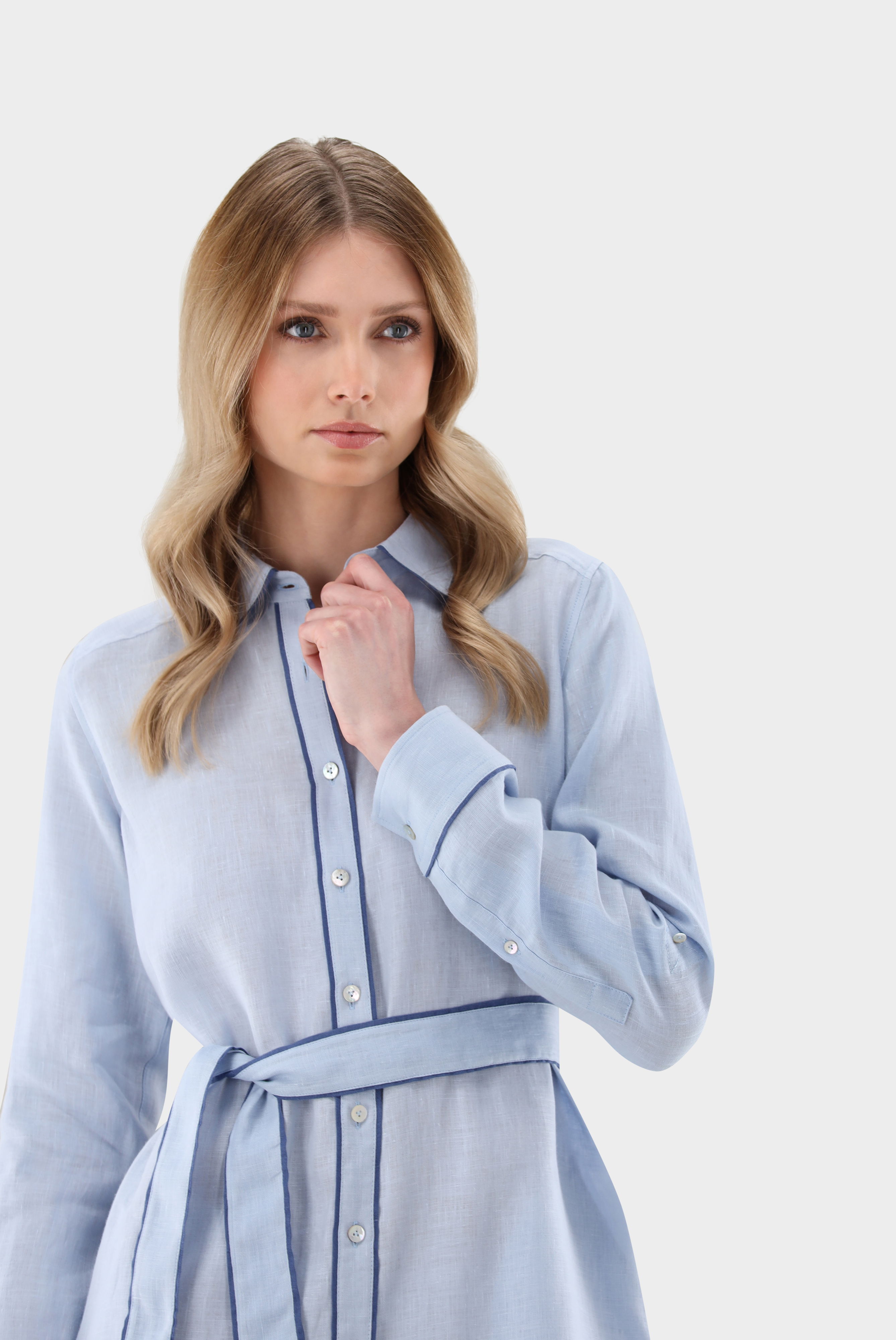 Dieses knielange Hemdblusenkleid aus besonders weichem Leinen bietet dank seiner atmungsaktiven Naturfaser ein angenehm kühles Tragegefühl im Sommer. Der leicht taillierte Schnitt und das schlichte Design werden durch einen Paspel in Koralle und die edlen Perlmuttknöpfe stilvoll ergänzt. Die langen Ärmel lassen sich praktisch hochkrempeln, während der Rückenyoke mit Kellerfalte für Bewegungsfreiheit sorgt. Ein Bindegürtel unterstreicht die feminine Silhouette und rundet den Look ab.