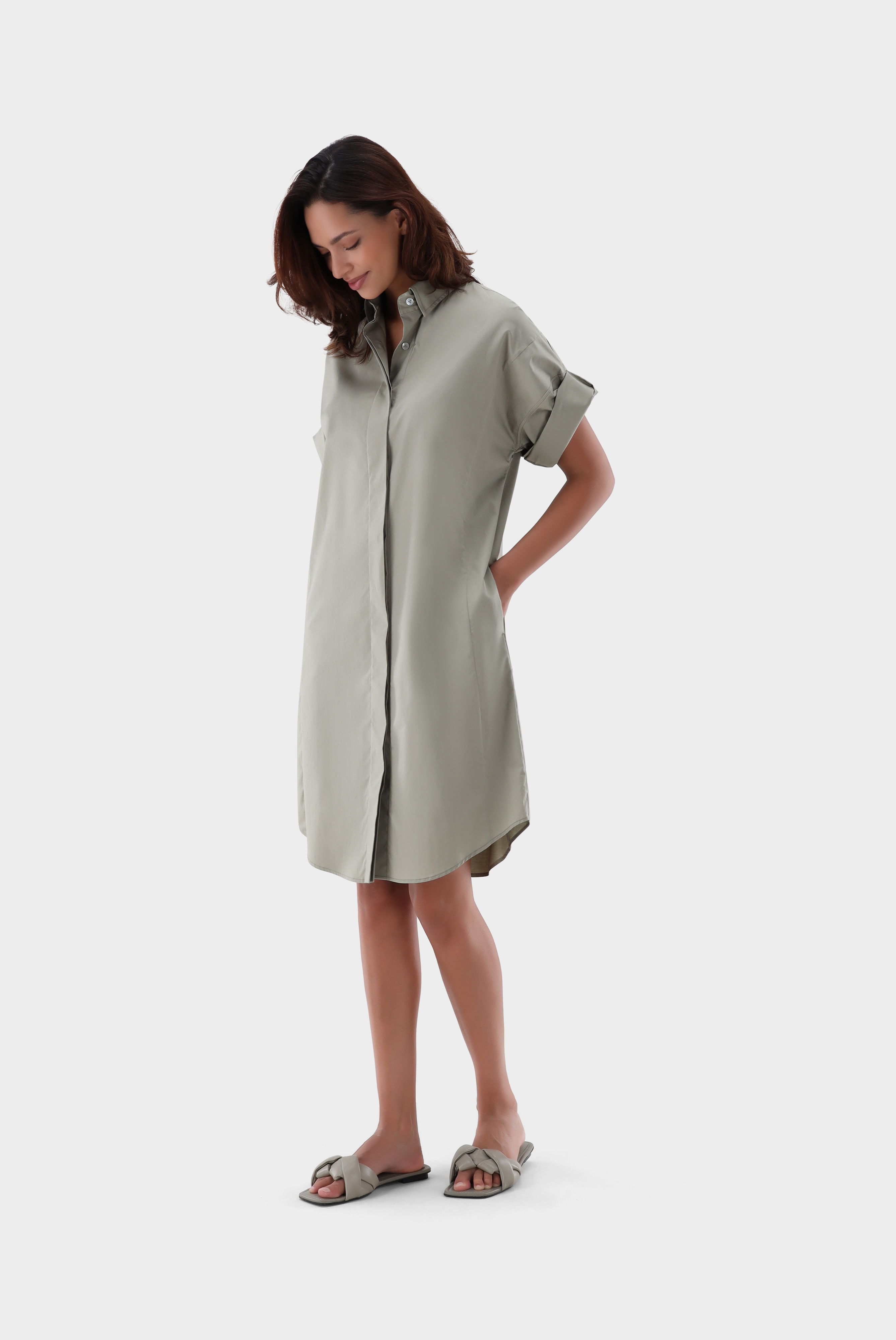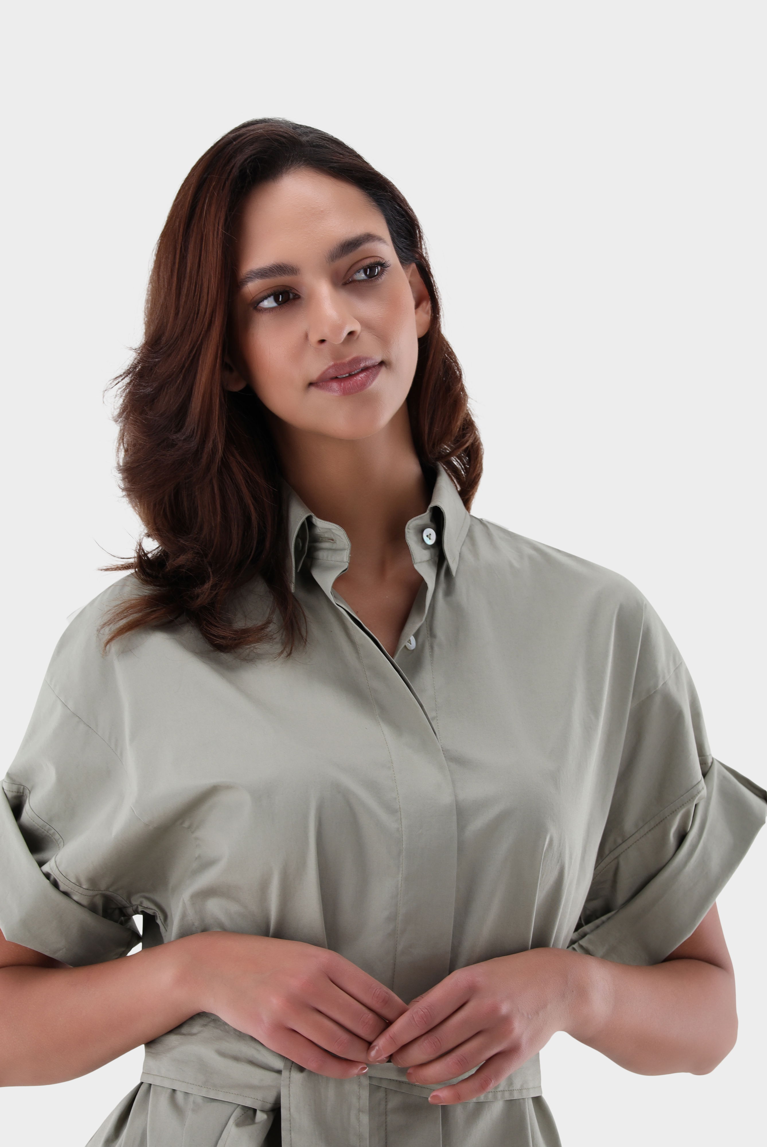 Dieses knieumspielende Hemdblusenkleid überzeugt durch seinen lässigen Schnitt und die angeschnittenen Ärmel, die sich bequem hochkrempeln lassen. Die „Paper Touch“-Baumwoll-Stretchqualität sorgt für ein leichtes Tragegefühl und eine moderne Optik. Eine Rückenpasse mit Box-Falte verleiht dem Kleid zusätzliche Bewegungsfreiheit. Edle Perlmuttknöpfe runden das Design ab und machen das Kleid zu einem vielseitigen Begleiter für Casual- und Business-Looks.