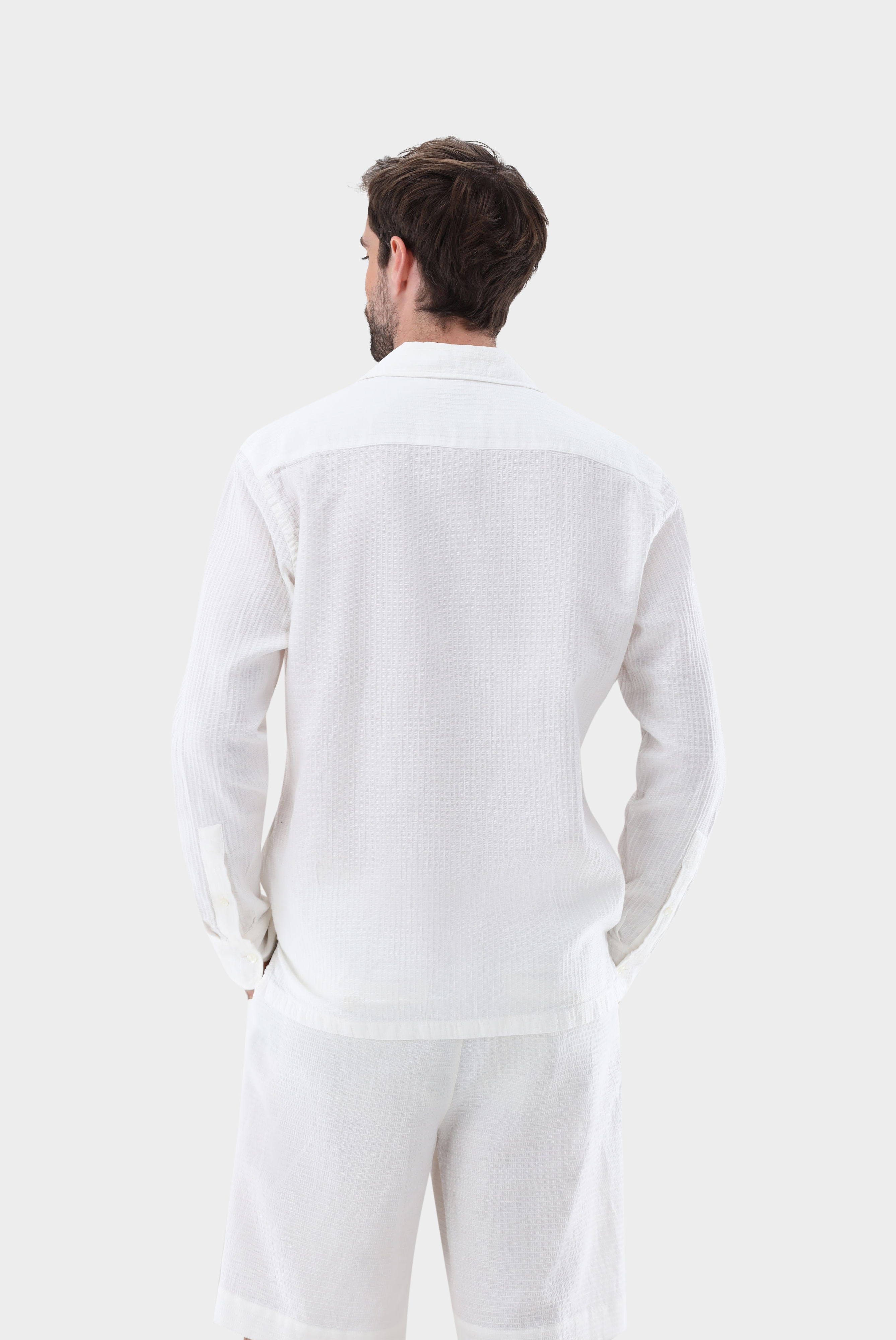 Diese Hemdjacke wird aus einem hochwertigen Mischgewebe mit Baumwolle und Leinen gefertigt. Das Gewebe verfügt über eine Mesh-Struktur und bietet eine angenehme Passform und gute Luftdurchlässigkeit. Der klassische Reverskragen und die langen Ärmel machen es zu einem idealen Begleiter für sommerliche Outfits. Die Brusttaschen sorgen für einen lässigen Look. Es kann sowohl als Hemd, als auch als Hemdjacke über einem T-Shirt, Hemd oder einem Poloshirt getragen werden. Zusammen mit der passenden Hose Hito kann die Hemdjacke auch als total Look getragen werden.