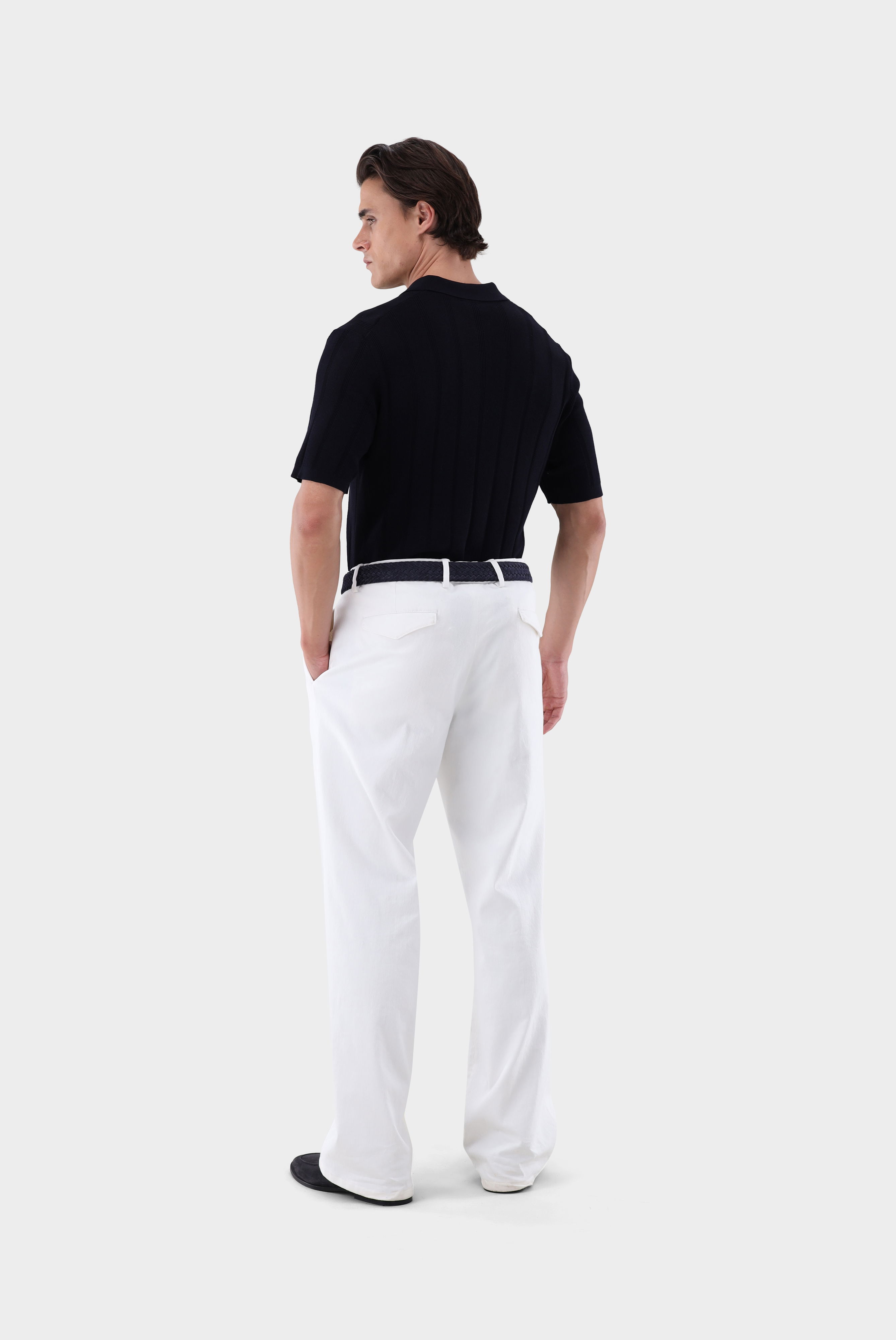 Look aus Strick-Poloshirt mit Jacquard Streifen