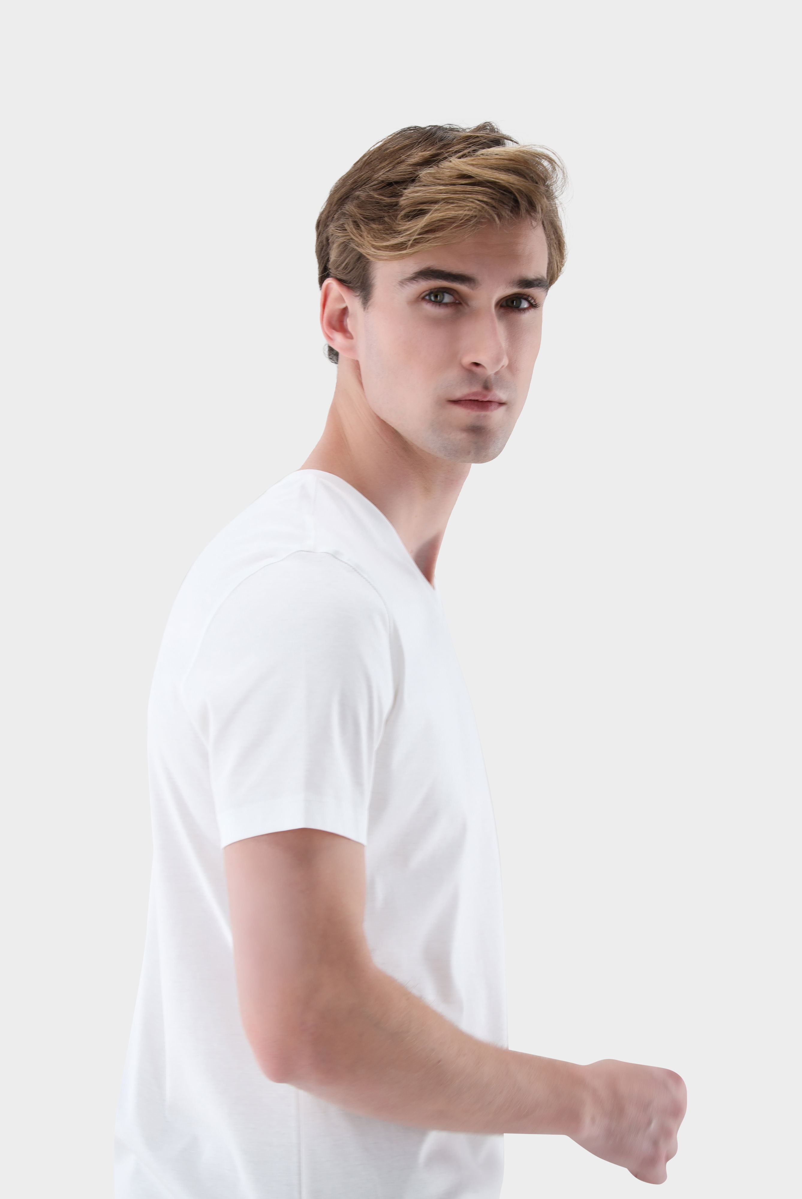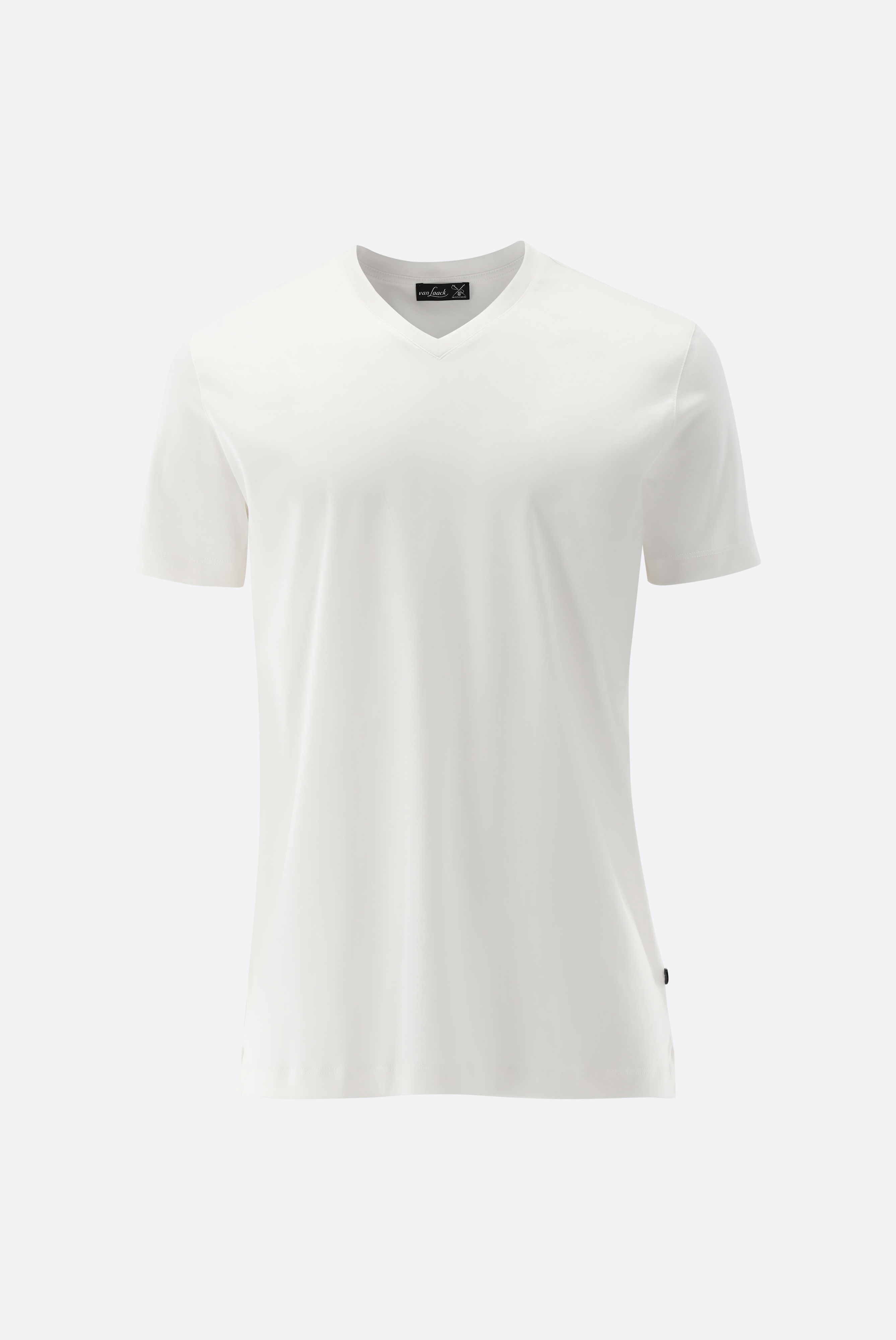 T-Shirt aus Swiss Cotton Jersey mit V-Ausschnitt. Die Swiss Cotton Jersey Qualität, gefertigt aus besonders hochwertigem und weichem Interlock-Jersey mit Natural-Stretch, sorgt für ein luxuriöses Tragegefühl. Die glänzende Optik vollendet den edlen Look.