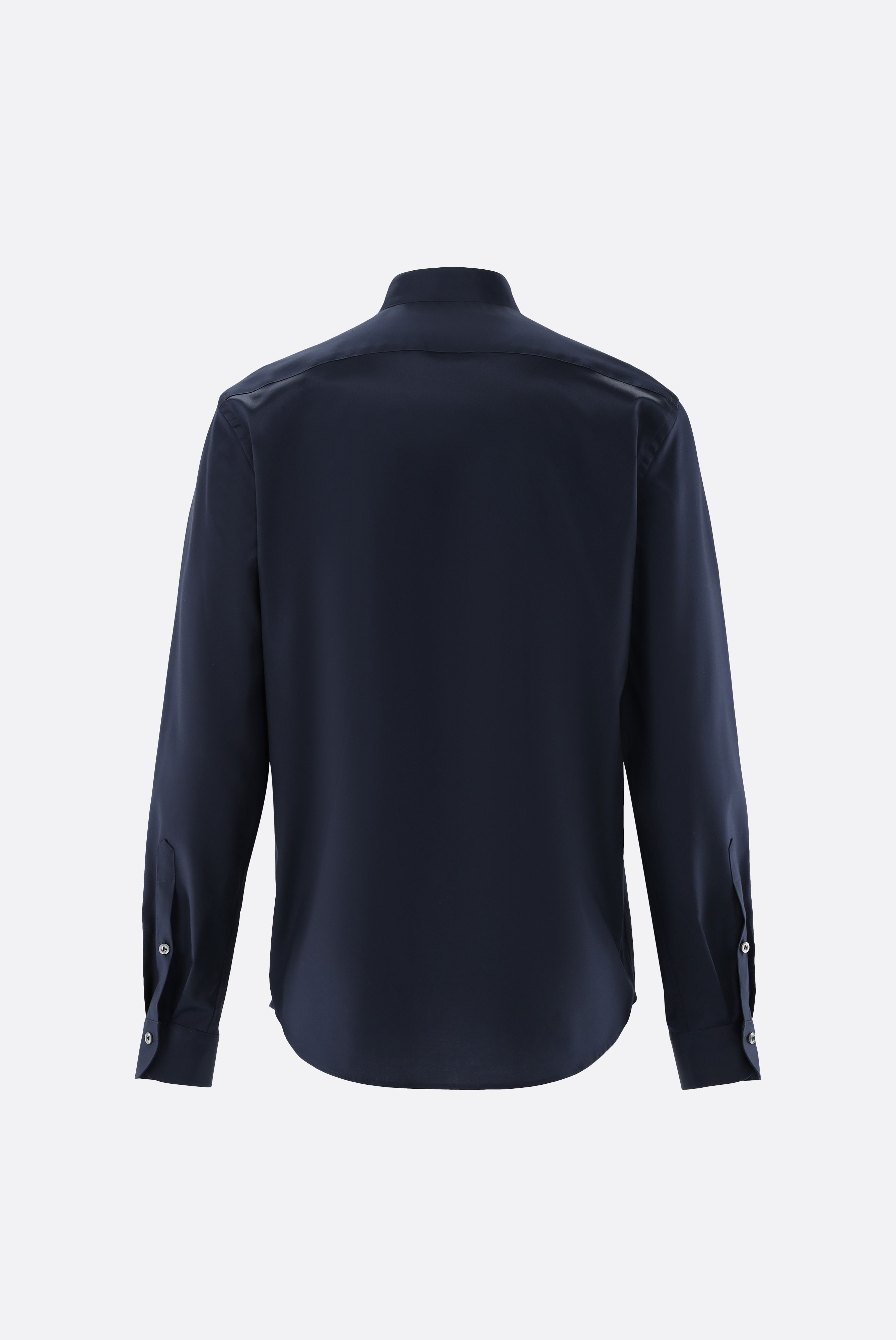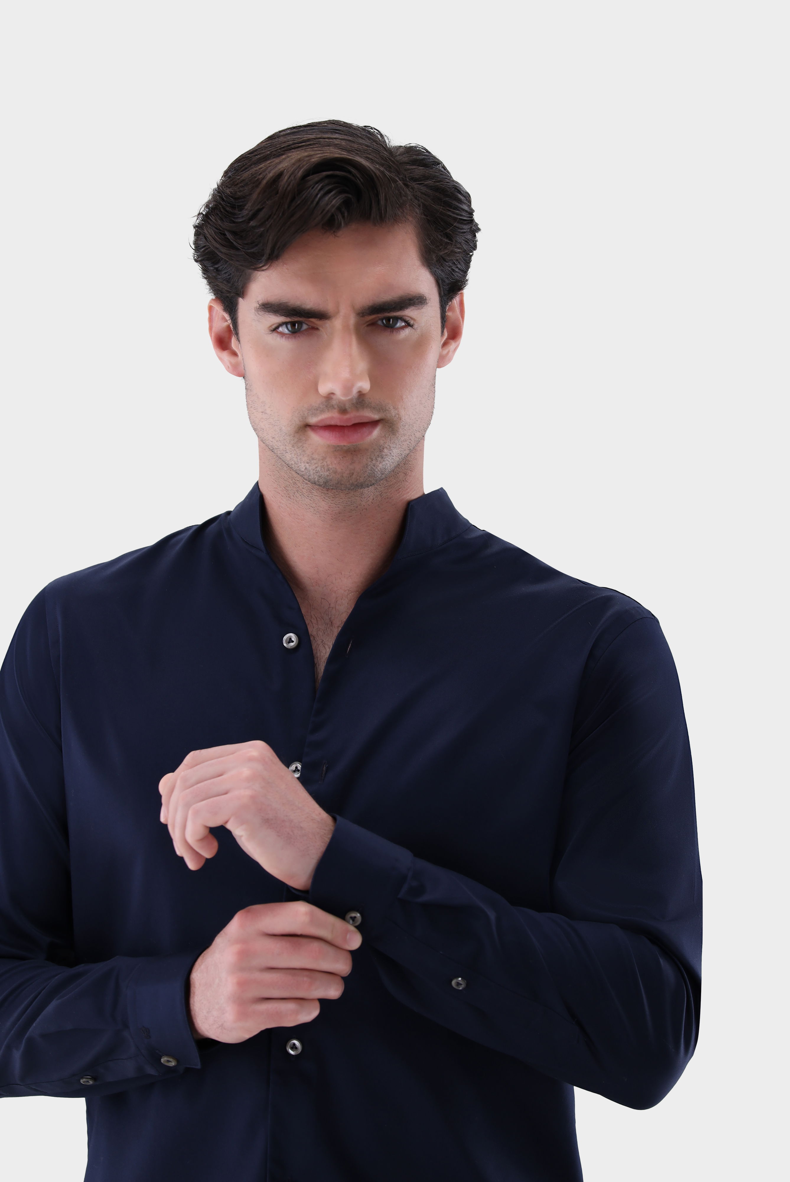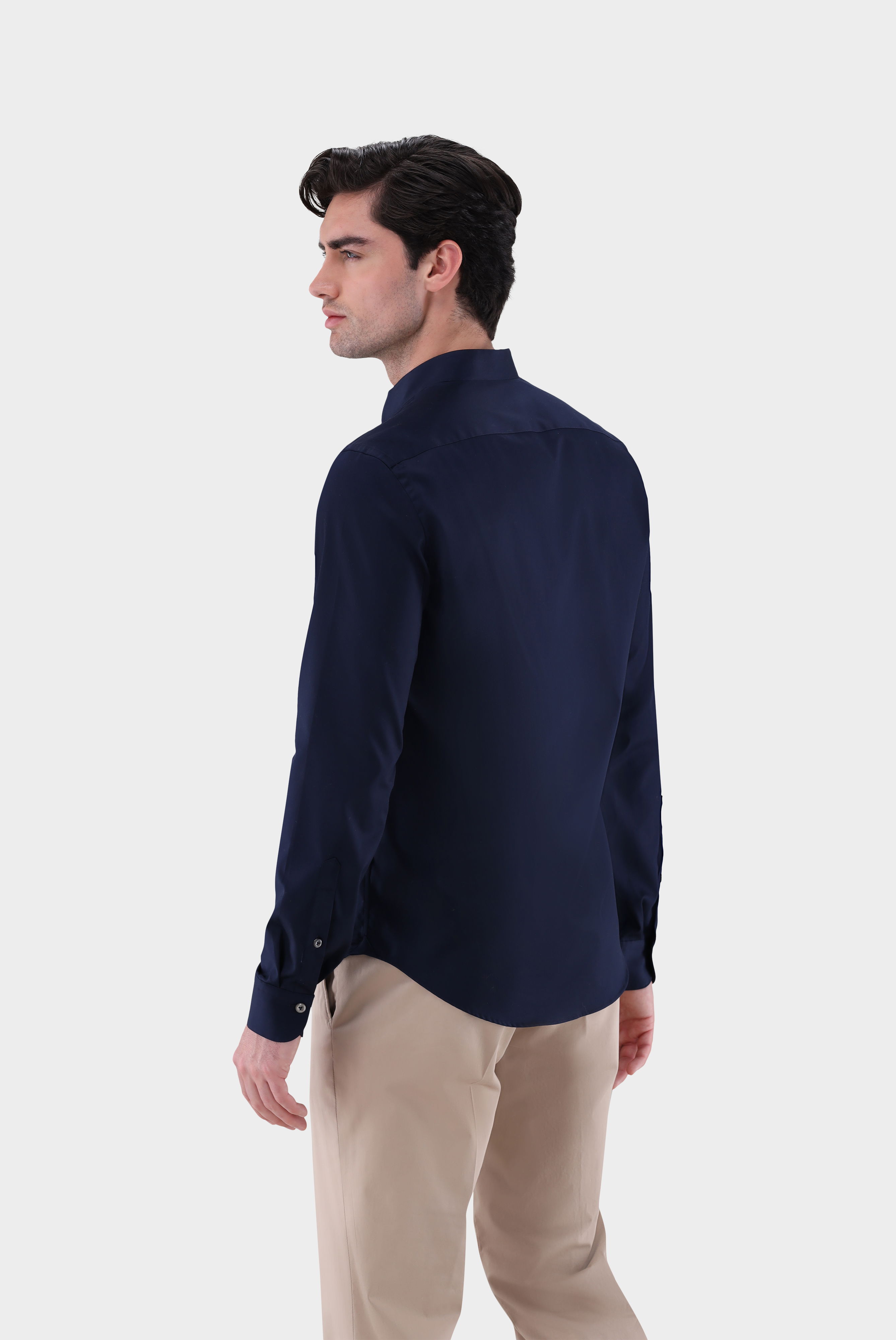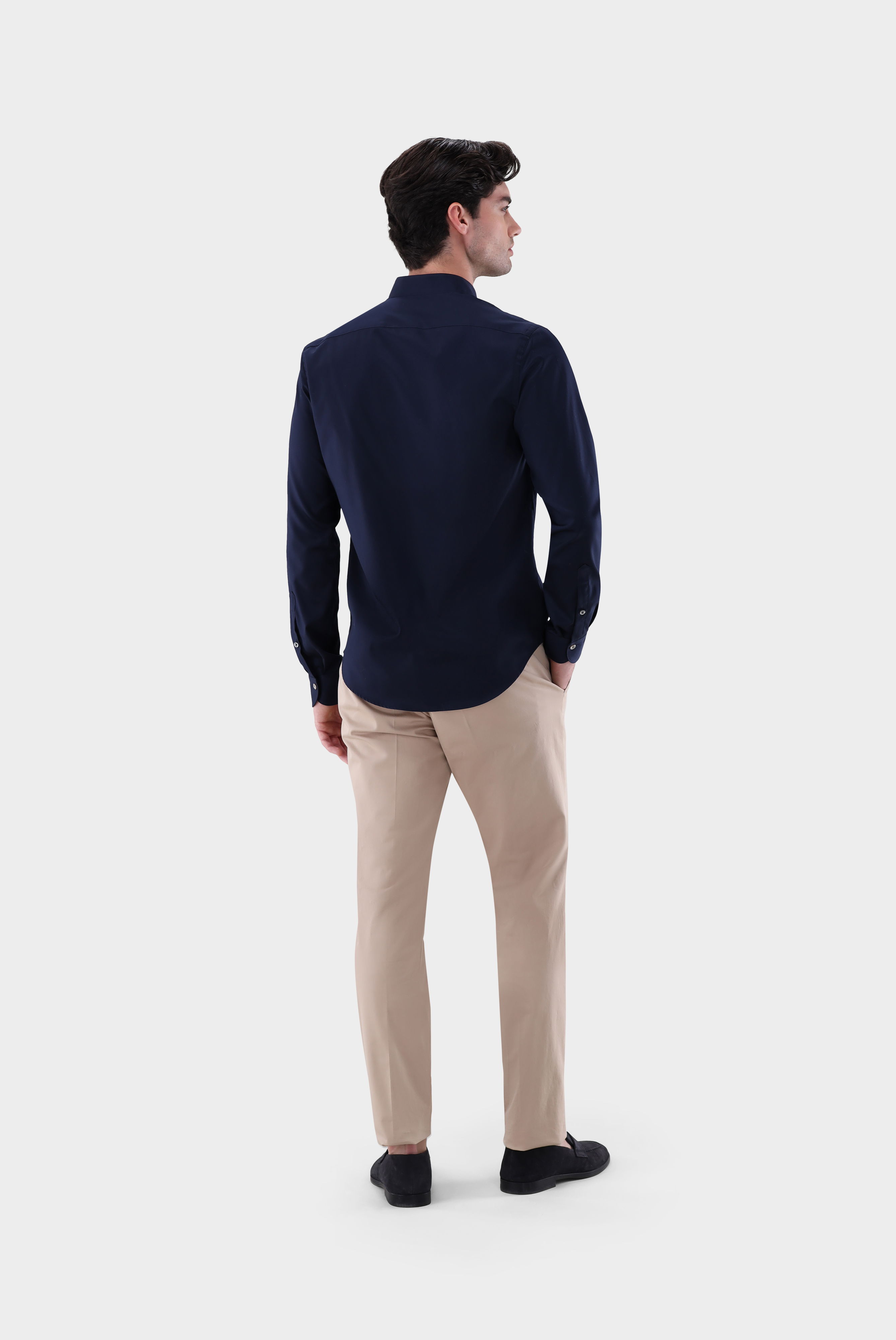Look aus Stehkragenhemd aus bügelfreiem Twill Gewebe