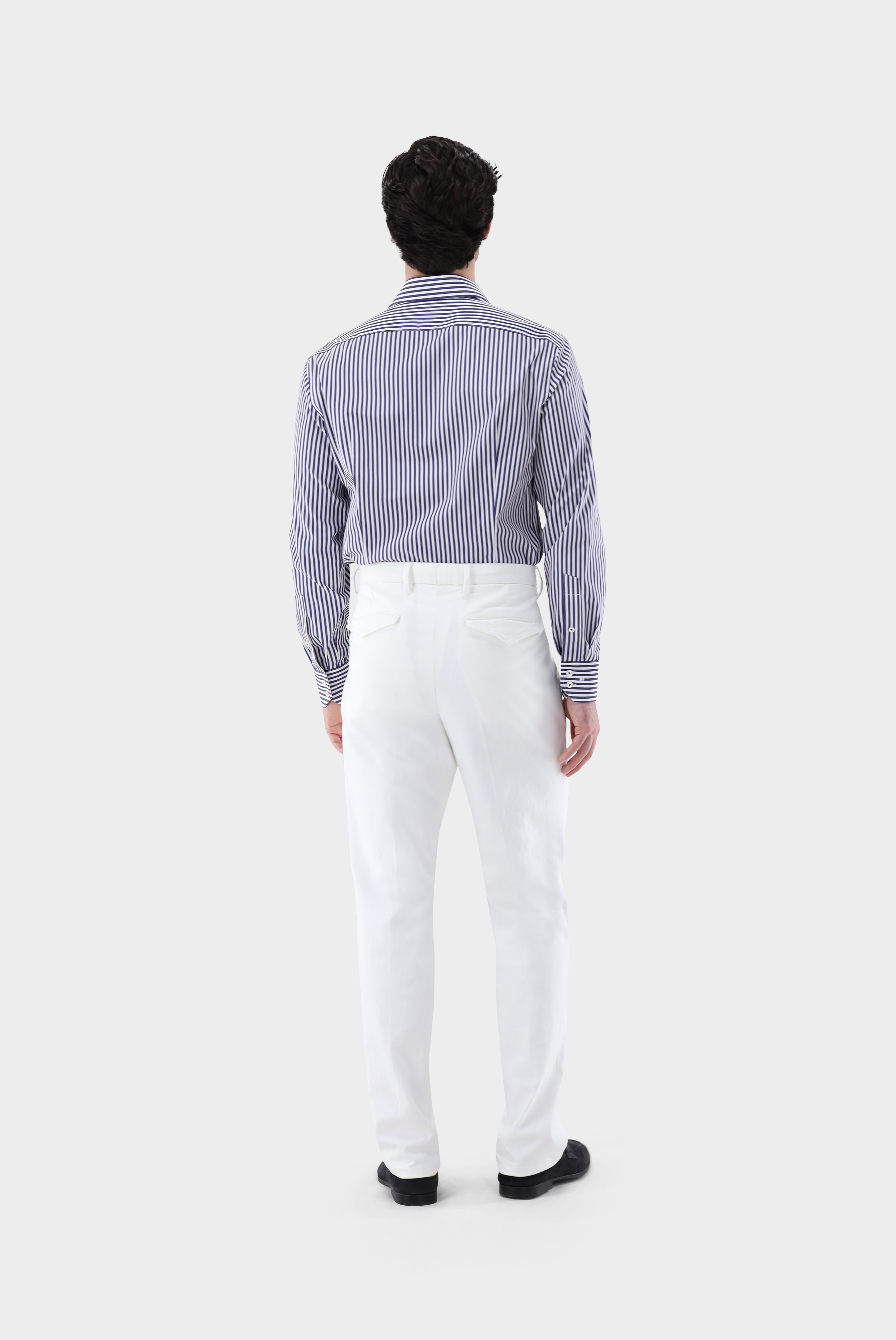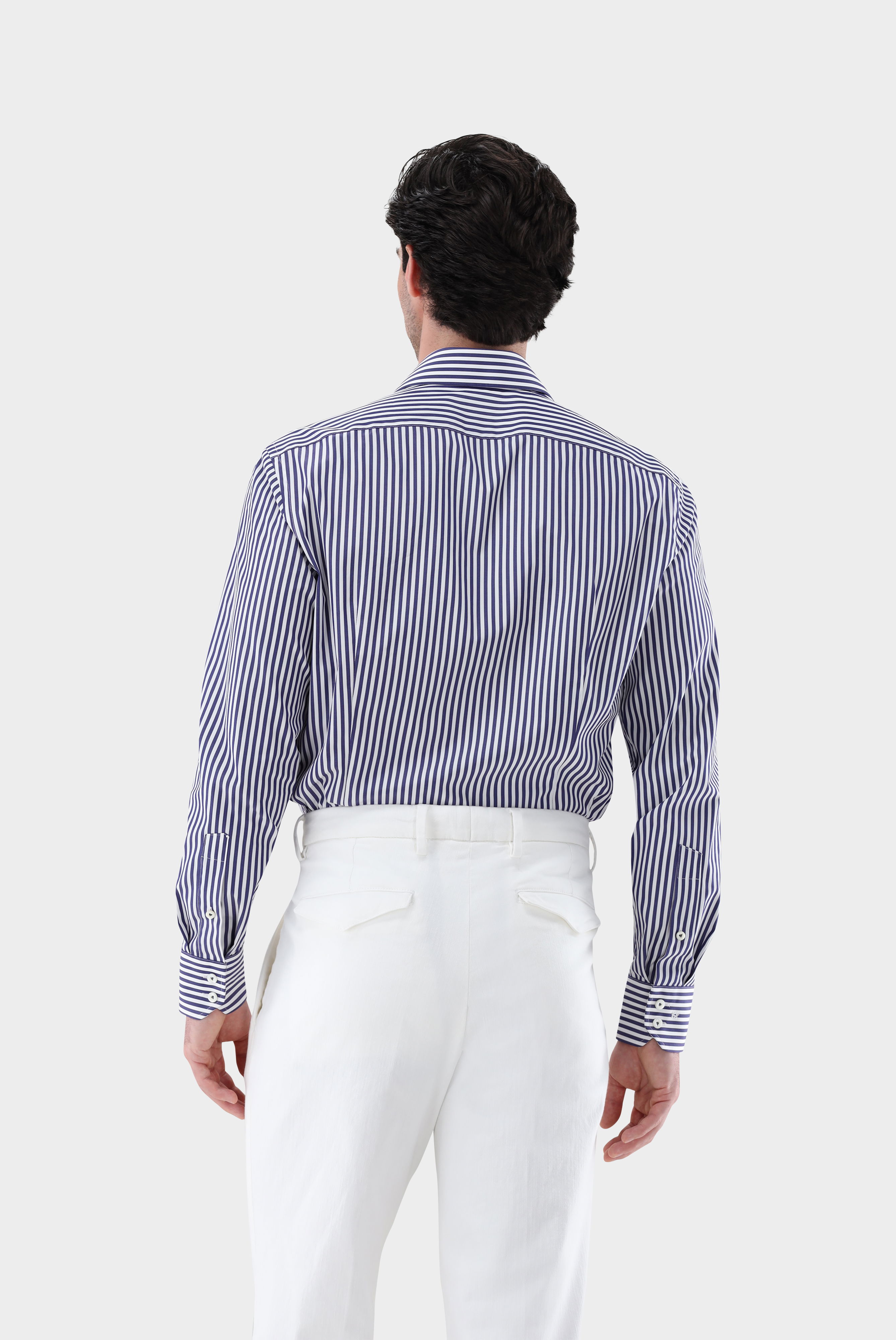 Dieses Tailor-Fit-Hemd aus luxuriösem gestreiftem Popeline überzeugt durch seine elegante, körpernahe Silhouette. Der Haifischkragen verleiht dem Modell eine moderne, edle Note, während hochwertige Perlmuttknöpfe stilvolle Akzente setzen. Das feine, glatte Popeline-Material bietet angenehmen Tragekomfort, Formstabilität und ein gepflegtes Erscheinungsbild. Vielseitig kombinierbar, eignet sich das Hemd ideal für Business- und Smart-Casual-Looks mit frischem, hochwertigem Stil.