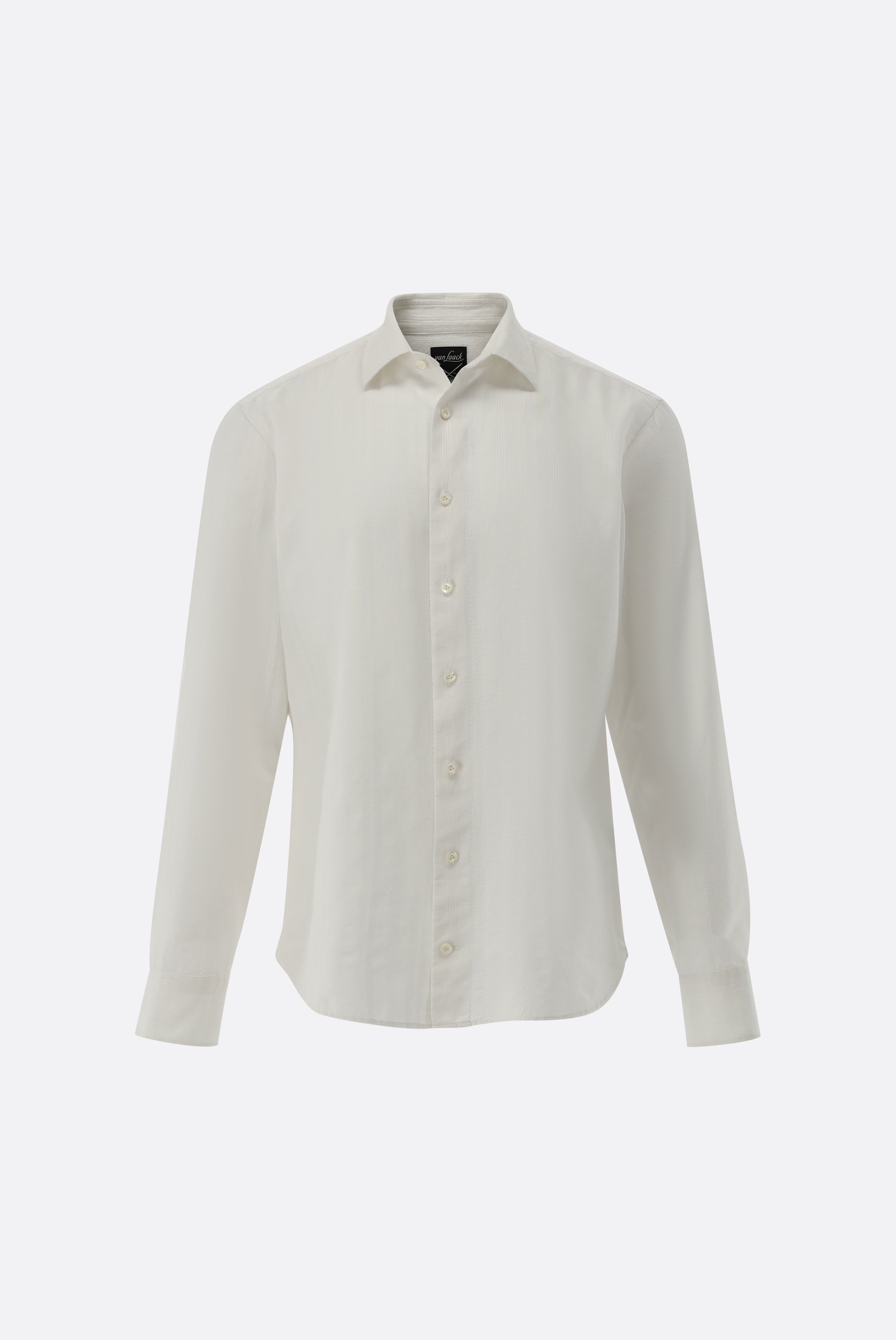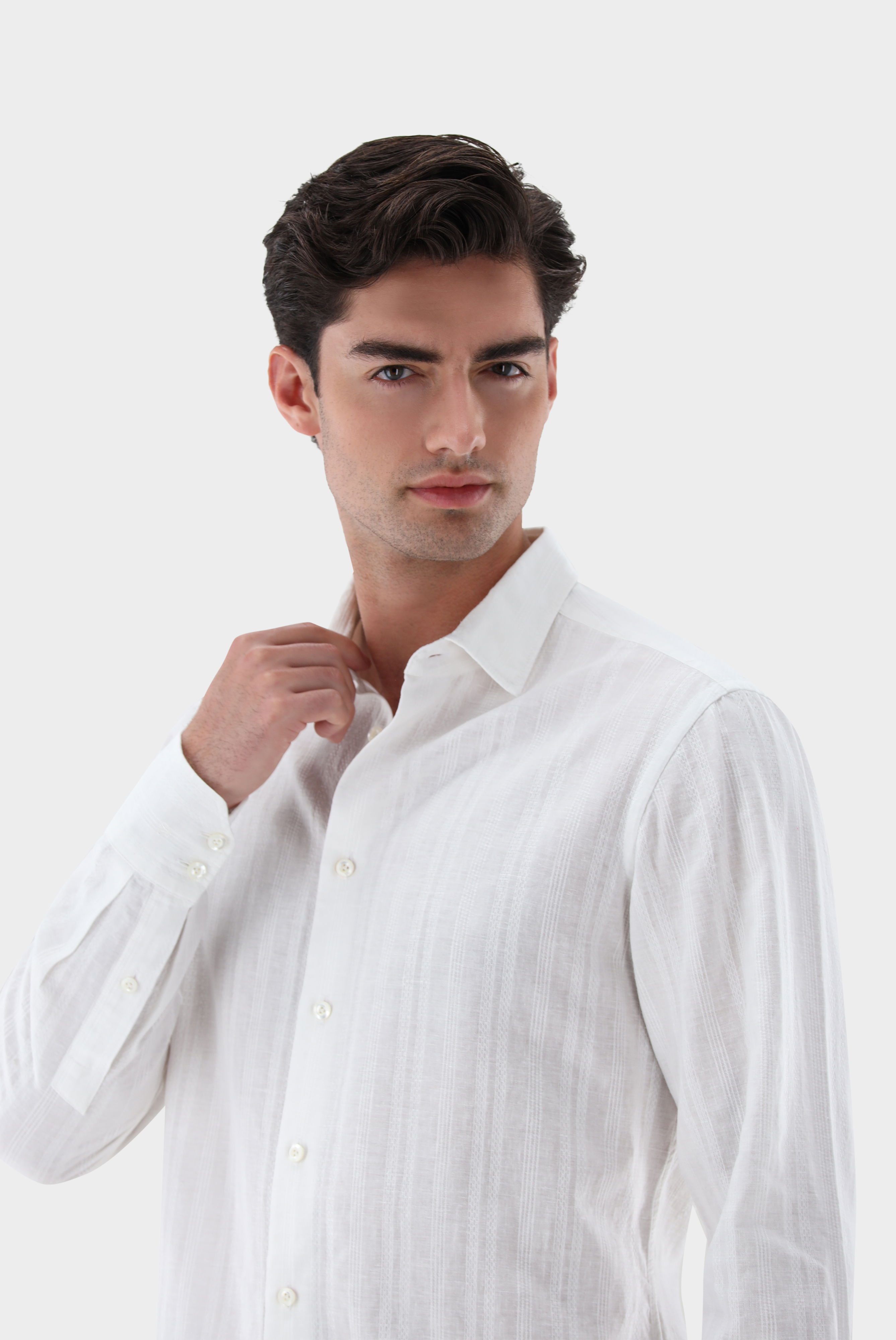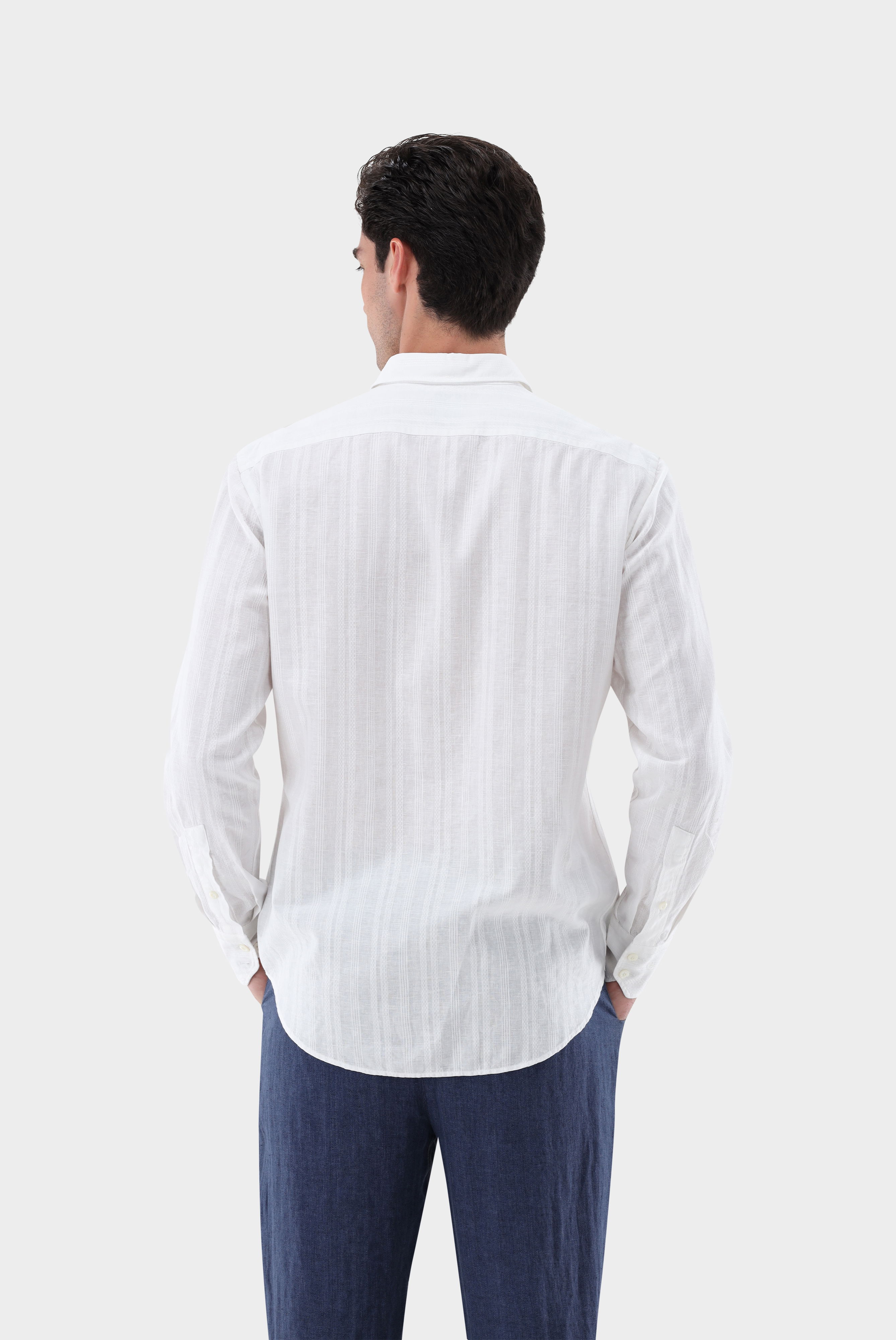 Dieses moderne Hemd aus einer Baumwolle und Leinen Mischung wird durch einen lässigen Ajoure Streifen veredelt. Der Kentkragen und die taillierte Passform verleihen dem Hemd eine moderne Silhouette, während das natürliche Material atmungsaktiv und kühlend wirkt – ideal für warme Tage. Das Design ohne Abnäher sorgt für einen sauberen, minimalistischen Look, perfekt für Casual- und Beach-Outfits.