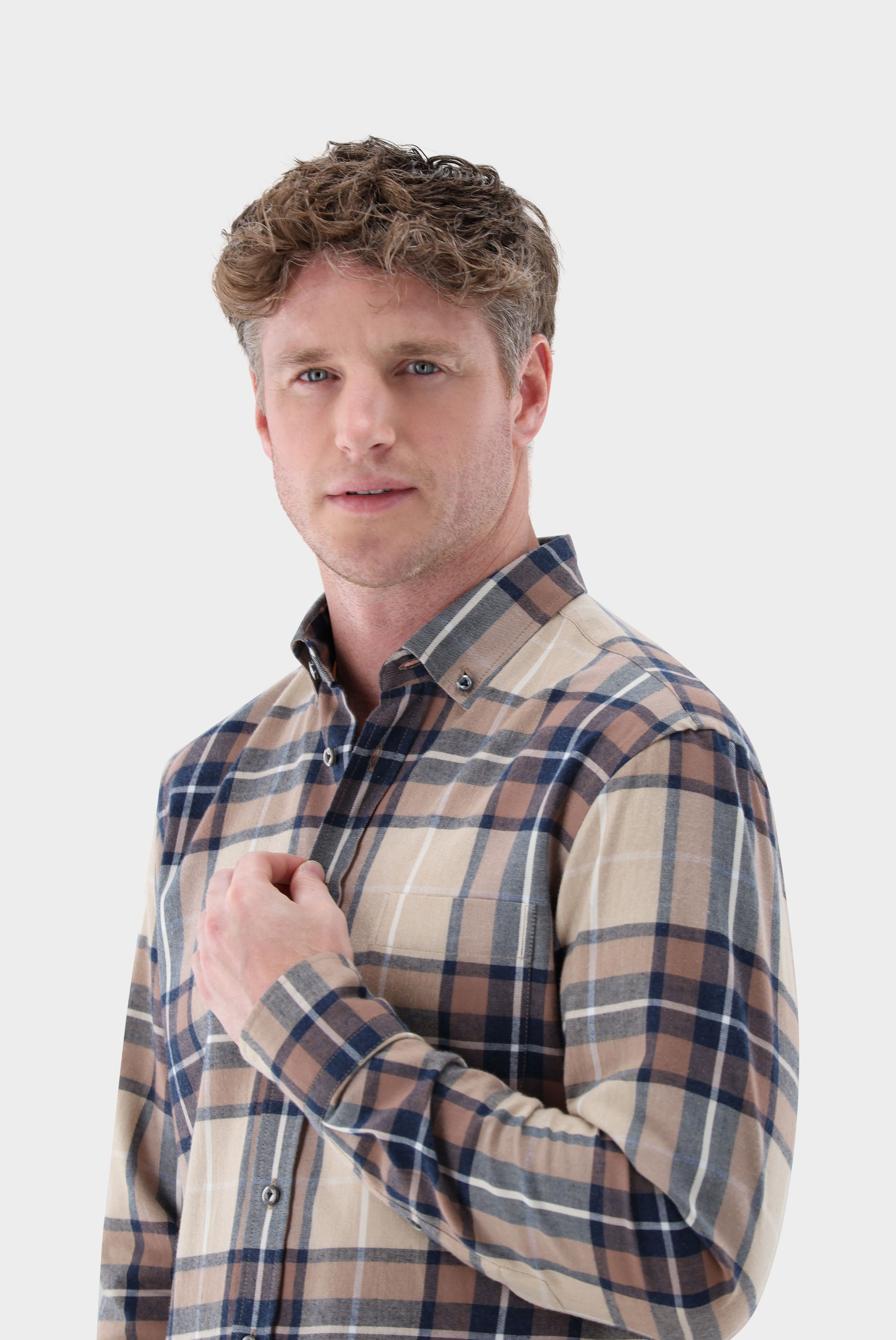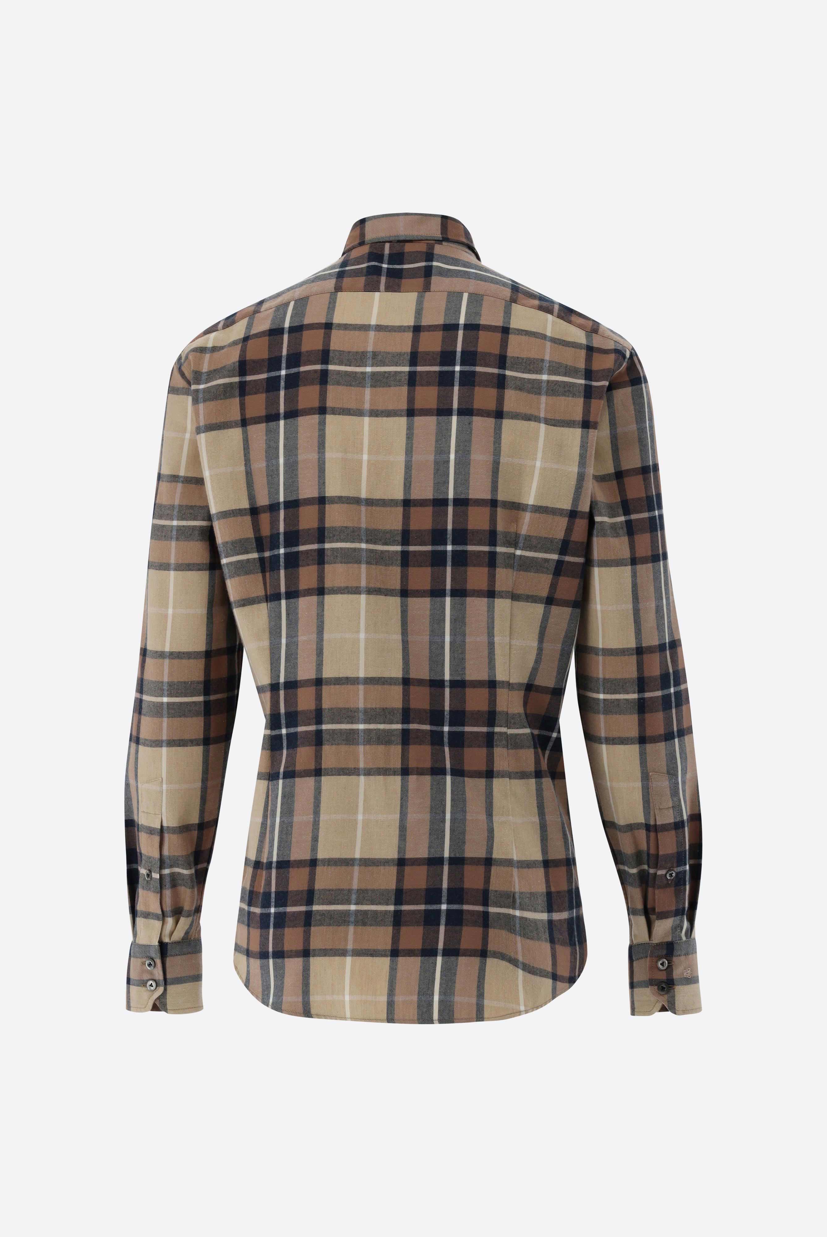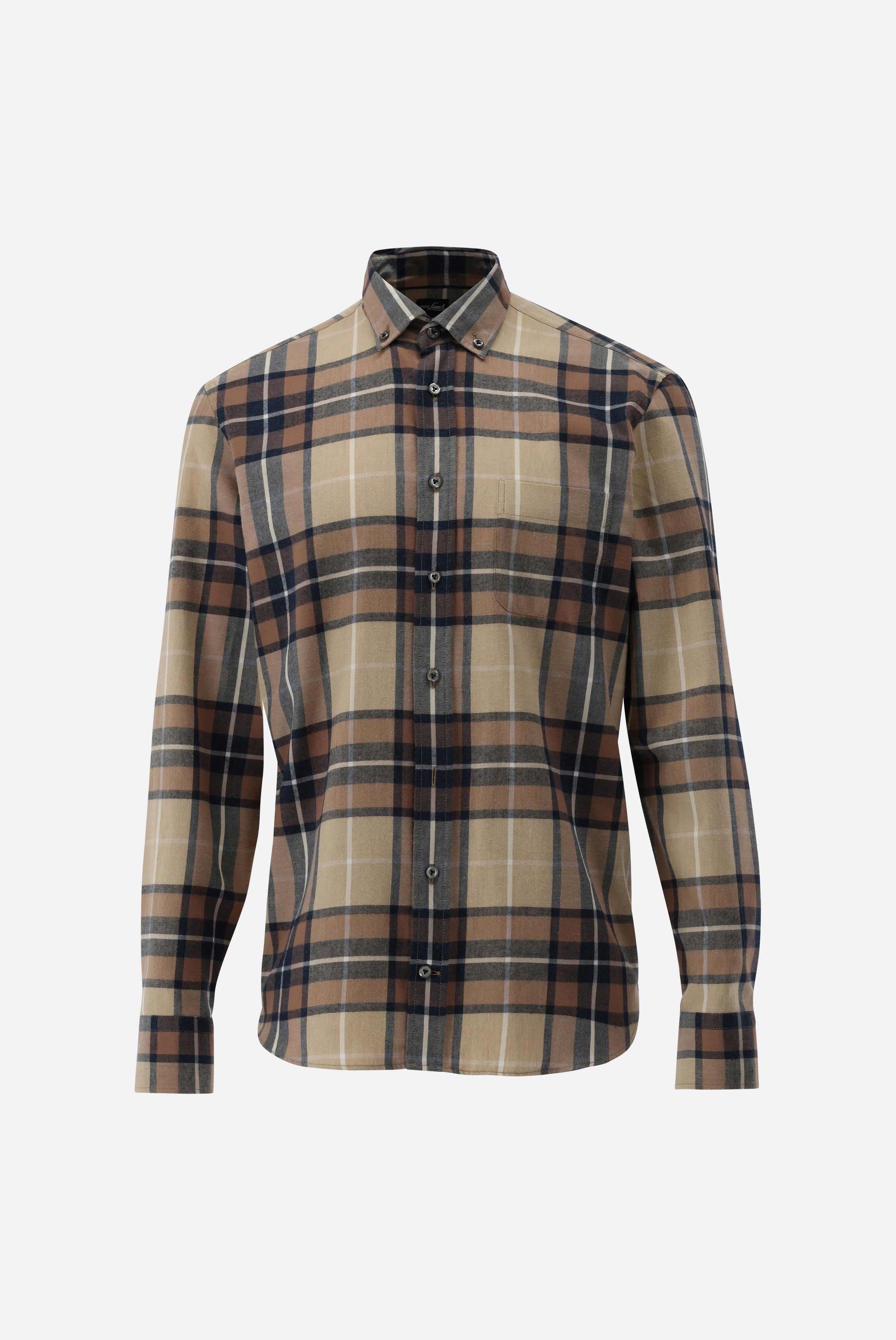 Dieses groß-kariert Flanellhemd mit grobem Garnstich und Paspeldetail bietet eine Tailor Fit Passform aus Twill. Es verfügt über einen Button-Down-Kragen und eine offene Knopfleiste. Besondere Merkmale sind die klassischen Manschetten mit dem besonderen van Laack Schwung, die aufgenähten van Laack Beinecken sowie die aufgesetzte Knopfleiste und Brusttasche. Die hochwertige Verarbeitung umfasst Innennähte, Seitennähte und Handkappnähte, die mit dickerem Garn abgesteppt sind. Die Perlmuttknöpfe und die dicke Garnnaht ergänzen den Freizeit- und Casual-Look des Hemdes.