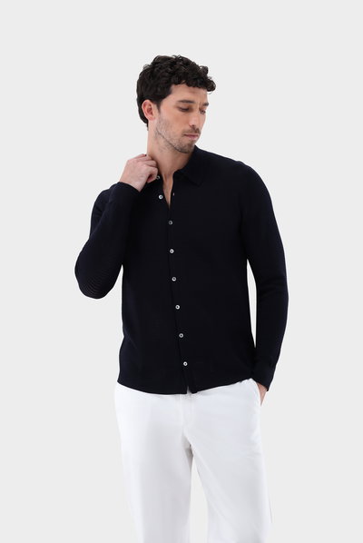 Das Strick Hemd mit Retro Struktur aus Air Cotton überzeugt durch Tragekomfort und hochwertige Verarbeitung. Der Einsatz von gezwirnten, fein gestrickten Baumwollgarnen mit einer leichten Struktur, welche gleichzeitig blickdicht sind, bewirkt besondere Luftdurchlässigkeit und verleiht dem Hemd einen besonders modernen look.