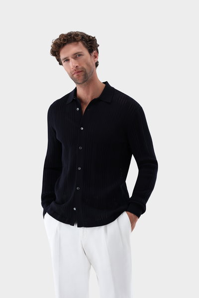 Das Strick Hemd mit Streifen Struktur aus Air Cotton überzeugt durch Tragekomfort und hochwertige Verarbeitung. Der Einsatz von gezwirnten, fein gestrickten Baumwollgarnen mit einer modernen Struktur in Streifen-Form, welche gleichzeitig blickdicht sind, bewirkt besondere Luftdurchlässigkeit und verleiht dem Hemd einen besonders modernen look.