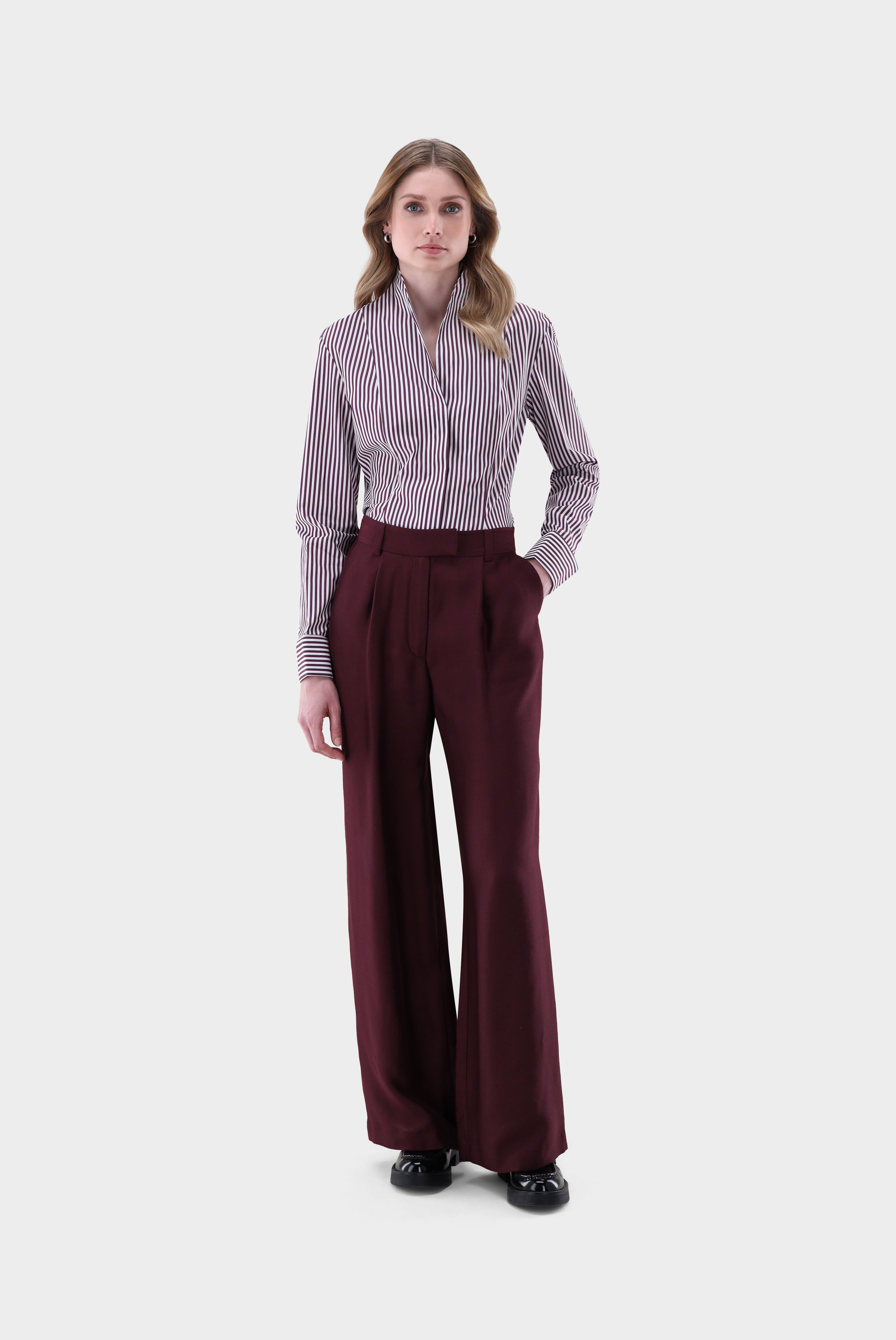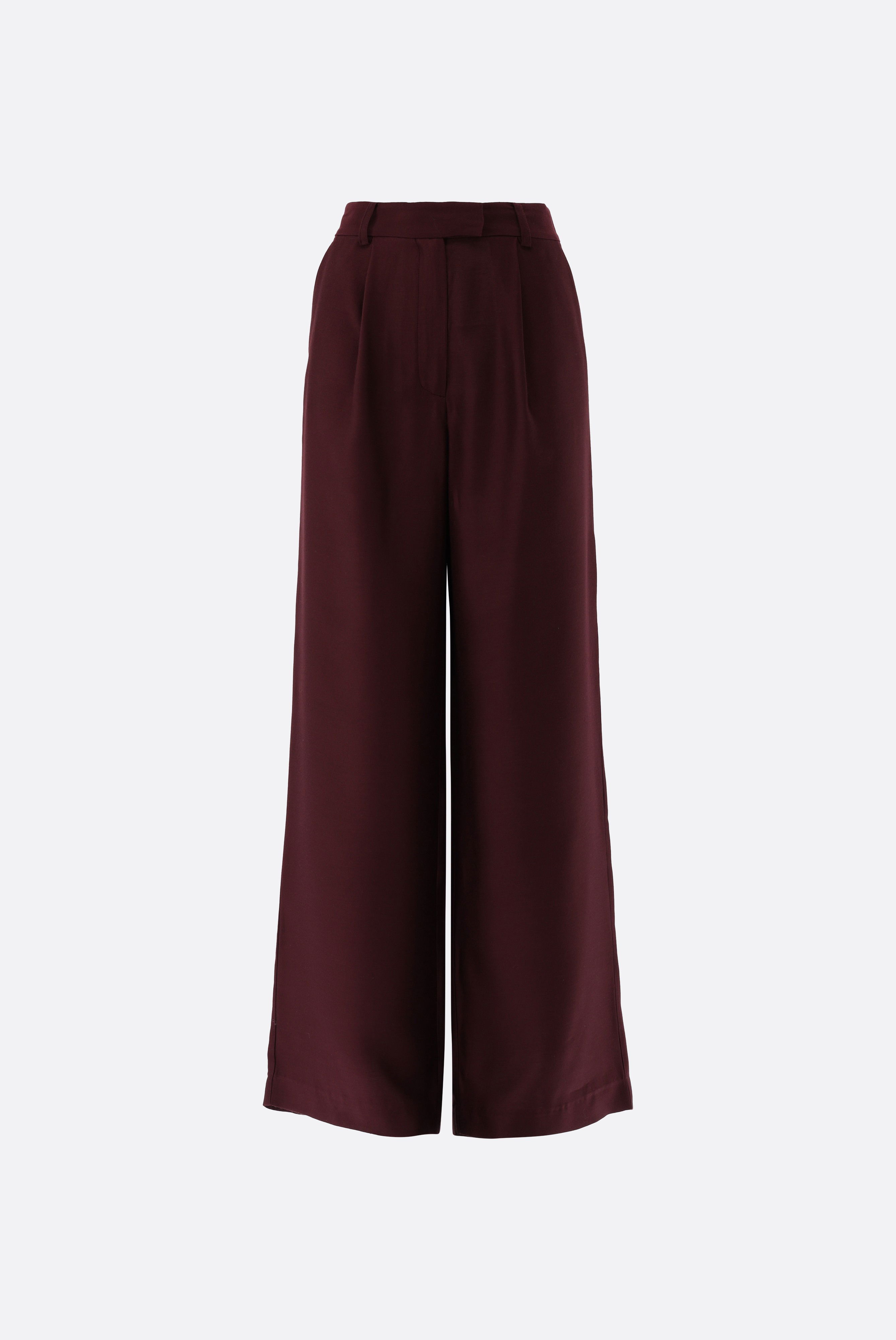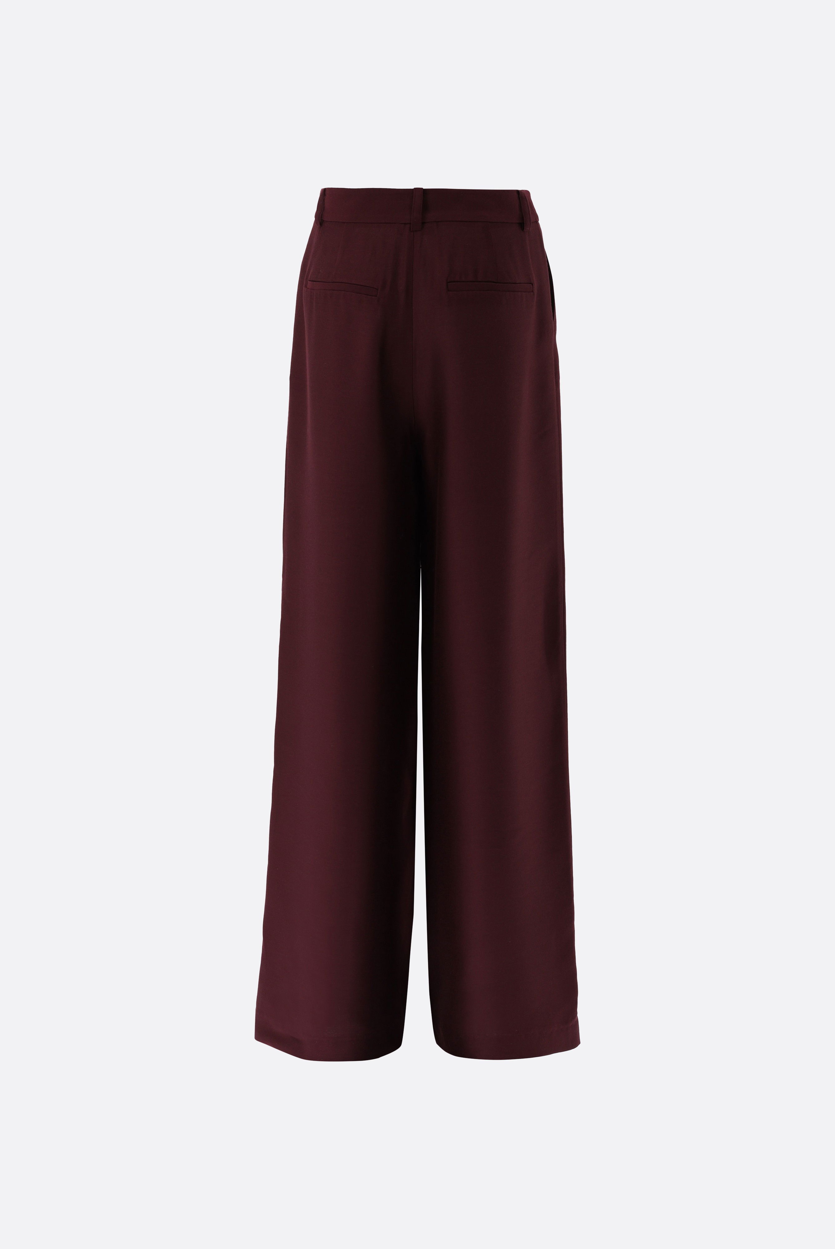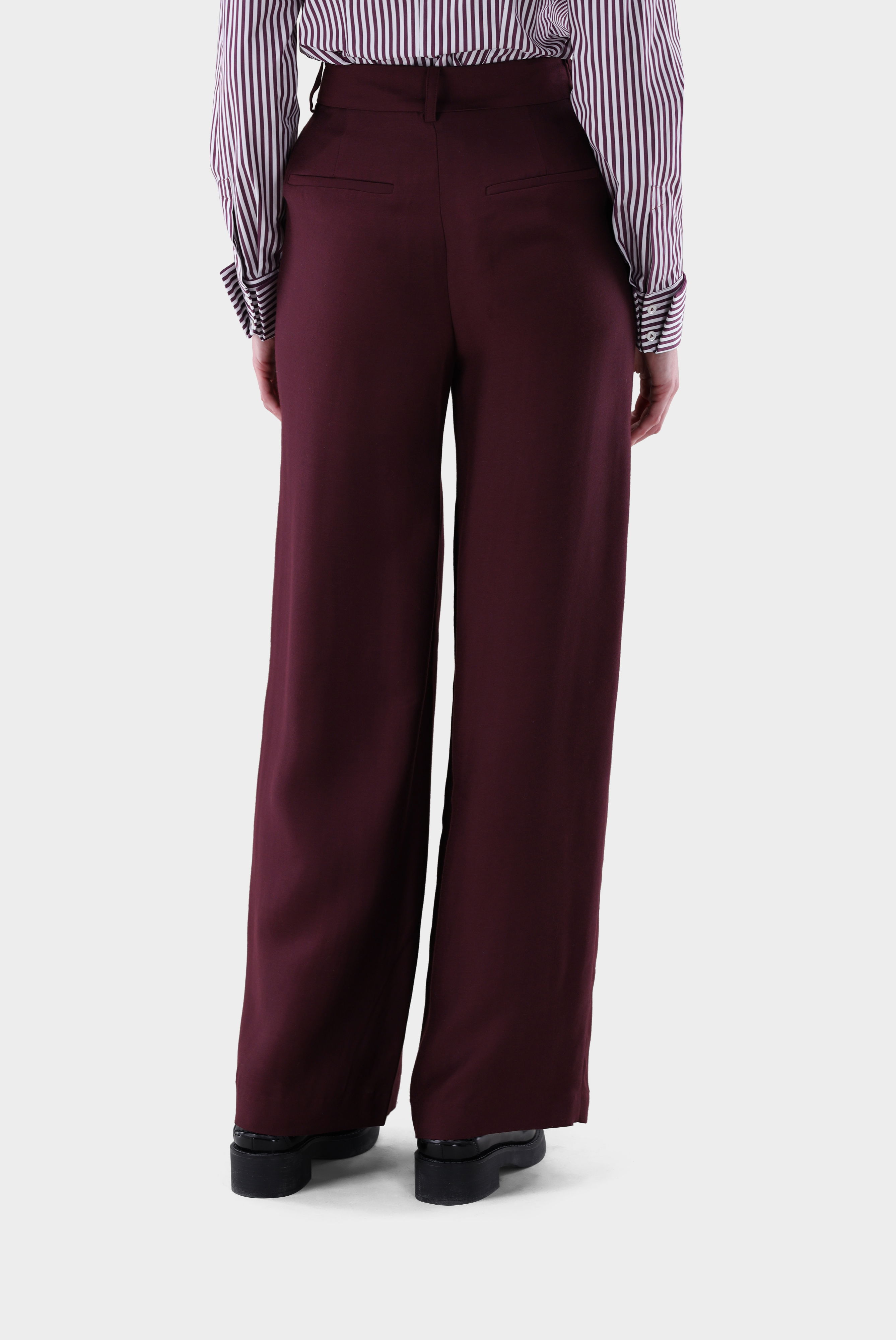 Die Hose mit mittelhohem Bund und weitem Bein überzeugt mit einer eleganten, fließenden Silhouette. Vorderseitige Bügelfalten und ein verdeckter Haken- und Reißverschluss sorgen für eine klassische Optik. Gürtelschlaufen, seitliche Eingrifftaschen und rückseitige Leistentaschen bieten Funktionalität und vielseitige Kombinationsmöglichkeiten. Gefertigt aus einer einfarbigen Modal-Seidenmischung besticht die Hose durch einen edlen Glanz und hohen Tragekomfort. Sie ist die perfekte Wahl für stilvolle Business- und Freizeitlooks.