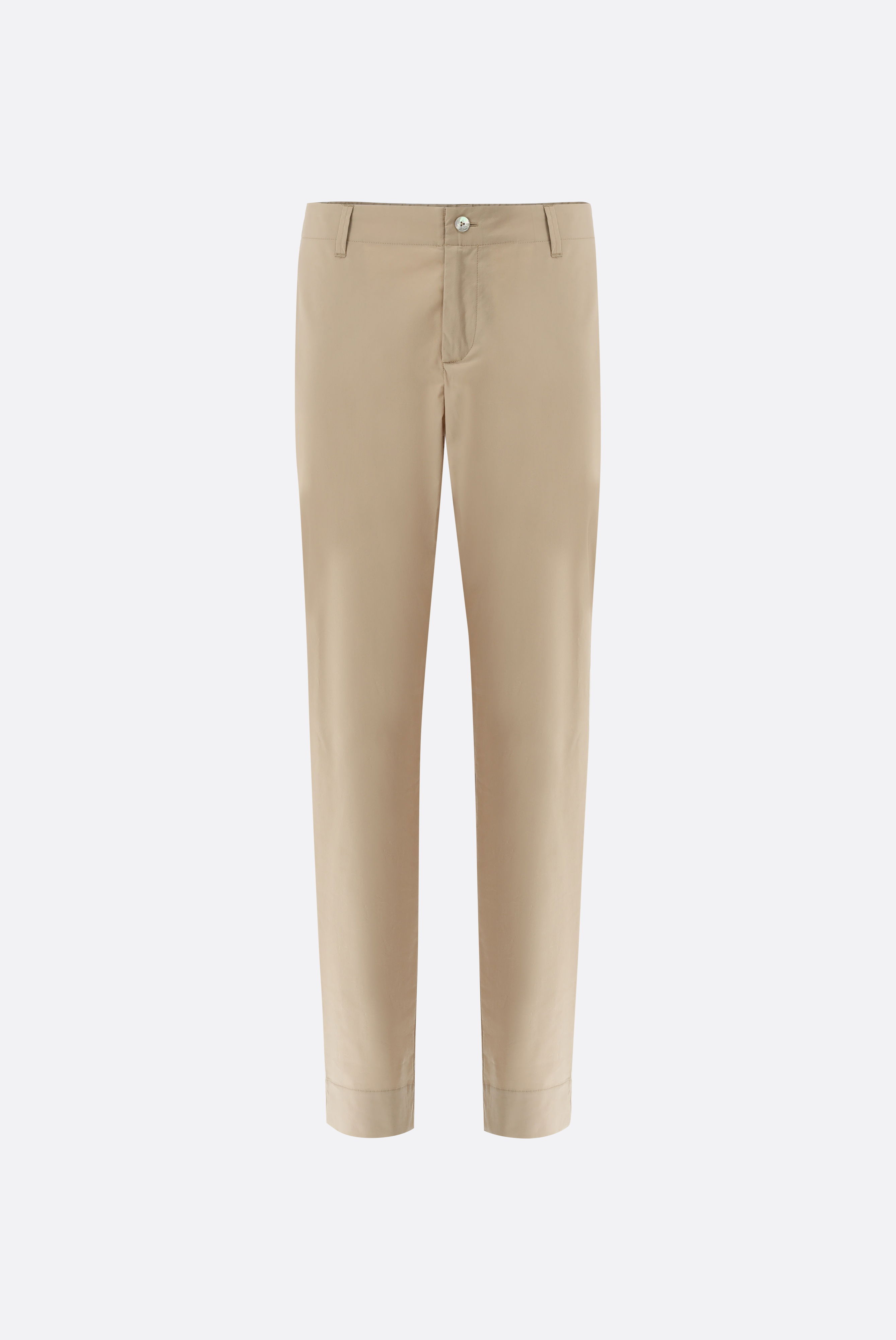 Die Chino Hose mit mittelhohem Bund wird aus einfarbiger Baumwolle mit Paper-Touch gefertigt. Der Stoff verfügt zudem über einen geringen Anteil Elastan für mehr Beweglichkeit und Stretch. Zusätzlich bieten Seitentaschen und Paspeltaschen hinten einen klassichen Look. Der elastische Bund sorgt für zusätzliche Bewegungsfreiheit.