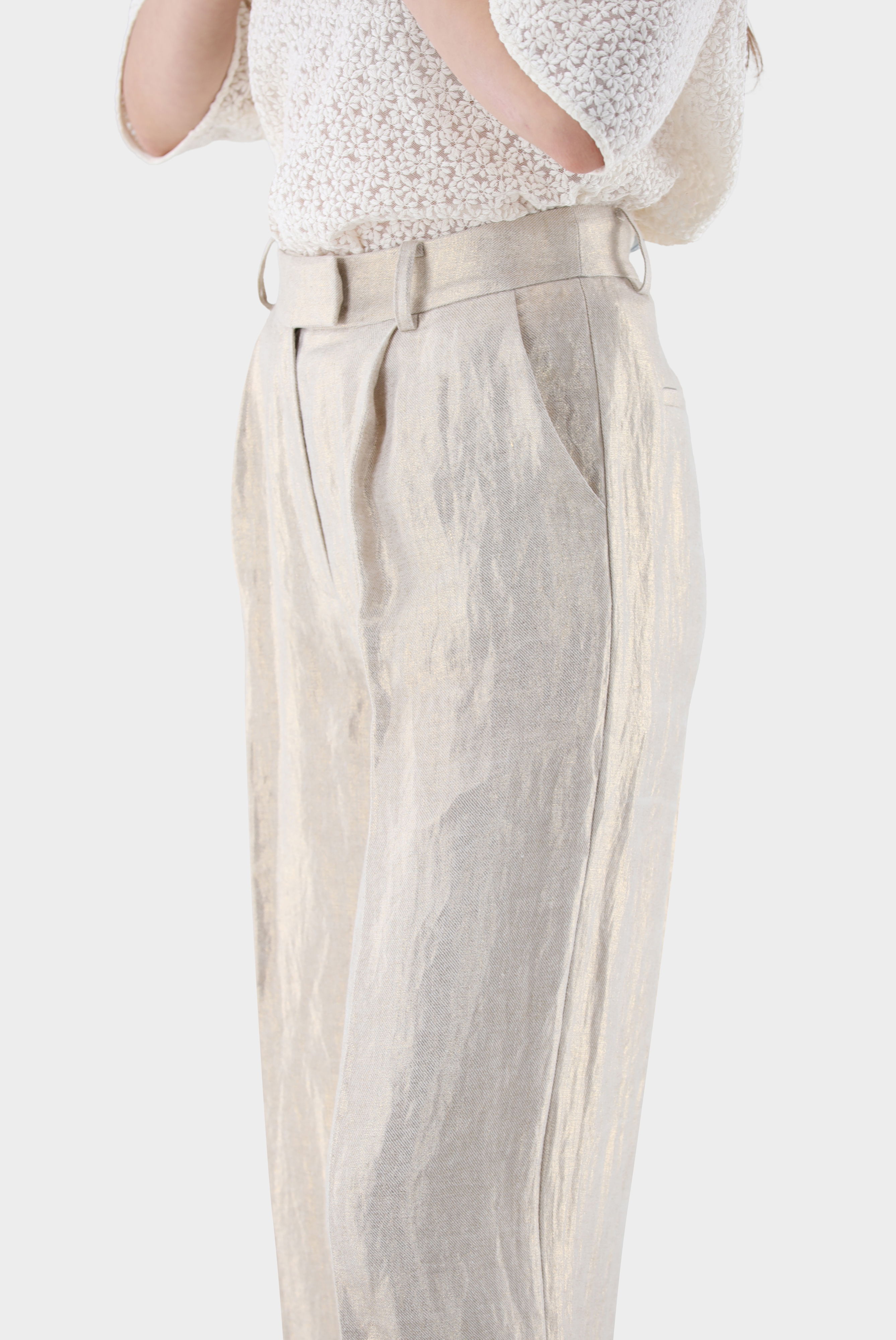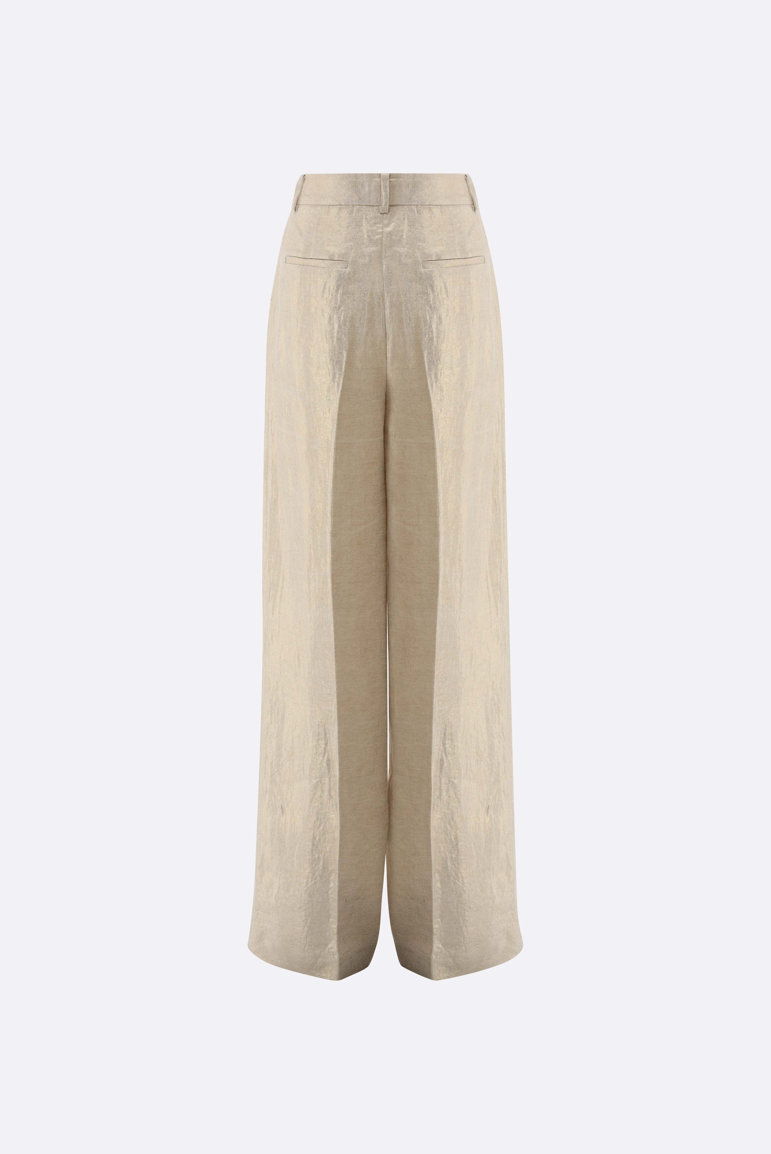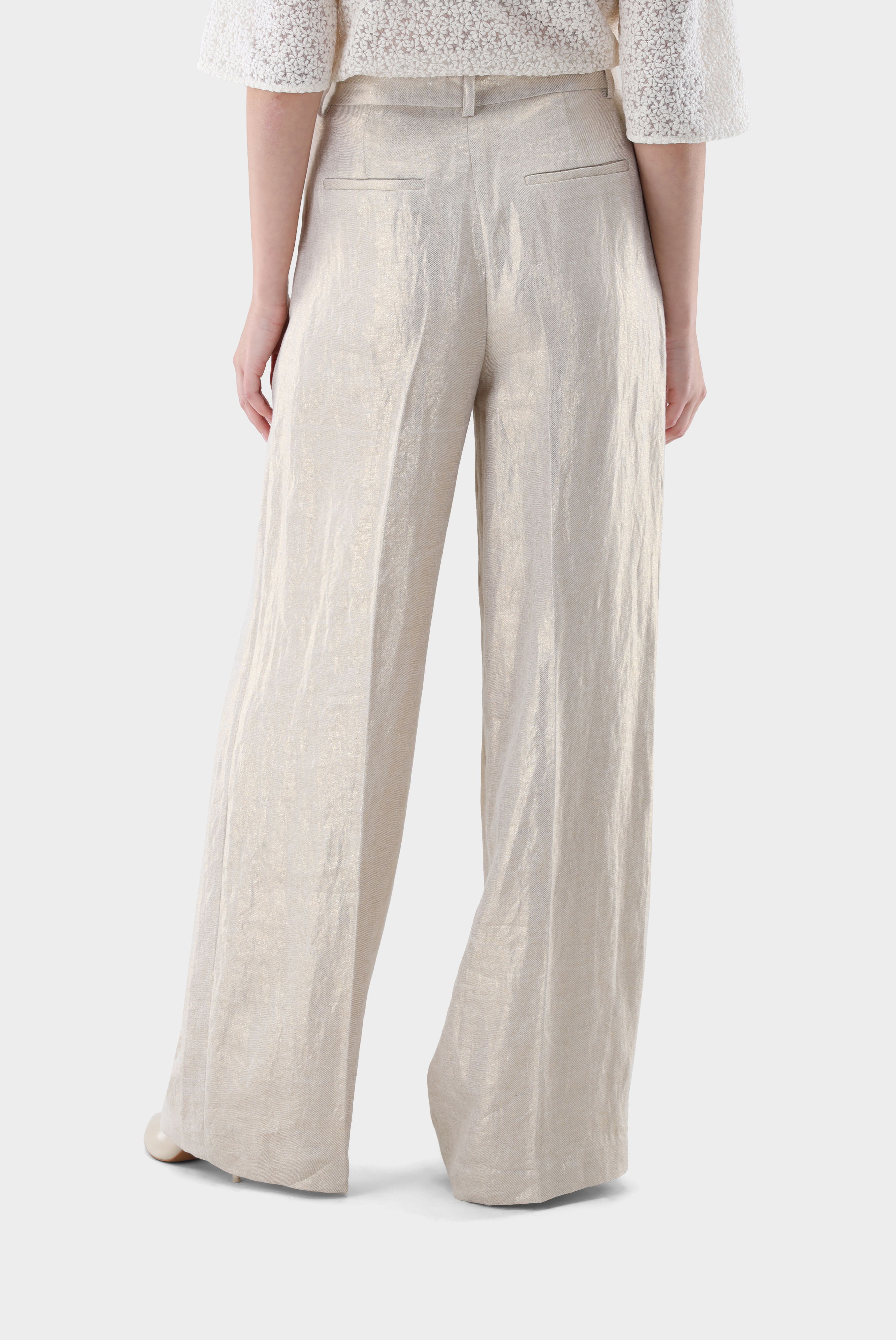 Diese Hose mit mittelhohem Bund und weitem Bein verbindet klassische Schneiderdetails mit moderner Eleganz. Bundfalten vorne, eine präzise Bügelfalte sowie seitliche Eingrifftaschen und Gesäßtaschen mit Leisten prägen die hochwertige Optik. Ein verdeckter Haken- und Reißverschluss sowie Gürtelschlaufen sorgen für perfekten Sitz. Gefertigt aus strukturiertem Leinen-Lurex-Twill überzeugt das Modell durch edlen Glanz und Tragekomfort und lässt sich ideal mit dem passenden Blazer Jatela-XX kombinieren.