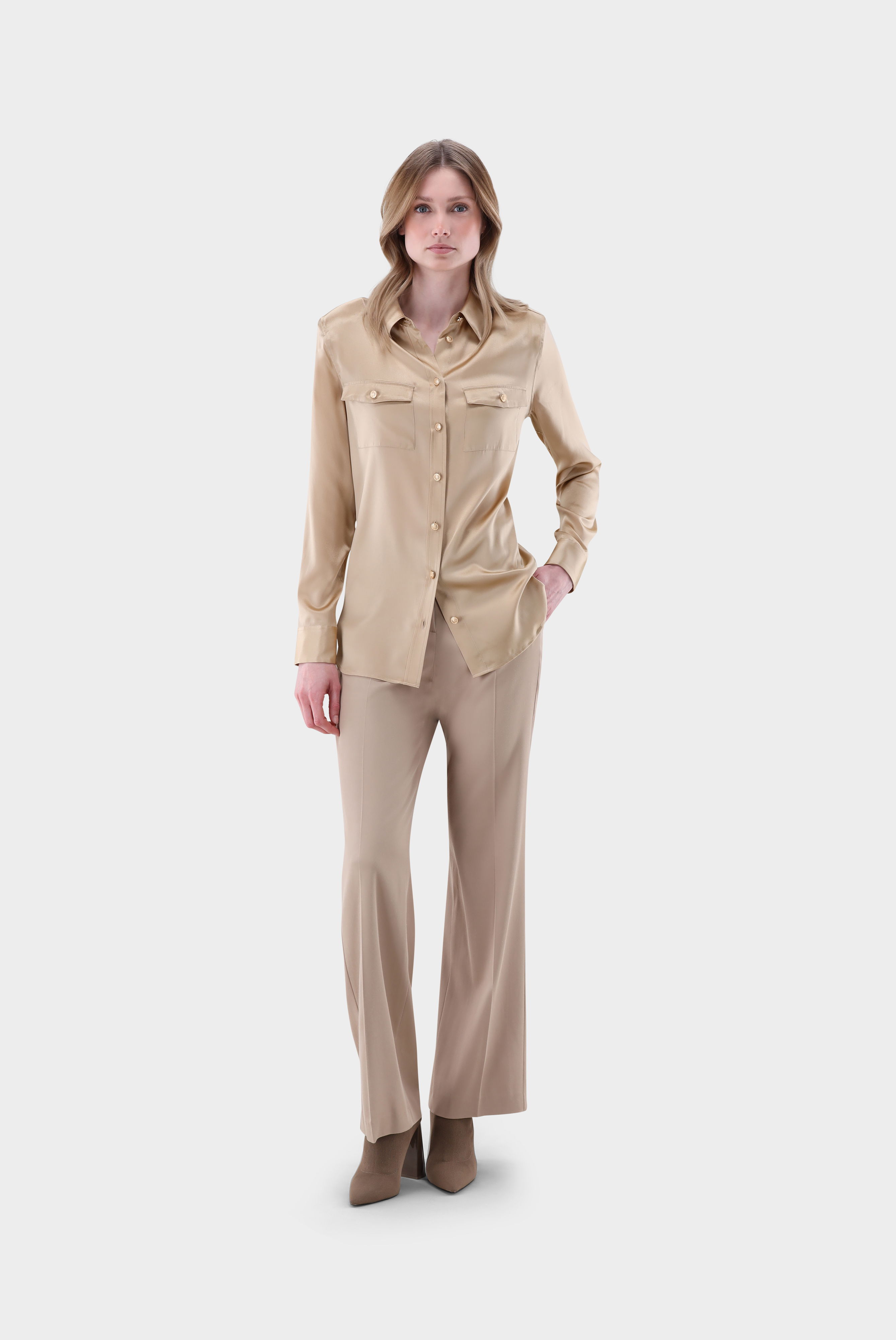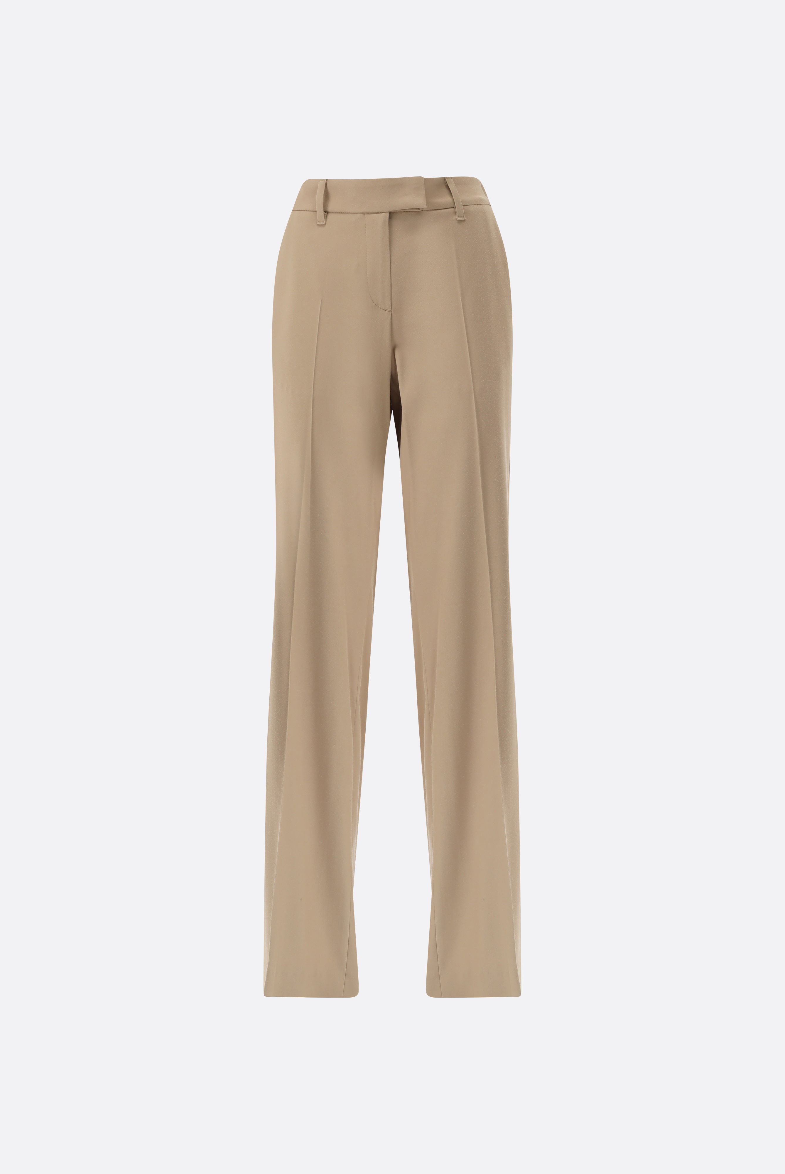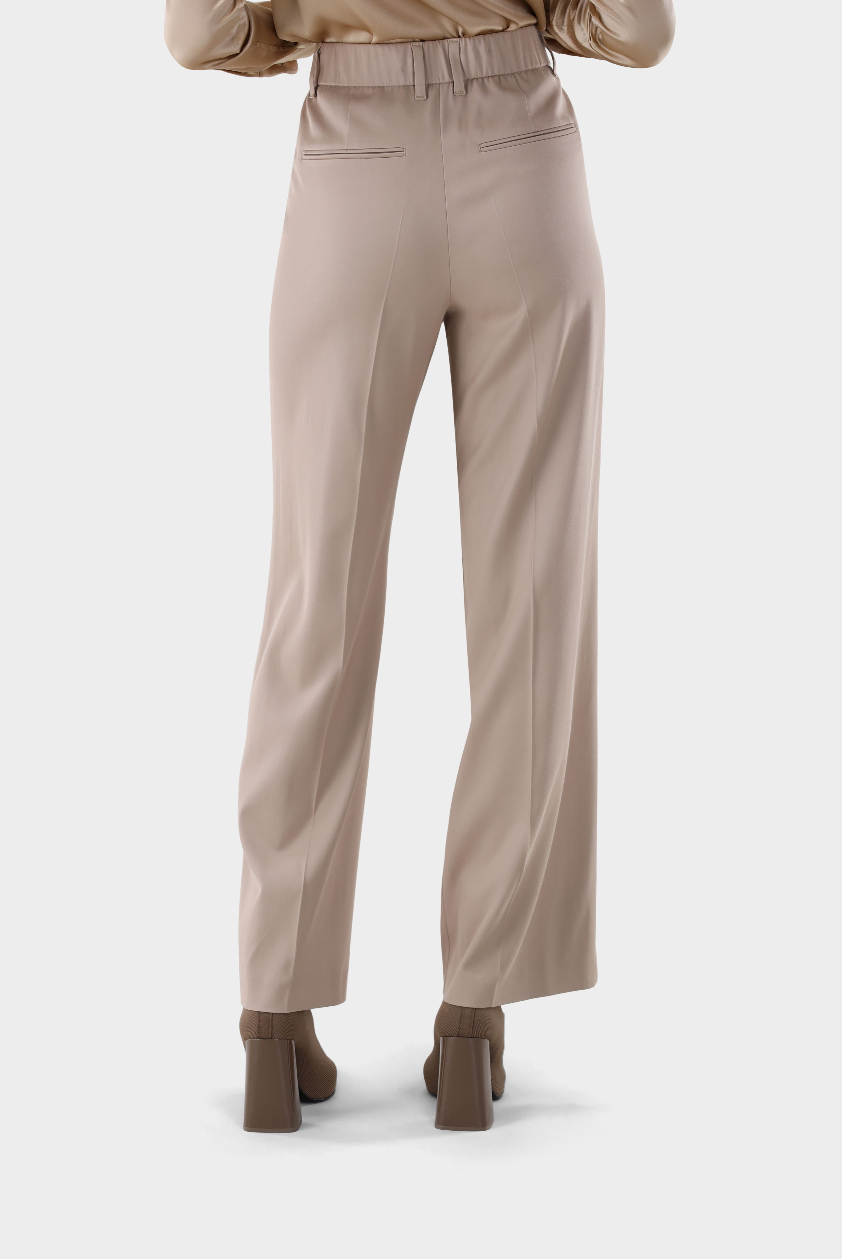 Die Hose mit mittelhohem Bund und weitem Bein überzeugt mit einer eleganten Silhouette und klassischer Bügelfalte. Ein verdeckter Haken- und Reißverschluss sorgt für einen cleanen Look. Gürtelschlaufen, praktische Seitentaschen und Leistentaschen am Gesäß bieten Funktionalität und vielseitige Kombinationsmöglichkeiten. Gefertigt aus einer schlichten Viskose-Stretchmischung gewährleistet die Hose hohen Tragekomfort und Bewegungsfreiheit. Sie eignet sich perfekt für stilvolle Business- und Freizeit Looks.