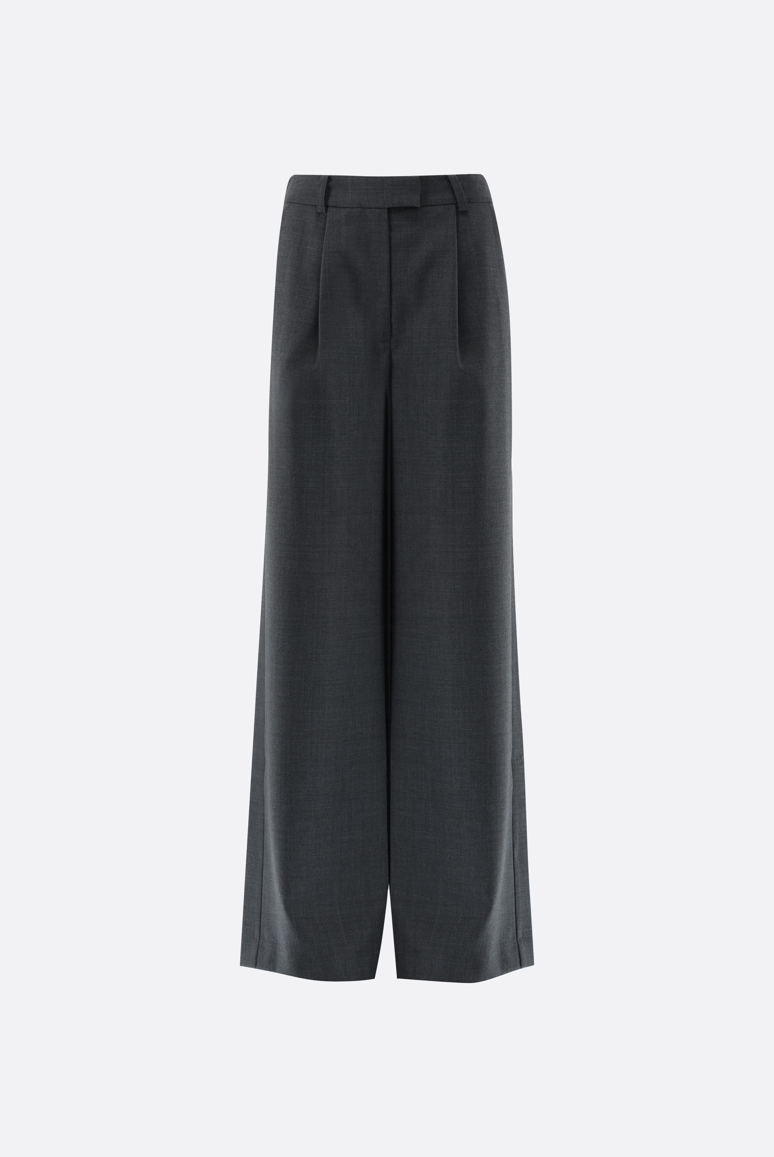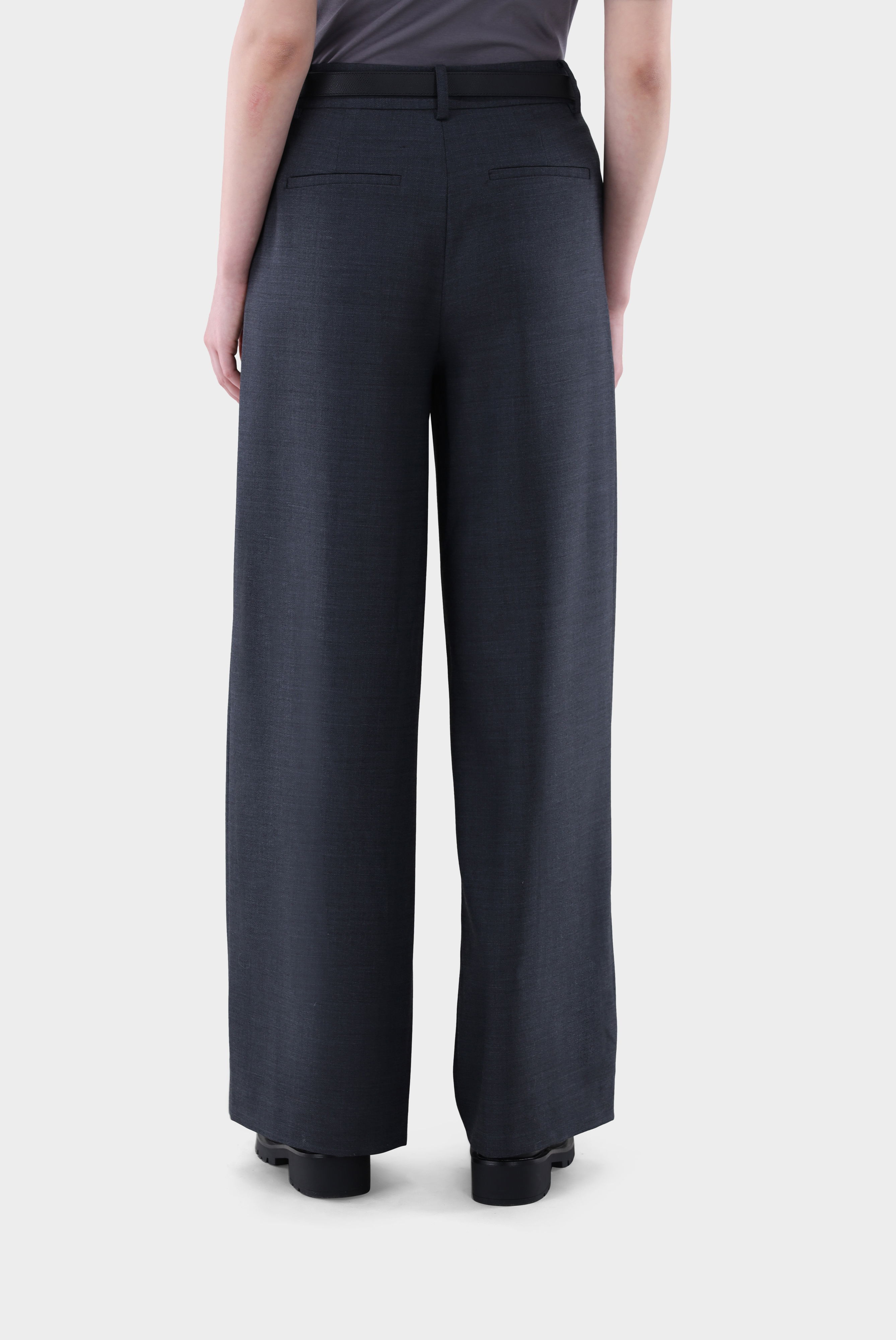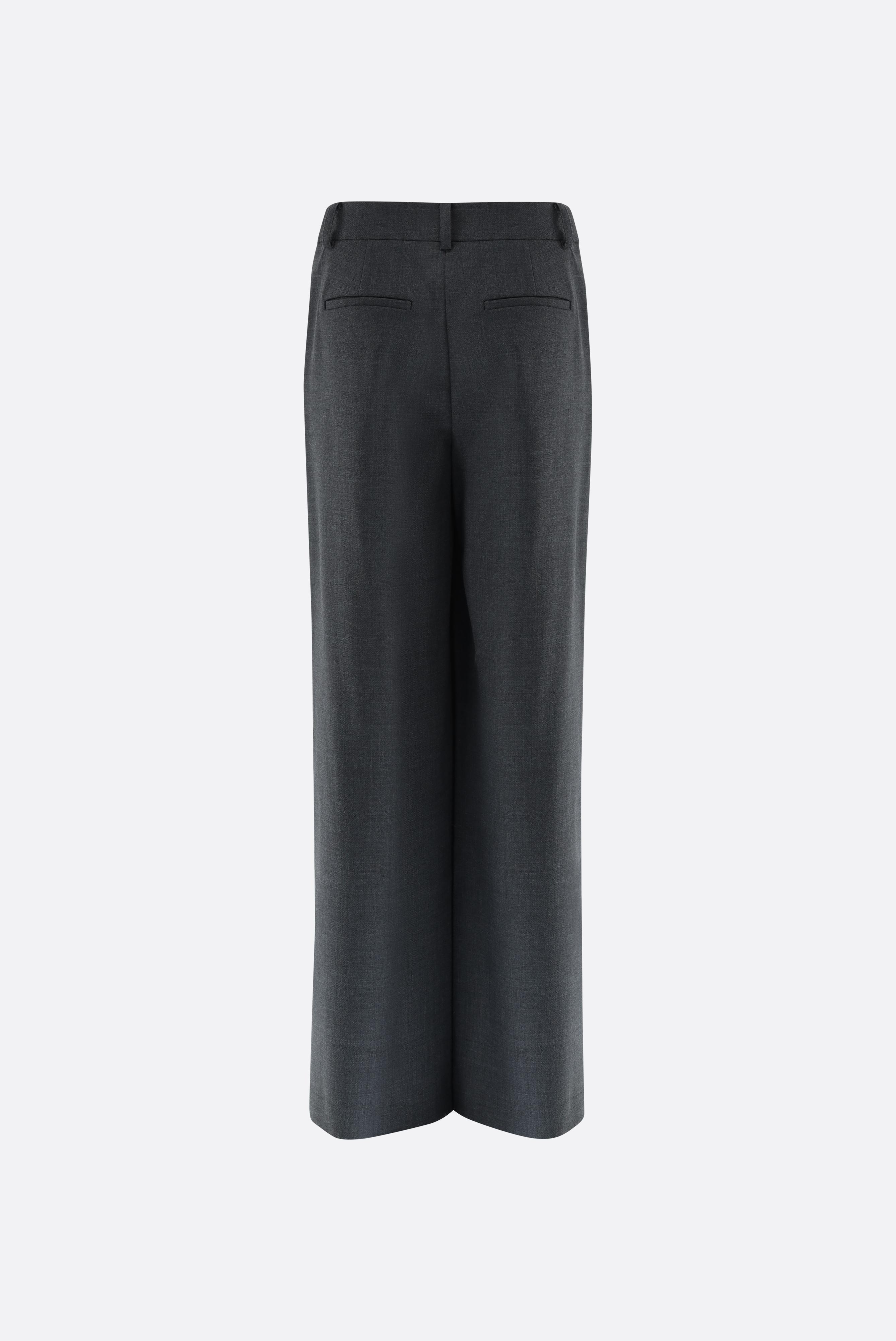 Diese Hose ist mit einem mittelhohen Bund und weitem Bein designt und bietet eine moderne, zugleich zeitlose Passform. Die vorderen Bügelfalten unterstreichen den klassischen Look, während der verdeckte Haken- und Reißverschluss für ein sauberes Finish sorgt. Gürtelschlaufen sowie seitliche Eingrifftaschen und Leistentaschen auf der Rückseite ergänzen die funktionalen Details. Gefertigt ist die Hose aus einer einfarbigen Woll-Polyester-Stretchmischung, die angenehmen Tragekomfort und Formstabilität gewährleistet. Ein vielseitiges Modell für elegante Business- oder gepflegte Freizeit-Outfits.
