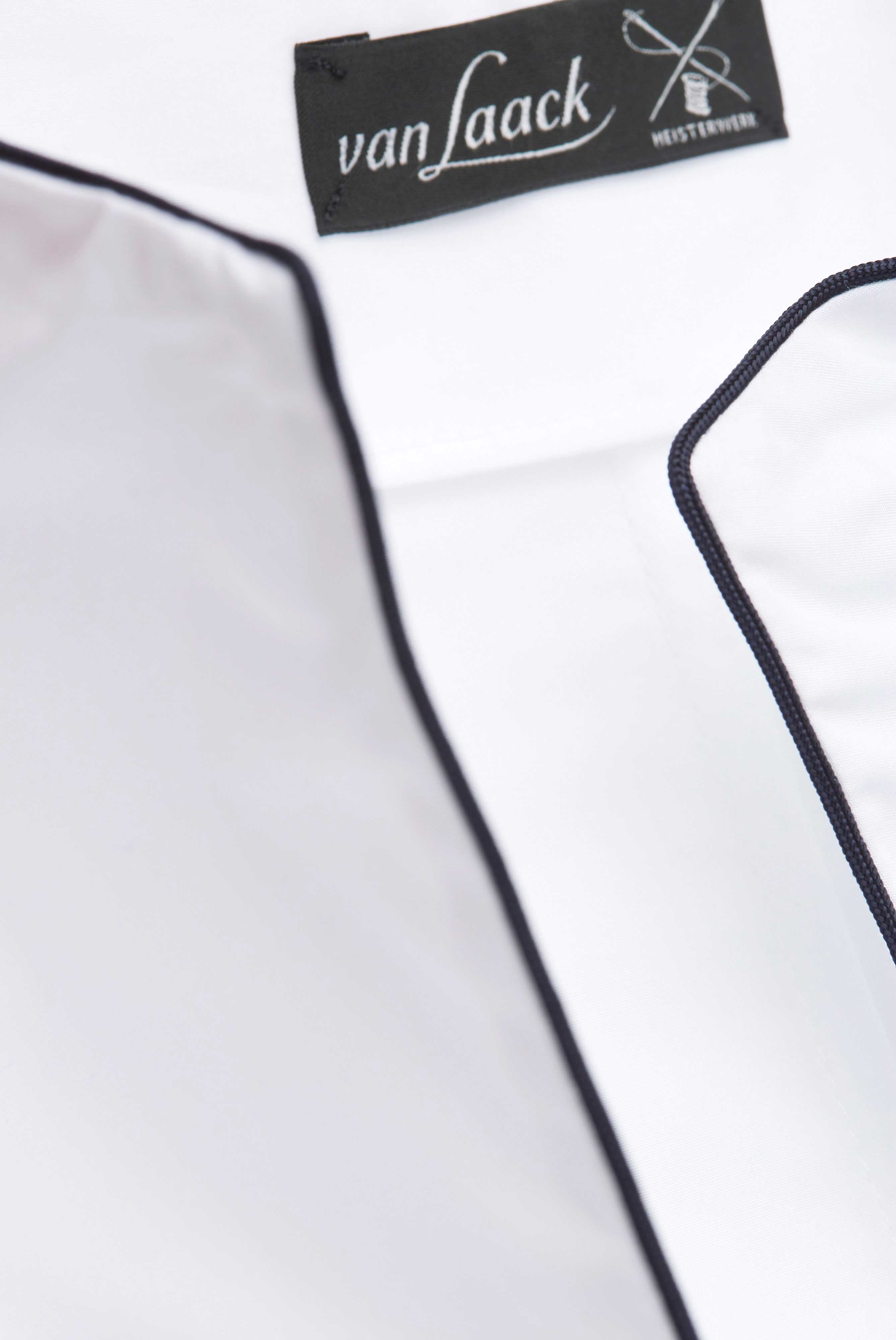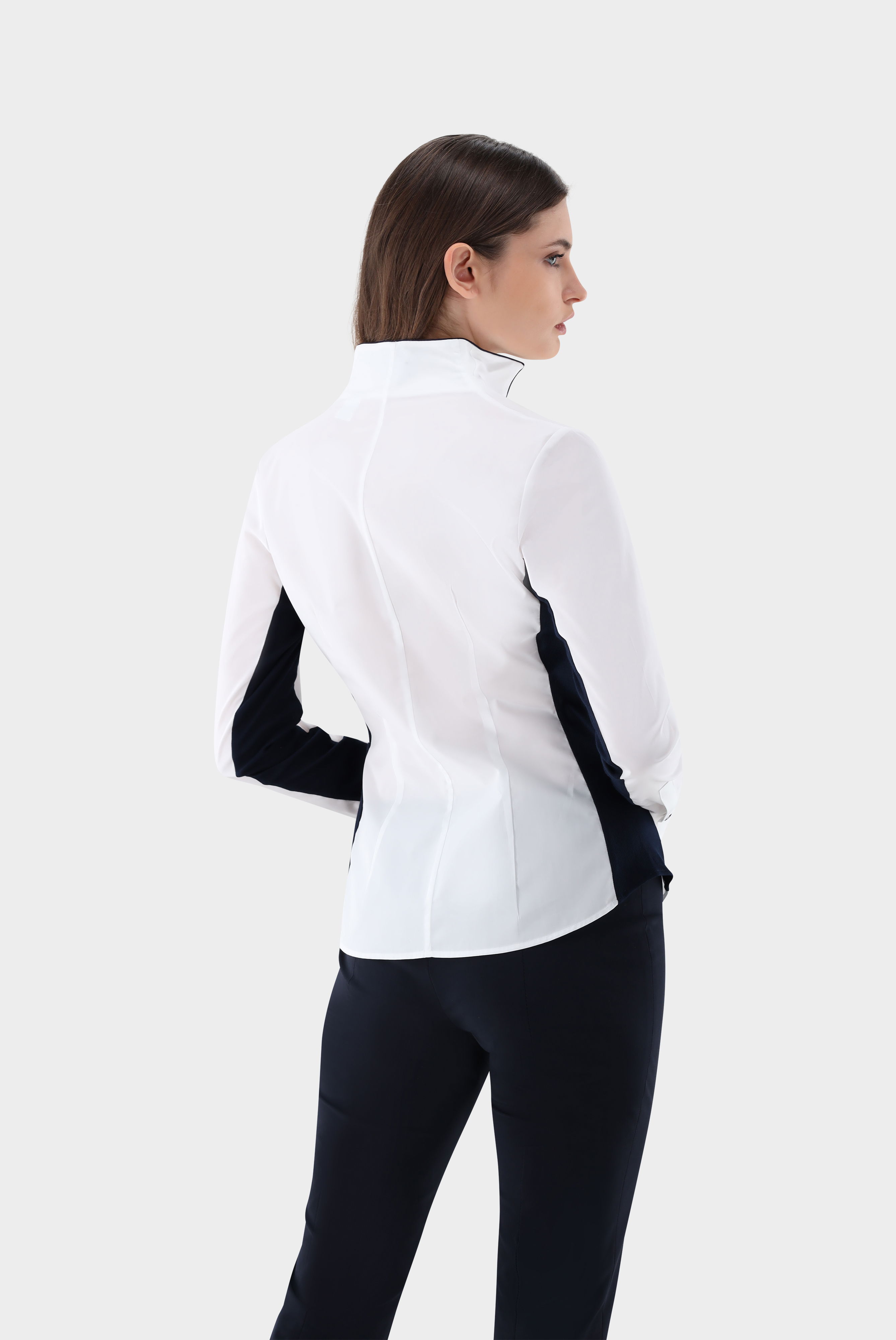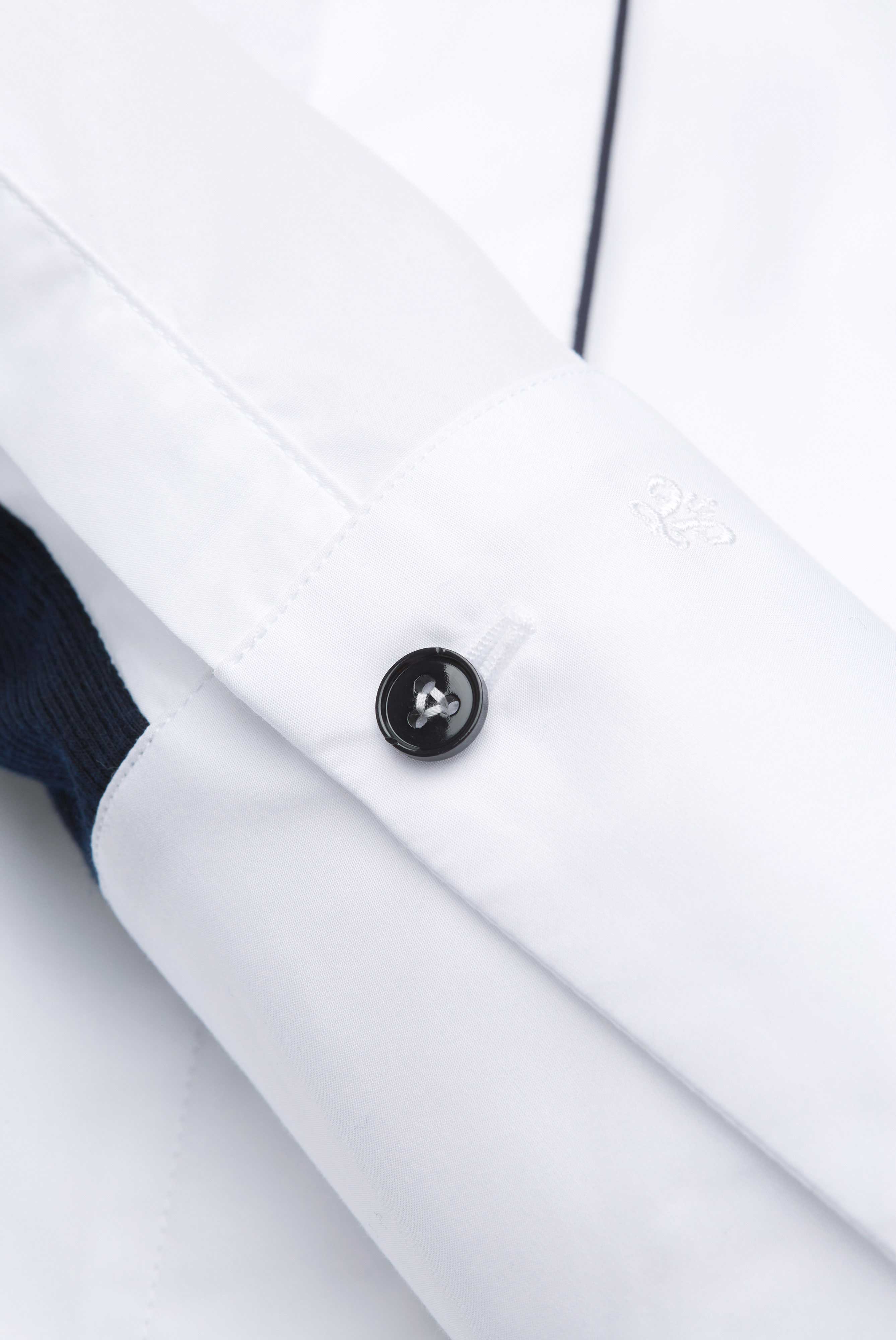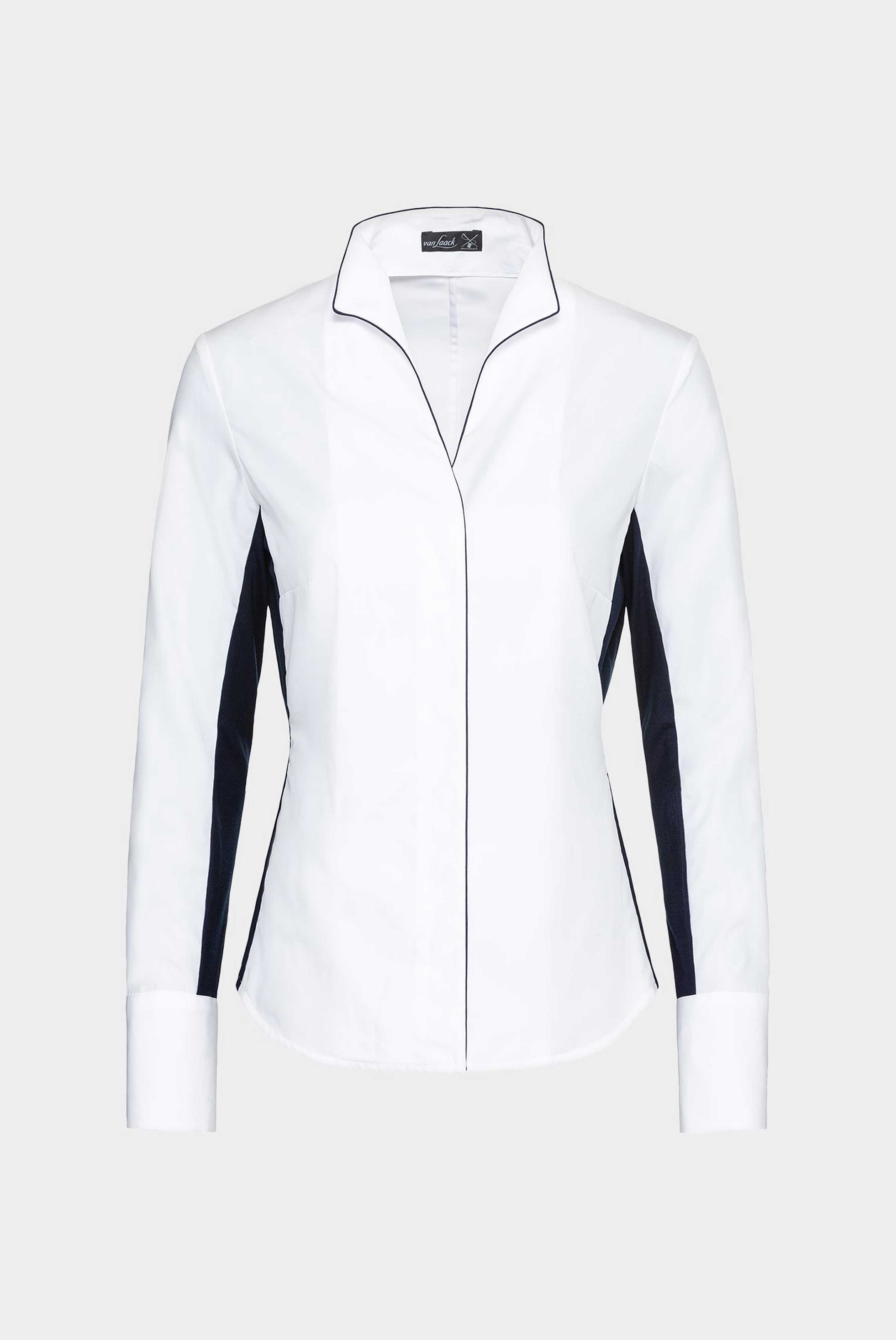 Entdecken Sie Stil und Komfort mit unserer Hybrid Kelchkragenbluse mit Jerseyeinsatz aus hochwertiger Baumwolle. Der Kelchkragen und die gerade Manschette verleihen einen klassischen Touch. Die verdeckte Knopfleiste sorgt für ein elegantes Erscheinungsbild und einen nahtlosen Look.