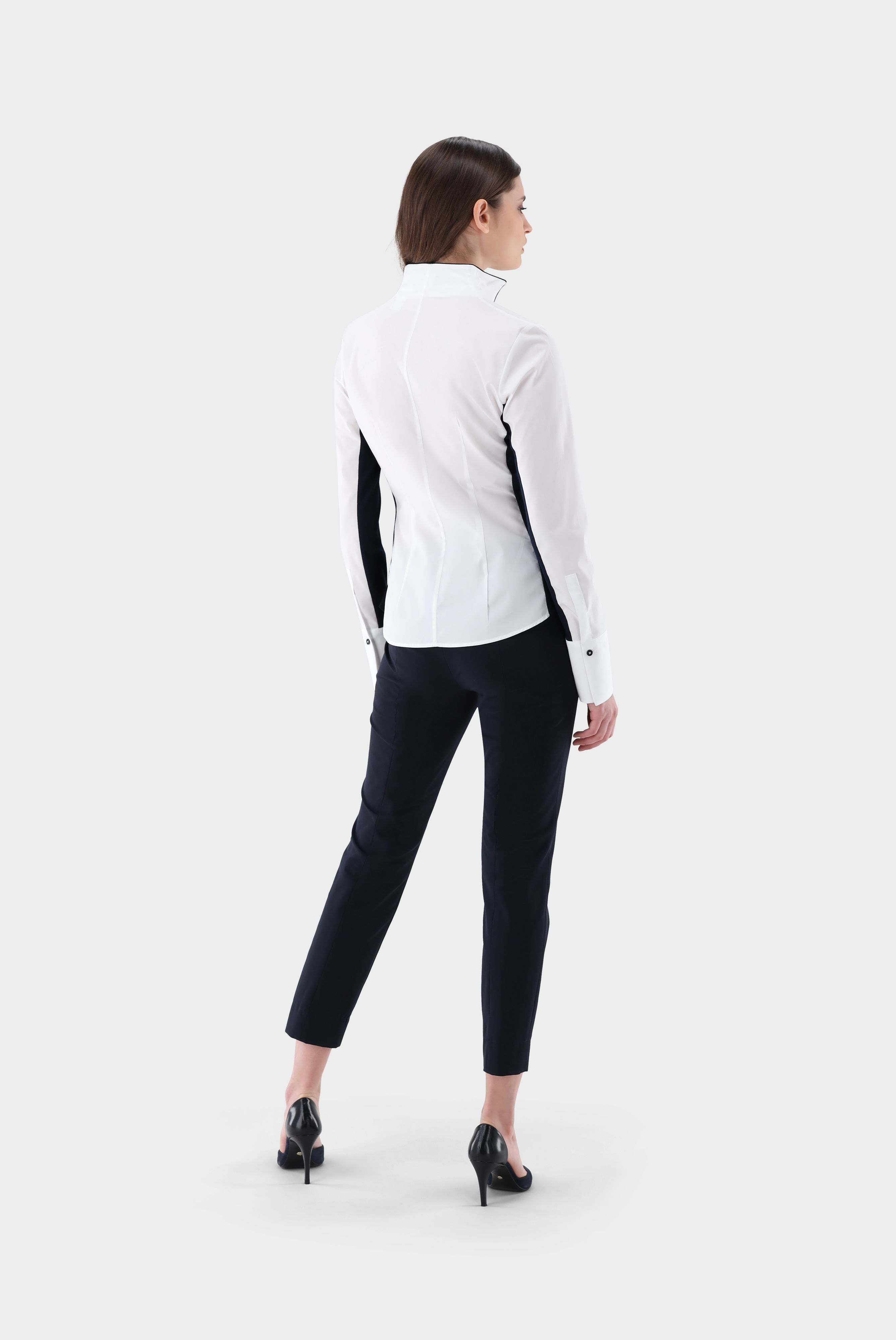 Look aus Hybrid-Kelchkragenbluse mit Jerseyeinsatz