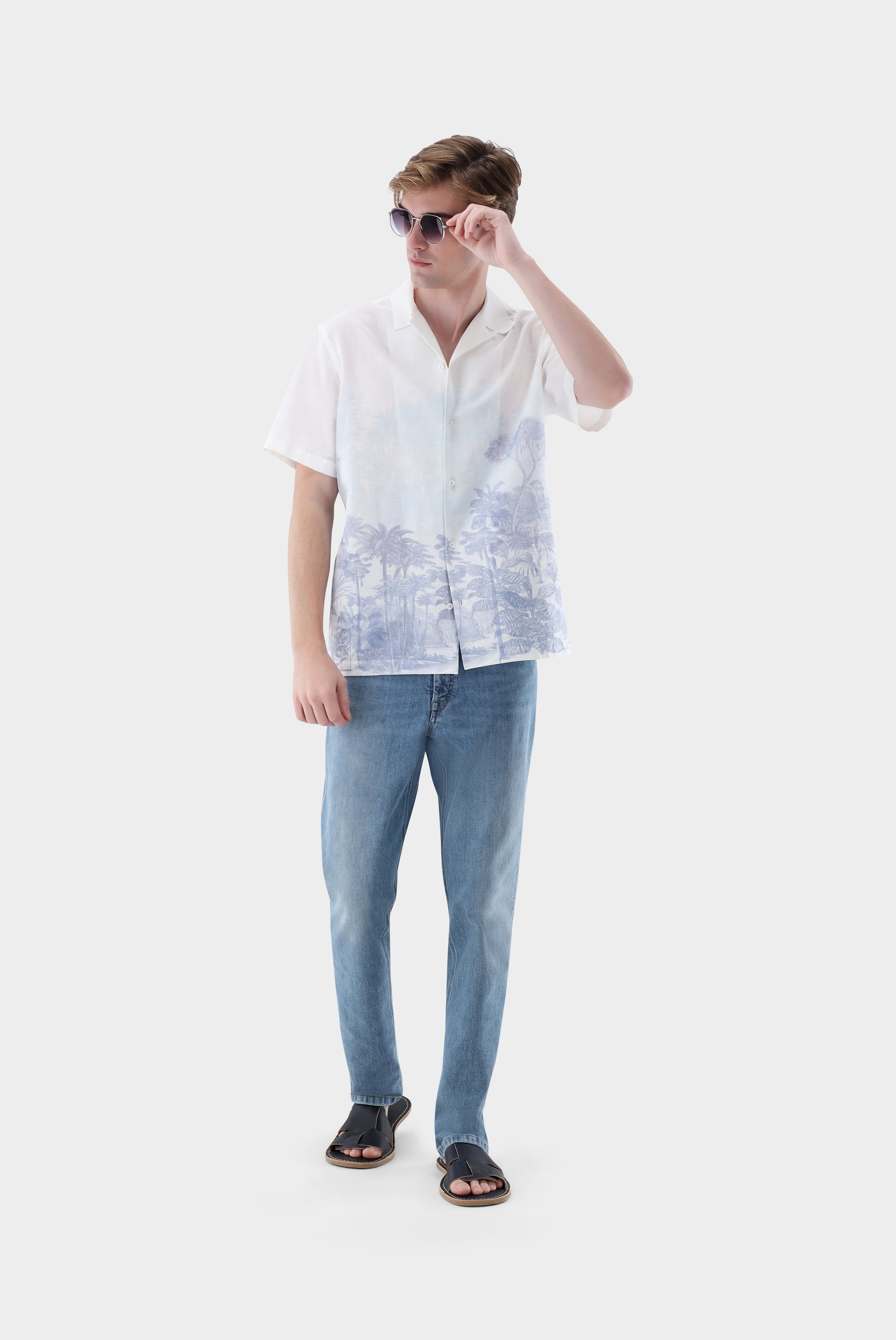 Dieses Bowlingshirt in Loose Fit überzeugt durch seine lässige Silhouette und sommerliche Leichtigkeit. Der platzierte Tropical-Forest-Print setzt einen ausdrucksstarken, modischen Akzent. Gefertigt aus weichem Leinen bietet das Modell ein angenehm luftiges Tragegefühl. Kurze Ärmel und ein Reverskragen unterstreichen den entspannten Stil, während edle Perlmuttknöpfe die hochwertige Verarbeitung betonen. Ideal für stilvolle Casual-Looks mit exotischem, modernem Charakter.