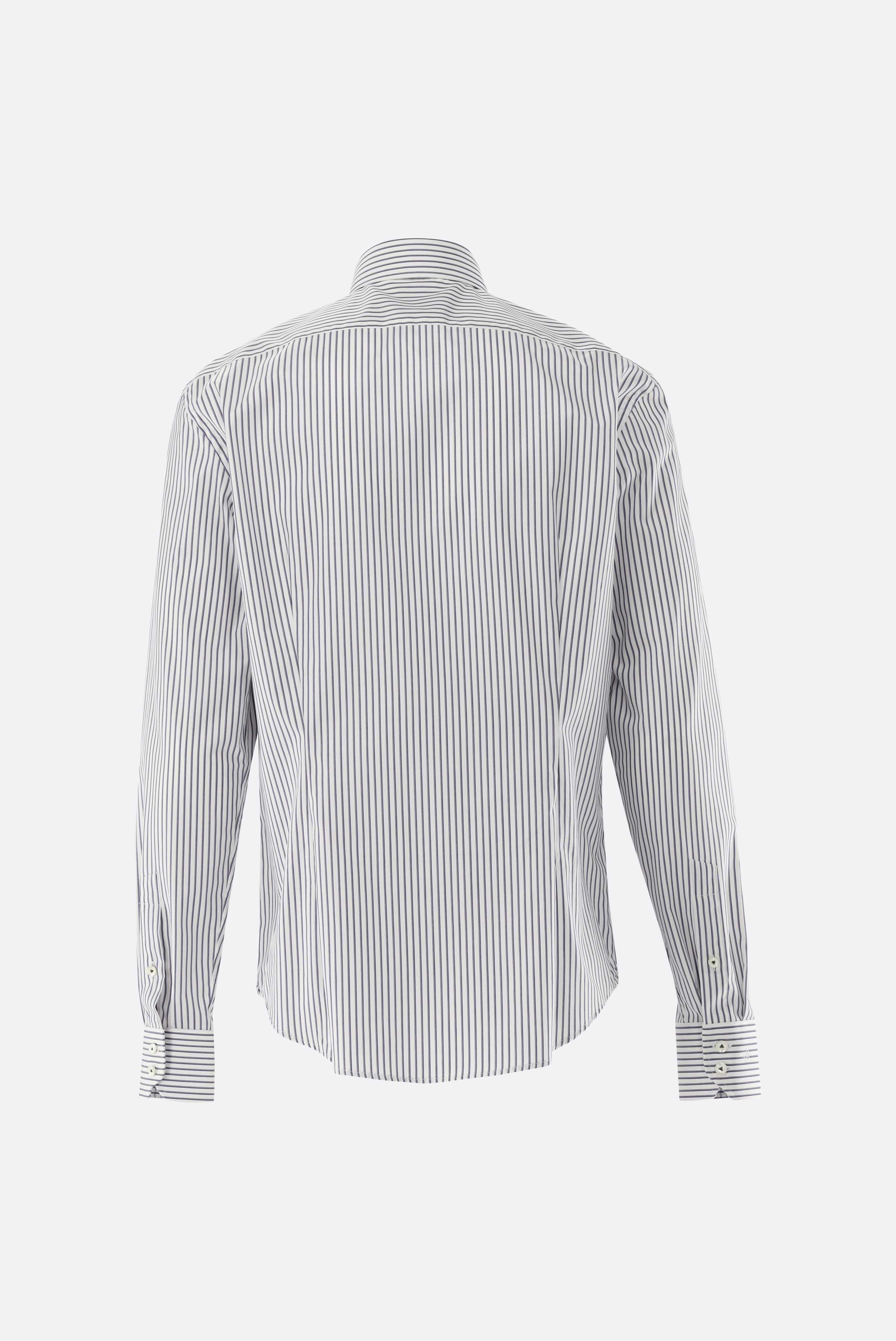 Dieses Businesshemd aus fein gestreiftem Baumwoll-Twill im Tailor Fit bietet eine elegante, körpernahe Passform. Ein Haifischkragen und edle Perlmuttknöpfe unterstreichen den hochwertigen Look, während tonale Karokontraste dezente Akzente setzen. Der Stoff ist Teil der Perfect-Look-Kollektion und überzeugt durch seine knitterarme Qualität: Durch Körperwärme glättet er sich zusätzlich und bleibt nahezu knitterfrei. Ideal für einen souveränen, gepflegten Business-Auftritt.