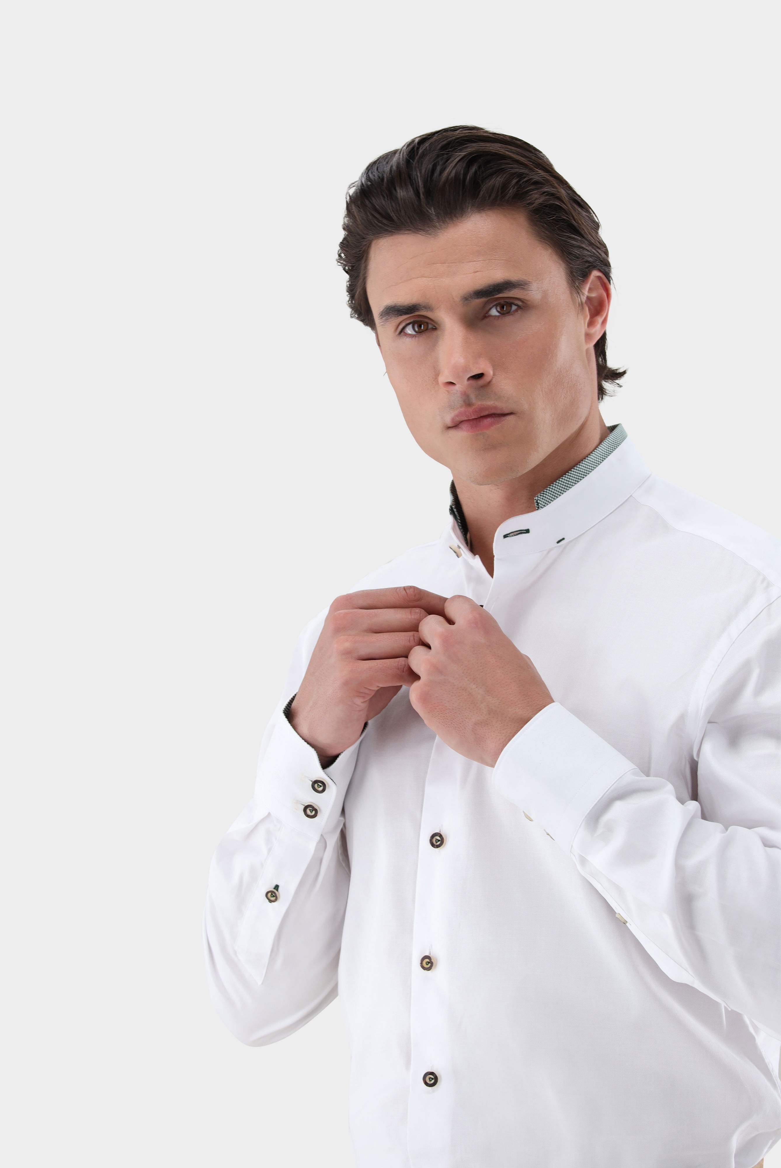 Das weiße Trachtenhemd mit karierter Paspelierung an der Innenseite des Stehkragens ist die luxuriöse Wahl für Ihr Outfit. Hergestellt aus hochwertigem und weichem Oxford zählt es zu den edelsten Trachtenhemden auf dem Markt. Der traditionelle Stehkragen und die echten Hornknöpfe vervollständigen den traditionellen und doch edlen Look. Kombiniert mit Lederhose, Janker und Trachtenweste kommt dieses Hemd richtig zur Geltung.
