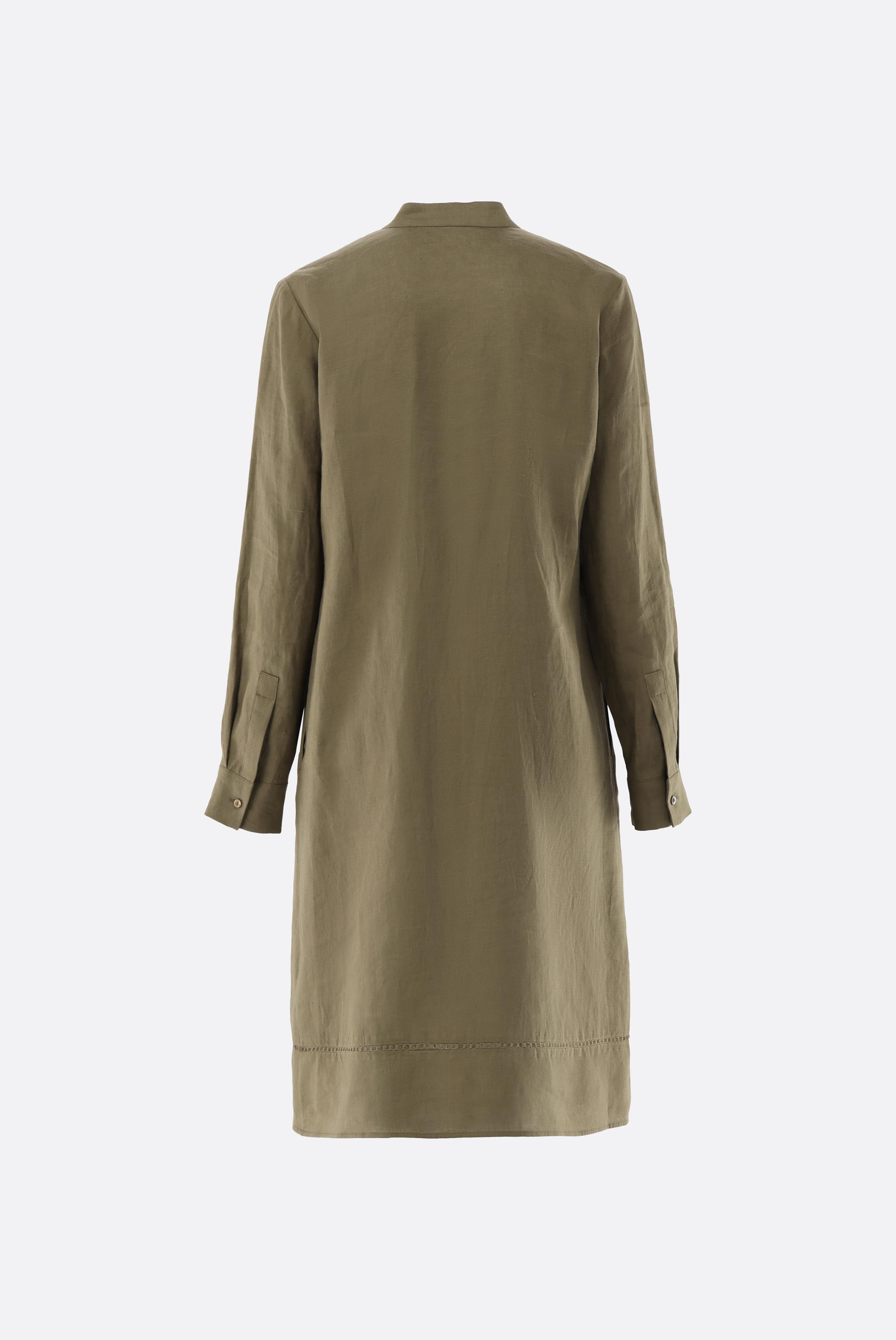 Dieses leicht taillierte Schlupfkleid in Knielänge verbindet klare Linien mit feinen Details. Der Stehkragen und die lange Ärmel sorgen für eine elegante Silhouette, während das plissierte Latz-Detail dem Design Struktur verleiht. Eine zarte Lochstickerei akzentuiert den Saum dezent. Praktische Seitentaschen erhöhen den Tragekomfort. Gefertigt aus weichem Leinen bietet das Kleid Atmungsaktivität, angenehmen Fall und eine natürliche, hochwertige Optik für vielseitige Alltags- und Sommerlooks.