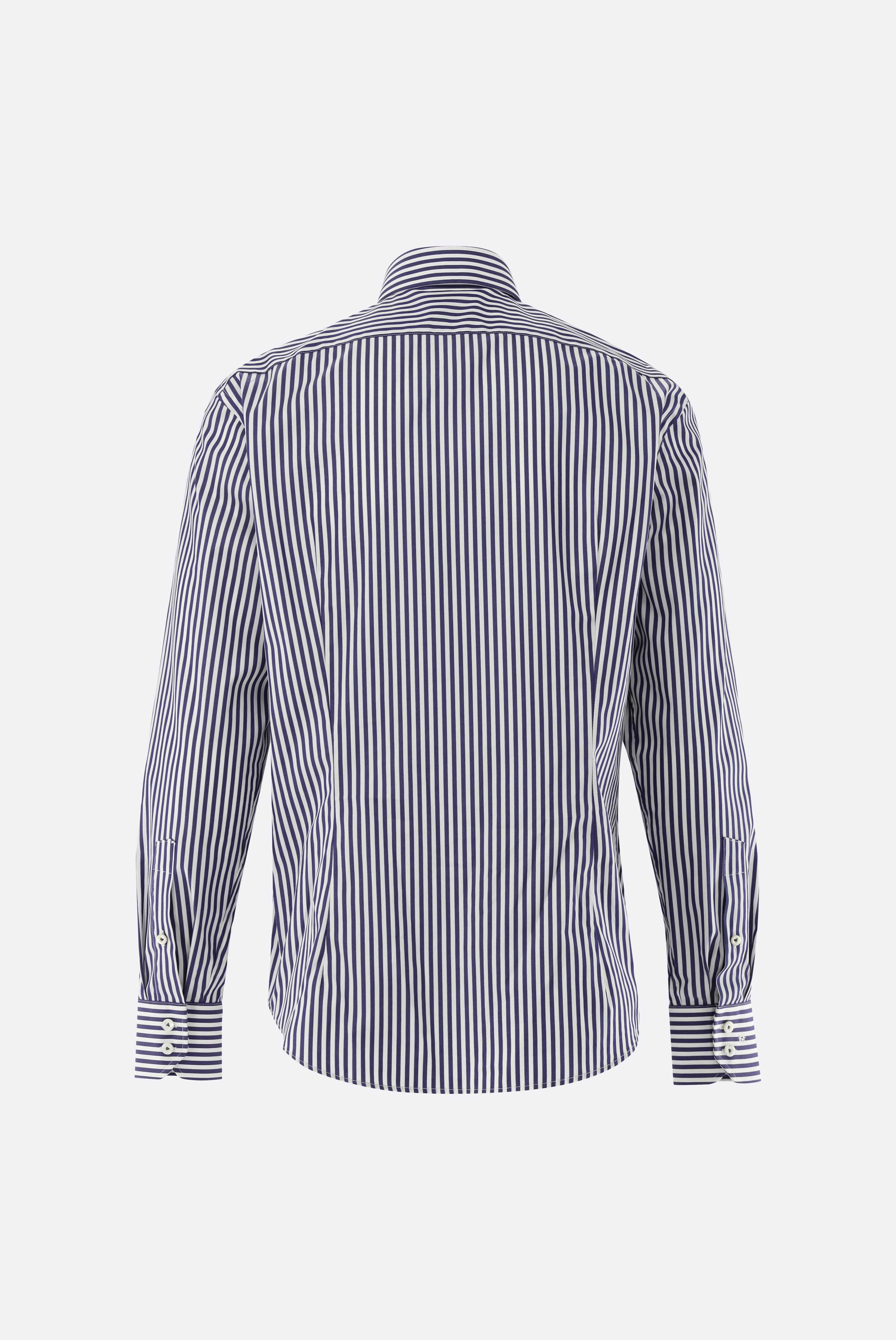 Dieses Tailor-Fit-Hemd aus luxuriösem gestreiftem Popeline überzeugt durch seine elegante, körpernahe Silhouette. Der Haifischkragen verleiht dem Modell eine moderne, edle Note, während hochwertige Perlmuttknöpfe stilvolle Akzente setzen. Das feine, glatte Popeline-Material bietet angenehmen Tragekomfort, Formstabilität und ein gepflegtes Erscheinungsbild. Vielseitig kombinierbar, eignet sich das Hemd ideal für Business- und Smart-Casual-Looks mit frischem, hochwertigem Stil.