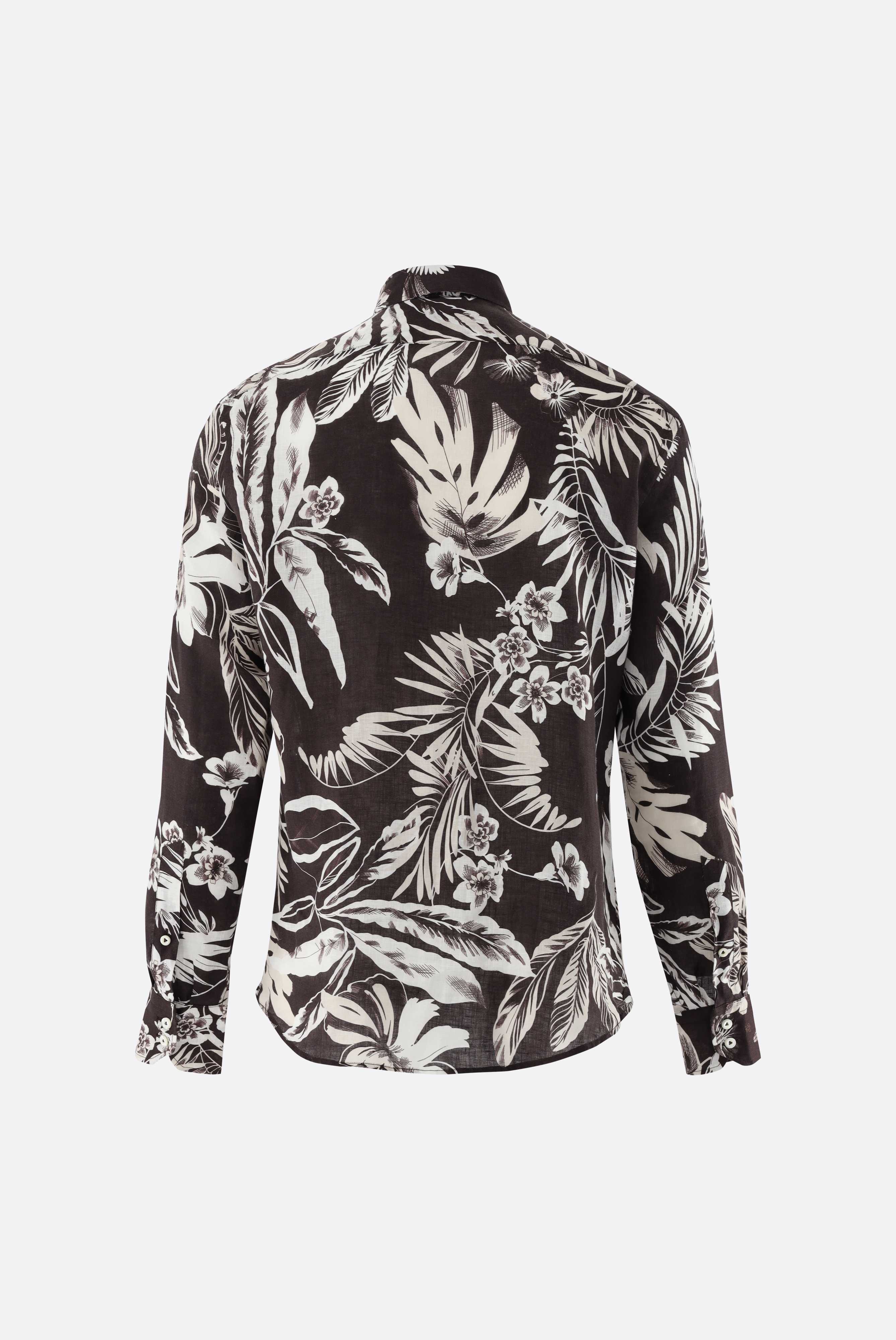 Dieses Tailor-Fit-Hemd aus leichtem Leinen überzeugt durch eine sommerliche Palmen-Optik und edle Verarbeitung. Der Stoff ist ohne Abnäher gearbeitet und sorgt so für klare Linien, während markante Nähte mit dickerem Garn dem Modell eine hochwertige, handwerkliche Note verleihen. Edle Perlmuttknöpfe setzen stilvolle Akzente. Das luftige Material bietet angenehmen Tragekomfort und macht das Hemd ideal für stilvolle Casual- und sommerliche Smart-Casual-Looks.