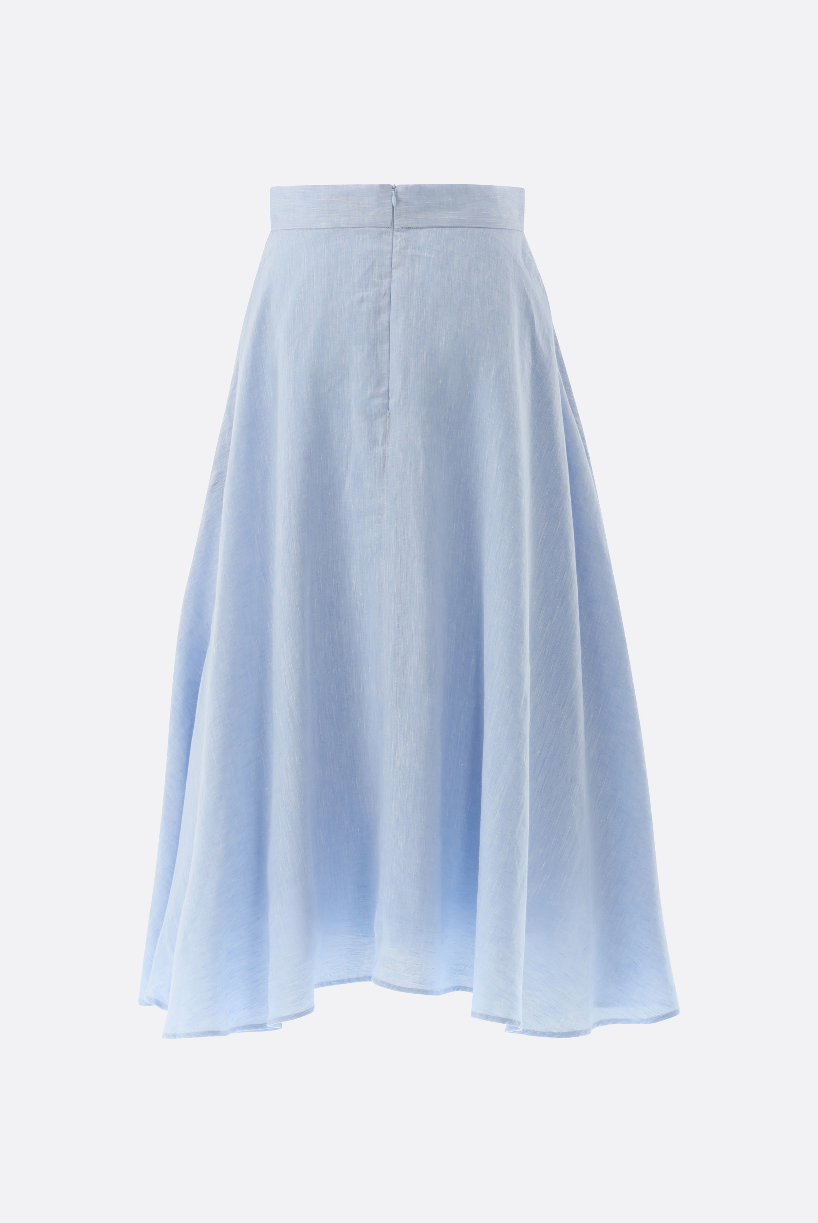 Dieser ausgestellte Midirock überzeugt durch seine feminine Silhouette und natürliche Leichtigkeit. Praktische Eingrifftaschen vorne sowie ein Reißverschluss im Rücken sorgen für Funktionalität und angenehmen Sitz. Gefertigt aus einfarbig gefärbtem Leinen bietet der Rock eine luftige, atmungsaktive Qualität und hohen Tragekomfort. Vielseitig kombinierbar, eignet er sich ideal für sommerliche Casual- und stilvolle Alltags-Looks mit entspannter, eleganter Ausstrahlung.