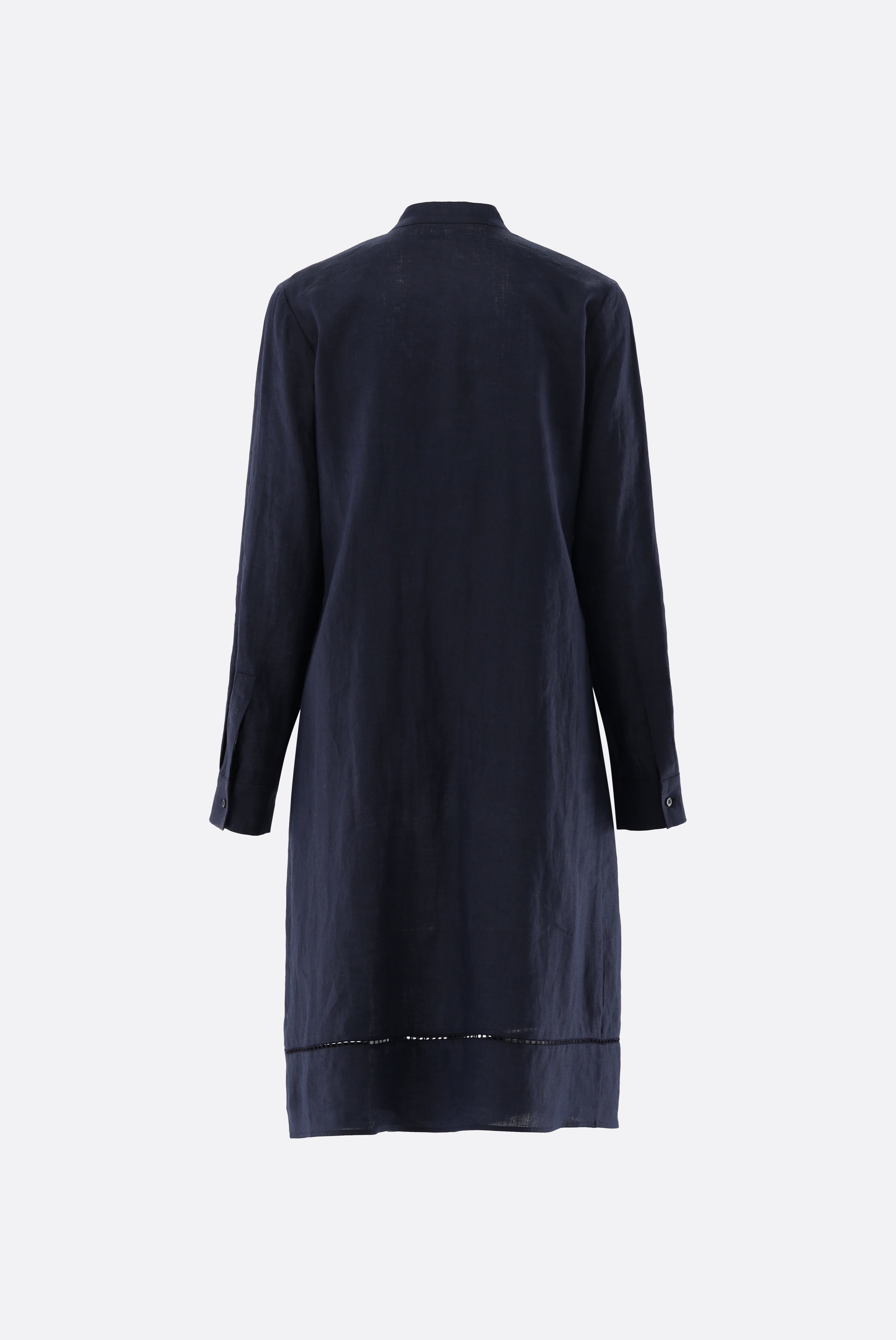 Dieses leicht taillierte Midikleid verbindet klare Linien mit feinen Details. Der Stehkragen und die lange Ärmel sorgen für eine elegante Silhouette, während das plissierte Latz-Detail dem Design Struktur verleiht. Eine zarte Lochstickerei akzentuiert den Saum dezent. Praktische Seitentaschen erhöhen den Tragekomfort. Gefertigt aus weichem Leinen bietet das Kleid Atmungsaktivität, angenehmen Fall und eine natürliche, hochwertige Optik für vielseitige Alltags- und Sommerlooks.
