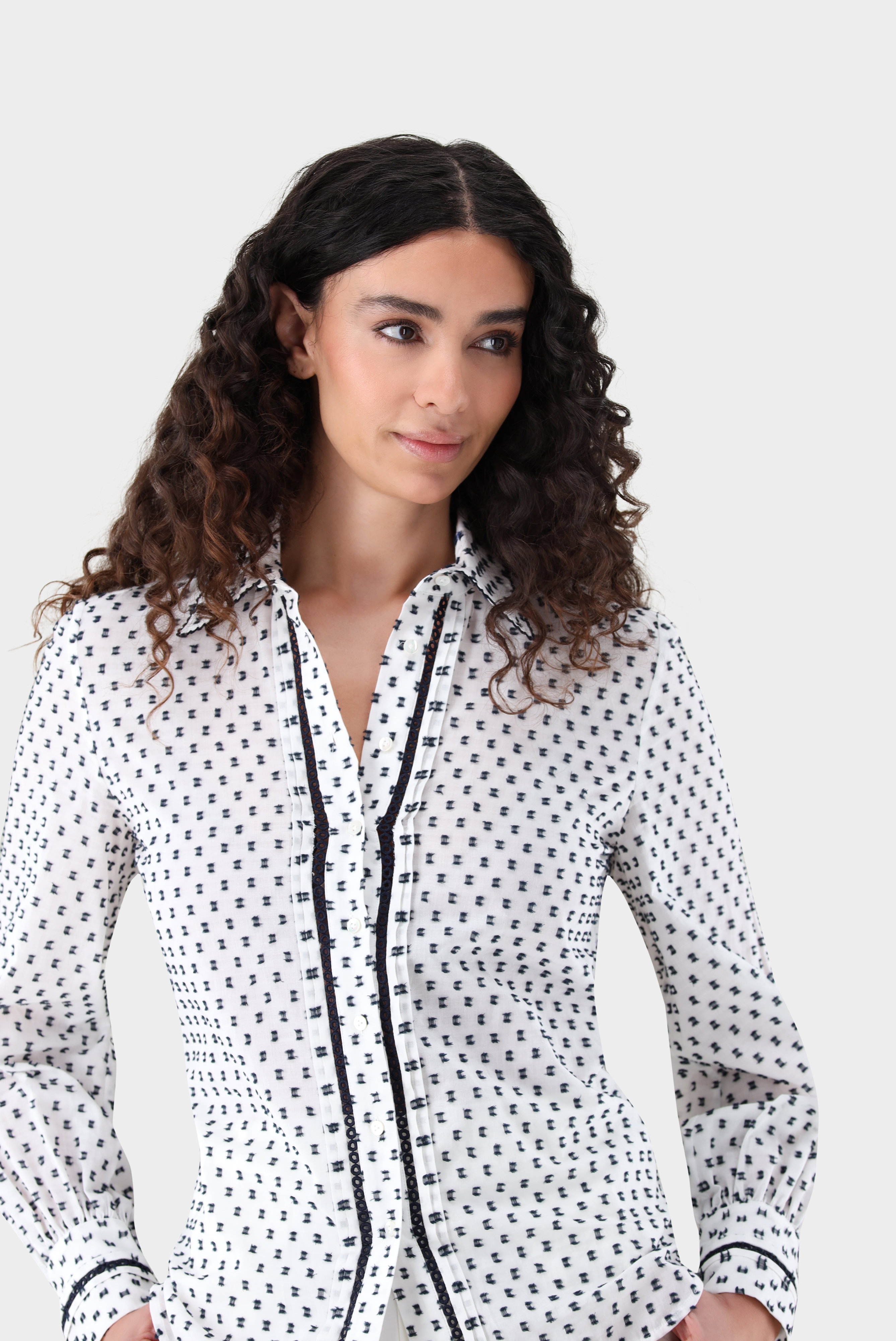 Diese leicht taillierte Hemdbluse überzeugt durch feminine Details und hochwertige Verarbeitung. Lange Ärmel mit gerafften Manschetten, feine Spitzeneinsätze und dezente Faltenverzierungen verleihen dem Modell Struktur und Eleganz. Gefertigt aus weichem Baumwollbatist mit kontrastierendem Plumetis bietet die Bluse ein angenehmes Tragegefühl und eine edle Optik. Ideal für stilvolle Business- und Casual-Looks sowie besondere Anlässe, bei denen ein moderner, femininer Auftritt gewünscht ist.