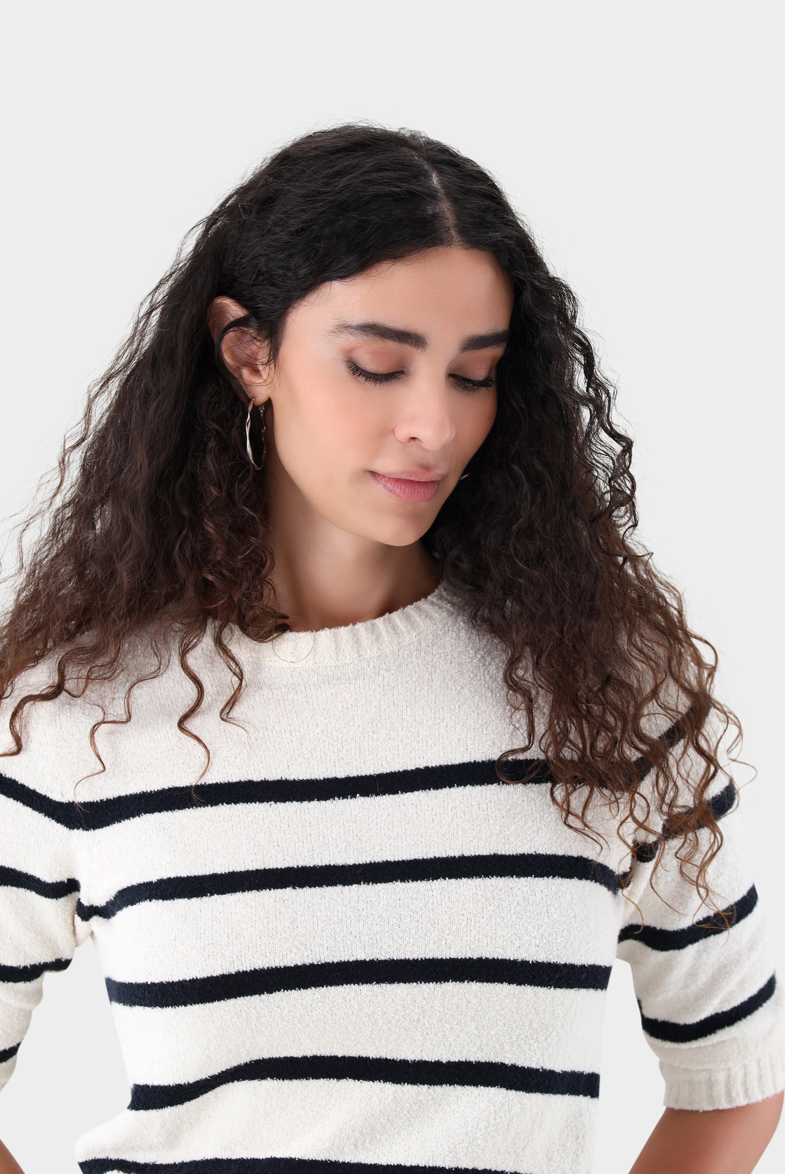 Dieser gerade geschnittene Pullover überzeugt mit modernem Streifen-Design und strukturierter Optik. Der klassische Rundhalsausschnitt und die 3/4-Ärmel verleihen dem Modell eine zeitlose, vielseitig kombinierbare Silhouette. Die hochwertige Bouclé-Strickqualität sorgt für eine besondere Haptik und einen angenehmen Tragekomfort. Ideal für stilvolle Casual-Looks mit modischem Anspruch und dezenter Struktur.