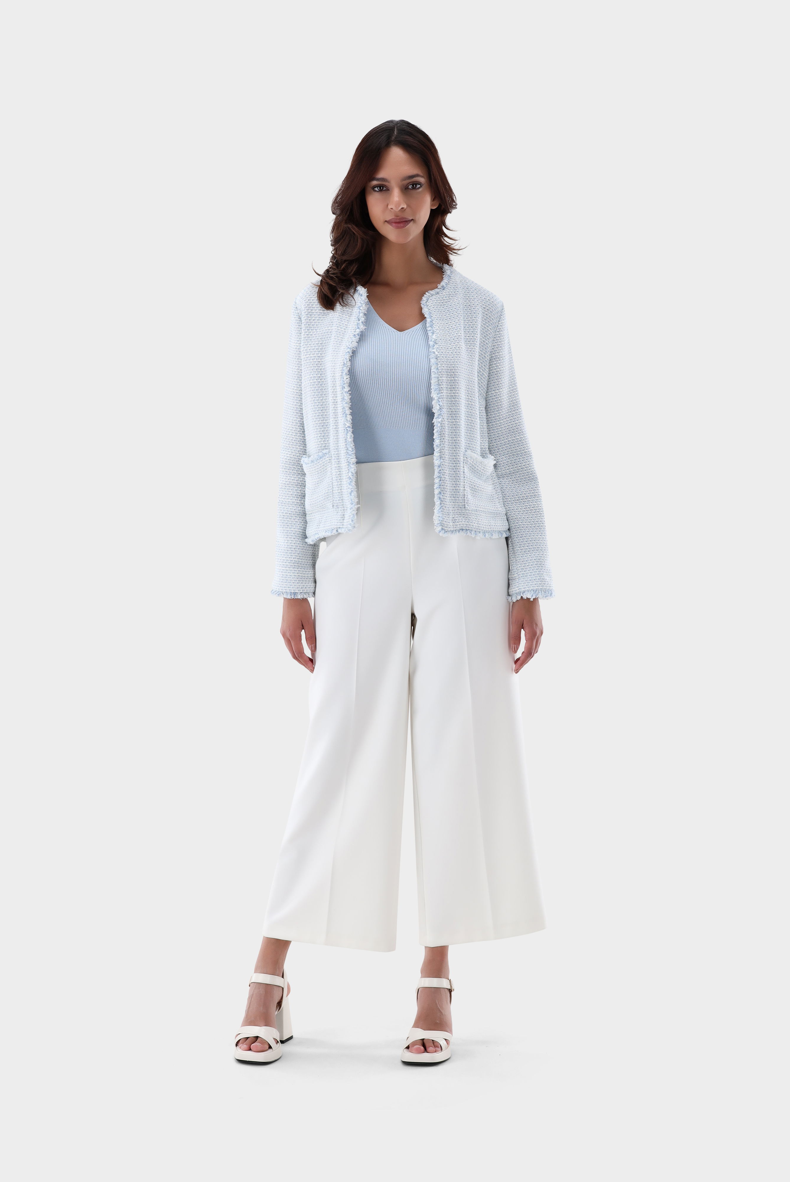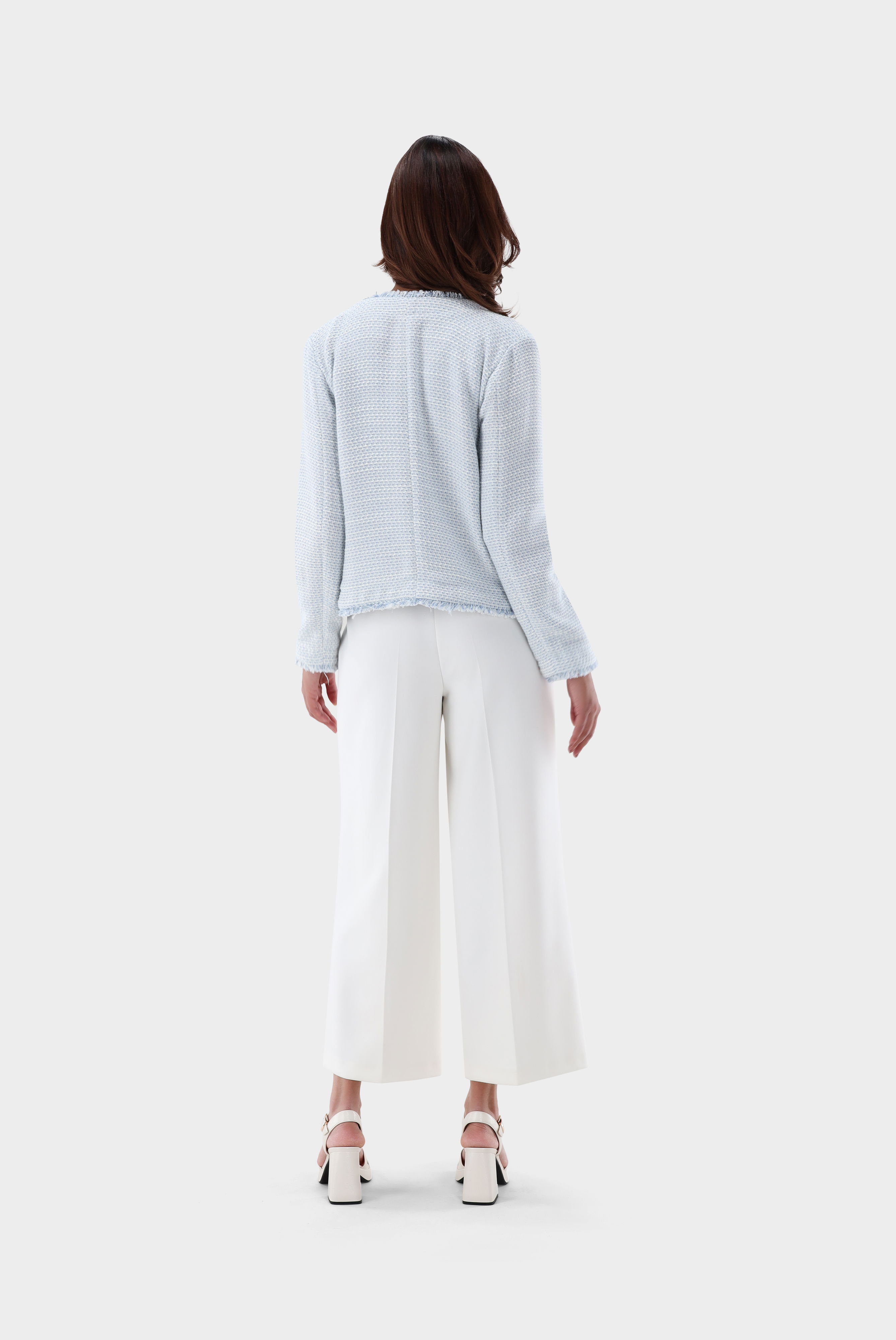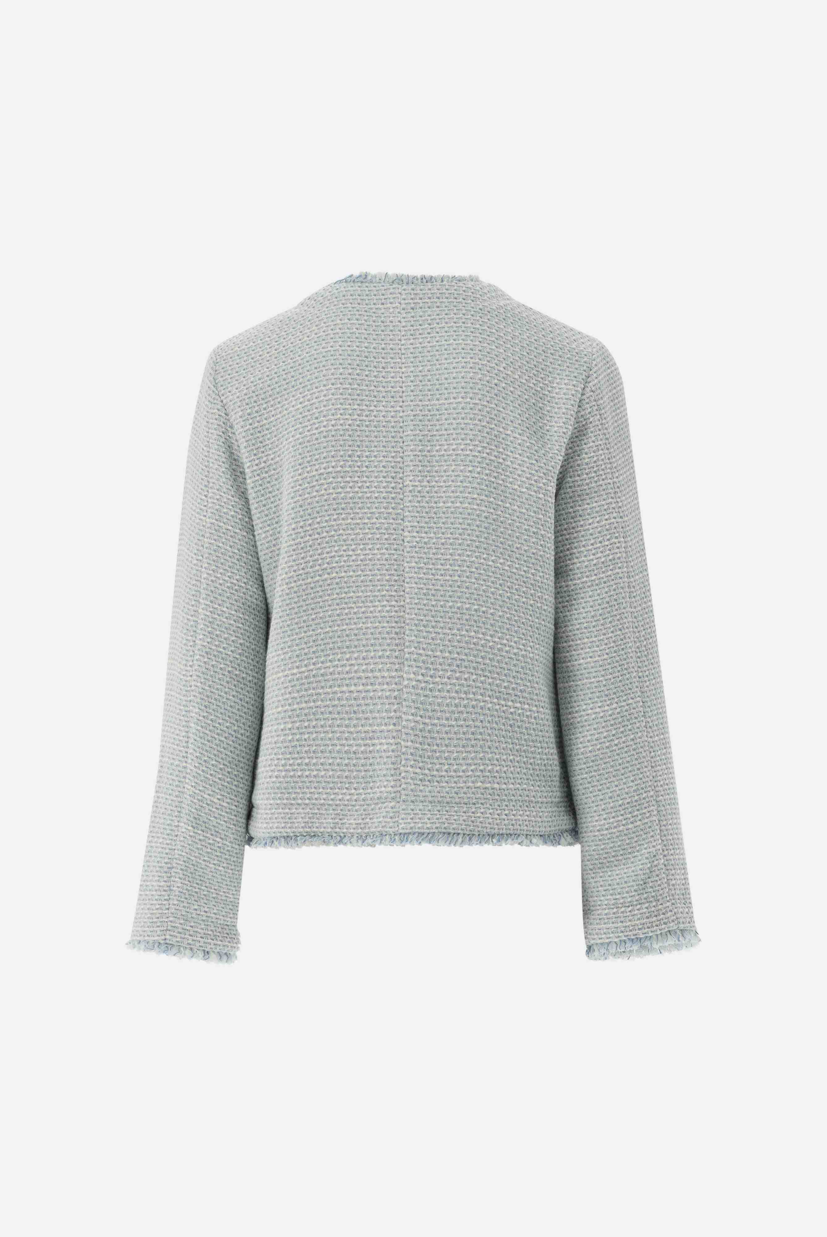 Die gecroppte kragenlose Boucle Jacke verfügt über lange Ärmel, Fransenkanten und besteht aus einem Baumwoll-Polyester Mischgewebe mit besonderer Oberfläche, die aus kleinen Schlingen und Schleifen besteht. Sie wird besonders durch die Mehrfarbigkeit der Garne betont. Diese Jacke vereint Stil und Komfort mit ihrem einzigartigen Design und der Stoffzusammensetzung.