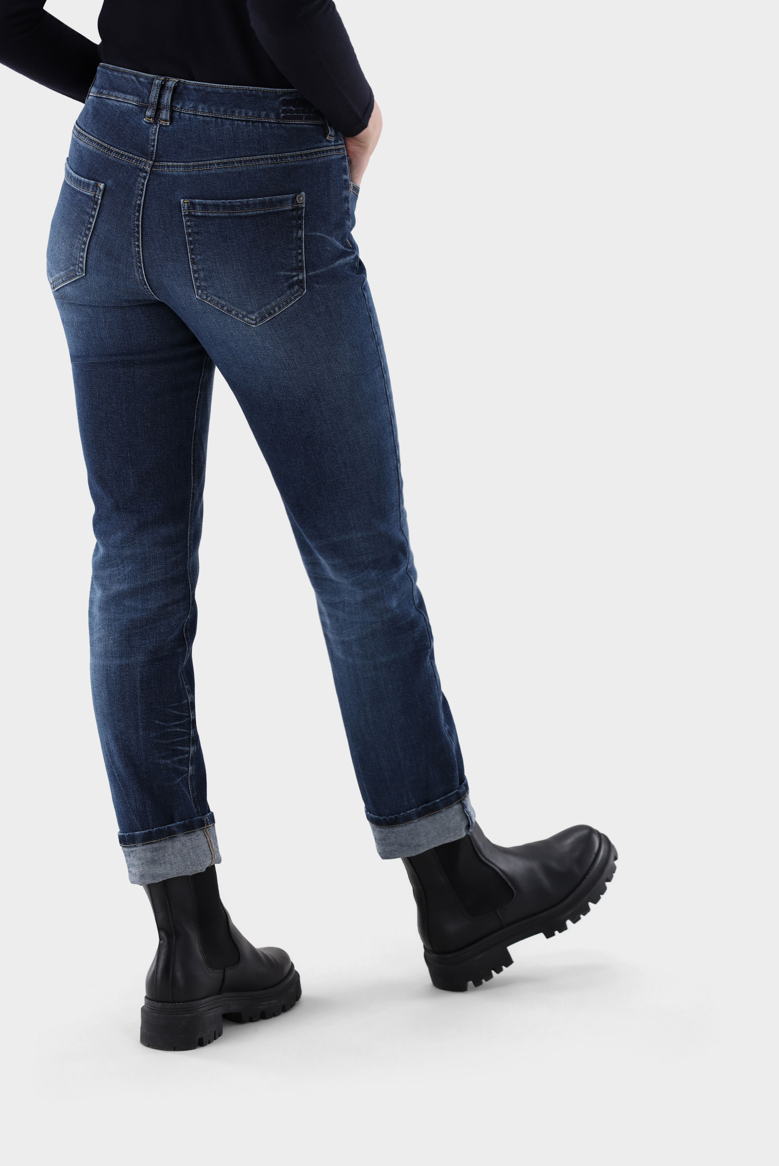 Unsere Five-Pocket-Jeans mit geradem Bein und mittelhoher Taille kombinieren Komfort und Stil. Sie verfügen über einen Frontreißverschluss und Knopfverschluss, Gürtelschlaufen an der Taille sowie einen umgeschlagenen Saum. Aus einfachem Baumwoll-Lyocell-Stretch-Denim gefertigt, sind diese Casual Jeans vielseitig und perfekt für den Alltag geeignet.