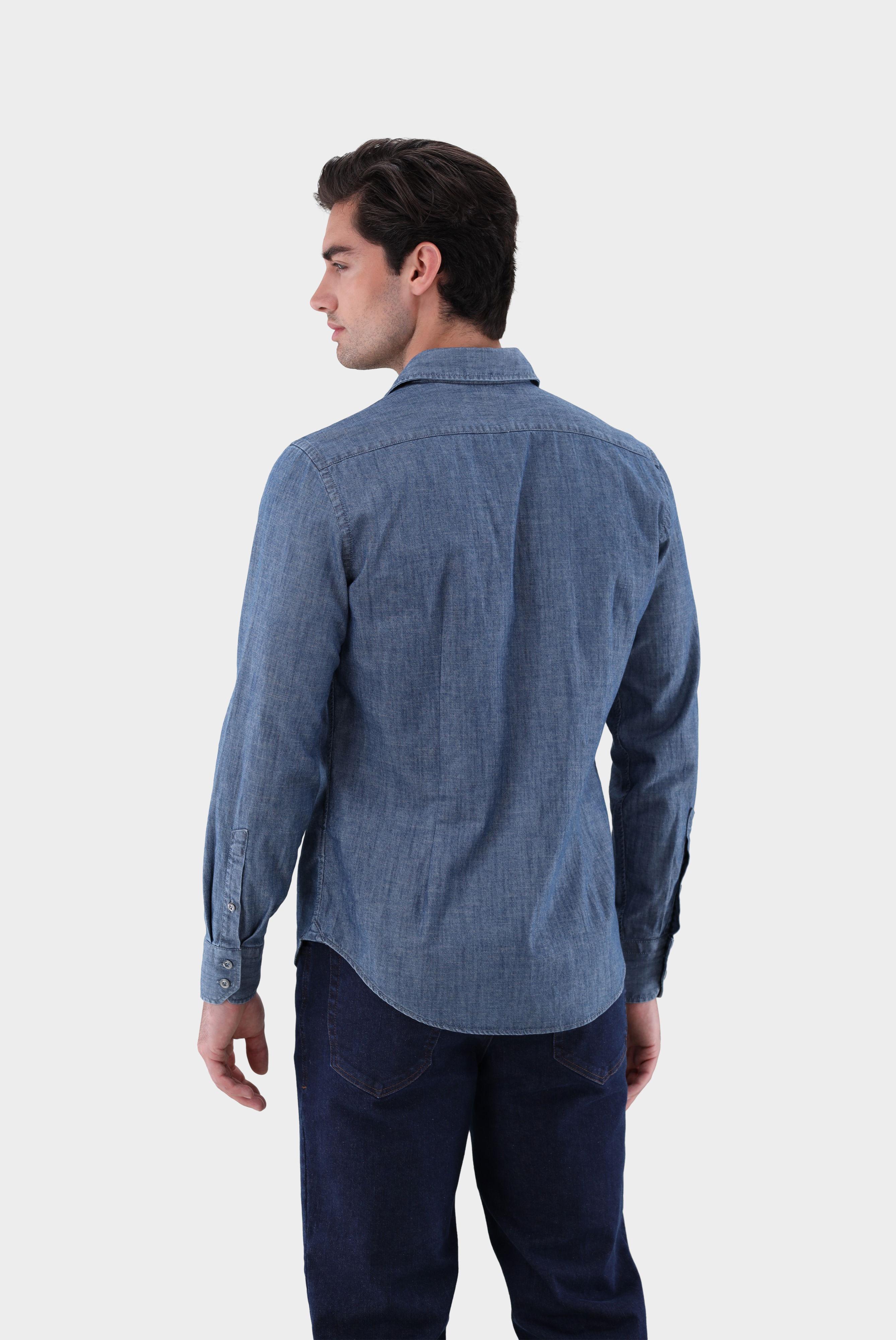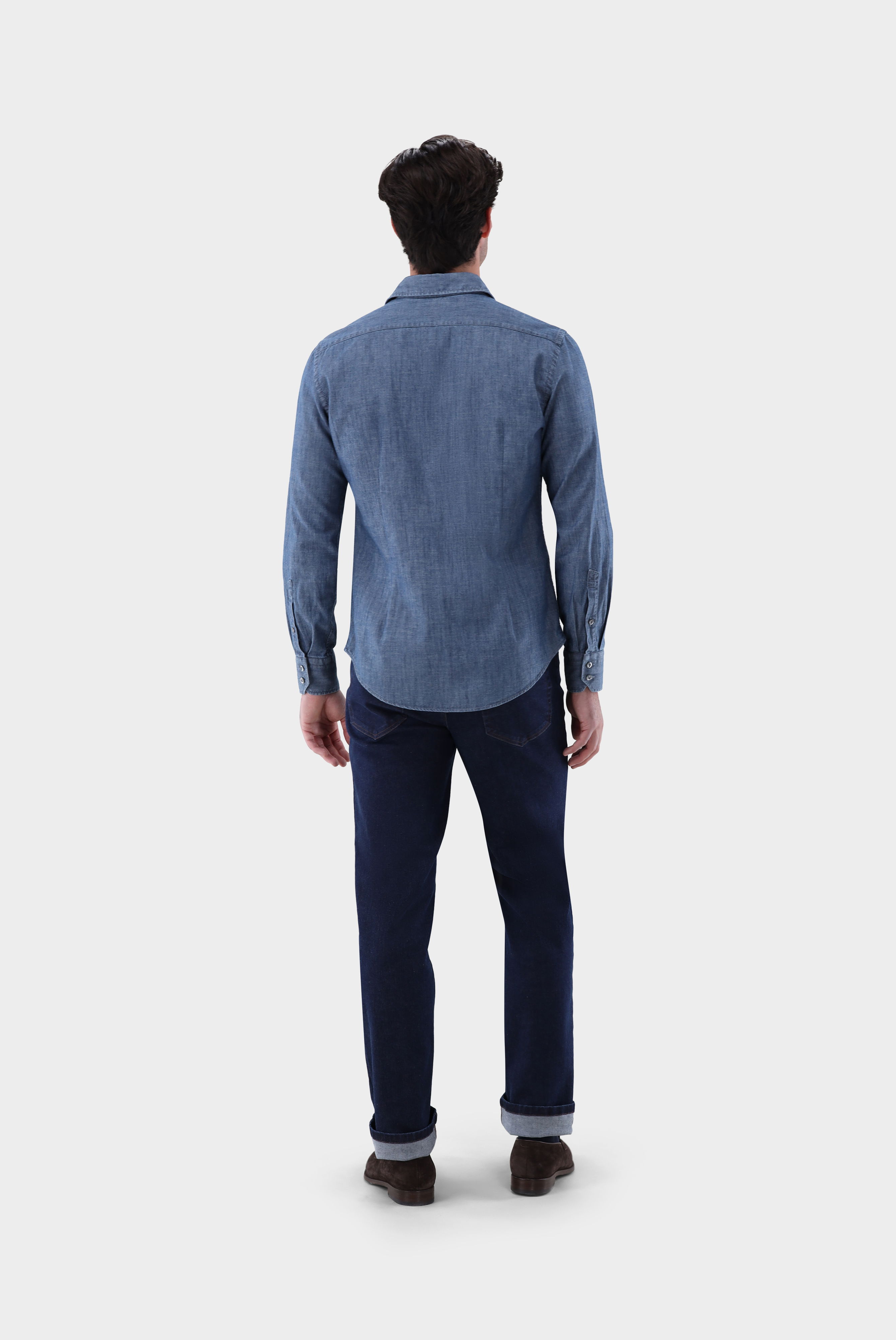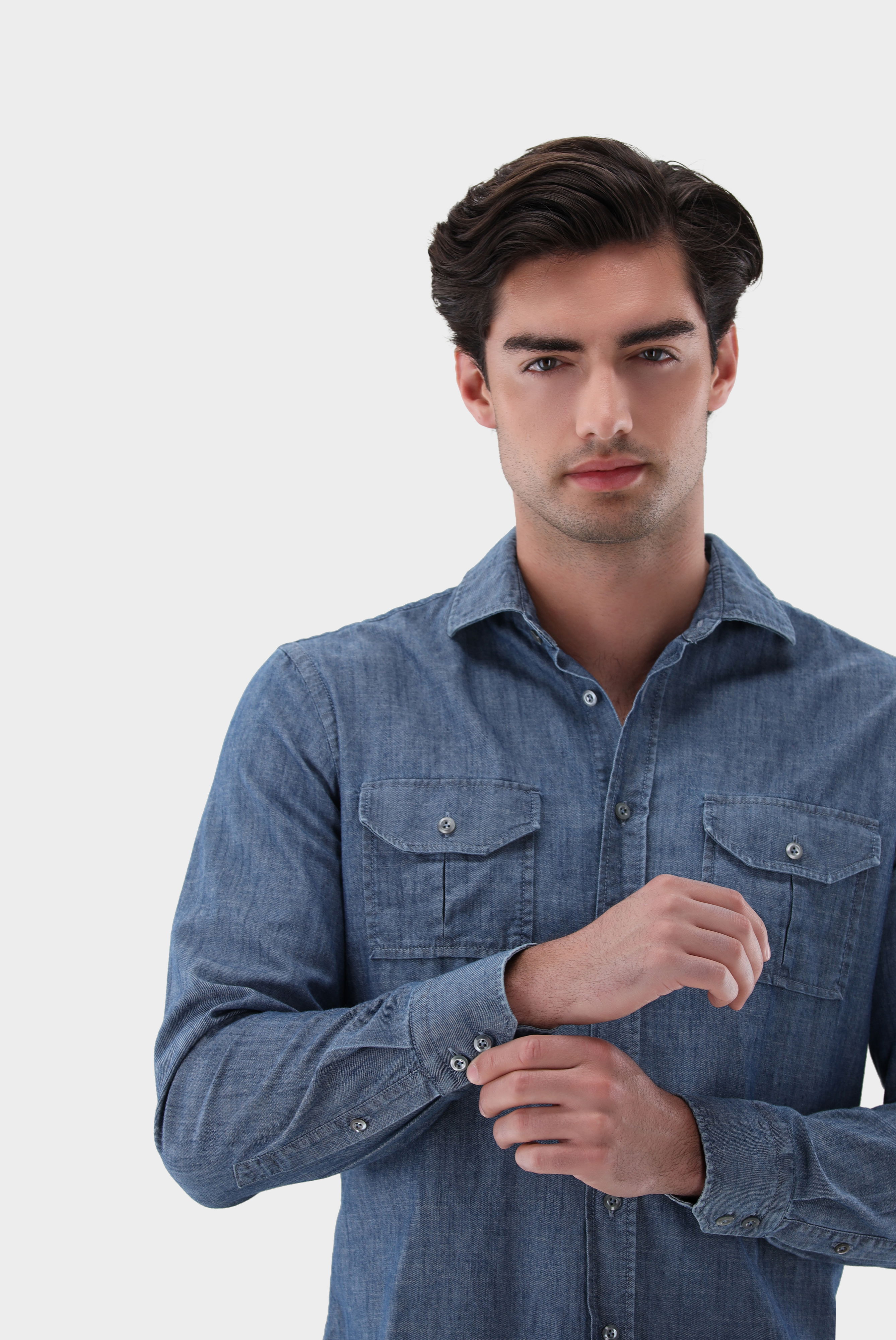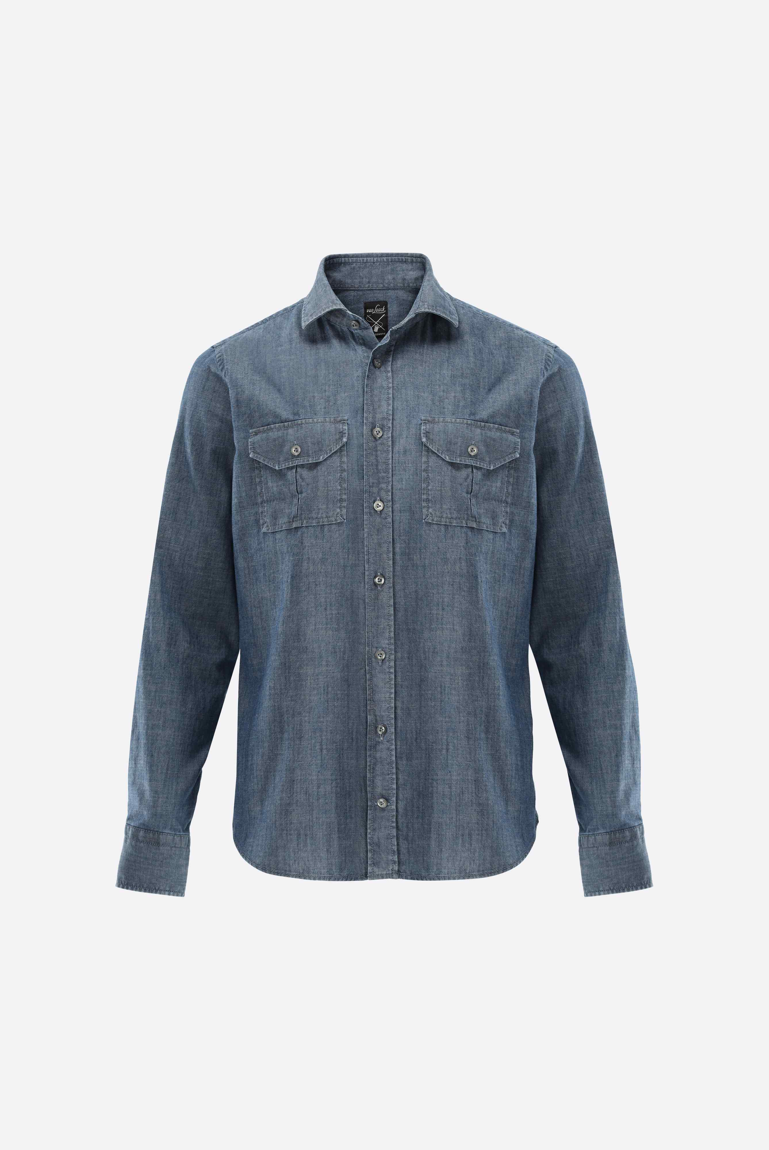 Gewaschenes Jeanshemd mit mittlerem Haifischkragen für einen modernen, entspannten Look. Die Ausführung ohne Abnäher sorgt für eine gerade Passform, während eine aufgesetzte Knopfleiste und praktische Brusttaschen funktionale Details bieten. Hochwertige Perlmuttknöpfe setzen dezente, edle Akzente. Vielseitig kombinierbar, eignet sich das Hemd ideal für legere Freizeitoutfits oder als stilvolle Ergänzung zu smart-casual Looks.