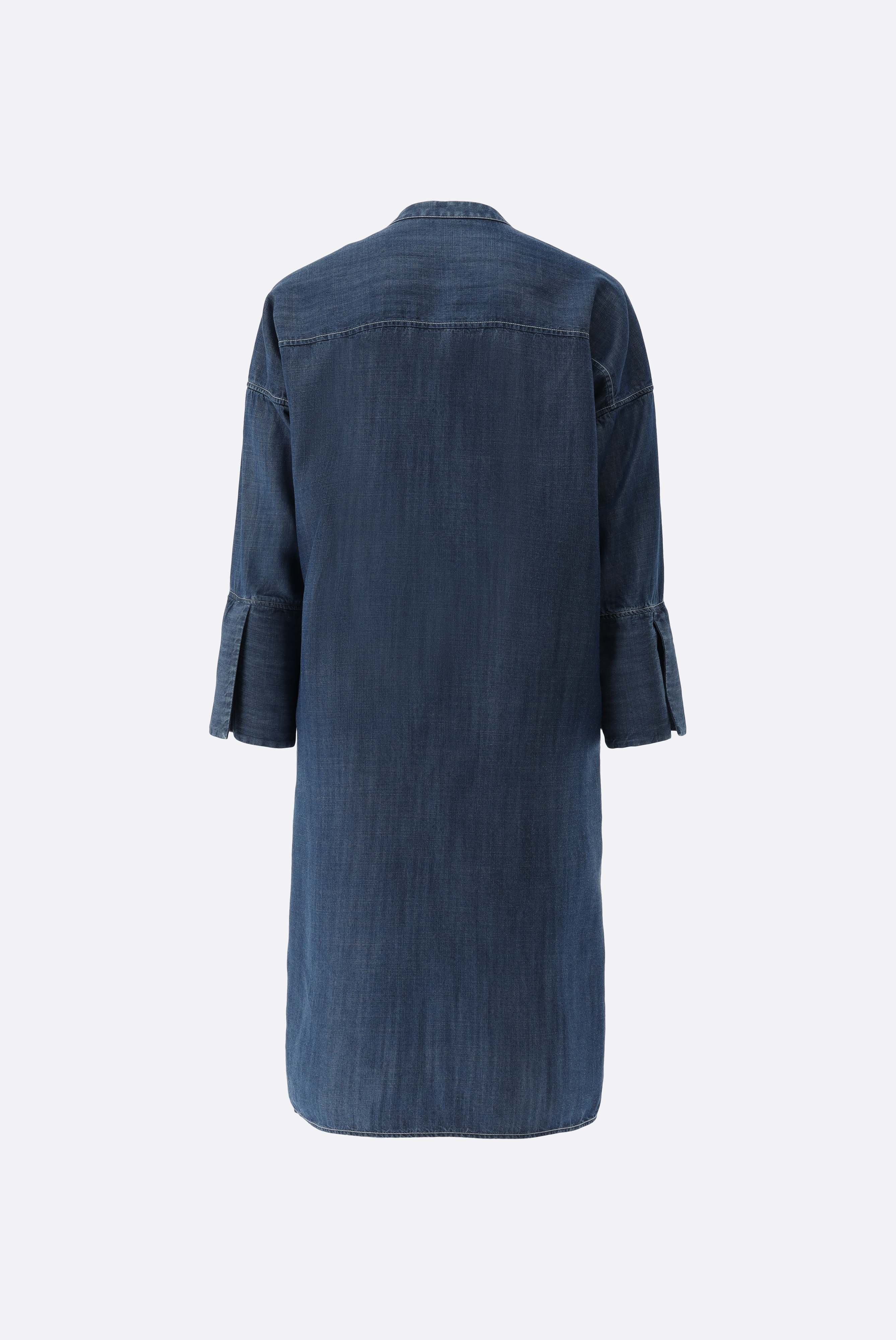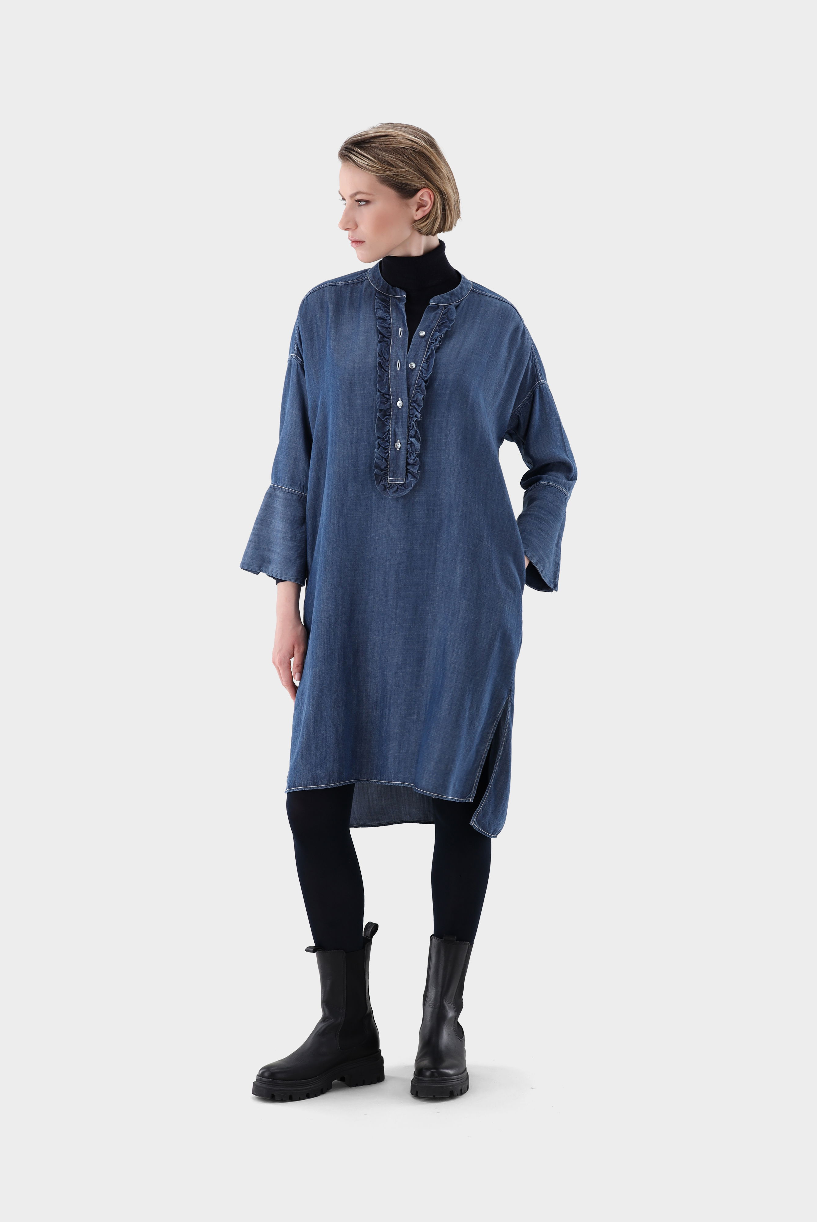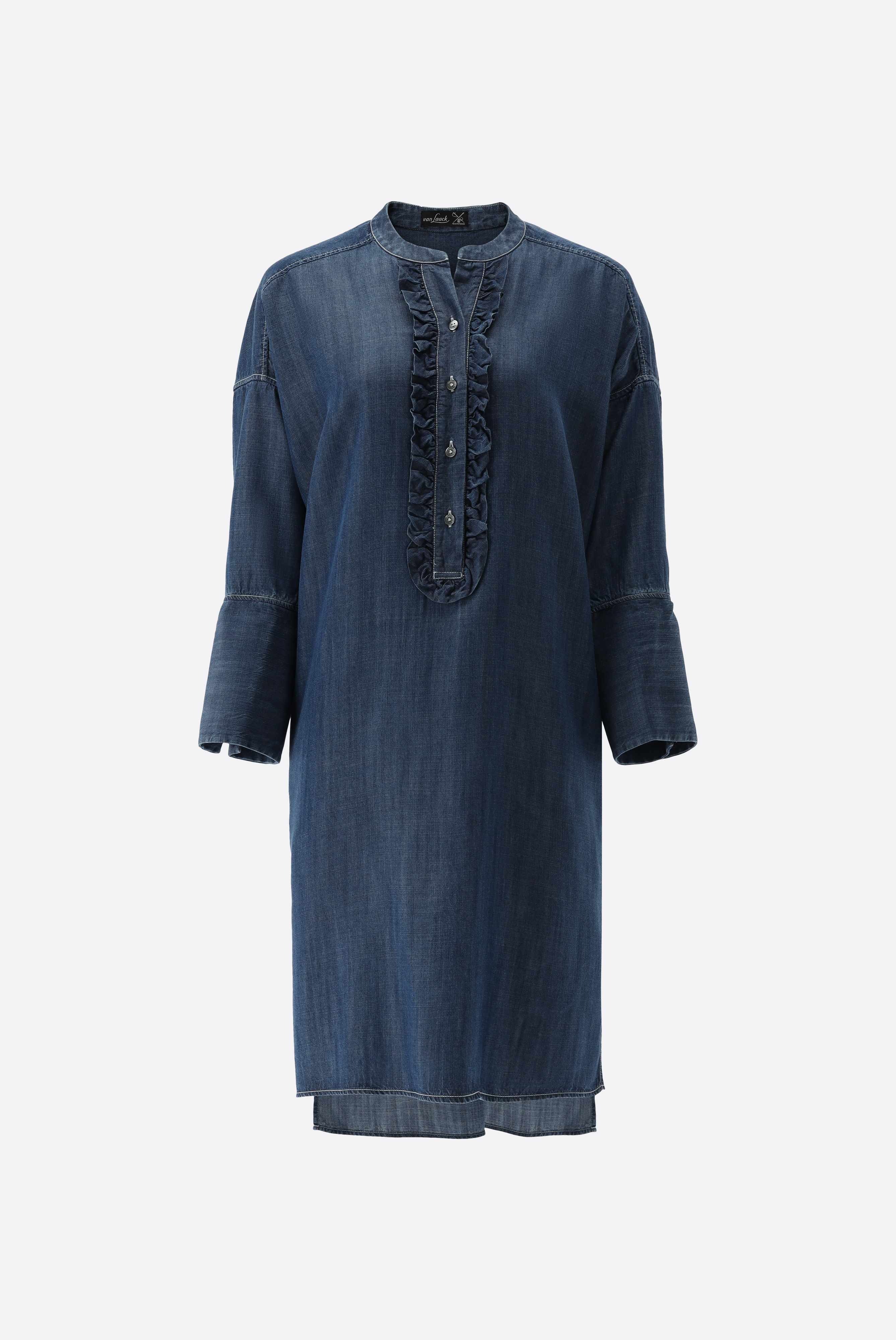 Gerade geschnittenes Schlupfkleid mit überschnittenen Schultern, Tunikaausschnitt mit Rüschen an der Knopfleiste und 3/4 langen Ärmeln mit Schlitzen. Gefertigt aus Lyocell in Denimoptik mit besonderer Waschoptik an Säumen und Nähten. Dieses Kleid wurde garmentgewaschen für spezielle Wascheffekte an Nähten, Kanten und Säumen. Ideal für lässige Anlässe.