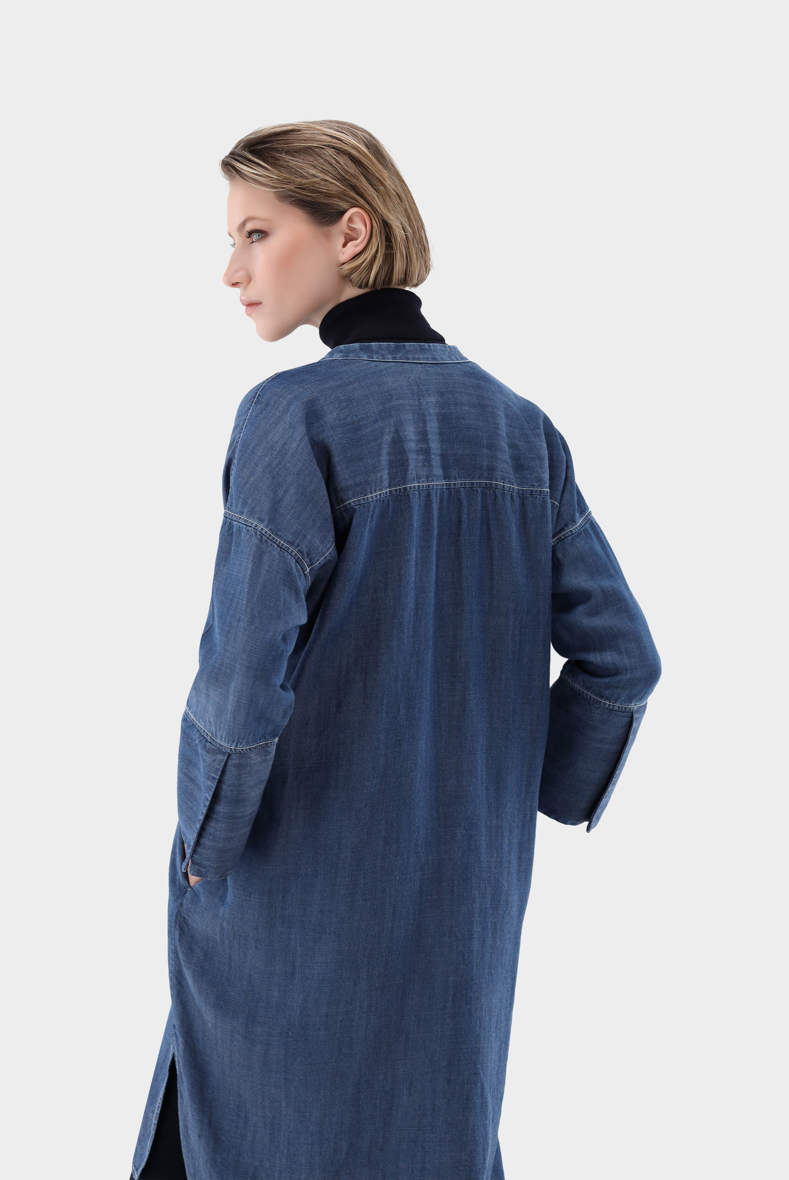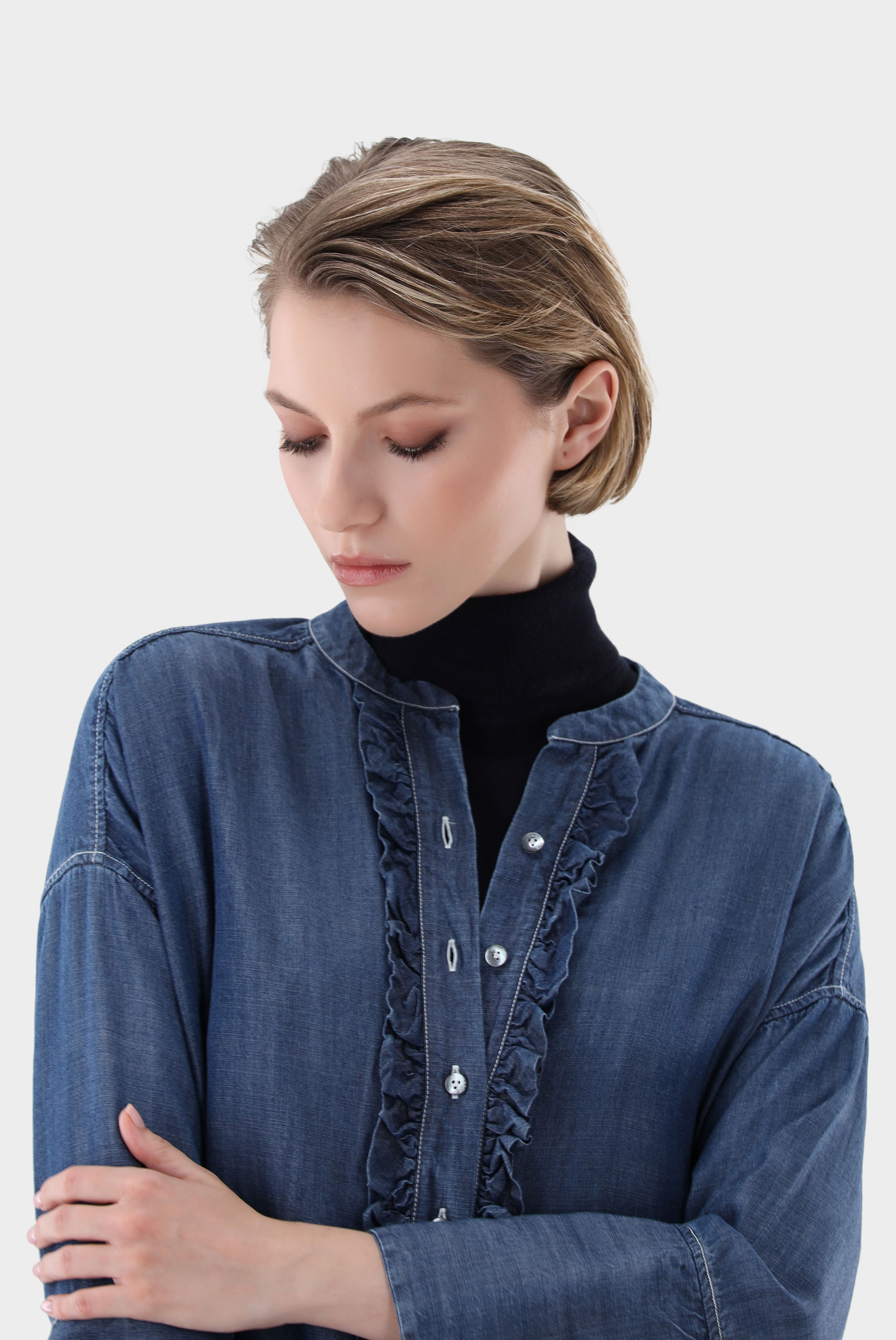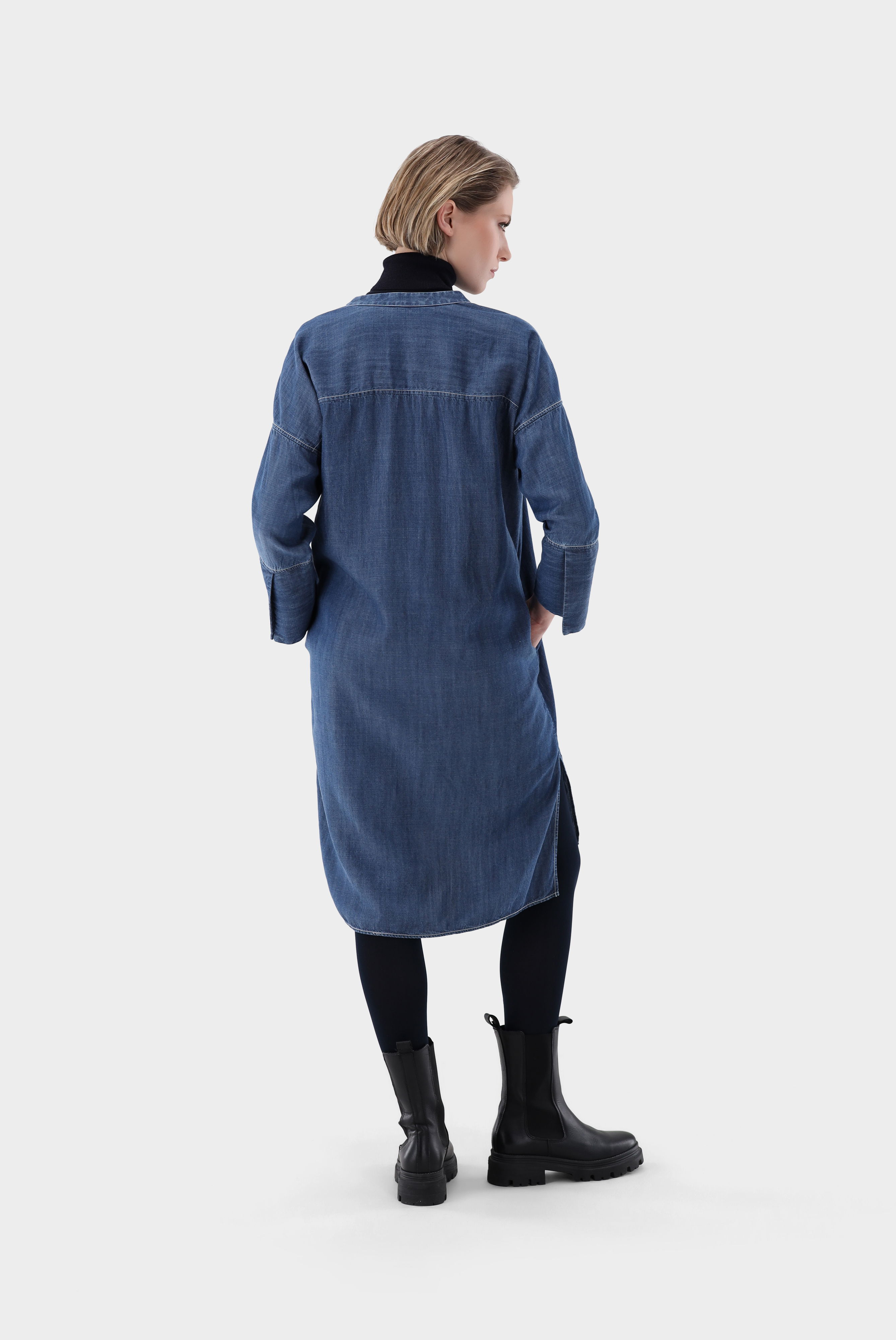 Gerade geschnittenes Schlupfkleid mit überschnittenen Schultern, Tunikaausschnitt mit Rüschen an der Knopfleiste und 3/4 langen Ärmeln mit Schlitzen. Gefertigt aus Lyocell in Denimoptik mit besonderer Waschoptik an Säumen und Nähten. Dieses Kleid wurde garmentgewaschen für spezielle Wascheffekte an Nähten, Kanten und Säumen. Ideal für lässige Anlässe.